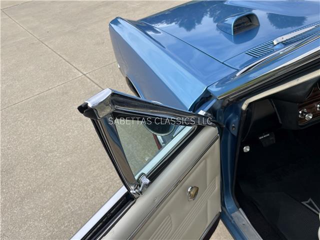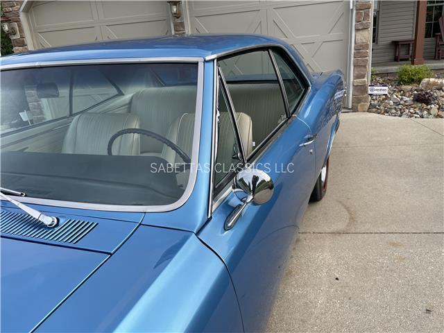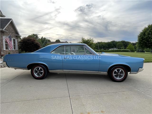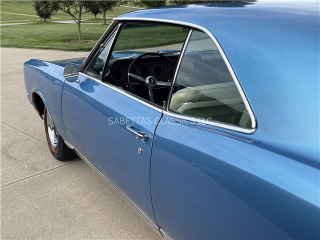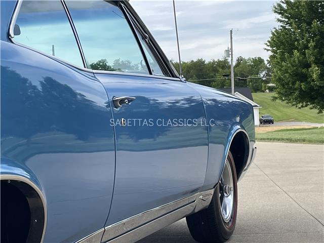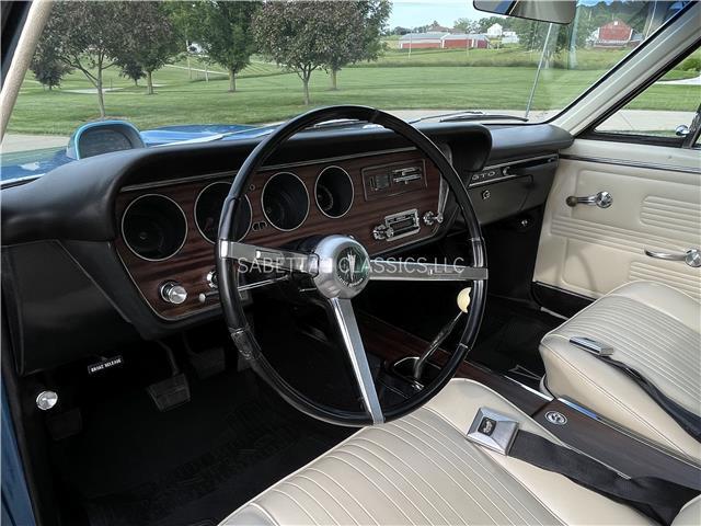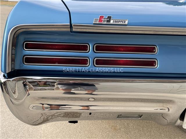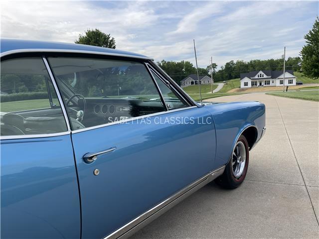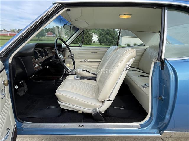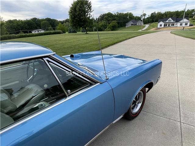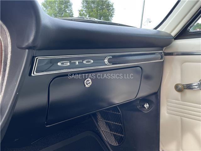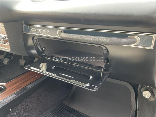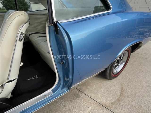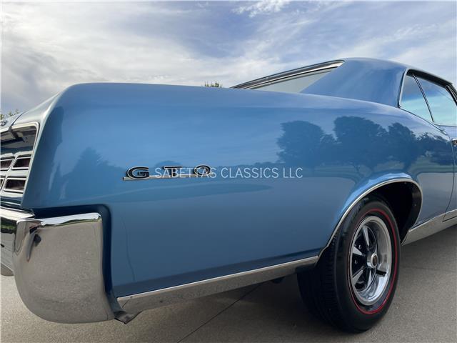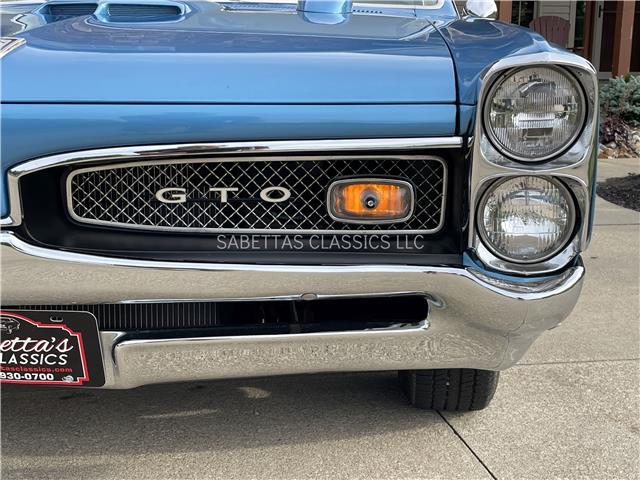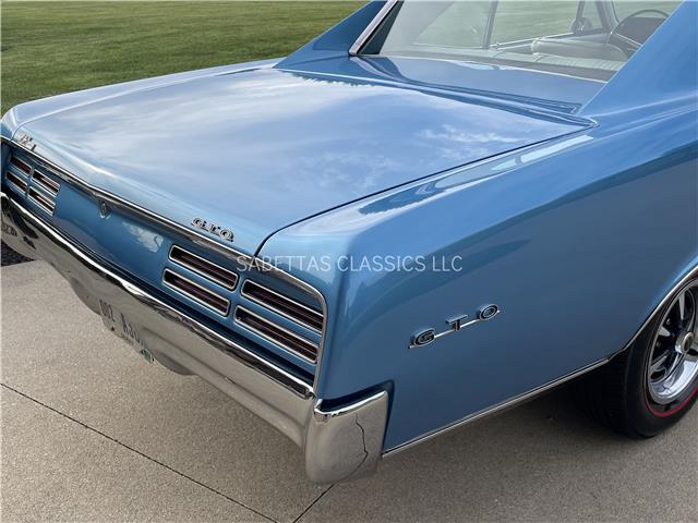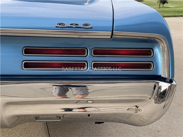 This 1967 Pontiac GTO, California built, is wearing its factory color, Tyrol Blue code F. The paint has a nice smooth glossy clear coat finish. It has a nice fit and finish and is straight down both sides. All of the chrome and trim are really nice. In the front; the headlight bezels, front bumper and grill are nice, shiny and in great shape. All brightwork has been replaced or polished. The glass is in good condition, all the windows go up and down with ease. In the back; the trim, rear bumper, moldings and taillights are nice. It has the optional hood tach and it works. It sits on a set of Rally II wheels with correct trim rings and lug nuts wrapped in a set of radial redline tires.