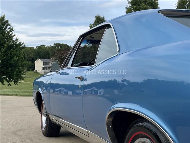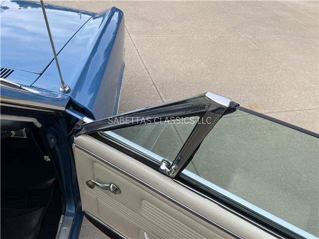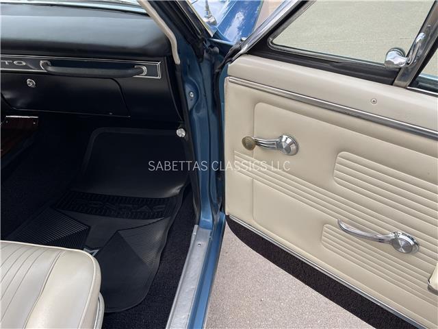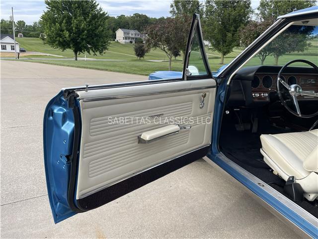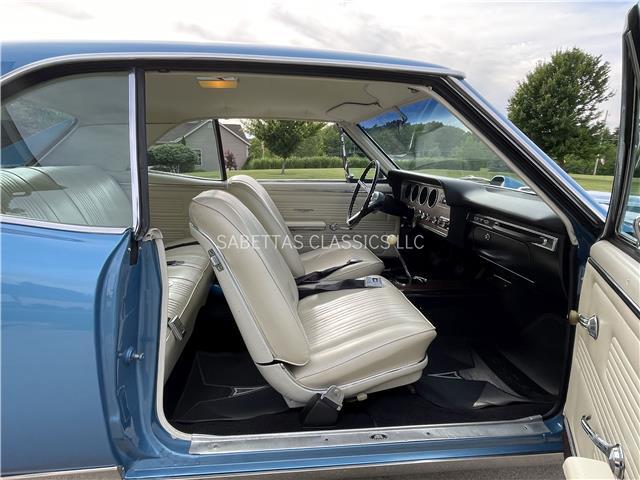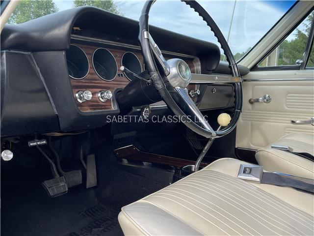 The Parchment interior is in great shape, the seat upholstery and seat foam have been replaced. In between the bucket seats is a factory center console with a factory Hurst 4 speed shifter with a white shift knob coming out of it. The door panels, armrest bases, pads, door handles, carpet, headliner and rear package tray have all been replaced. The wood grain dash is in great shape along with the knobs. Other features include an aftermarket AM/FM stereo. It has a nice dash pad, front and rear seatbelts and nicely painted door jambs with nice sill plates.