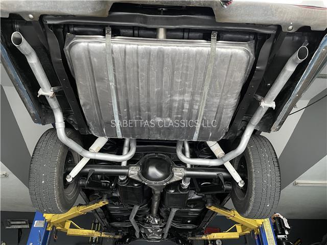 The undercarriage has very solid original floors that are painted in a satin black finish. The front suspension and steering components look good. The bottom of the motor and transmission are clean. It has a Muncie M20 4-speed manual transmission, 3:55 rear end gears, newer gas tank, sending unit and fuel tank straps. All E-brake cables are hooked up and working. It has a nice aluminized dual exhaust system with FlowMaster mufflers that run all the way out the back.