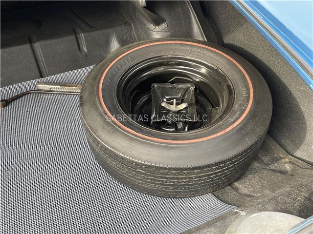 The trunk is clean original metal with a coat of gray and white splatter paint, trunk mat, spare tire and jack assembly and lug wrench.