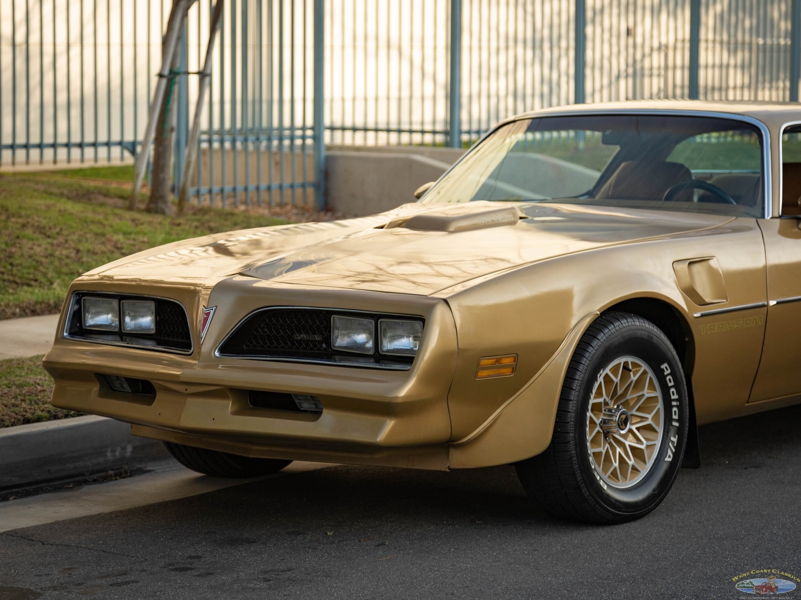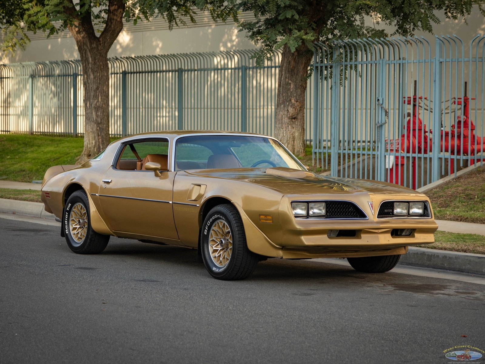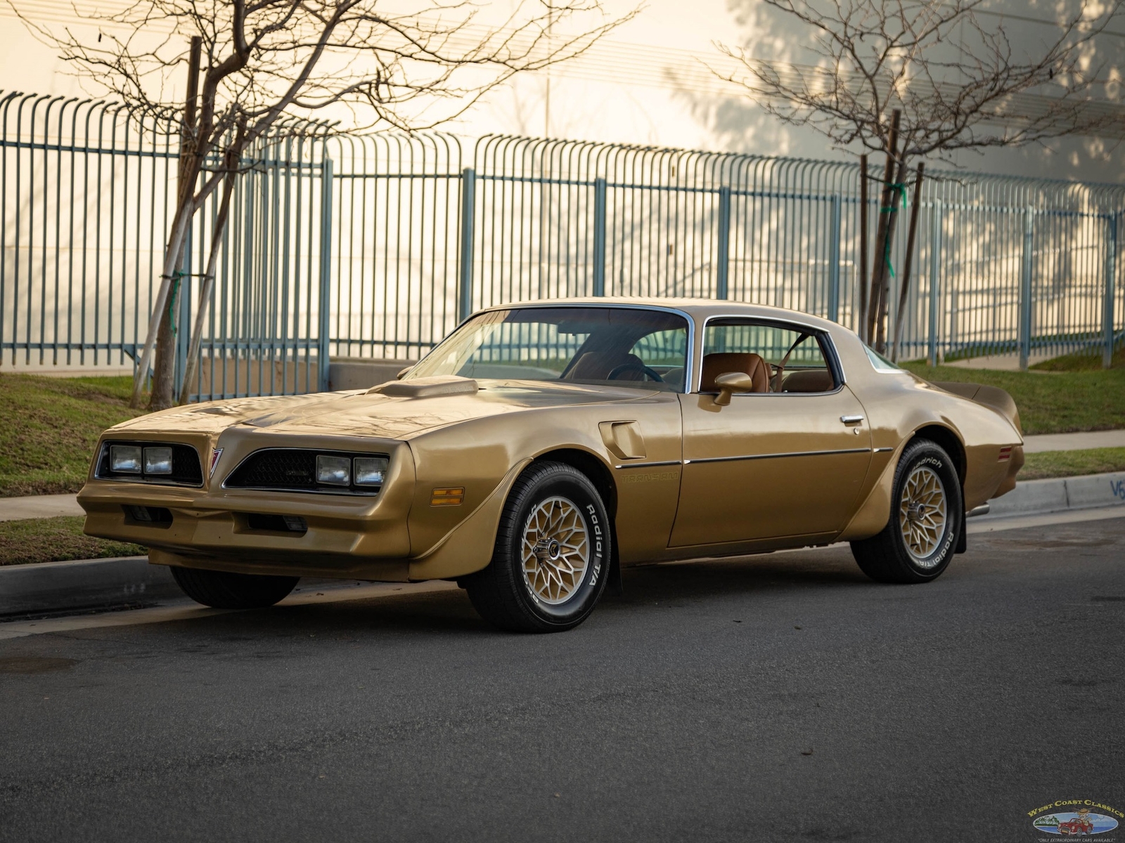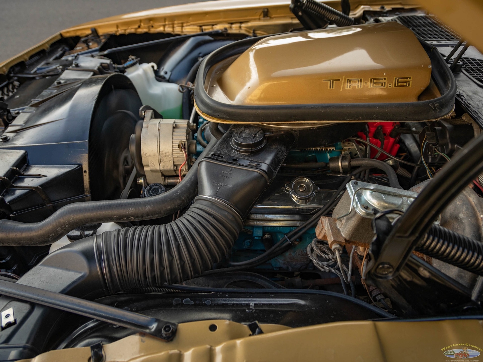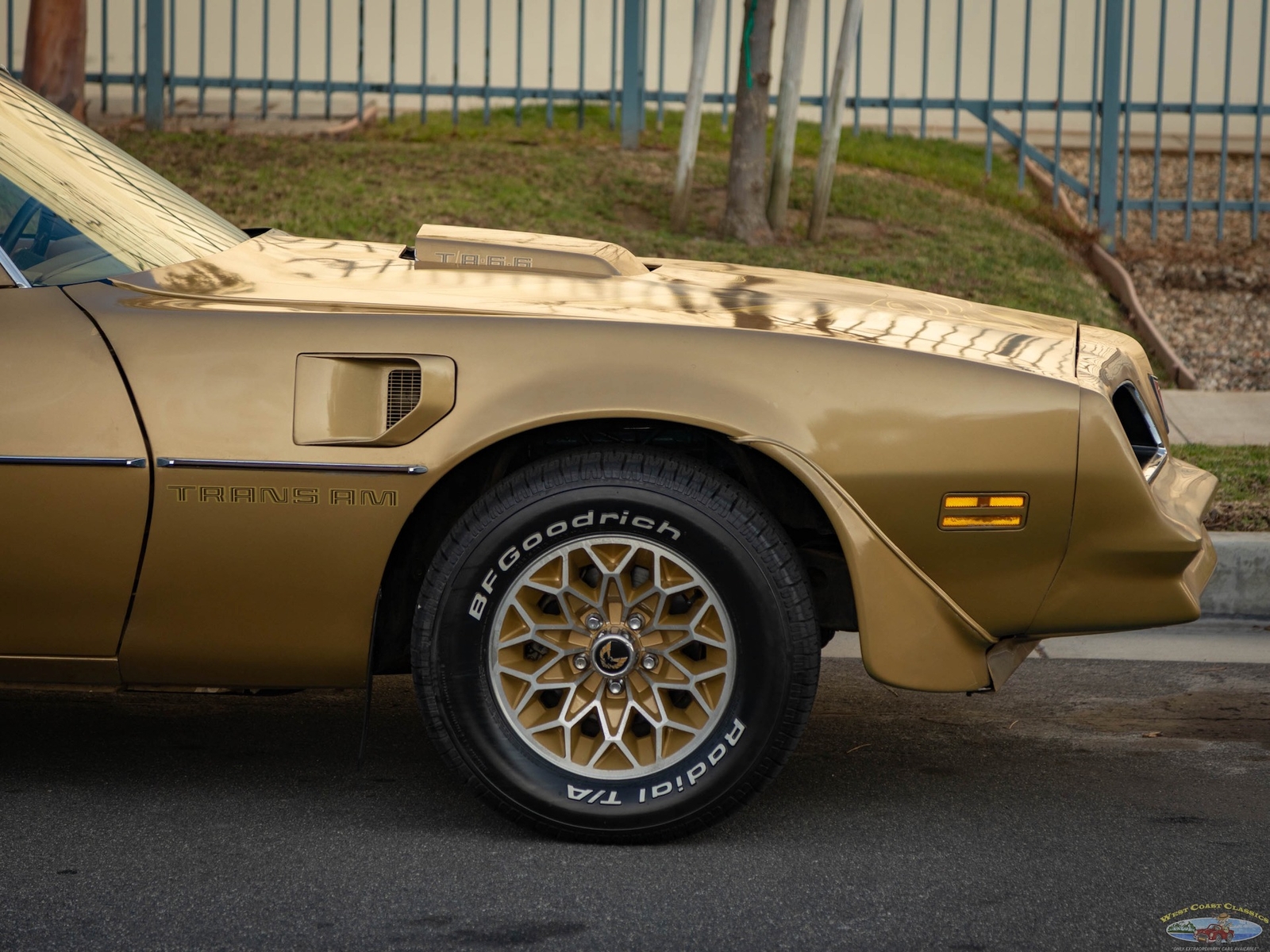 This 1978 Pontiac Firebird Trans Am is finished in its original 'Solar Gold' over Camel Tan vinyl upholstery and is powered by a 400ci W72 V8 paired with a four-speed manual transmission. The engine has been fitted with a GTO-sourced intake manifold and cylinder heads as well as a Ram Air III camshaft, and additional equipment includes a Shaker hood with a Firebird hood decal, front and rear spoilers, 15 snowflake alloy wheels, power steering, power front disc brakes, an aftermarket exhaust system, and an eight-track radio.