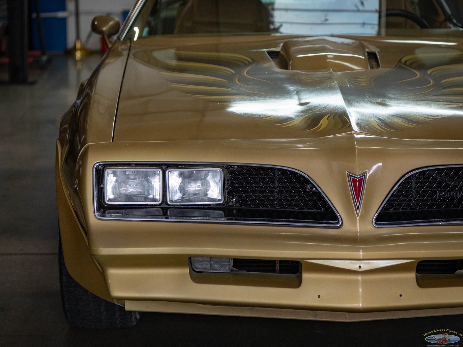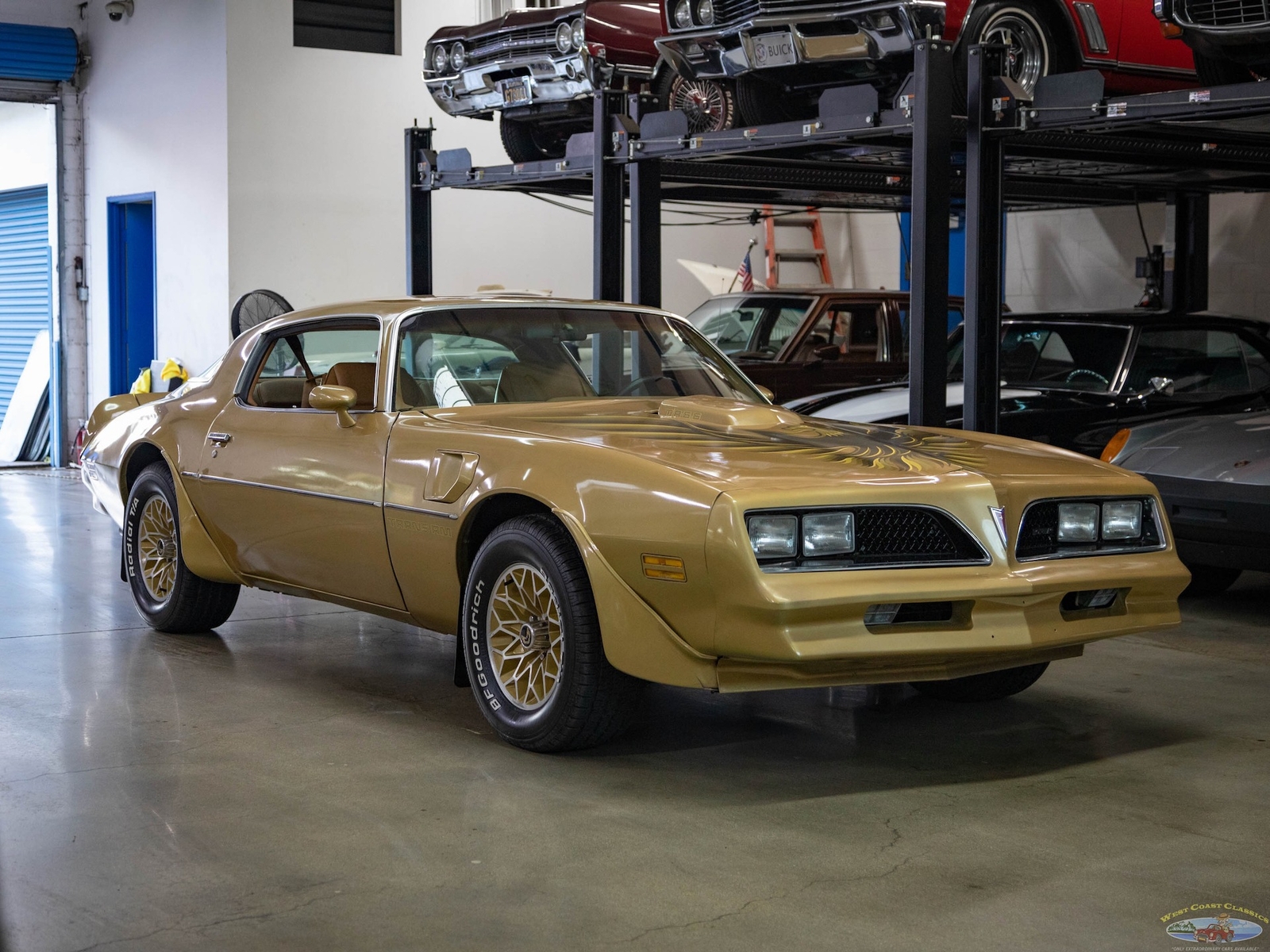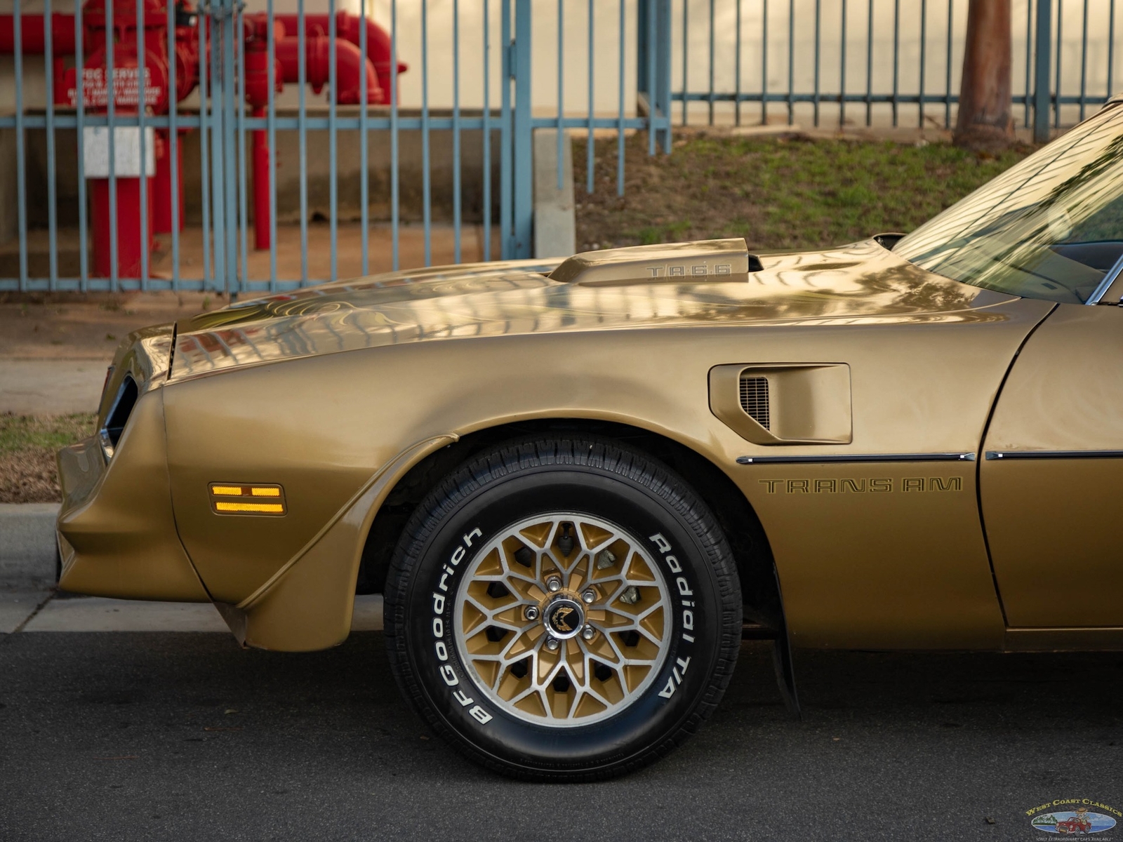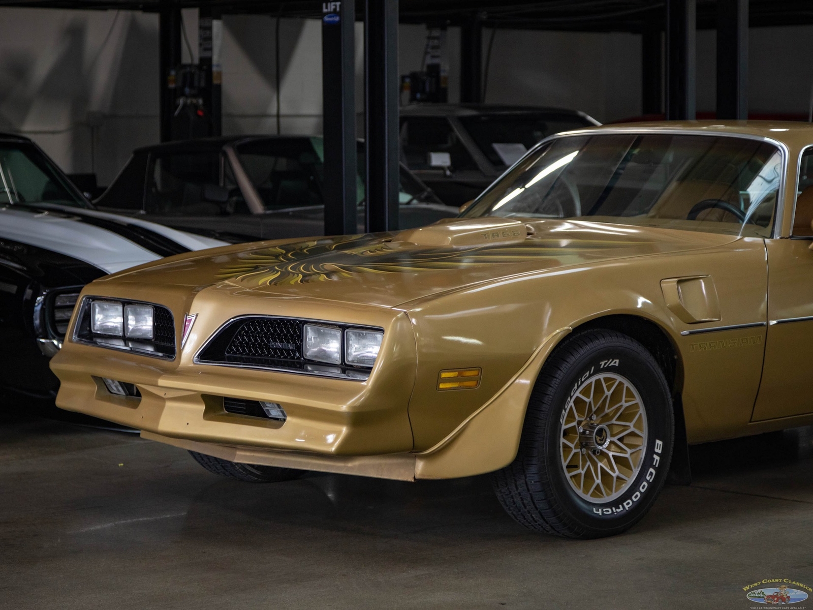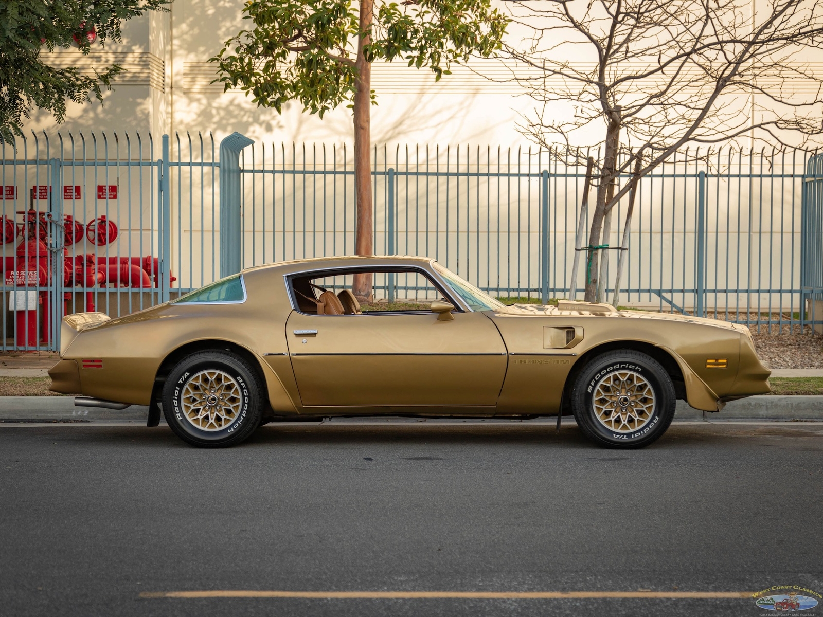 This 1978 Pontiac Firebird Trans Am is finished in its original 'Solar Gold' over Camel Tan vinyl upholstery and is powered by a 400ci W72 V8 paired with a four-speed manual transmission. The engine has been fitted with a GTO-sourced intake manifold and cylinder heads as well as a Ram Air III camshaft, and additional equipment includes a Shaker hood with a Firebird hood decal, front and rear spoilers, 15 snowflake alloy wheels, power steering, power front disc brakes, an aftermarket exhaust system, and an eight-track radio.