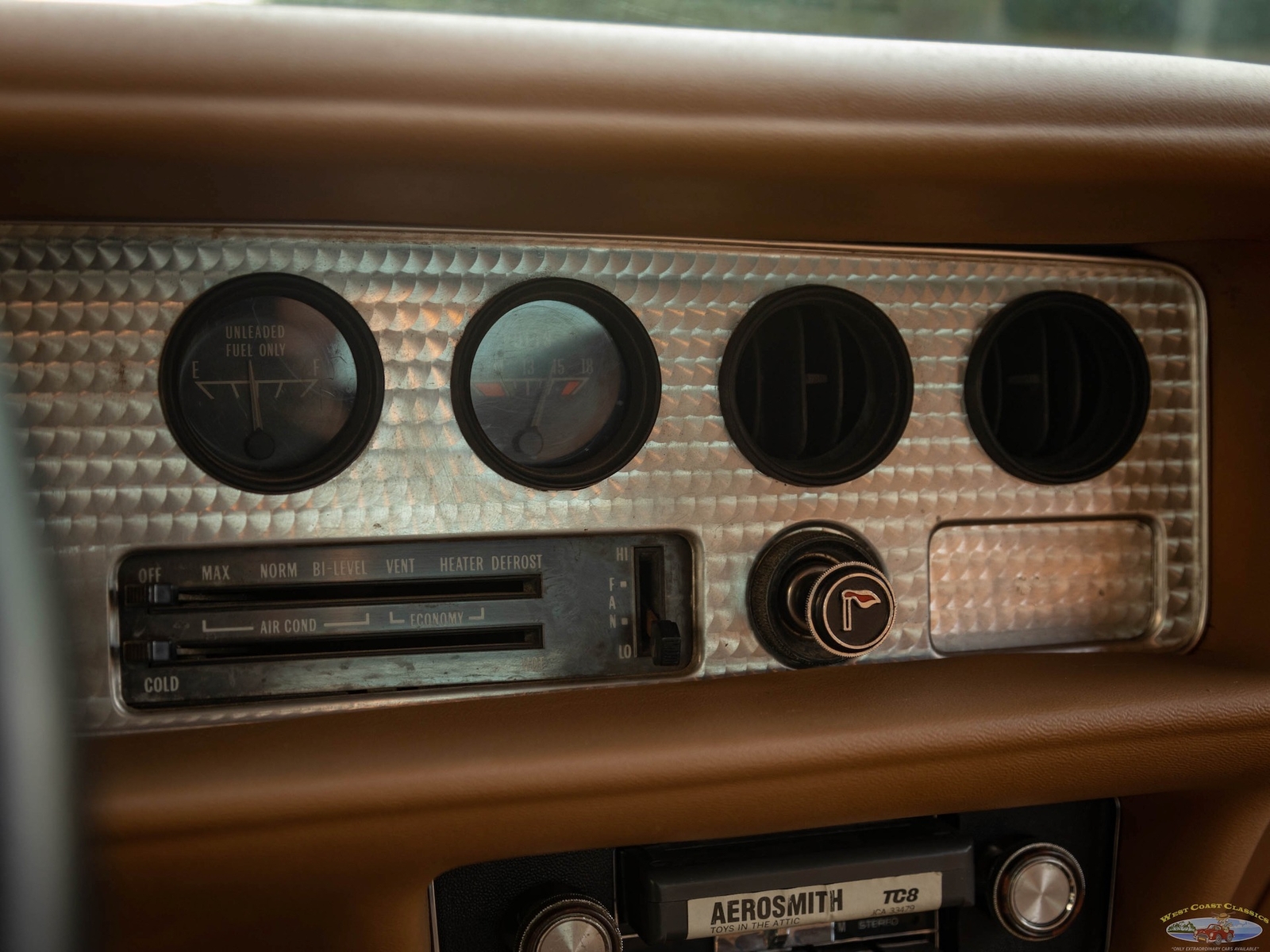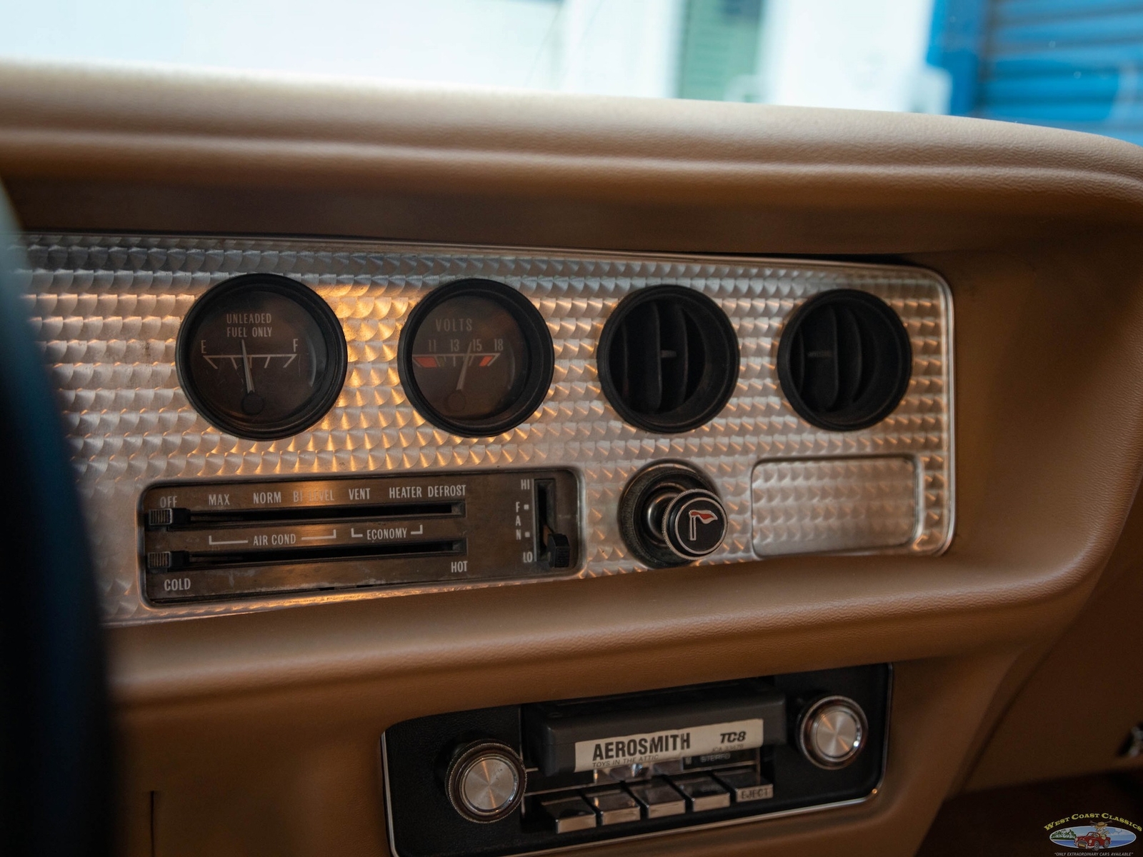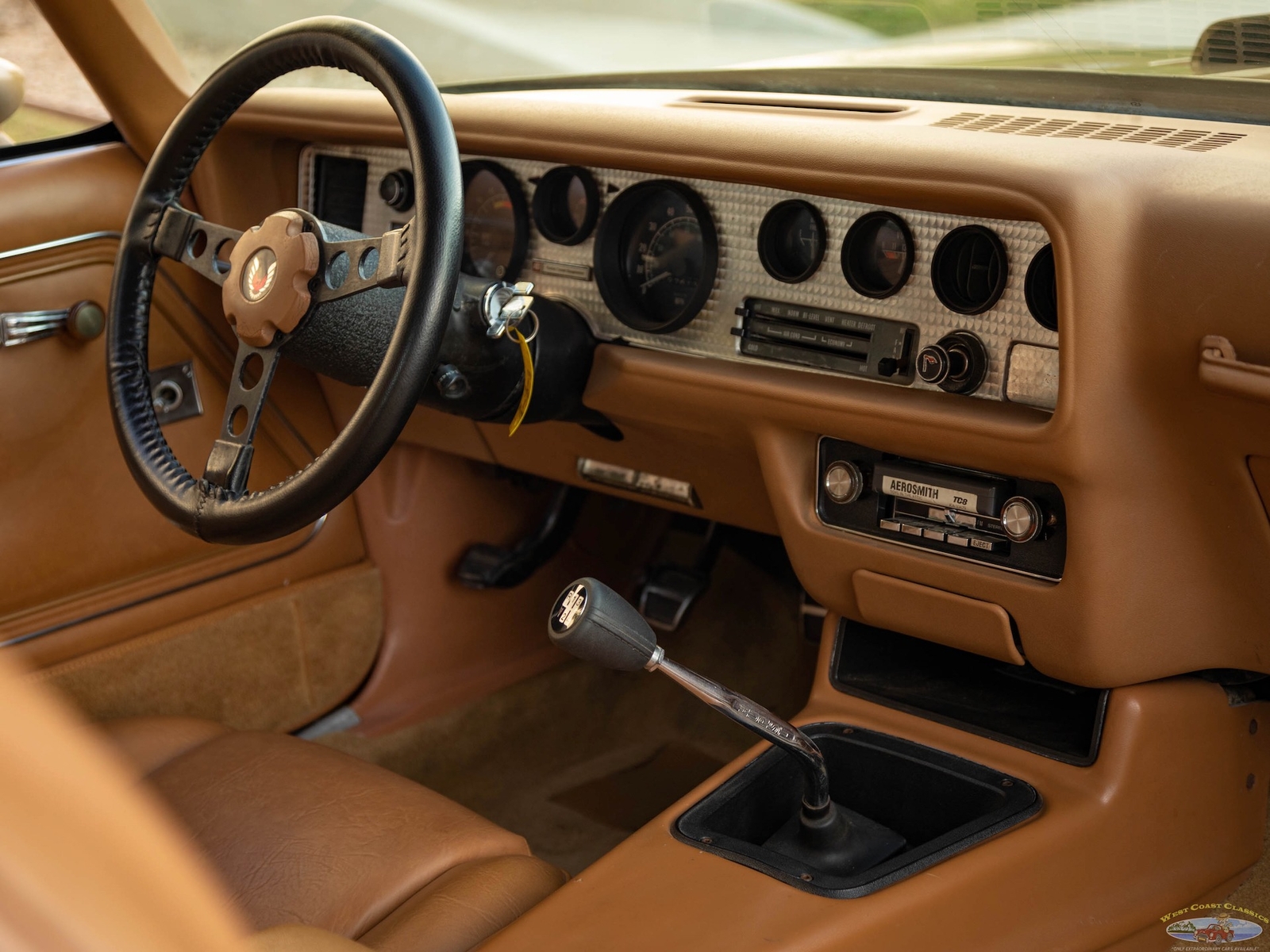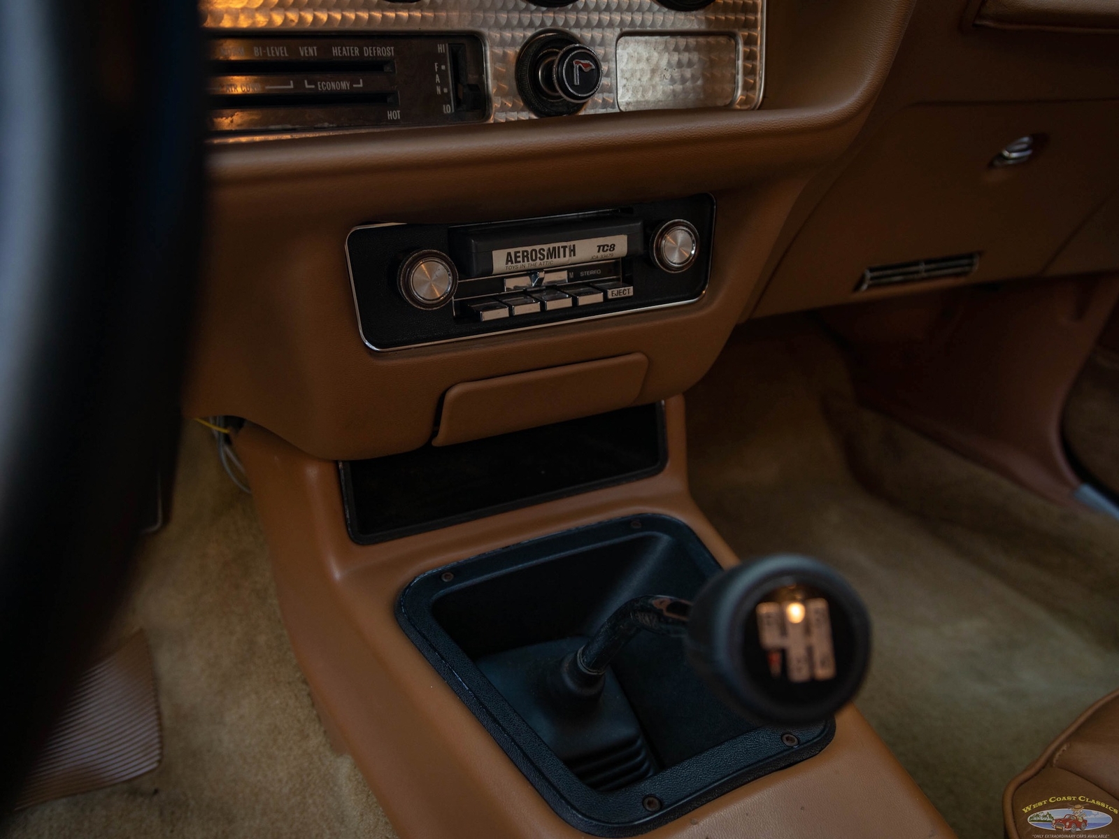 The car is equipped with power steering, and braking is handled by power-assisted front discs. Noted service under previous ownership included replacing the brake master cylinder, hoses, front calipers, and rear wheel cylinders. The seating surfaces are trimmed in Camel Tan vinyl with a color-coordinated dashboard, door panels, and carpets. Amenities include a silver engine-turned dash fascia, a full-length center console, an eight-track radio, manual crank windows, and Trans Am logo floor mats.
