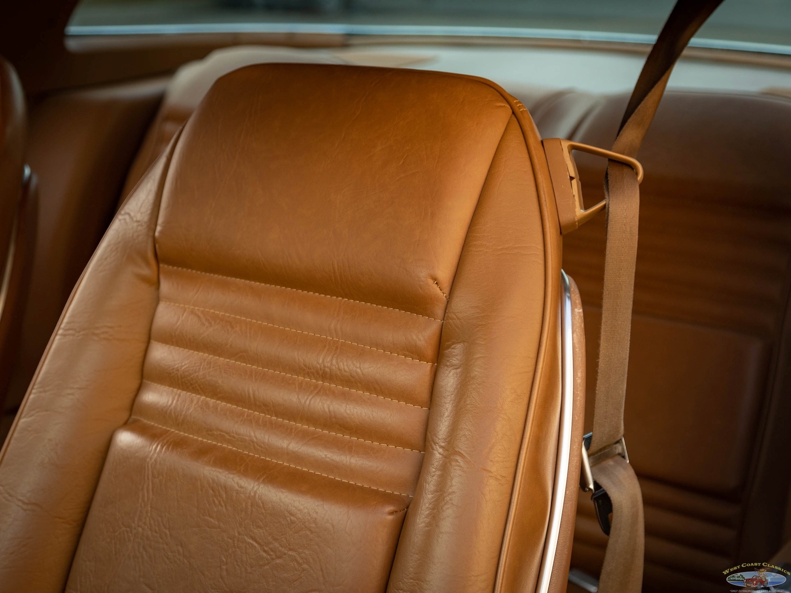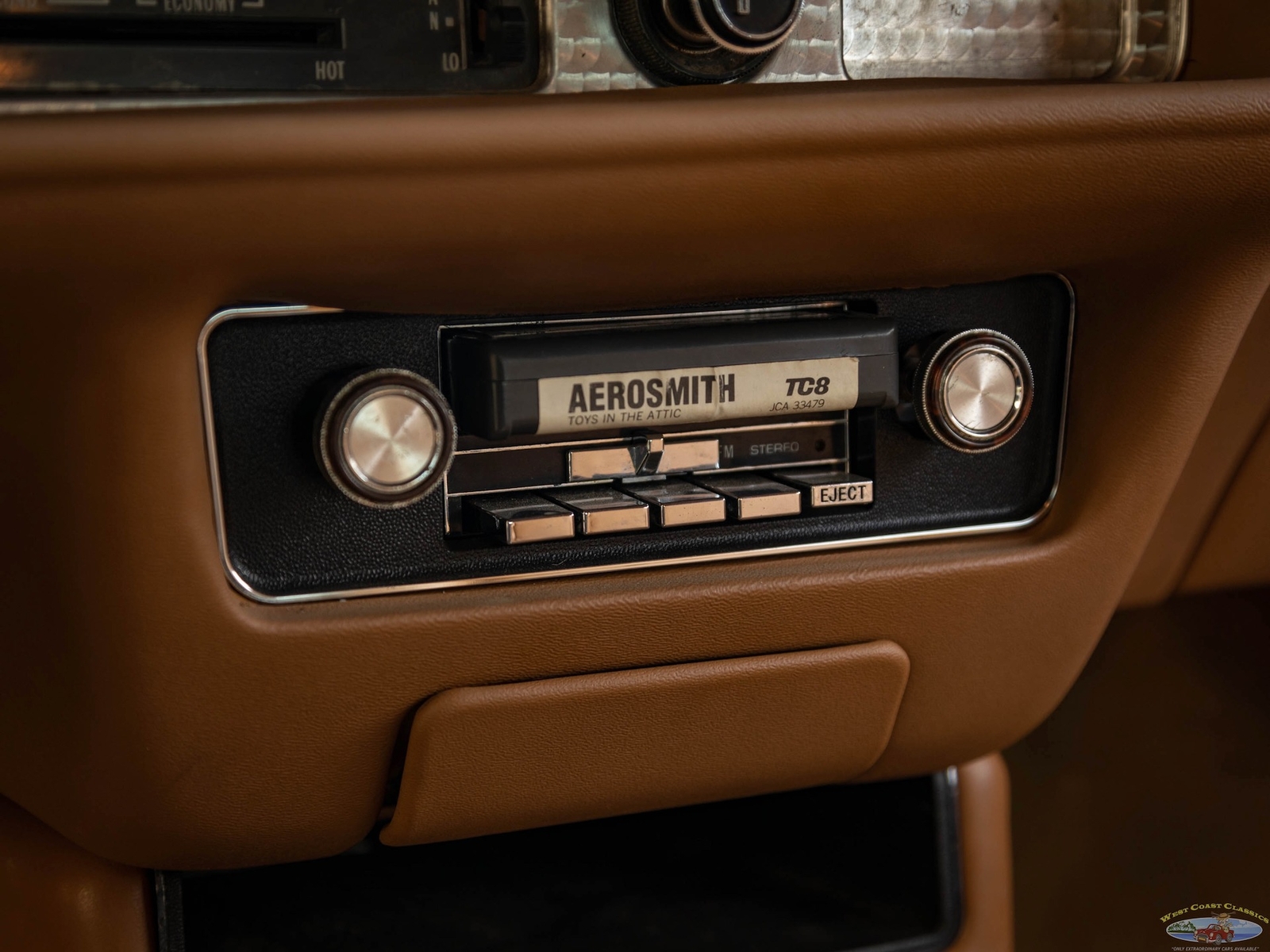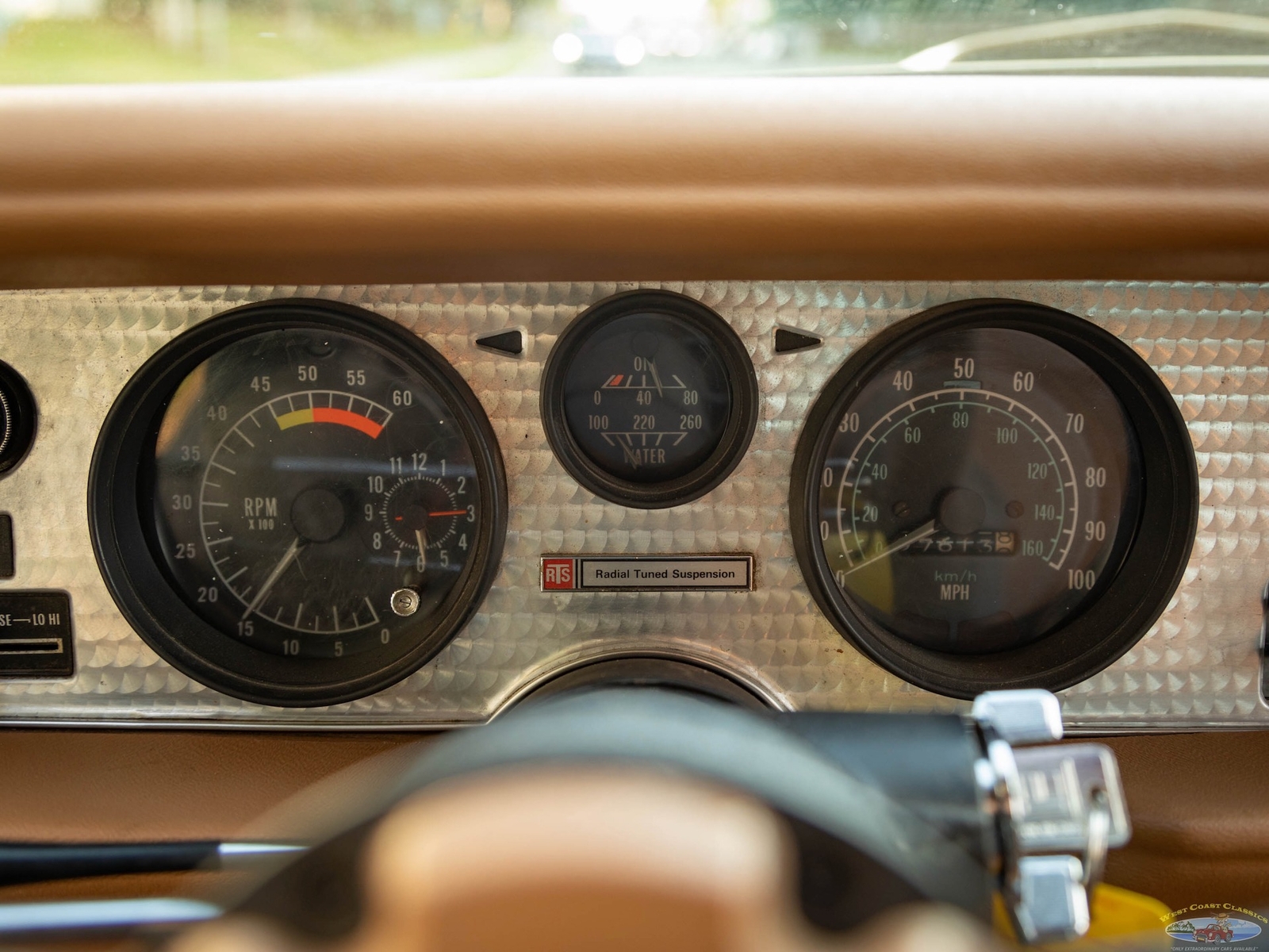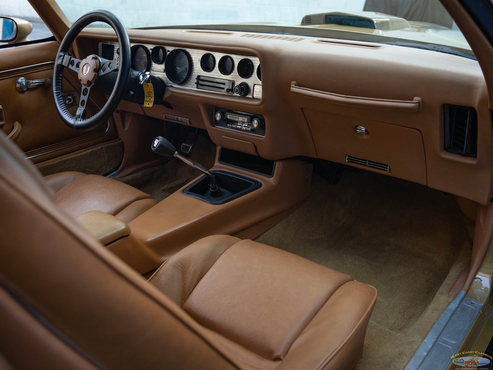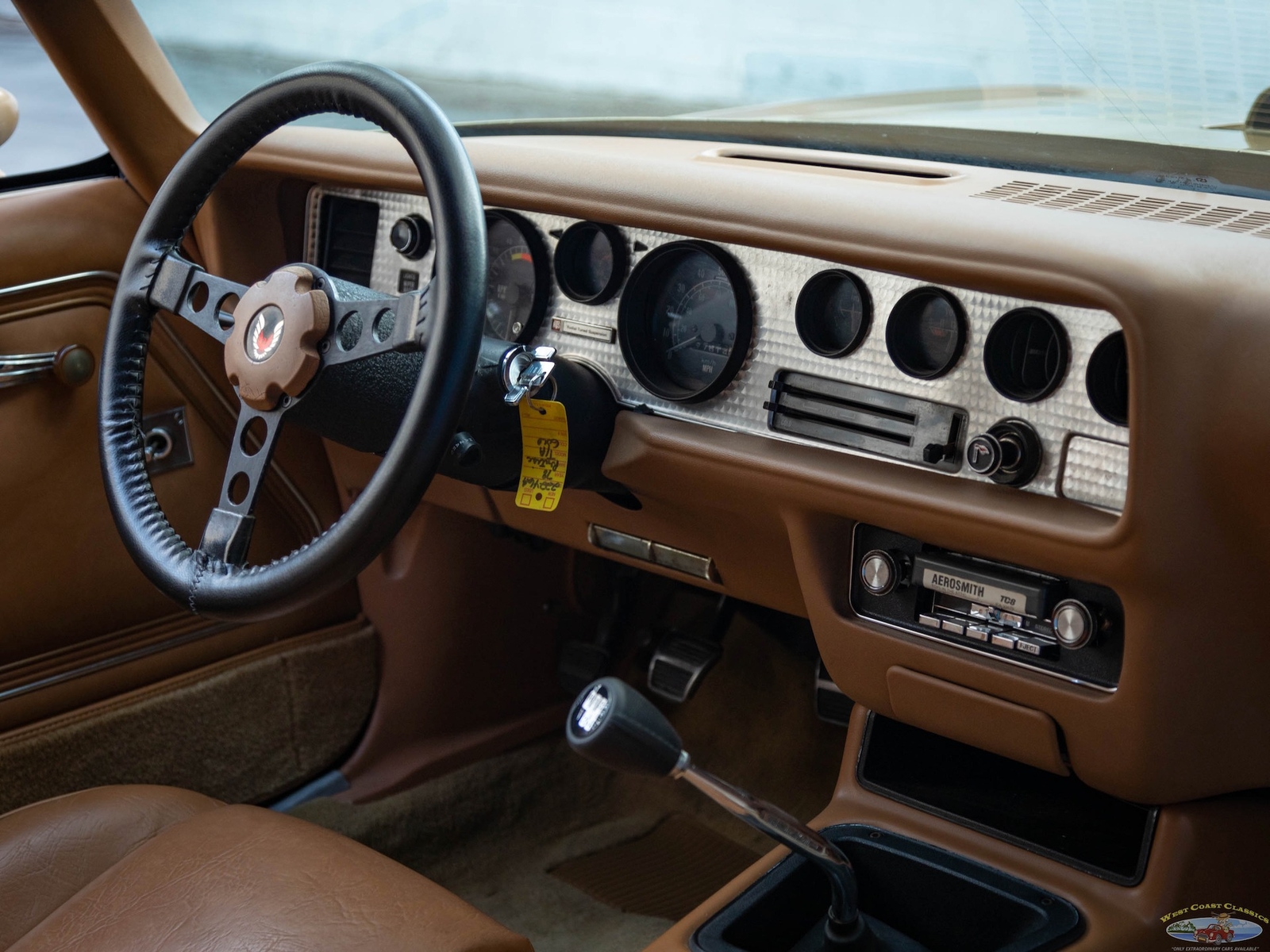 The car is equipped with power steering, and braking is handled by power-assisted front discs. Noted service under previous ownership included replacing the brake master cylinder, hoses, front calipers, and rear wheel cylinders. The seating surfaces are trimmed in Camel Tan vinyl with a color-coordinated dashboard, door panels, and carpets. Amenities include a silver engine-turned dash fascia, a full-length center console, an eight-track radio, manual crank windows, and Trans Am logo floor mats.