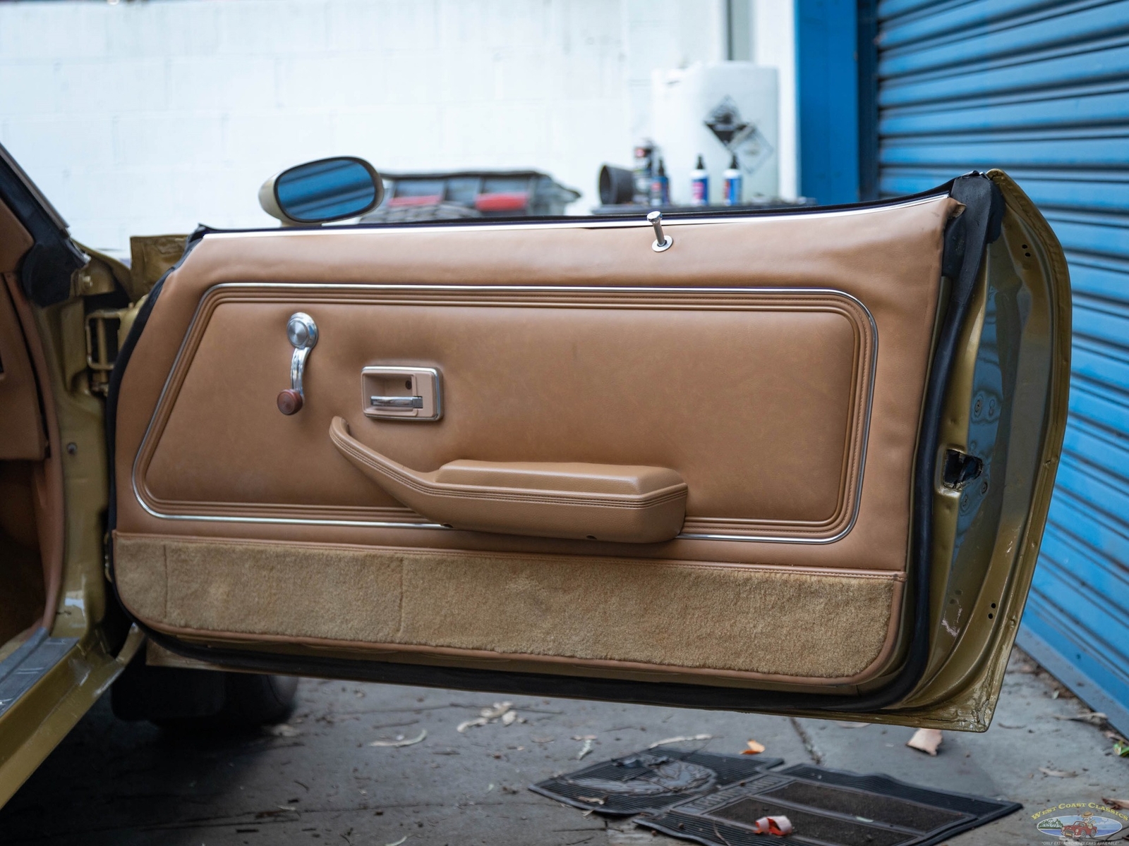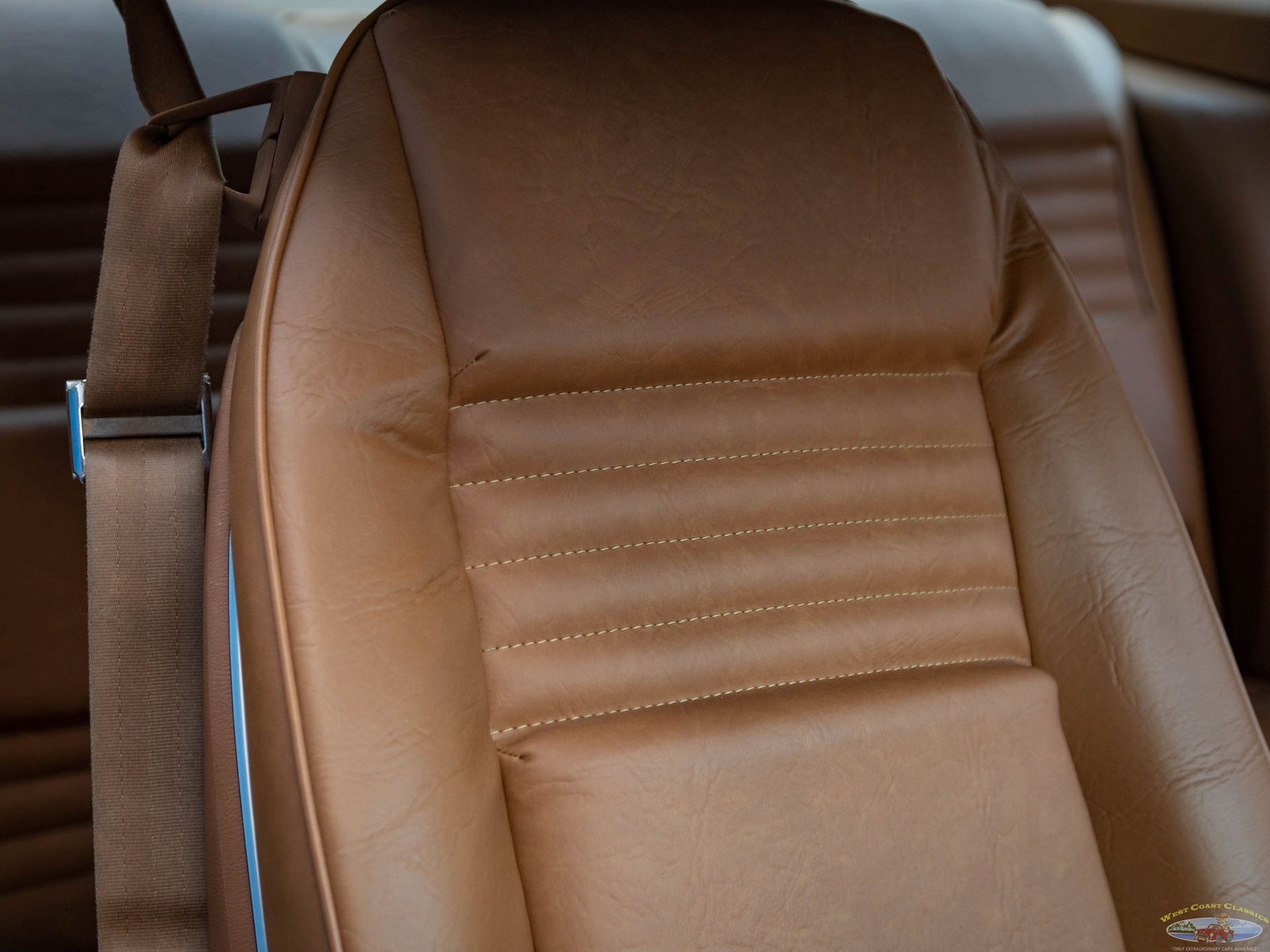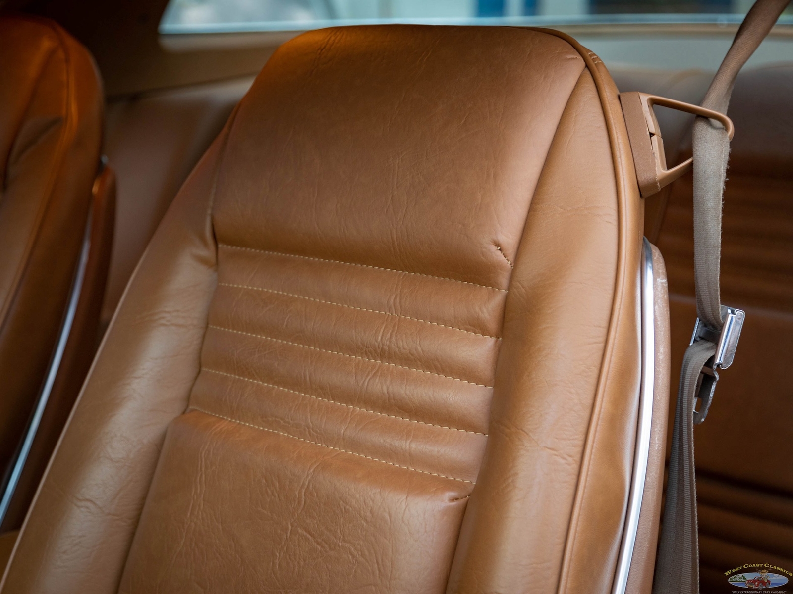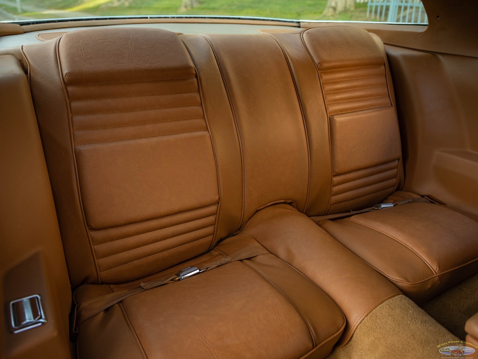 The car is equipped with power steering, and braking is handled by power-assisted front discs. Noted service under previous ownership included replacing the brake master cylinder, hoses, front calipers, and rear wheel cylinders. The seating surfaces are trimmed in Camel Tan vinyl with a color-coordinated dashboard, door panels, and carpets. Amenities include a silver engine-turned dash fascia, a full-length center console, an eight-track radio, manual crank windows, and Trans Am logo floor mats.