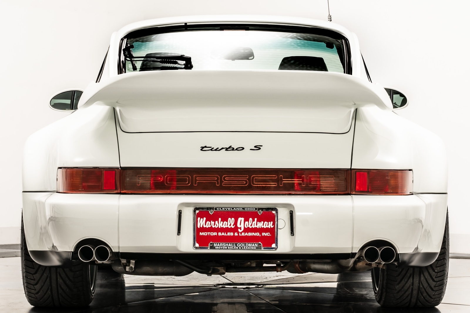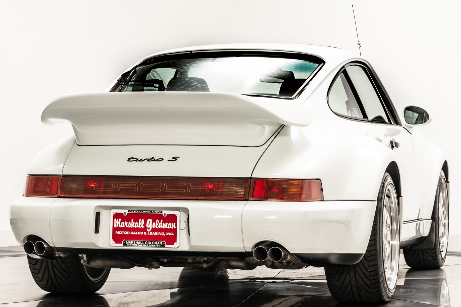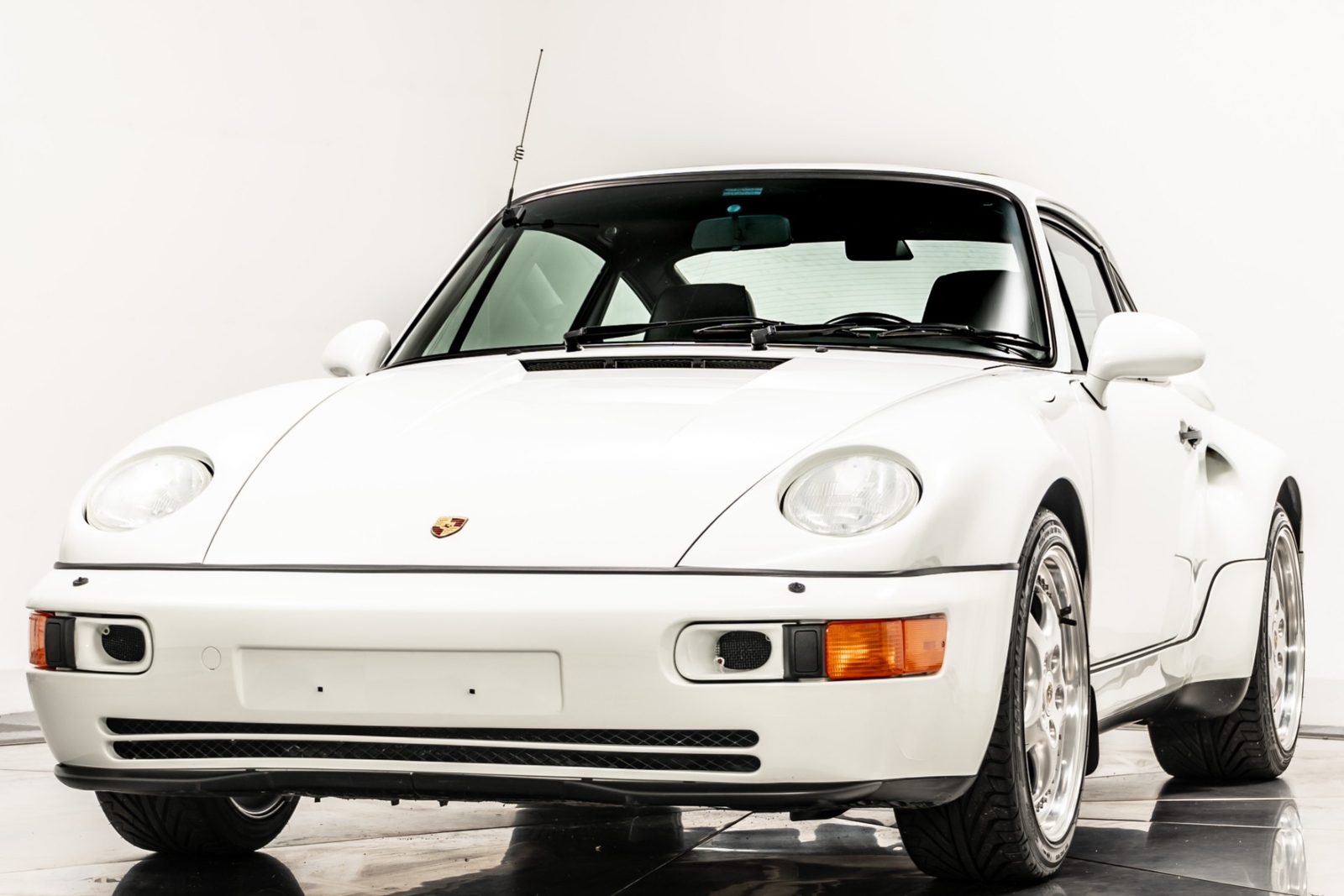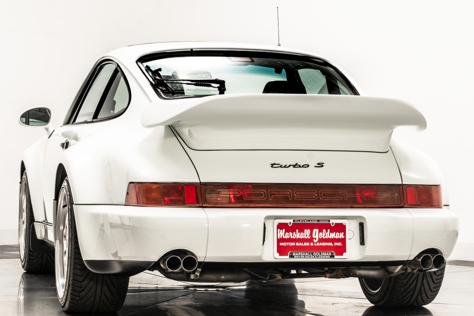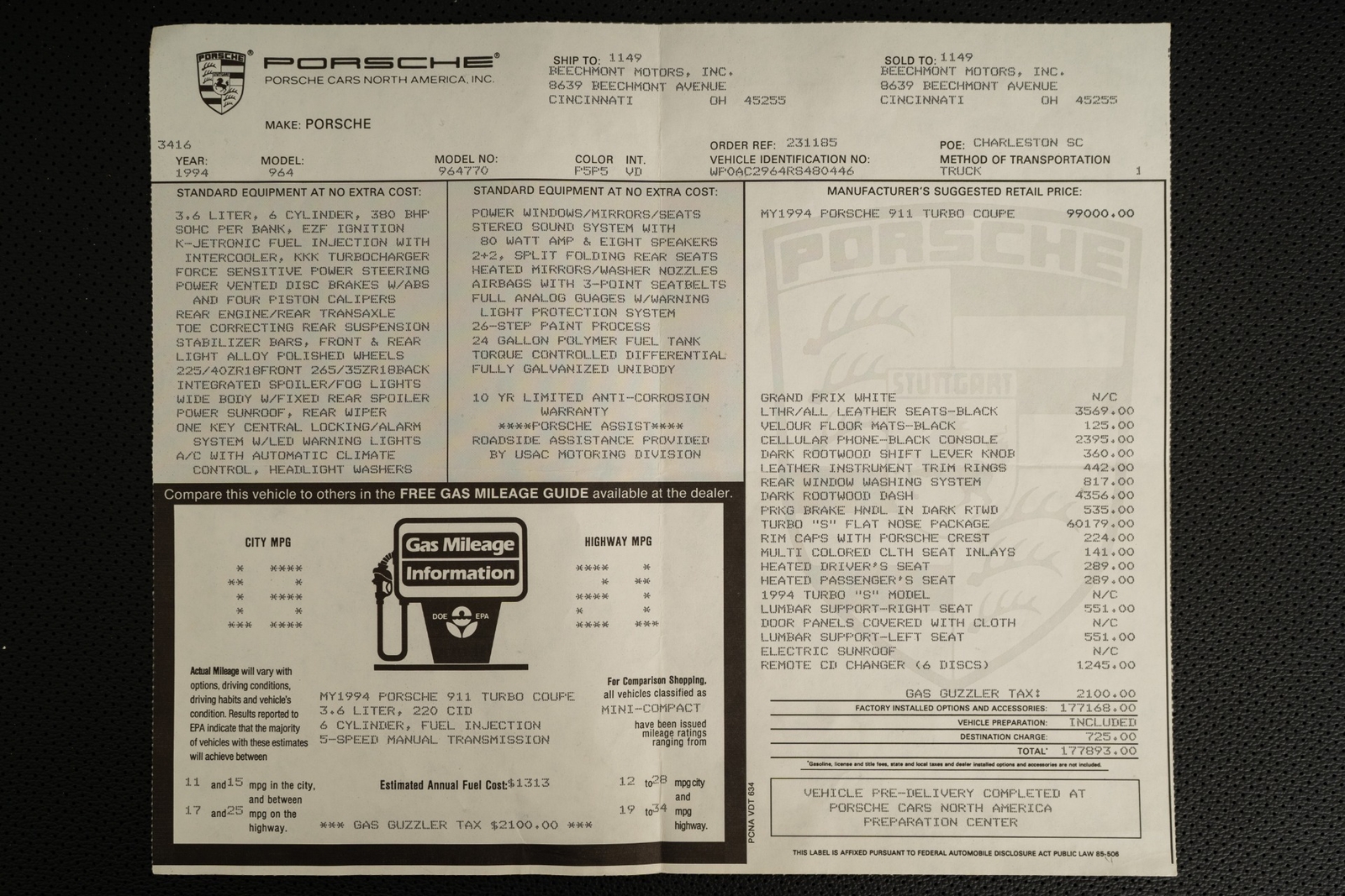 We have just added to our extensive exotic car inventory a beautiful 1994 Porsche 911 Turbo S Flatnose in Grand Prix White over Black leather interior and only 18,311 miles. This Turbo is loaded with: Turbo S package (3.6 liter turbocharged flat six with higher flow turbo, cylinder heads with ported intake ports, ported injector blocks, ported intake manifold and larger camshafts, flatnose conversion with pop-up headlamps, front bumper cooling scoops, quarter panel scoops, rear wing with integrated lip, quad exhaust tips), 5 speed manual transmission, 18 inch Speedline wheels with polished centers, center caps with colored Porsche crests, 12 way power driver and passenger seats with heating, RARE factory cellular telephone with optional console, SUPER RARE Studio cloth seat and door panel inserts (a whopping $141 option!), sunroof, AM/FM/cassette with 6 CD changer, dark rootwood shifter and handbrake handles, dark rootwood dash inserts, full leather interior, velour floor mats, leather gauge trim rings, rear window wiper, electric sunroof, the original window sticker, all books, the original salesman's business card, tools, inflator and more. All of the original markings are on the glass and all body tags are in place. There were only 76 of these built for the world and this is one of the nicest and most unusual ever built.
