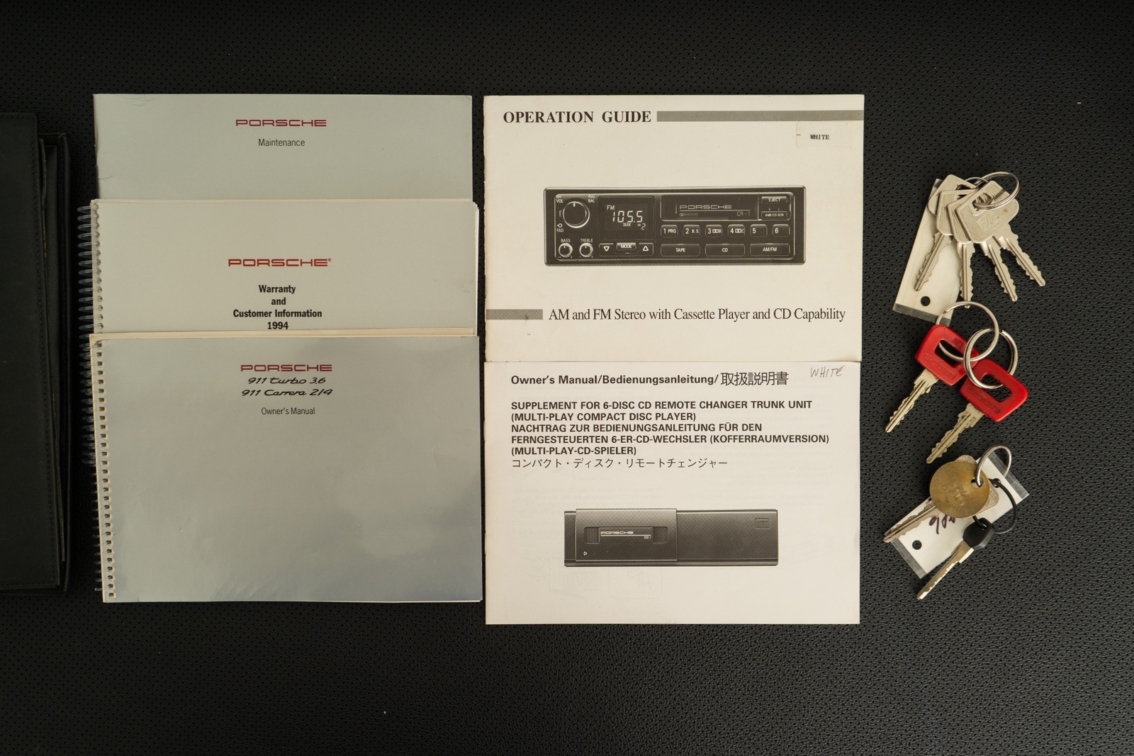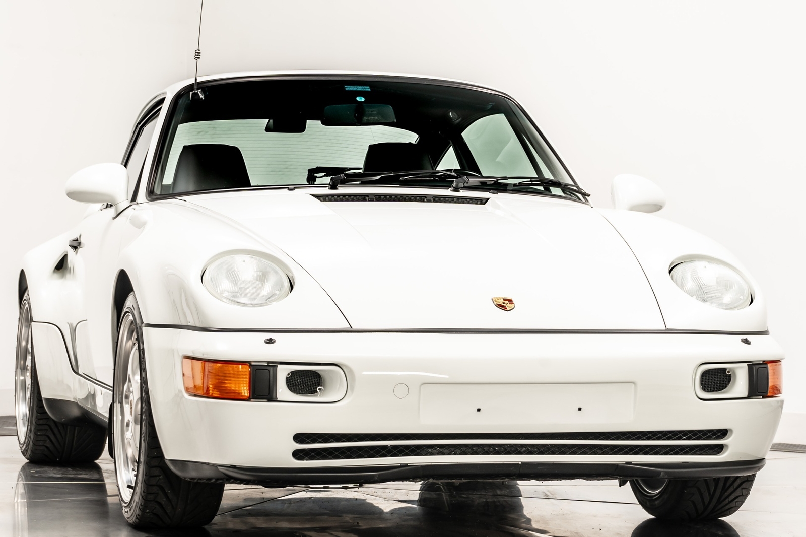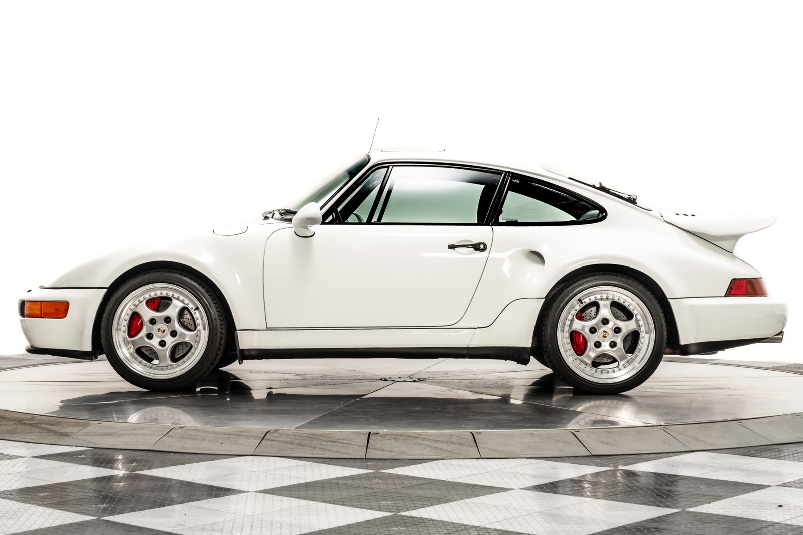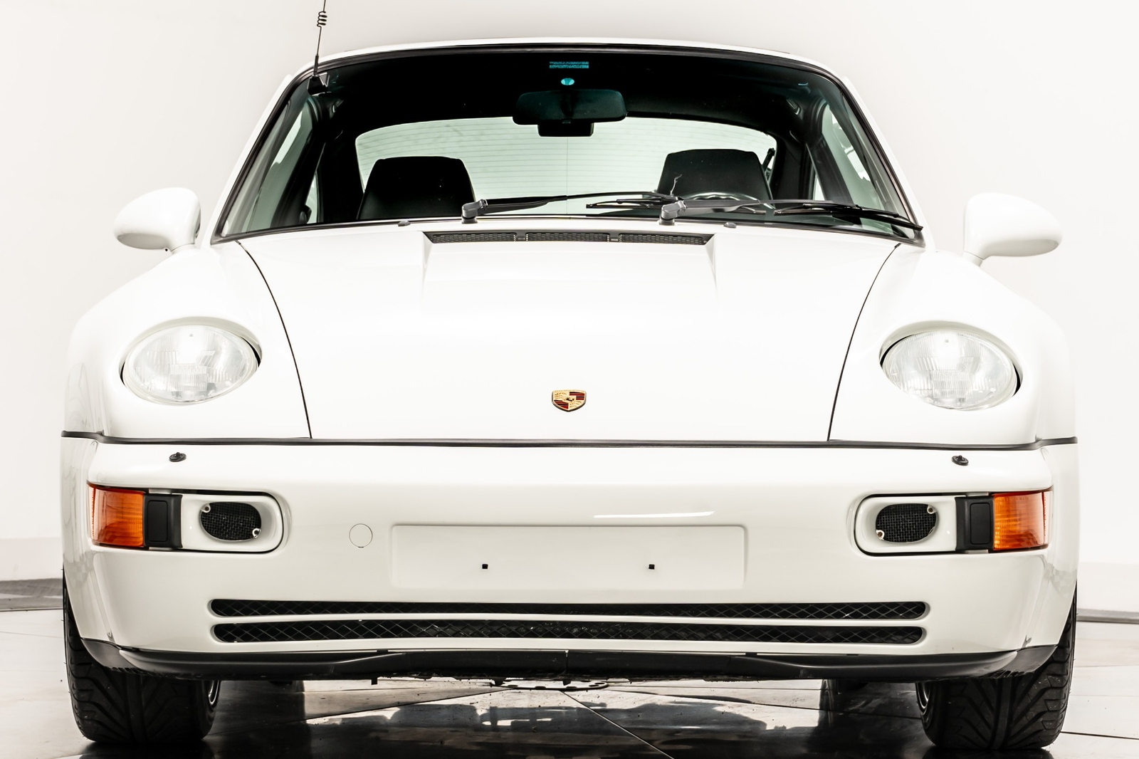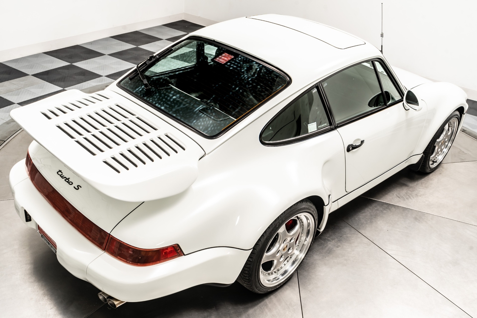 We have just added to our extensive exotic car inventory a beautiful 1994 Porsche 911 Turbo S Flatnose in Grand Prix White over Black leather interior and only 18,311 miles. This Turbo is loaded with: Turbo S package (3.6 liter turbocharged flat six with higher flow turbo, cylinder heads with ported intake ports, ported injector blocks, ported intake manifold and larger camshafts, flatnose conversion with pop-up headlamps, front bumper cooling scoops, quarter panel scoops, rear wing with integrated lip, quad exhaust tips), 5 speed manual transmission, 18 inch Speedline wheels with polished centers, center caps with colored Porsche crests, 12 way power driver and passenger seats with heating, RARE factory cellular telephone with optional console, SUPER RARE Studio cloth seat and door panel inserts (a whopping $141 option!), sunroof, AM/FM/cassette with 6 CD changer, dark rootwood shifter and handbrake handles, dark rootwood dash inserts, full leather interior, velour floor mats, leather gauge trim rings, rear window wiper, electric sunroof, the original window sticker, all books, the original salesman's business card, tools, inflator and more. All of the original markings are on the glass and all body tags are in place. There were only 76 of these built for the world and this is one of the nicest and most unusual ever built.