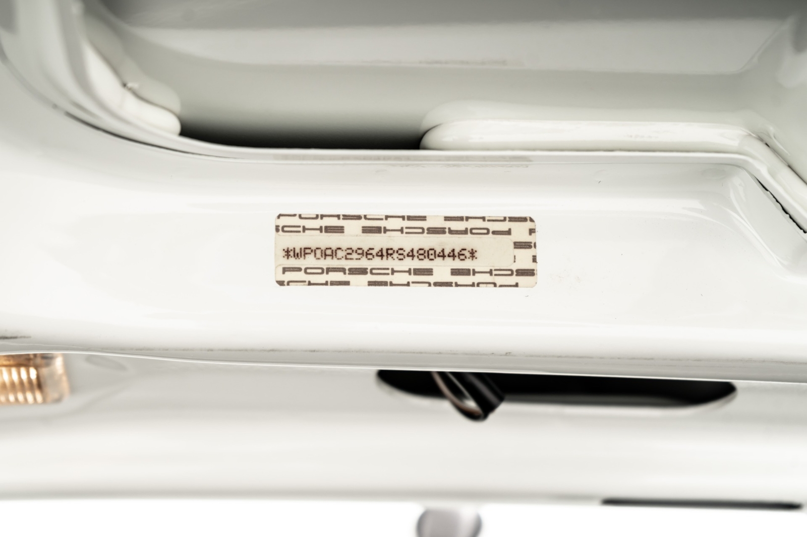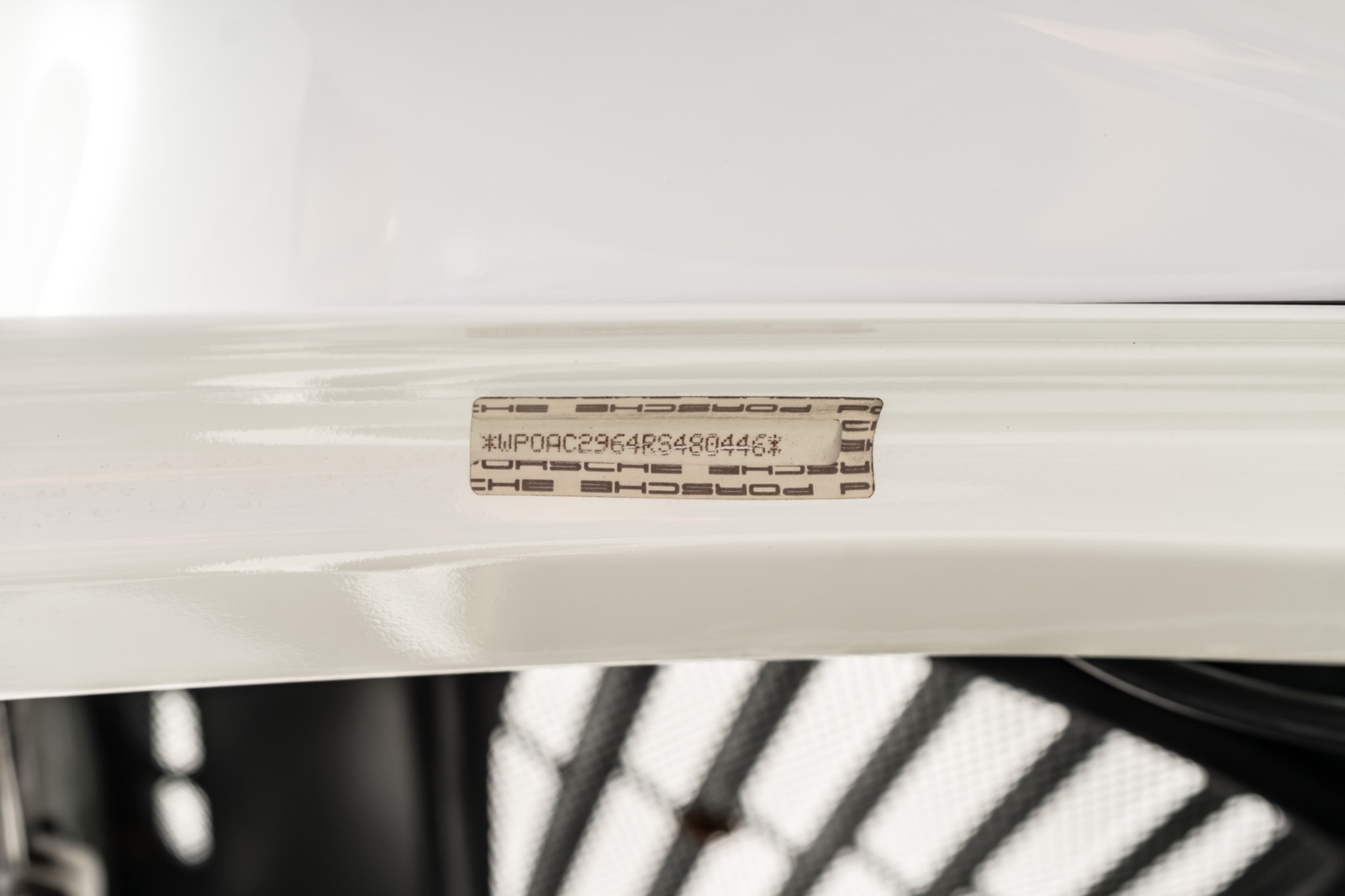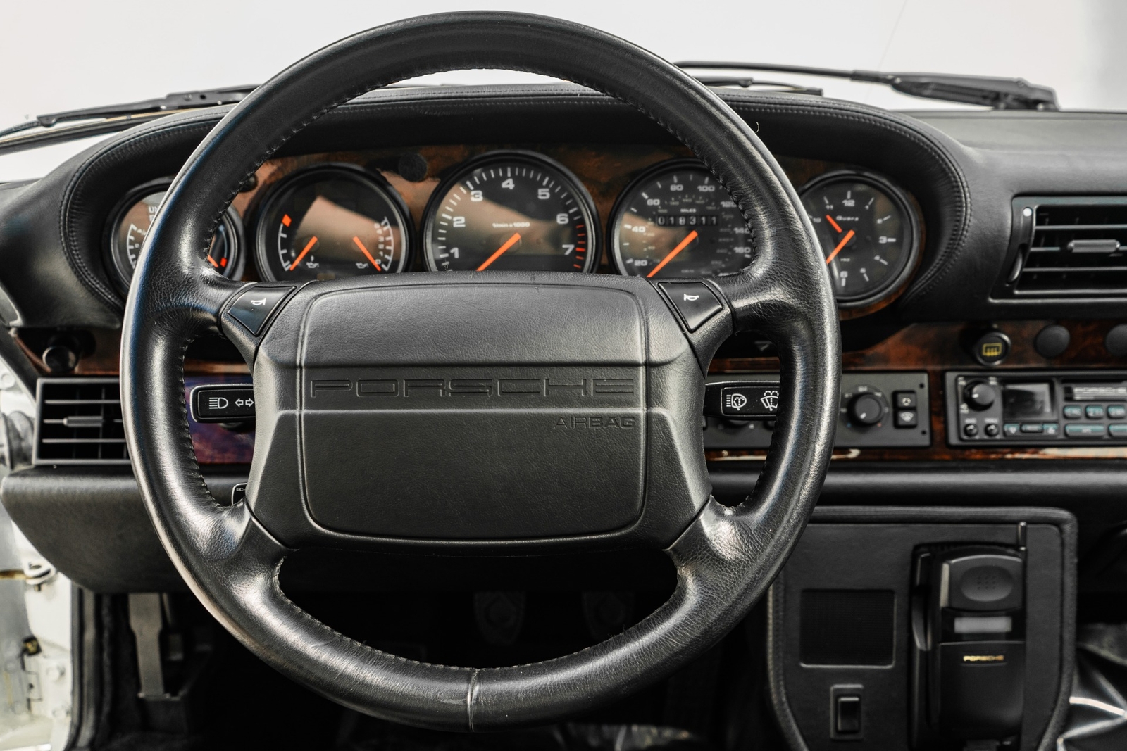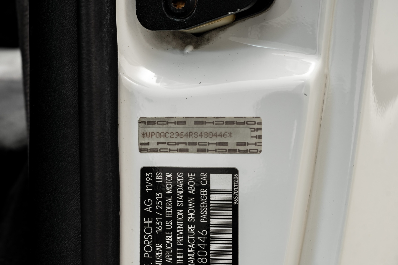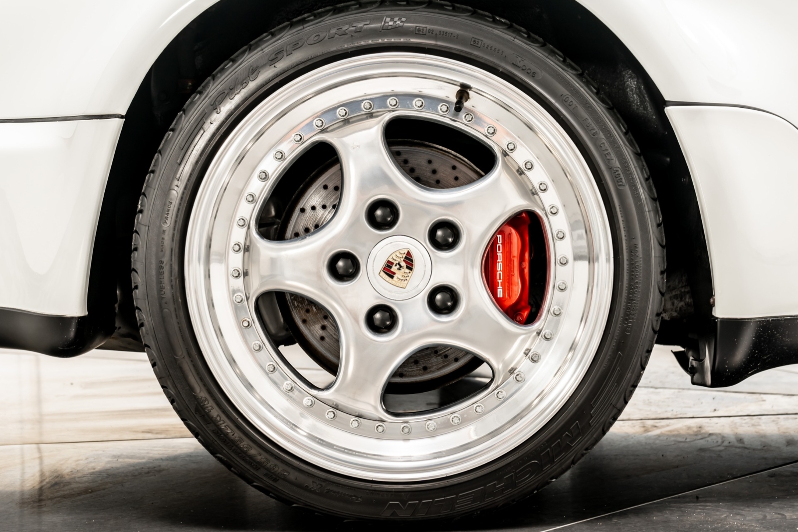 We have just added to our extensive exotic car inventory a beautiful 1994 Porsche 911 Turbo S Flatnose in Grand Prix White over Black leather interior and only 18,311 miles. This Turbo is loaded with: Turbo S package (3.6 liter turbocharged flat six with higher flow turbo, cylinder heads with ported intake ports, ported injector blocks, ported intake manifold and larger camshafts, flatnose conversion with pop-up headlamps, front bumper cooling scoops, quarter panel scoops, rear wing with integrated lip, quad exhaust tips), 5 speed manual transmission, 18 inch Speedline wheels with polished centers, center caps with colored Porsche crests, 12 way power driver and passenger seats with heating, RARE factory cellular telephone with optional console, SUPER RARE Studio cloth seat and door panel inserts (a whopping $141 option!), sunroof, AM/FM/cassette with 6 CD changer, dark rootwood shifter and handbrake handles, dark rootwood dash inserts, full leather interior, velour floor mats, leather gauge trim rings, rear window wiper, electric sunroof, the original window sticker, all books, the original salesman's business card, tools, inflator and more. All of the original markings are on the glass and all body tags are in place. There were only 76 of these built for the world and this is one of the nicest and most unusual ever built.