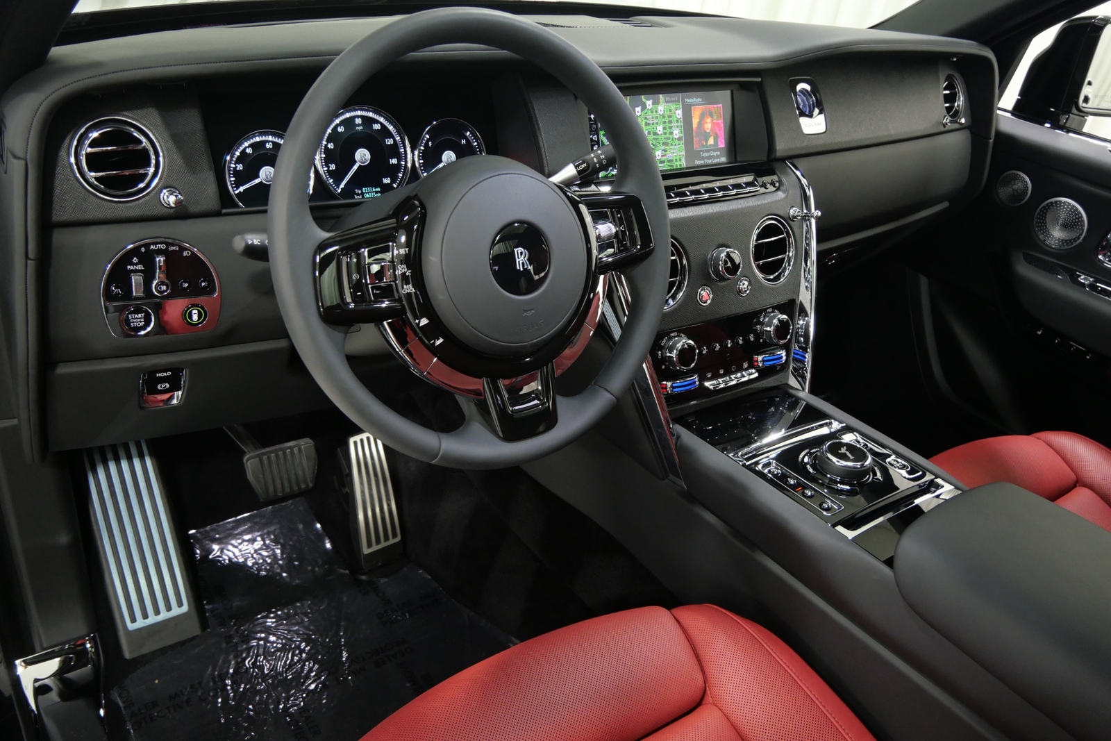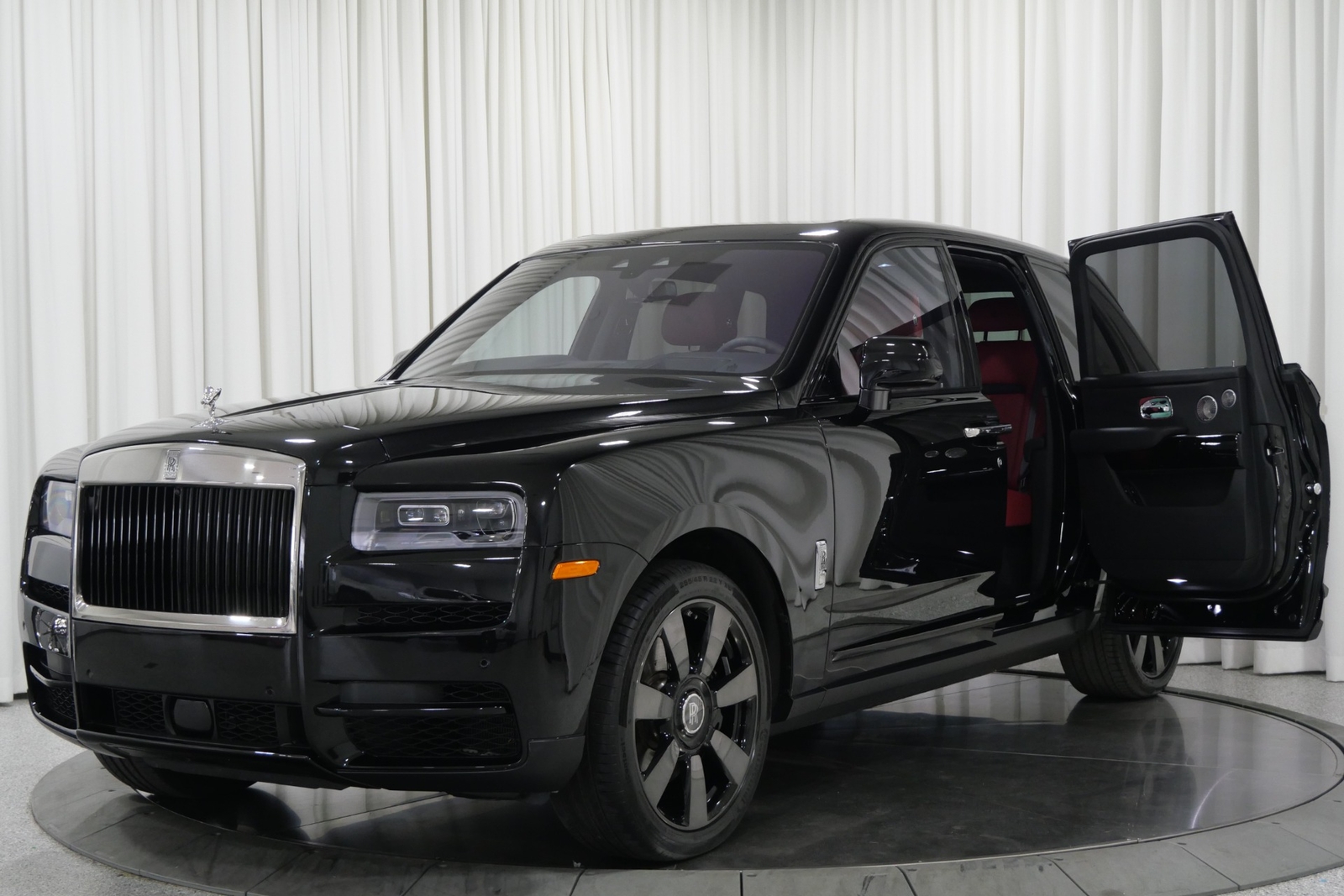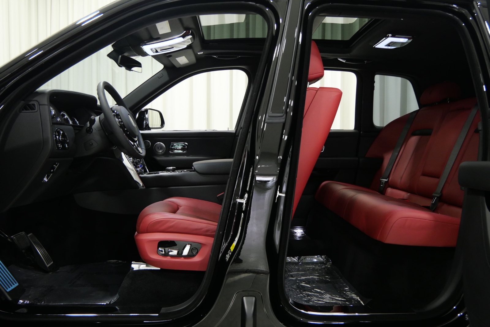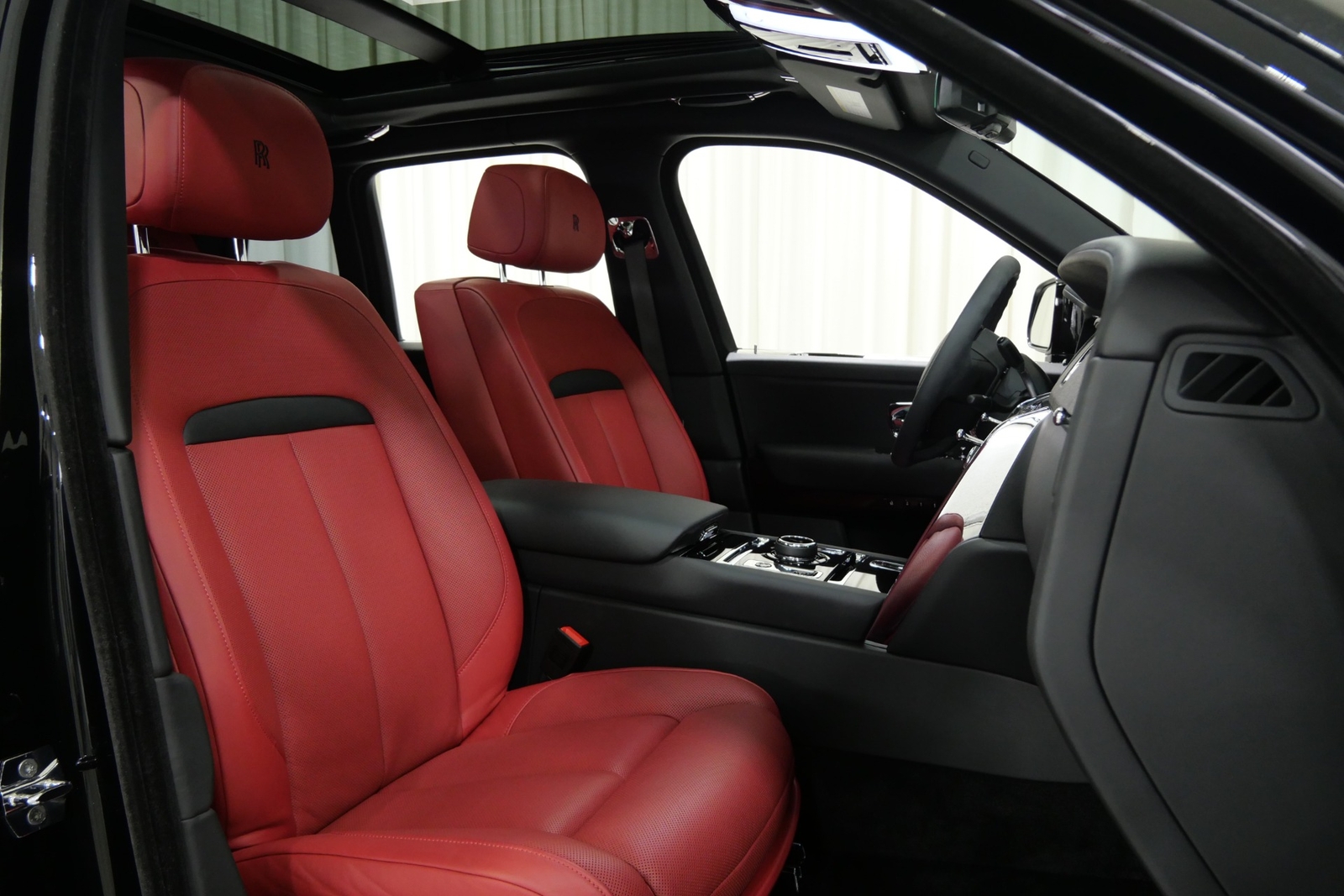 We have just added to our extensive exotic car inventory a beautiful 2022 Rolls Royce Cullinan in Black Diamond over Hotspur Red leather interior and only 6,035 miles. This Cullinan is loaded with: 6.75 Litre twin turbo V12, automatic transmission, 22 inch part polished shadow wheels, centre caps matched to wheel accents, dark exterior package (a $19,750 option), black exterior stainless steel package, Rolls Royce bespoke audio, bespoke interior editing, RR monogram to all headrests, panoramic sunroof, extended leather headliner, piano black interior trim, driver assistance systems (active cruise control with Stop and Go plus rear radar guided distance control, parking assist for parallel and reverse parking, and night vision, active cruise control, park assistant, night vision with pedestrian recognition), contrast coloring in black, camera system, heated and ventilated front seats, heated rear seats, polished stainless steel package, signature keys in black, lambswool floor mats and much more.