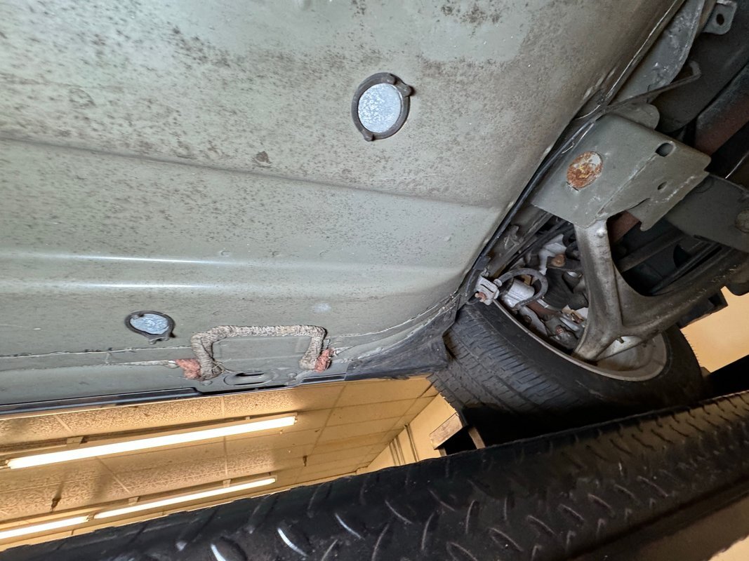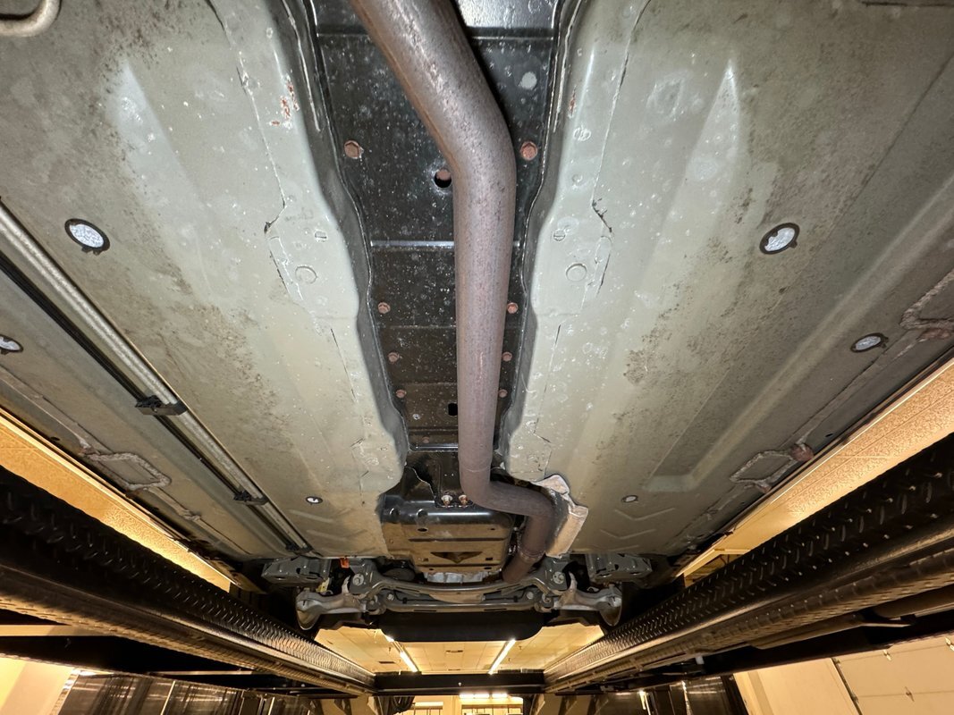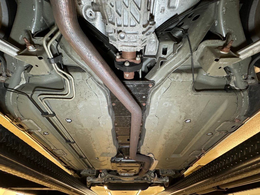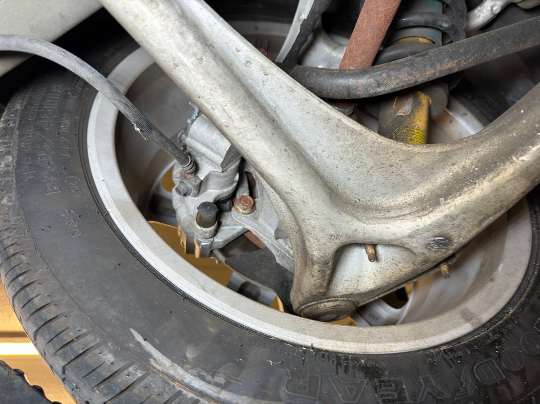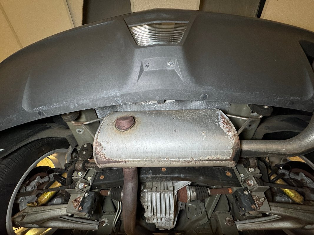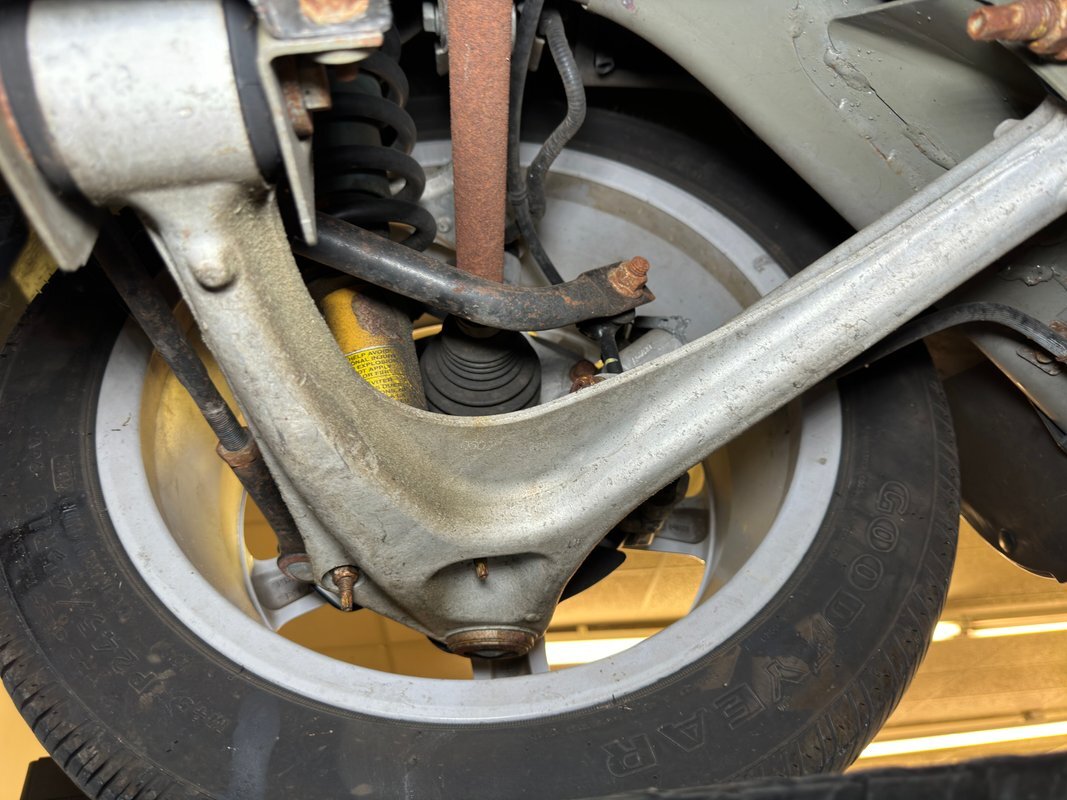 Clean as you'd expect for a rain free 17k mile car. Typical surface rust on uncoated parts including the single exhaust which travels down a ravine in the middle created by side belly pans and a long series of metal plates that houses the driveshaft. The original equipment muffler is in back and exudes a single tailpipe that exits the contoured rear valance. Short/long arm suspension, (double wishbone), occupies the front and rear independent systems.