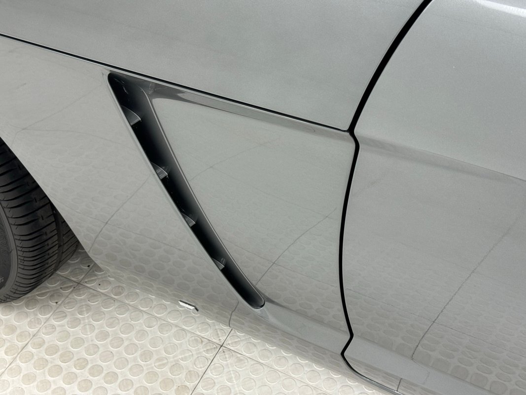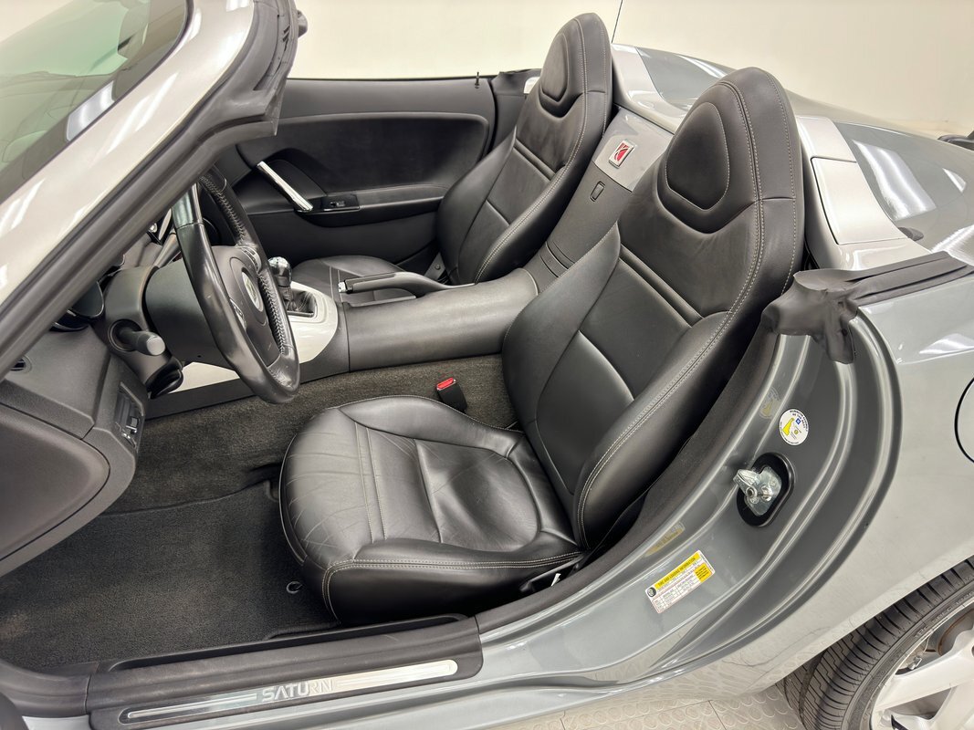 Notably low and wide, this Silver Graphite painted Sky's fascia leans back like a slicked back haircut, as if the wind shaped the car. It's a complex front end with chrome lined openings, a gaping lower grille, big cat eye headlights, and long cosmetic vents on the hood. And it's all very clean. Integrated side markers flow with the flat rim of the wheel openings and a forward canted vent behind the front wheels apply some character to the car and the wide polished windshield frame provides some extra bling and a touch of richness. The twin swellings behind the seats, fairing like, are a good looking feature that doubles as the tonneau for the stowed top. That top, in black canvas, is in great condition and has an extra layer of insulation inside for quieting. The plastic window follows the contours of the humps, while the top goes on to form canvas buttresses that track over the tonneau. The body terminates in a rounded butt with wrap-around taillights and a linear assembly of the antenna, third brake light, Saturn logo, license plate, and reverse light. 18-inch wheels house 45 series tires and look great. Chin scrapes are the only exterior flaw we noted.