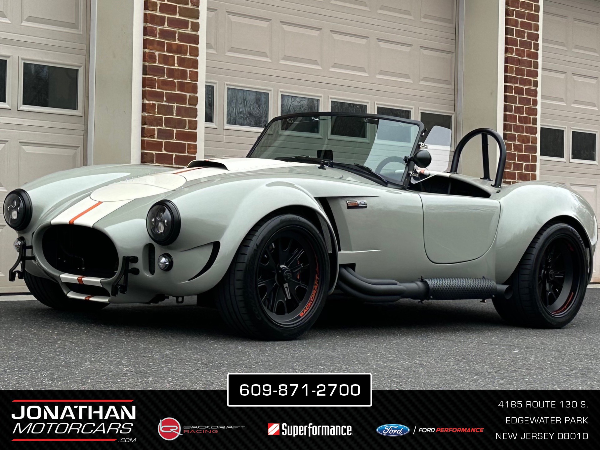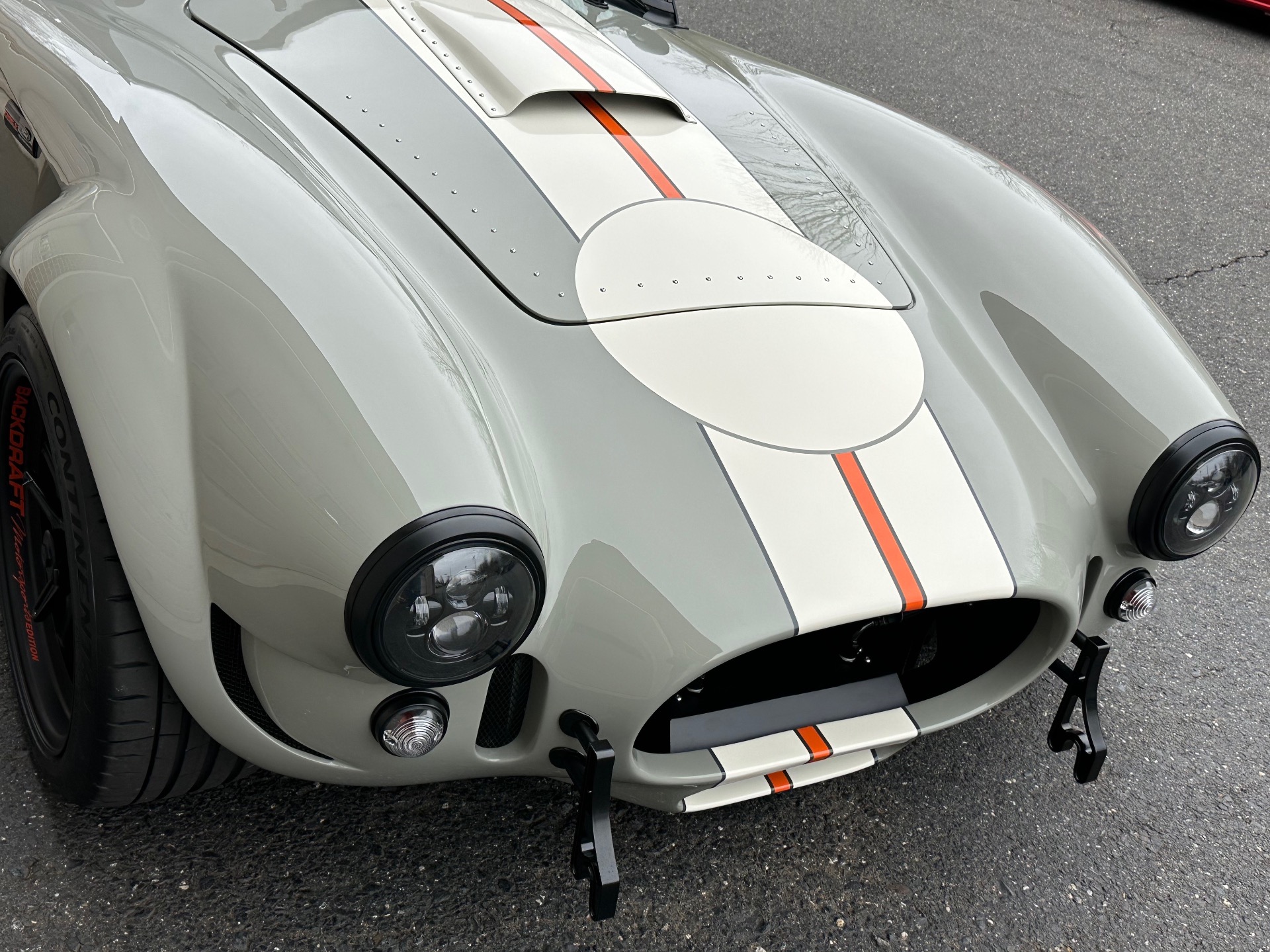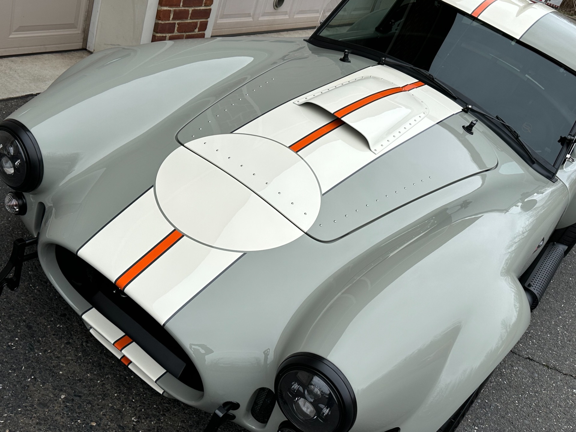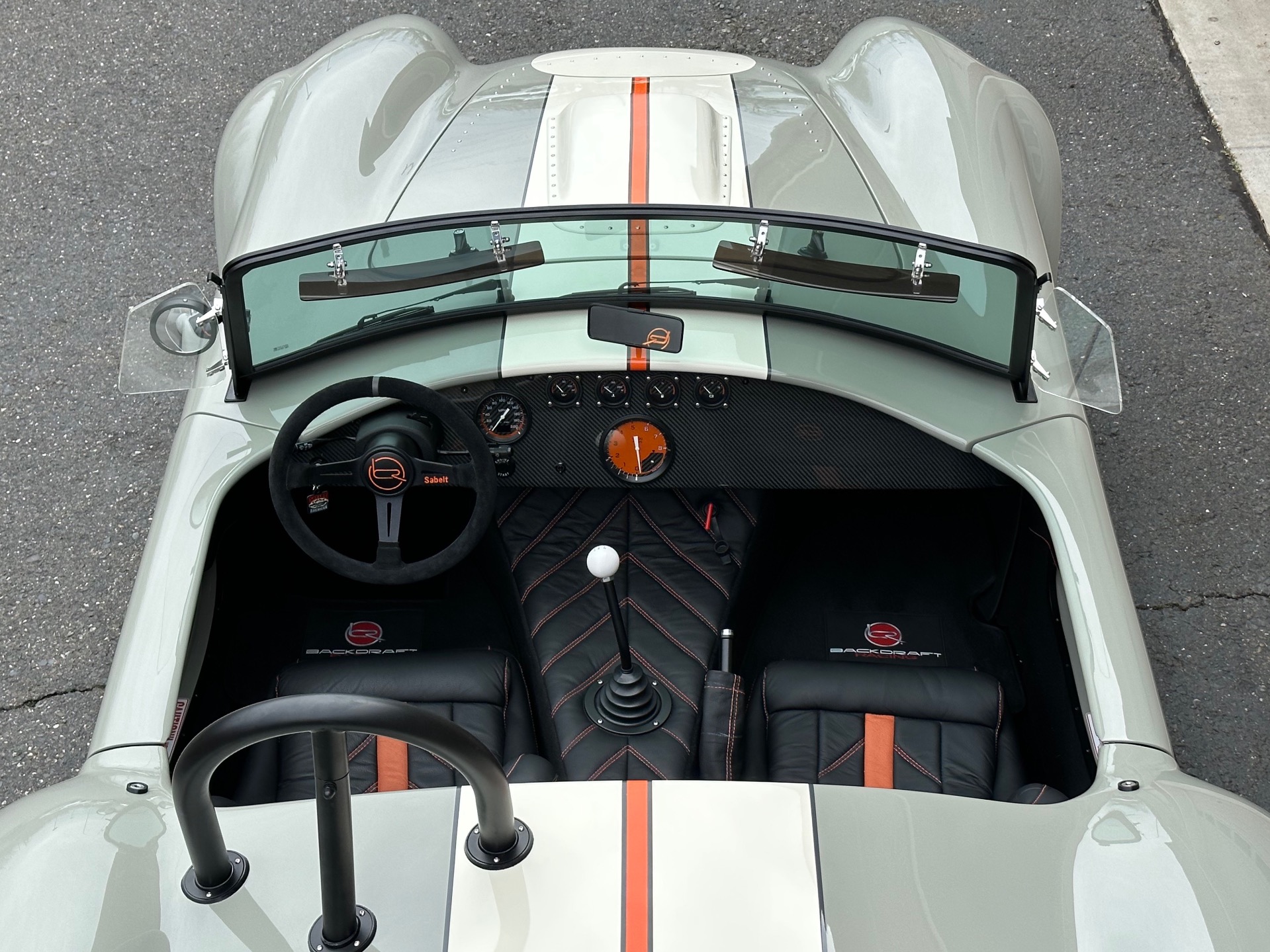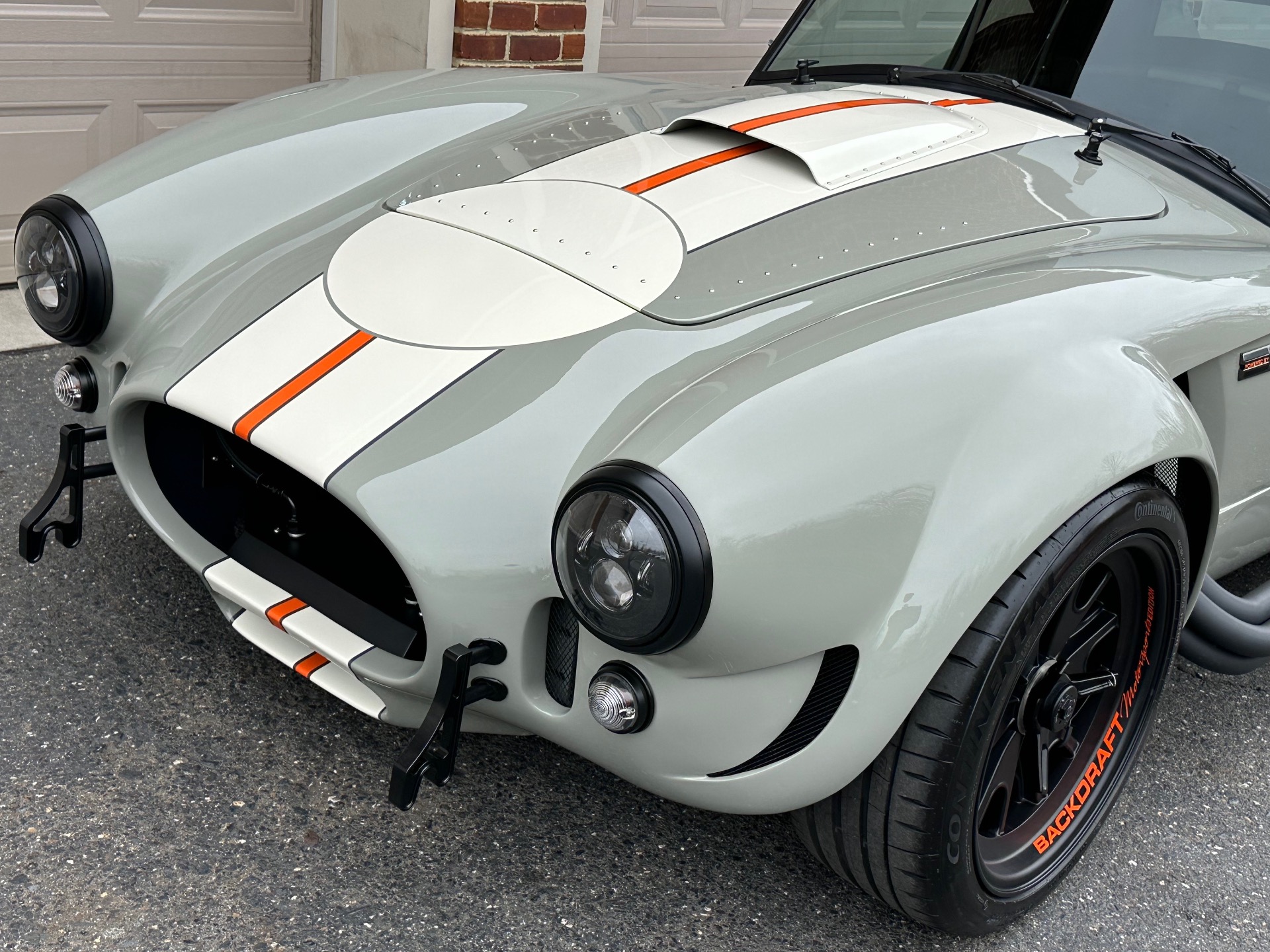 Featured at SEMA 2023 Backdraft Racing has arrived at JMC. We just could not resists this one. An unbelievable one of one backdraft cobra build. This is loaded with options and is done in the first ever Porsche fashion gray with a three color stripe. Wimbledon white, gulf orange, and grigio. Creating an awesome color combination on the cobra. Powered by the Roush 427IR 8 stack fuel injection engine making over 560 horse power. Some upgraded options included are power steering, big and tall edition, black and orange diagonal leather interior, carbon fiber dash, suede steering wheel, custom shift knob, cam lock style seat belts, painted engine compartment to match, paint protection, led headlights, removable hard top, wilwood big brake kit, remote brake and clutch reservoirs, oil cooler, the new GTR body, ceramic polish, aluminum gas tank powder coated black, night edition engine with custom painted valve covers and trumpets. This is a one of kind cobra available for purchase at Jonathan Motorcars. We have financing and can ship anywhere in the world. Call today!