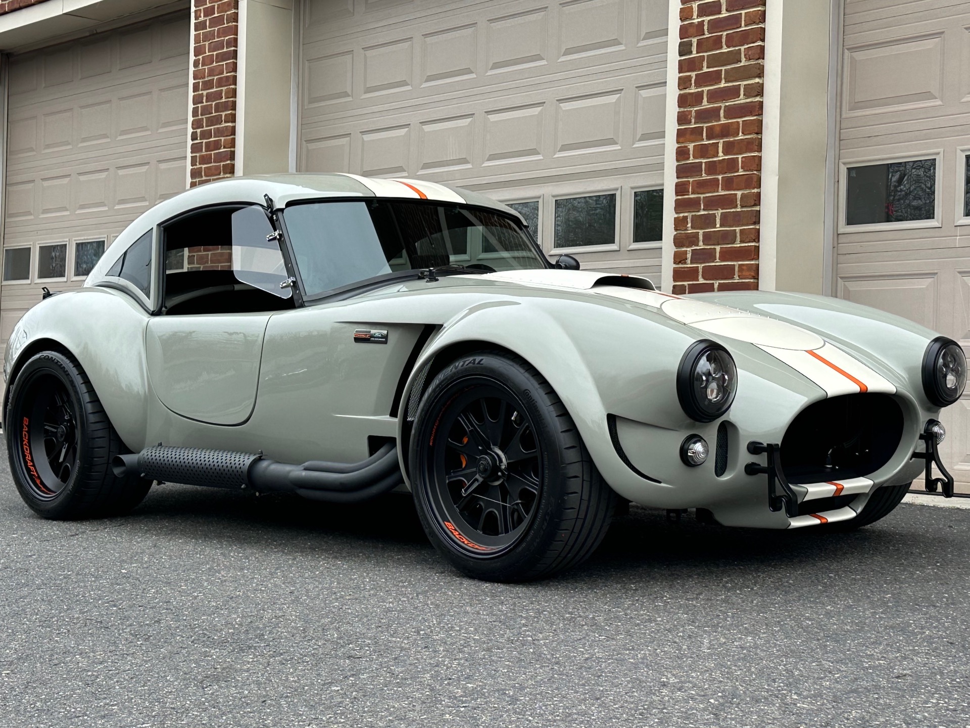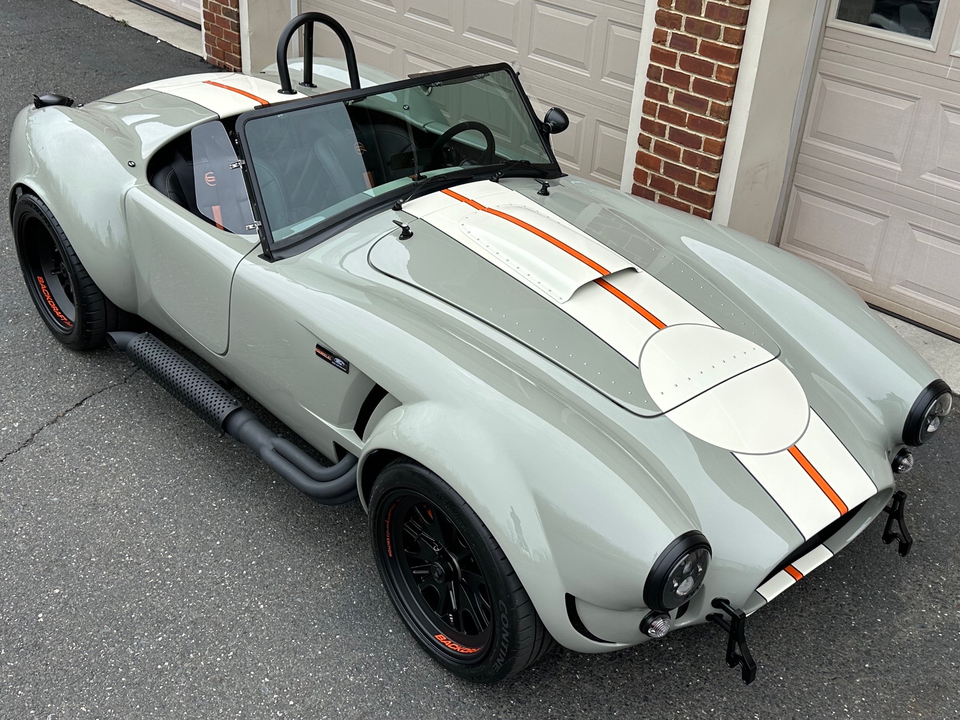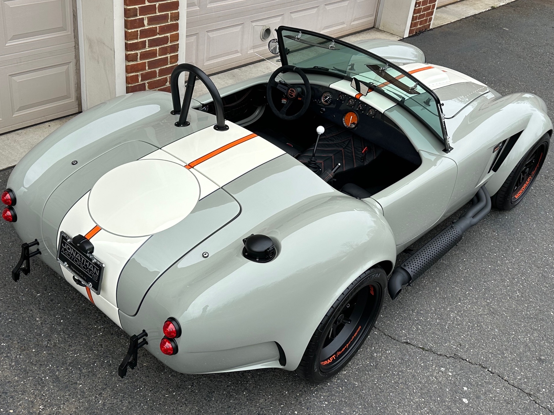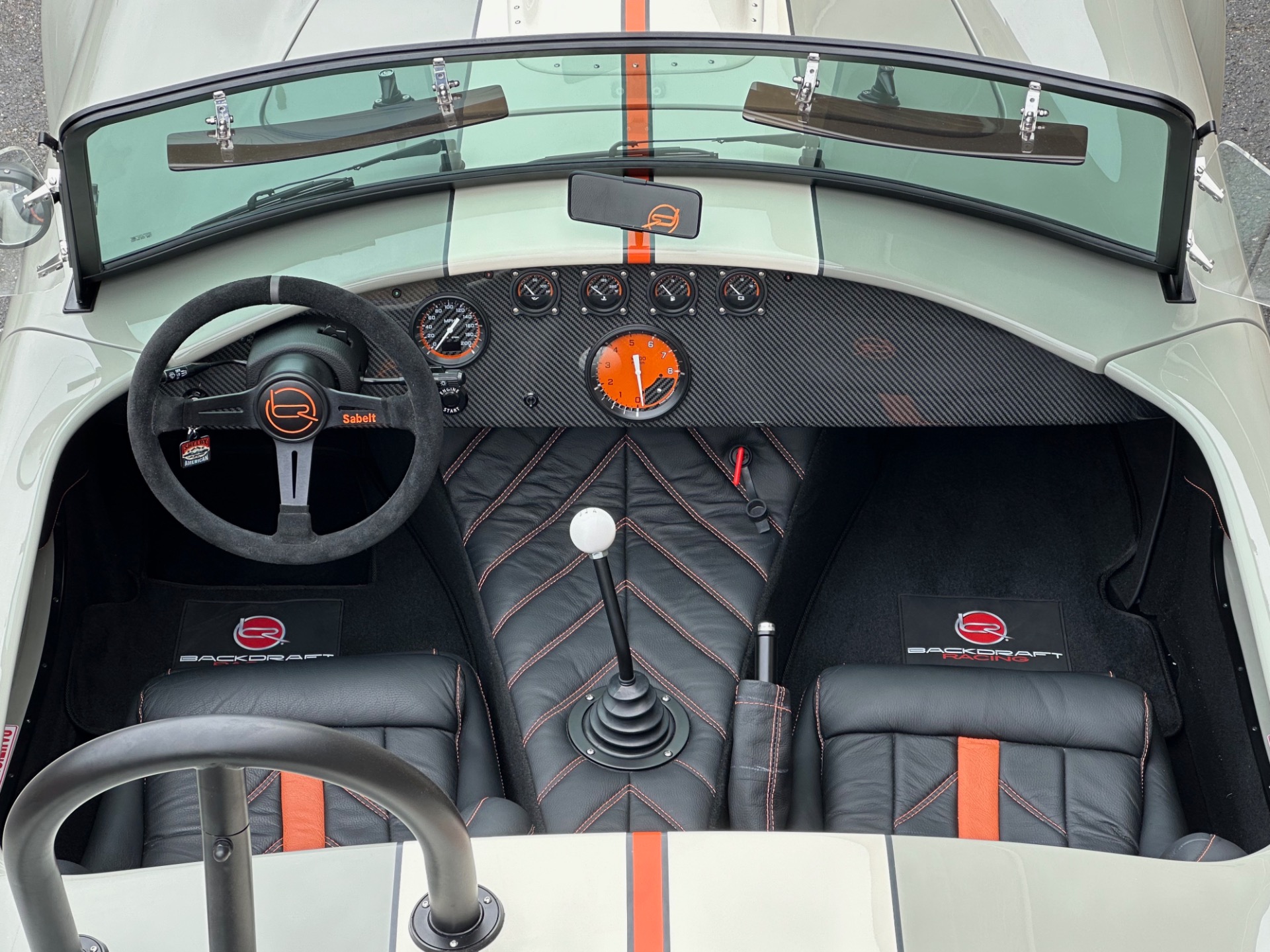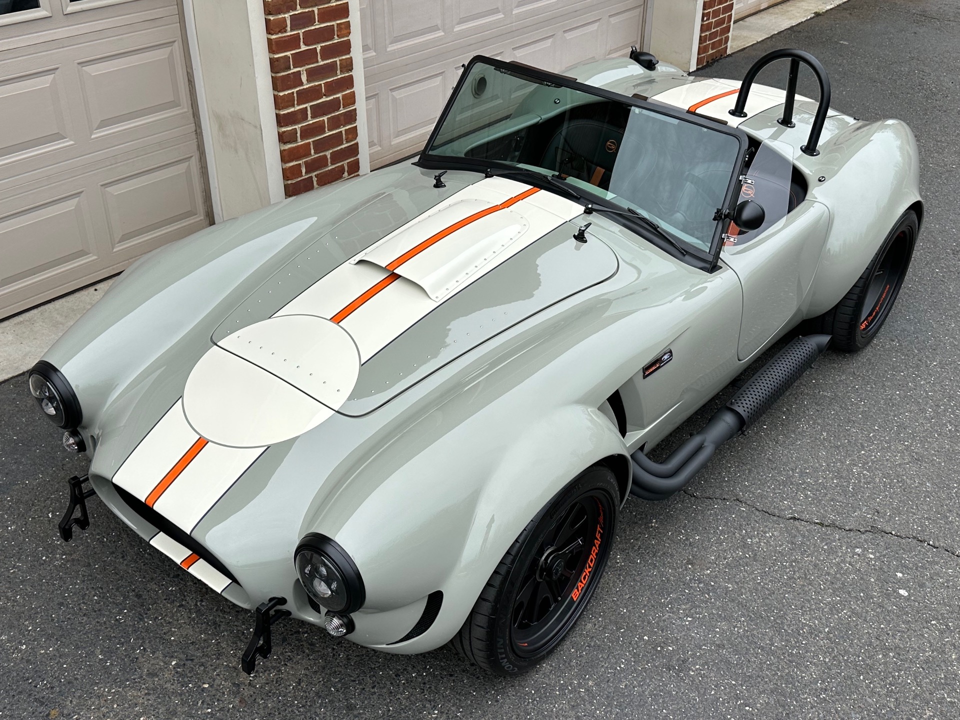 Featured at SEMA 2023 Backdraft Racing has arrived at JMC. We just could not resists this one. An unbelievable one of one backdraft cobra build. This is loaded with options and is done in the first ever Porsche fashion gray with a three color stripe. Wimbledon white, gulf orange, and grigio. Creating an awesome color combination on the cobra. Powered by the Roush 427IR 8 stack fuel injection engine making over 560 horse power. Some upgraded options included are power steering, big and tall edition, black and orange diagonal leather interior, carbon fiber dash, suede steering wheel, custom shift knob, cam lock style seat belts, painted engine compartment to match, paint protection, led headlights, removable hard top, wilwood big brake kit, remote brake and clutch reservoirs, oil cooler, the new GTR body, ceramic polish, aluminum gas tank powder coated black, night edition engine with custom painted valve covers and trumpets. This is a one of kind cobra available for purchase at Jonathan Motorcars. We have financing and can ship anywhere in the world. Call today!