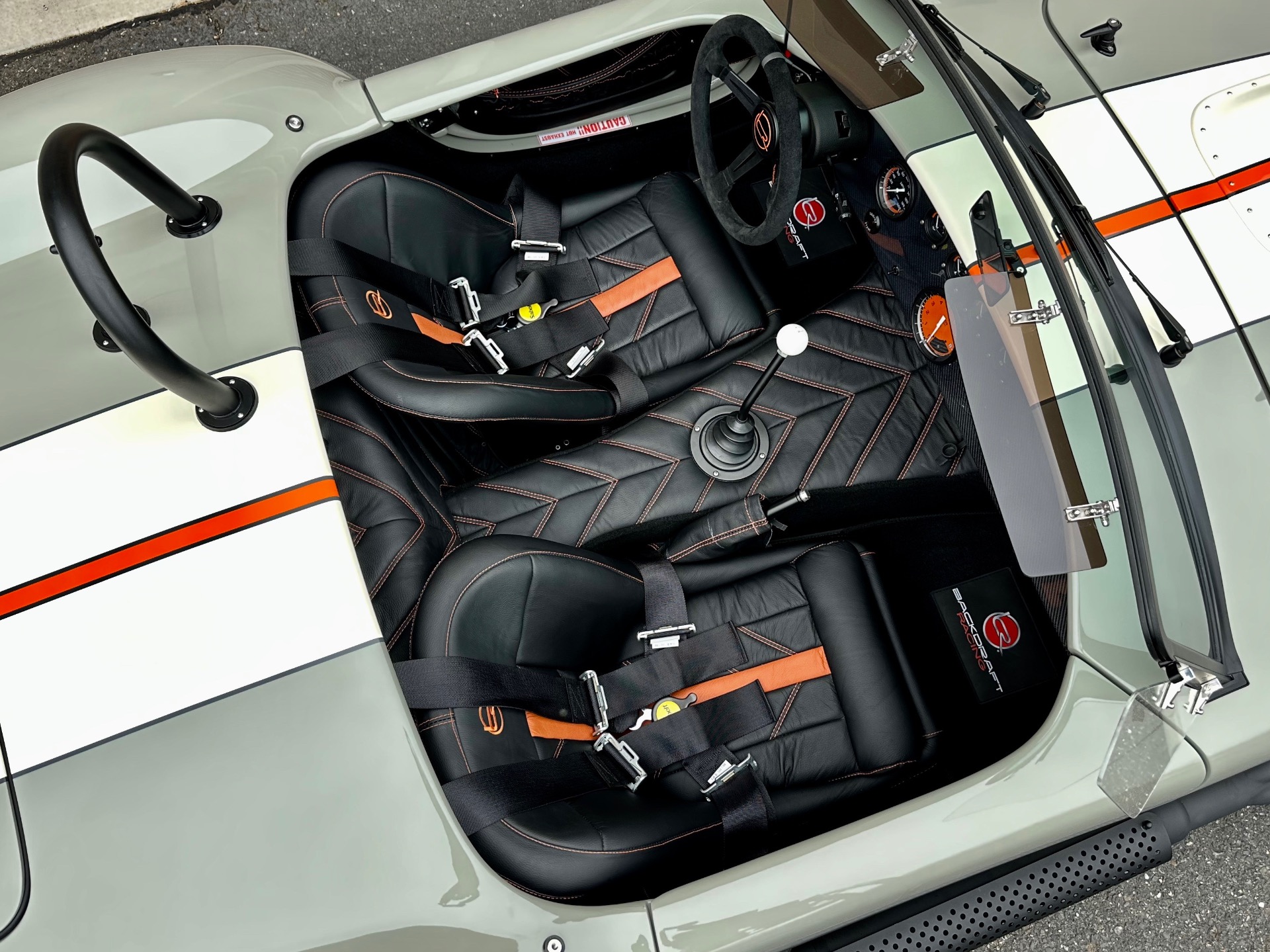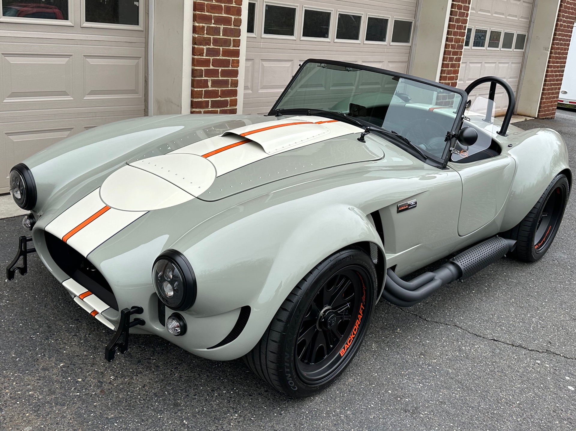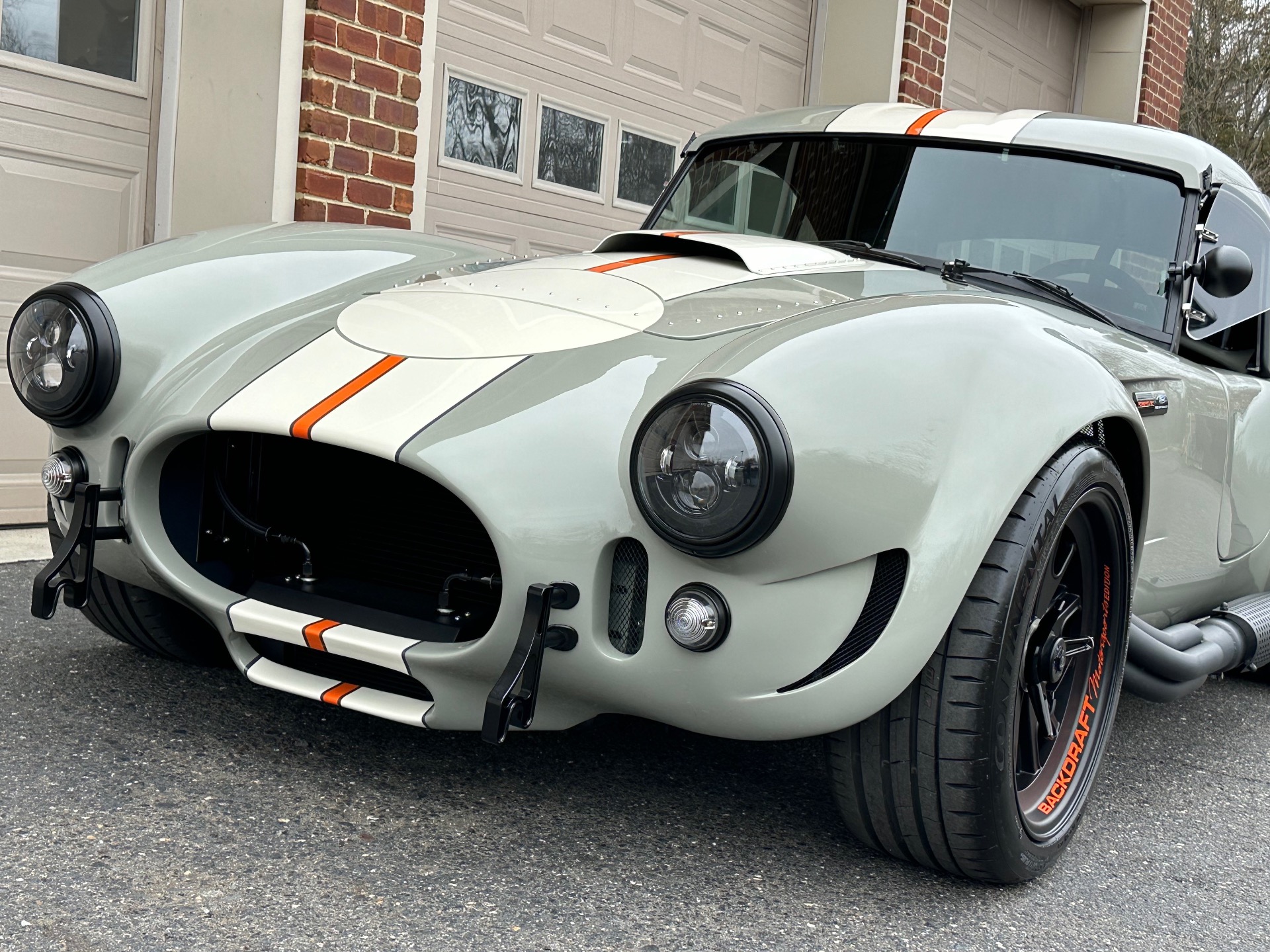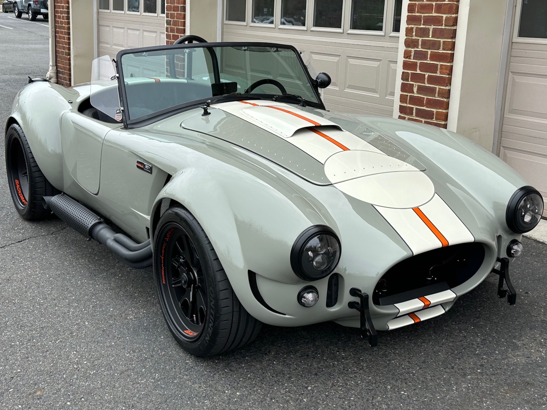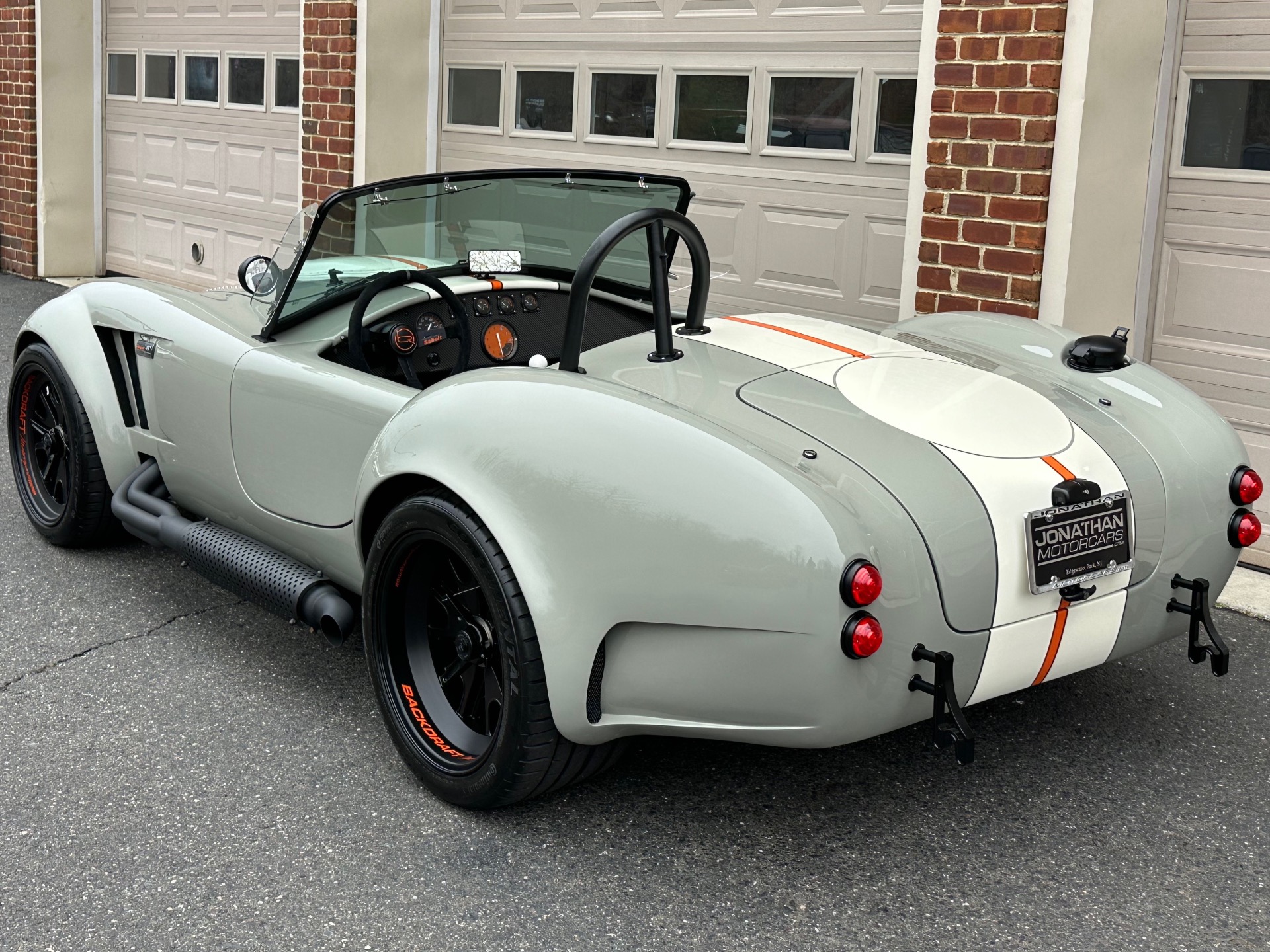 Featured at SEMA 2023 Backdraft Racing has arrived at JMC. We just could not resists this one. An unbelievable one of one backdraft cobra build. This is loaded with options and is done in the first ever Porsche fashion gray with a three color stripe. Wimbledon white, gulf orange, and grigio. Creating an awesome color combination on the cobra. Powered by the Roush 427IR 8 stack fuel injection engine making over 560 horse power. Some upgraded options included are power steering, big and tall edition, black and orange diagonal leather interior, carbon fiber dash, suede steering wheel, custom shift knob, cam lock style seat belts, painted engine compartment to match, paint protection, led headlights, removable hard top, wilwood big brake kit, remote brake and clutch reservoirs, oil cooler, the new GTR body, ceramic polish, aluminum gas tank powder coated black, night edition engine with custom painted valve covers and trumpets. This is a one of kind cobra available for purchase at Jonathan Motorcars. We have financing and can ship anywhere in the world. Call today!