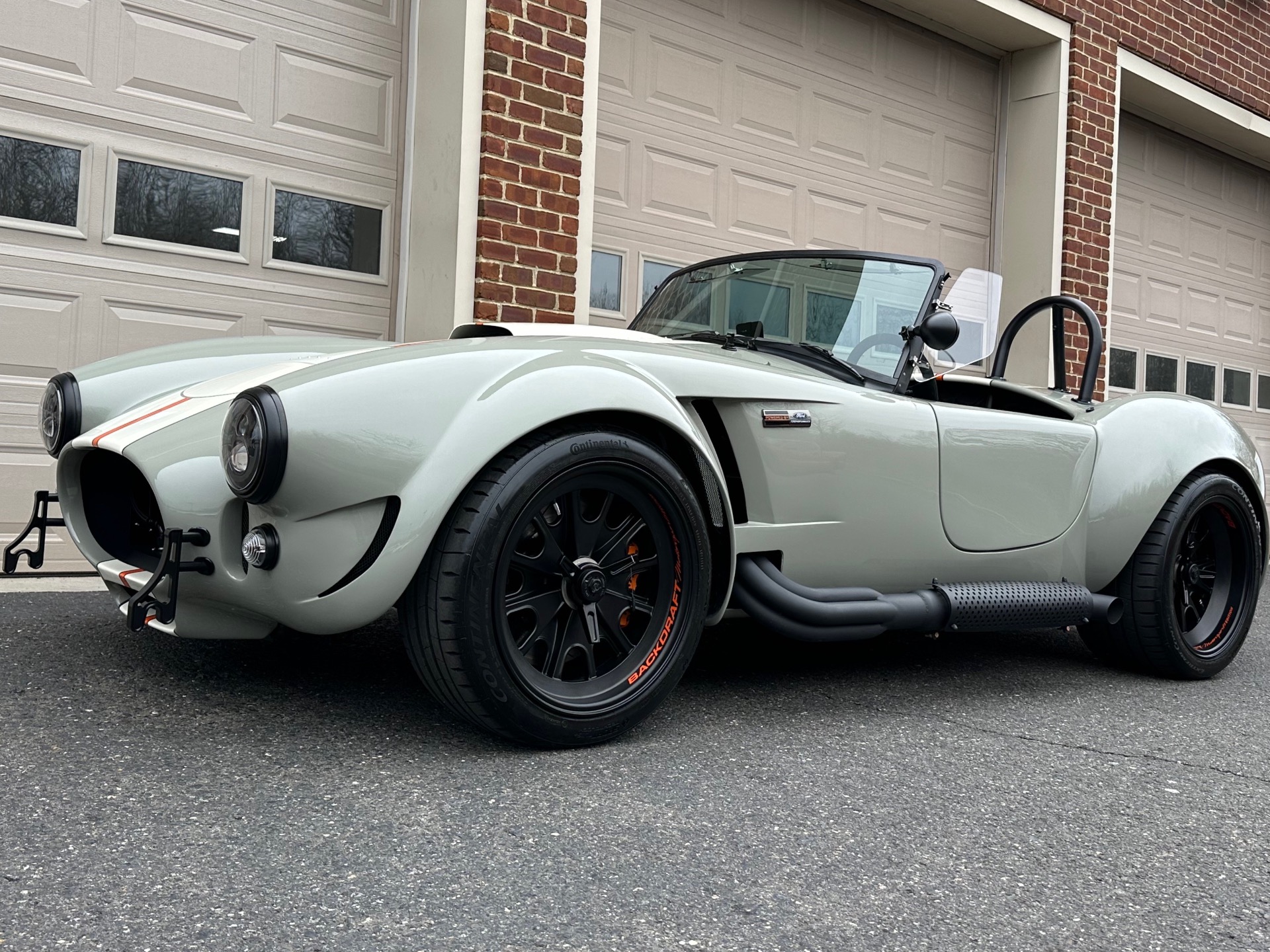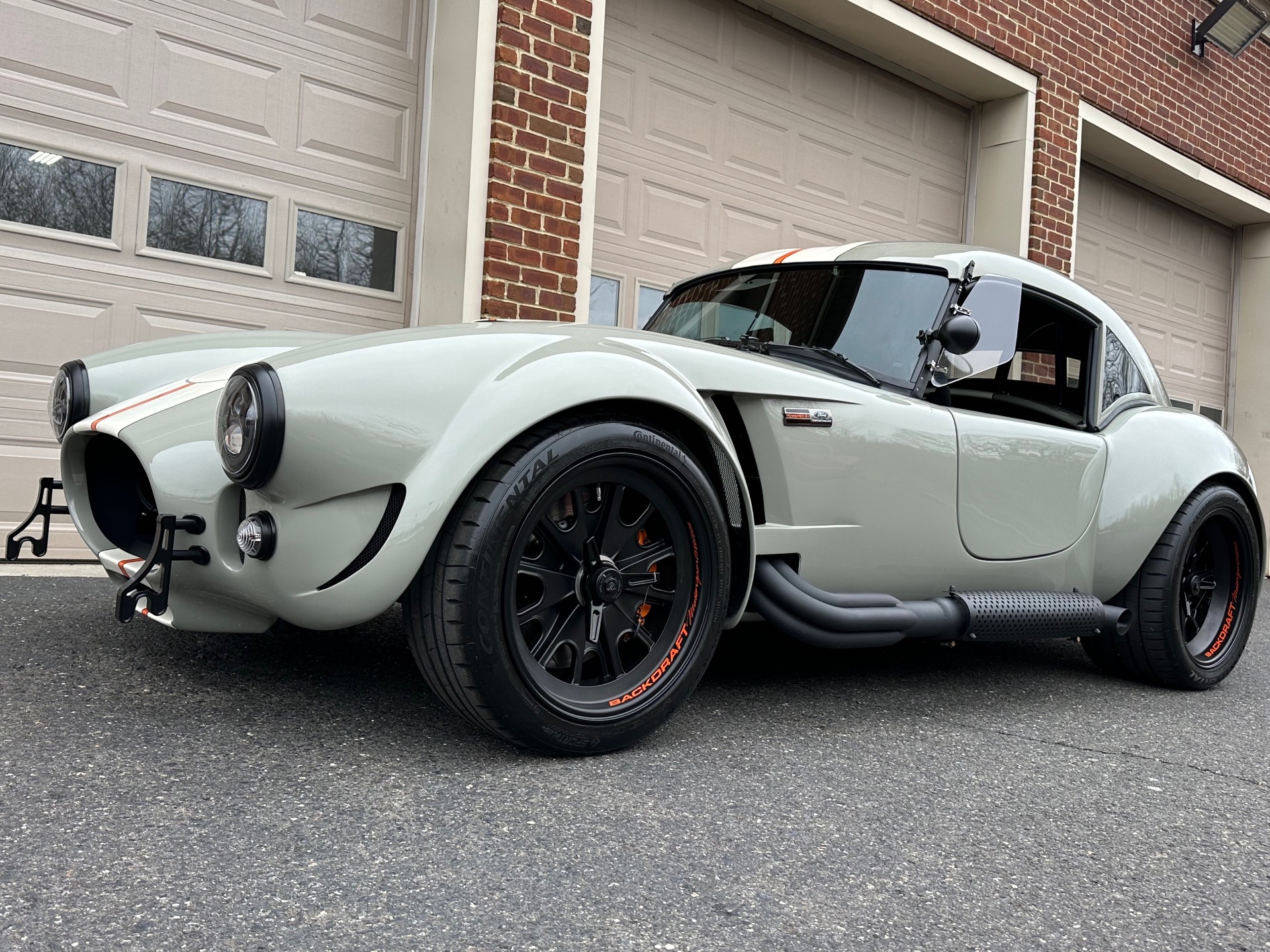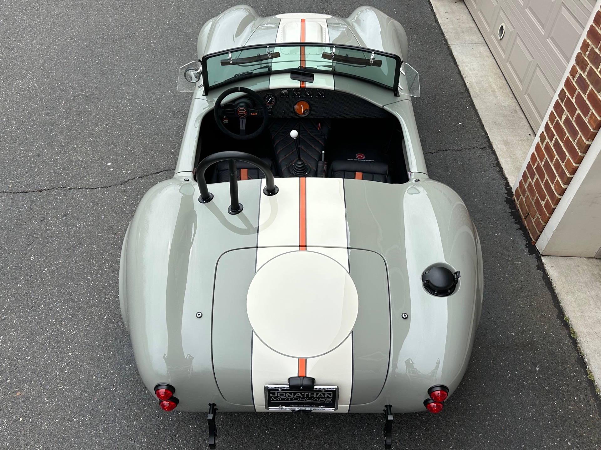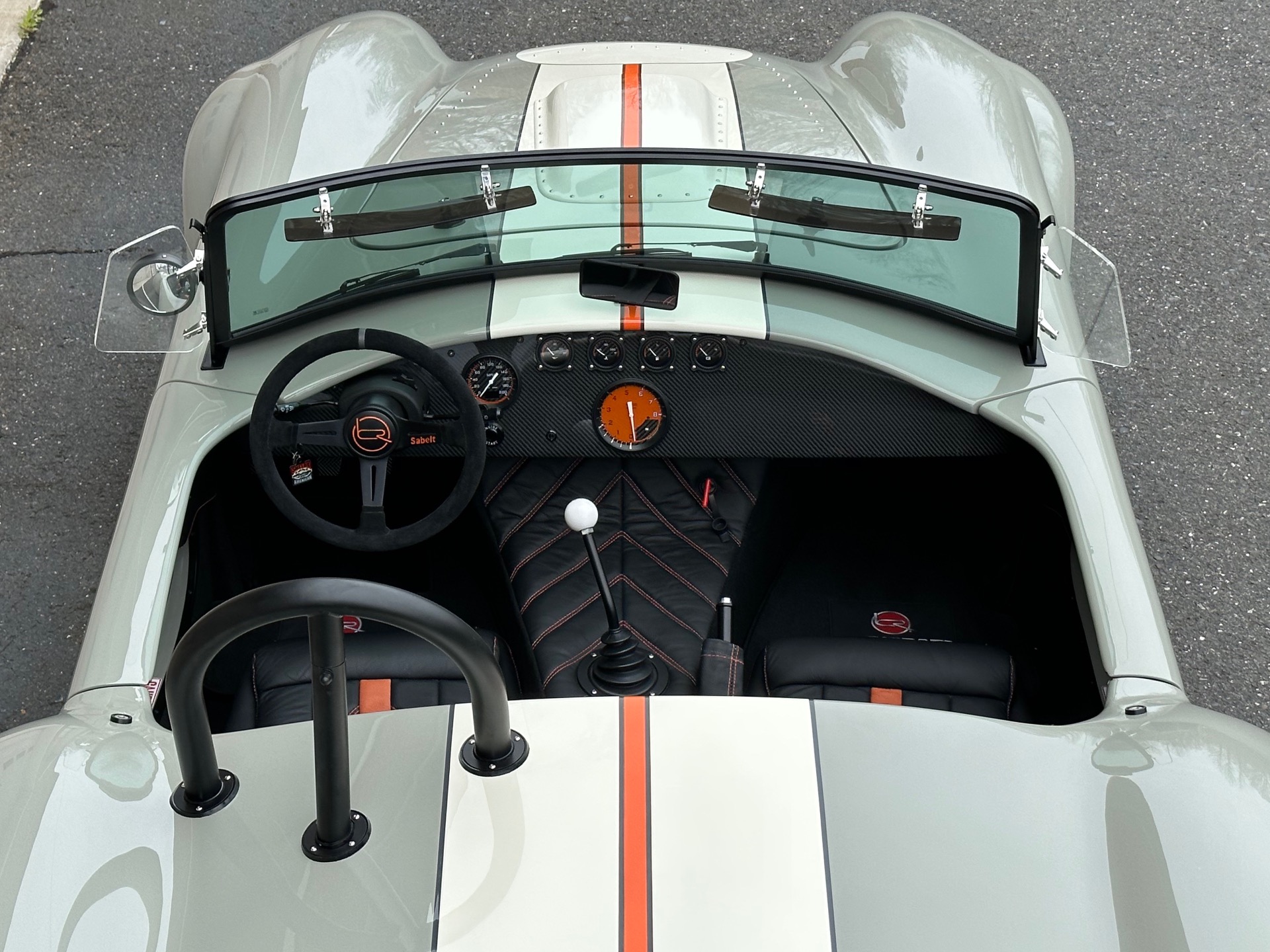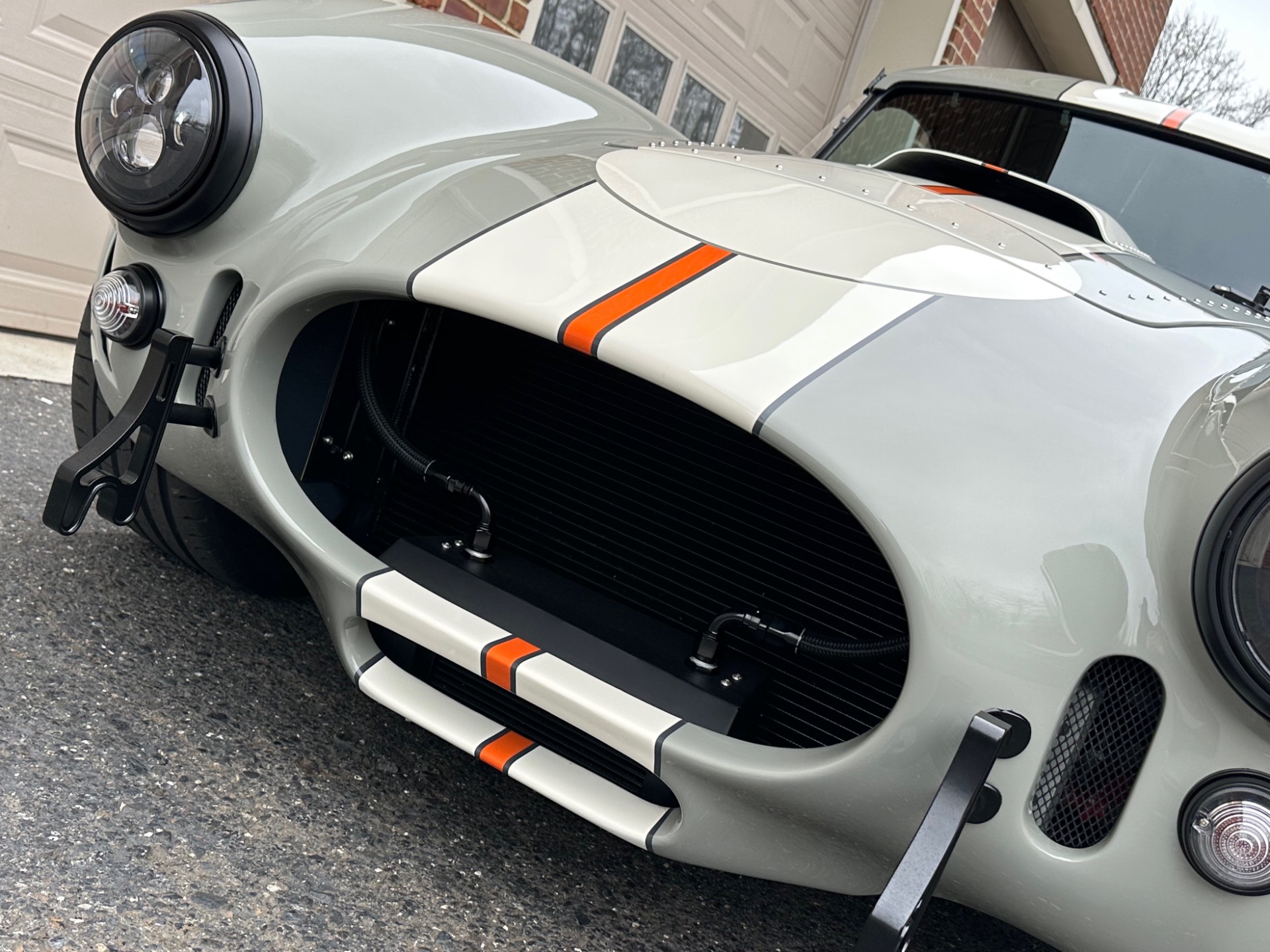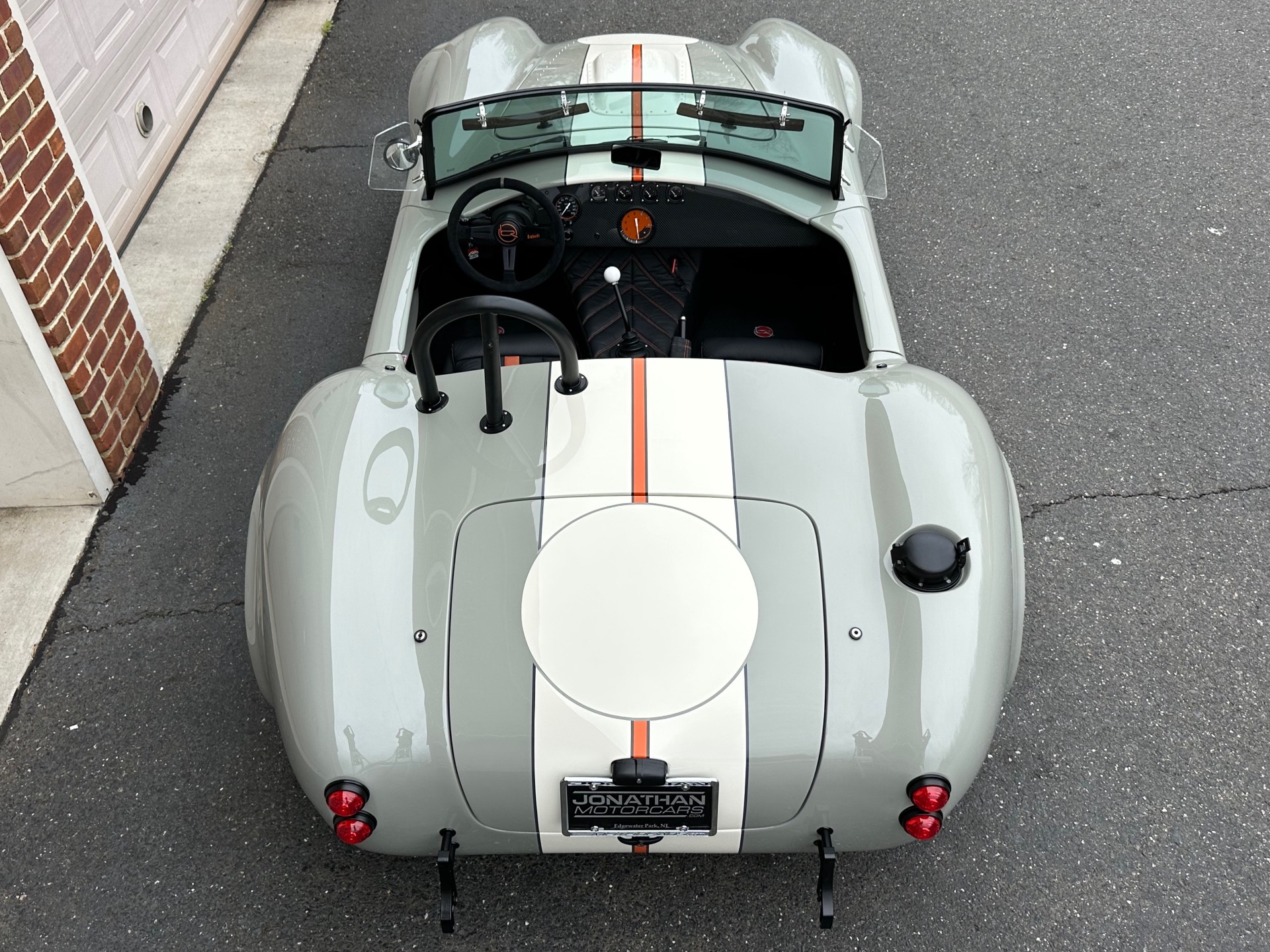 Featured at SEMA 2023 Backdraft Racing has arrived at JMC. We just could not resists this one. An unbelievable one of one backdraft cobra build. This is loaded with options and is done in the first ever Porsche fashion gray with a three color stripe. Wimbledon white, gulf orange, and grigio. Creating an awesome color combination on the cobra. Powered by the Roush 427IR 8 stack fuel injection engine making over 560 horse power. Some upgraded options included are power steering, big and tall edition, black and orange diagonal leather interior, carbon fiber dash, suede steering wheel, custom shift knob, cam lock style seat belts, painted engine compartment to match, paint protection, led headlights, removable hard top, wilwood big brake kit, remote brake and clutch reservoirs, oil cooler, the new GTR body, ceramic polish, aluminum gas tank powder coated black, night edition engine with custom painted valve covers and trumpets. This is a one of kind cobra available for purchase at Jonathan Motorcars. We have financing and can ship anywhere in the world. Call today!