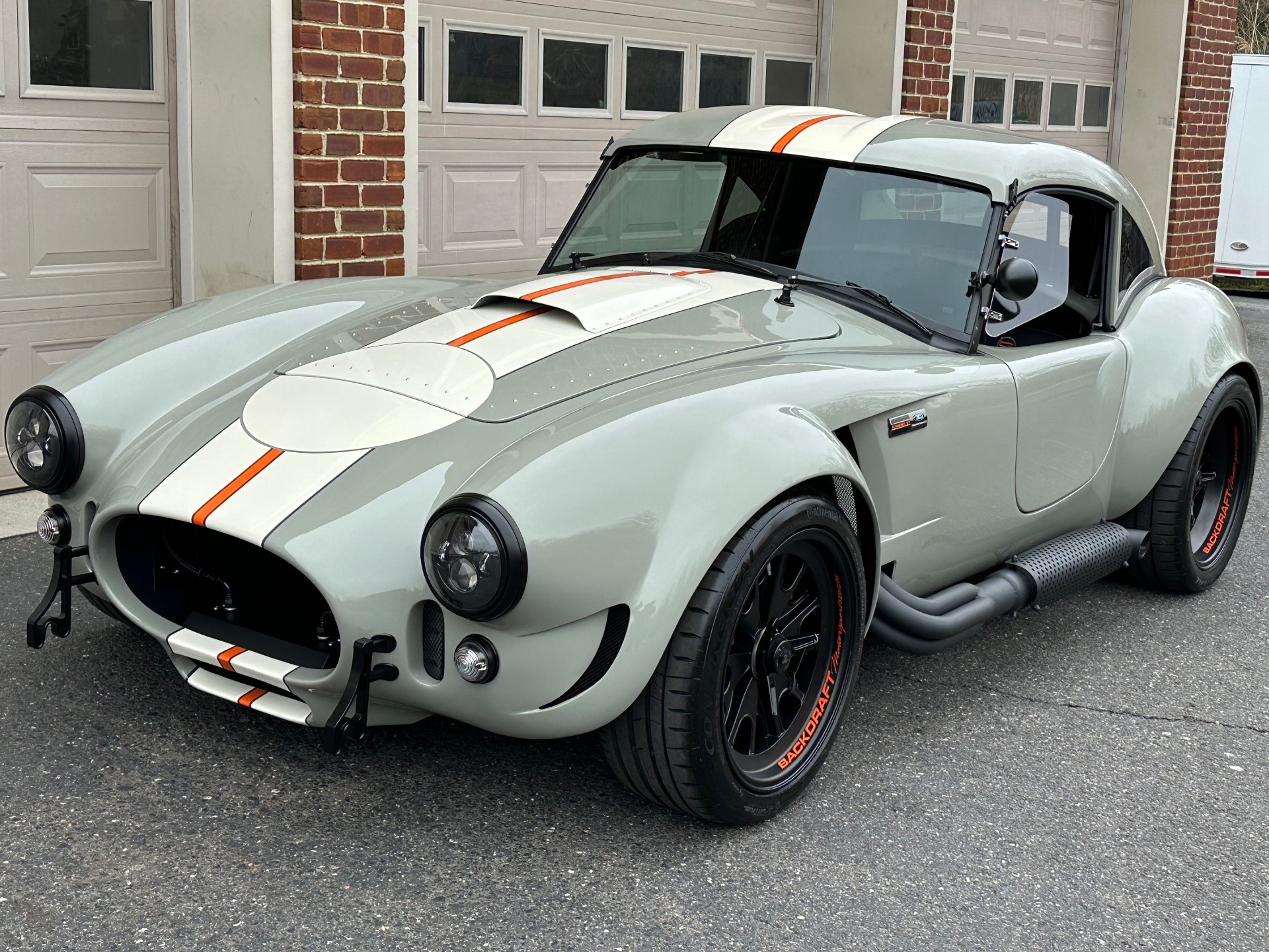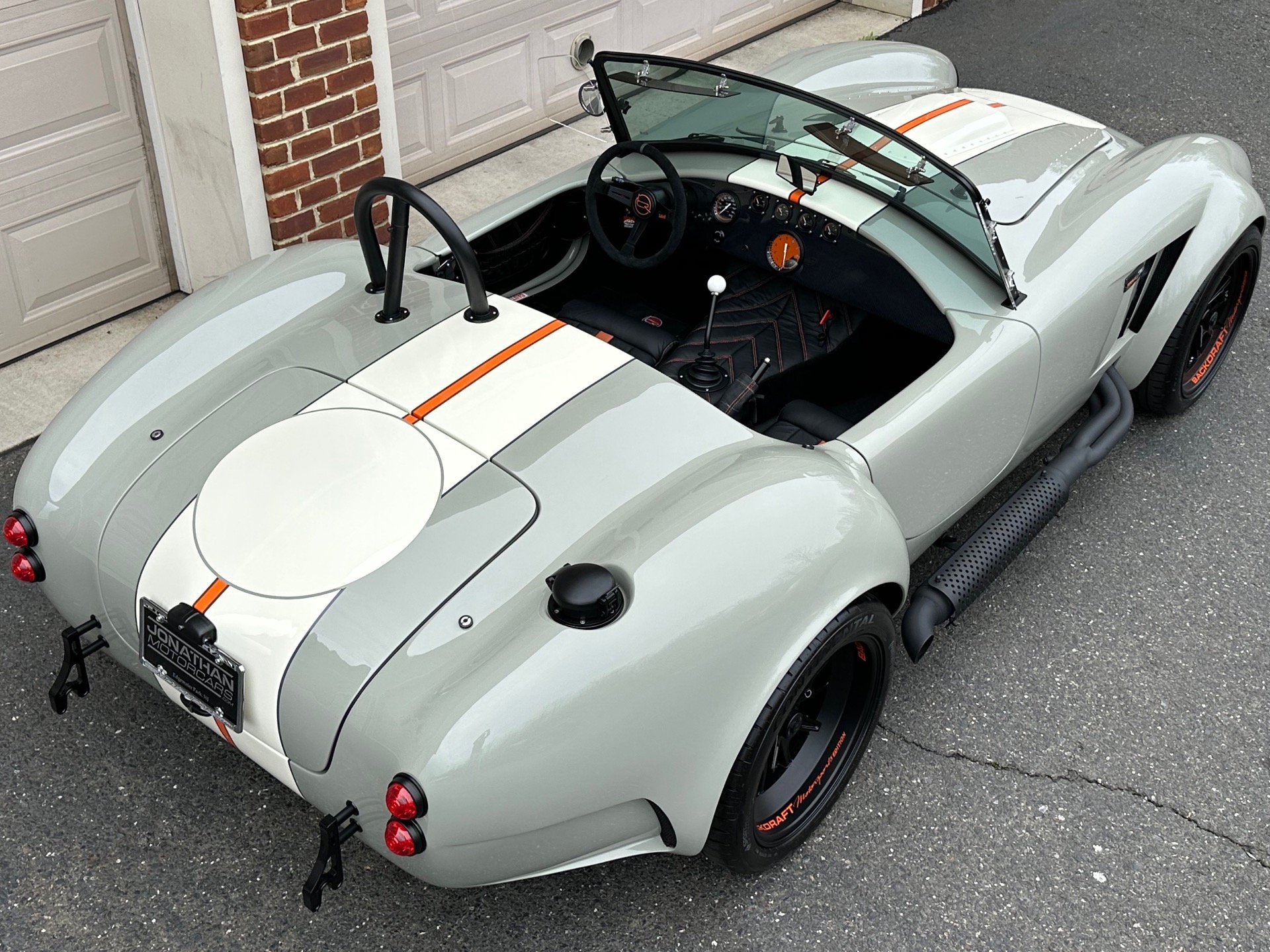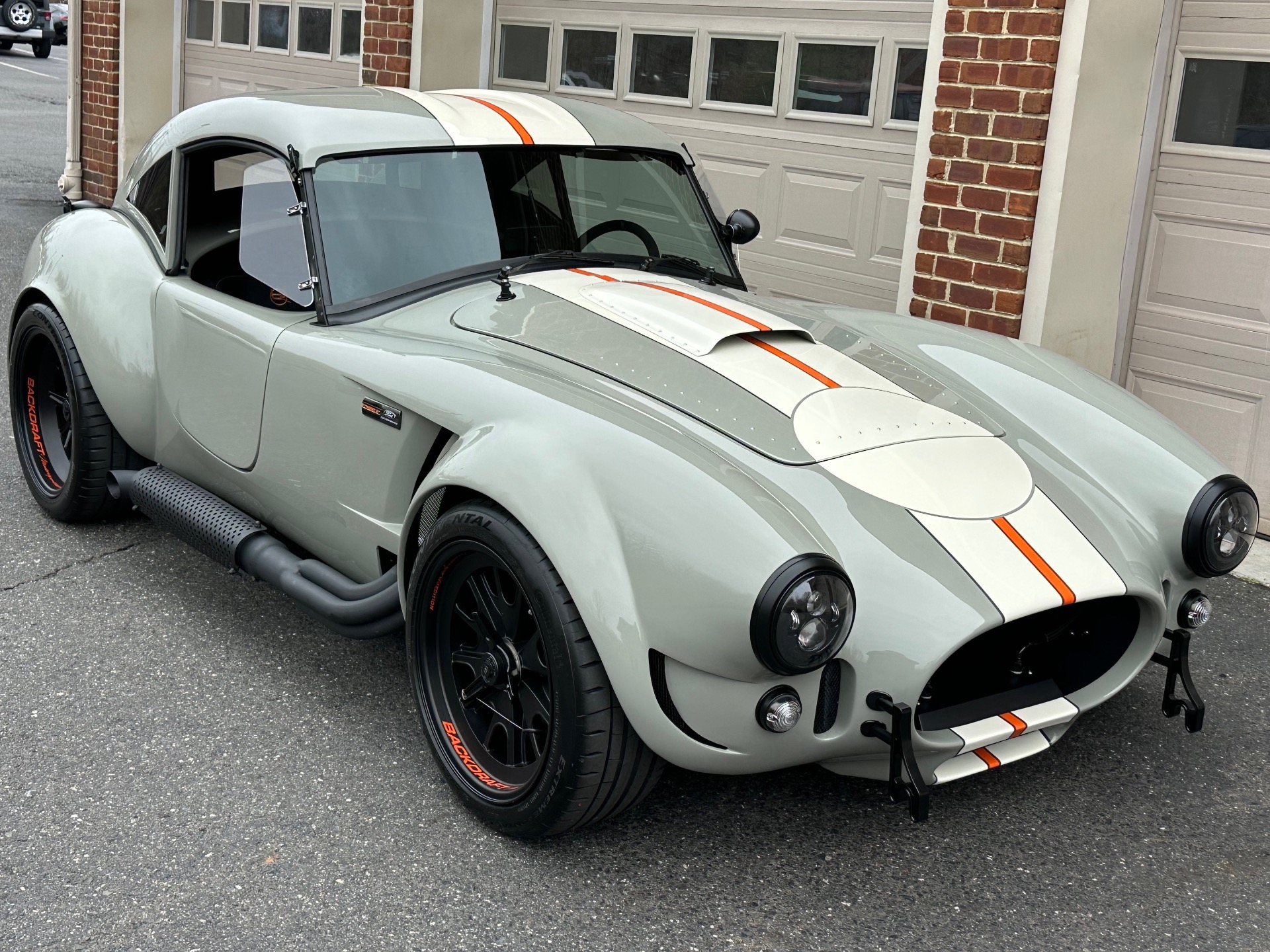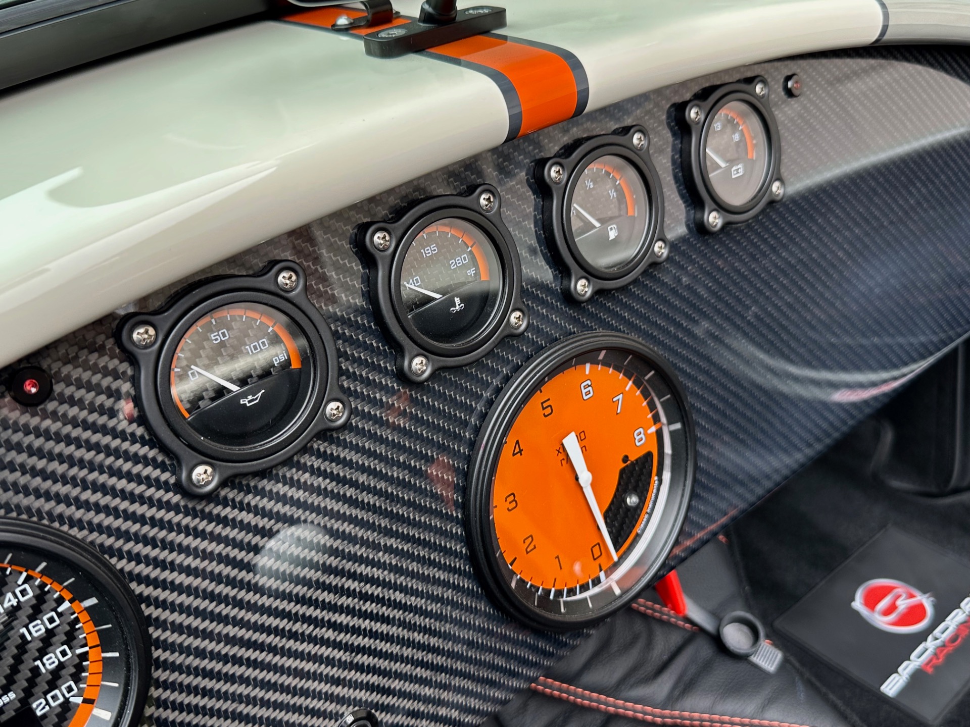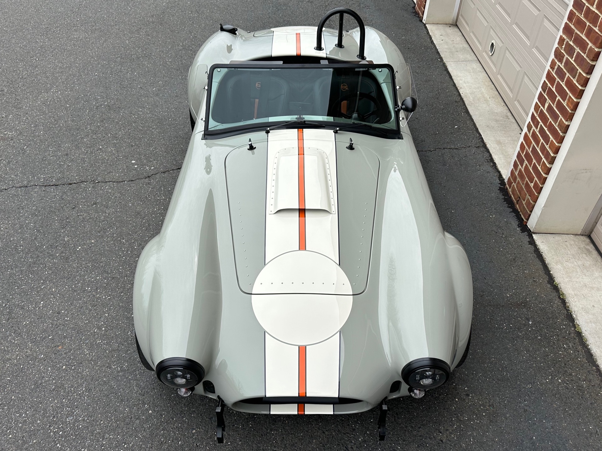Featured at SEMA 2023 Backdraft Racing has arrived at JMC. We just could not resists this one. An unbelievable one of one backdraft cobra build. This is loaded with options and is done in the first ever Porsche fashion gray with a three color stripe. Wimbledon white, gulf orange, and grigio. Creating an awesome color combination on the cobra. Powered by the Roush 427IR 8 stack fuel injection engine making over 560 horse power. Some upgraded options included are power steering, big and tall edition, black and orange diagonal leather interior, carbon fiber dash, suede steering wheel, custom shift knob, cam lock style seat belts, painted engine compartment to match, paint protection, led headlights, removable hard top, wilwood big brake kit, remote brake and clutch reservoirs, oil cooler, the new GTR body, ceramic polish, aluminum gas tank powder coated black, night edition engine with custom painted valve covers and trumpets. This is a one of kind cobra available for purchase at Jonathan Motorcars. We have financing and can ship anywhere in the world. Call today!