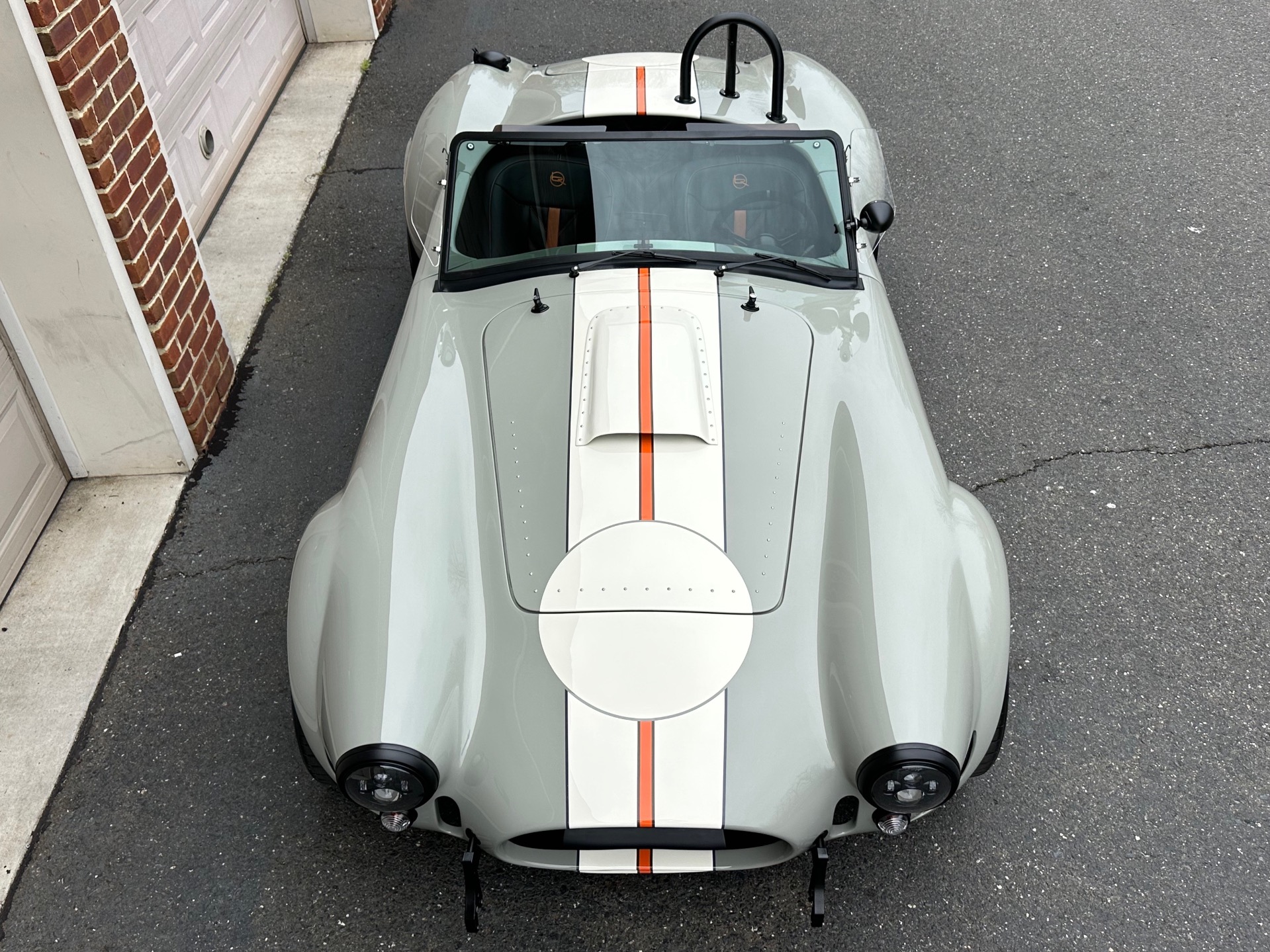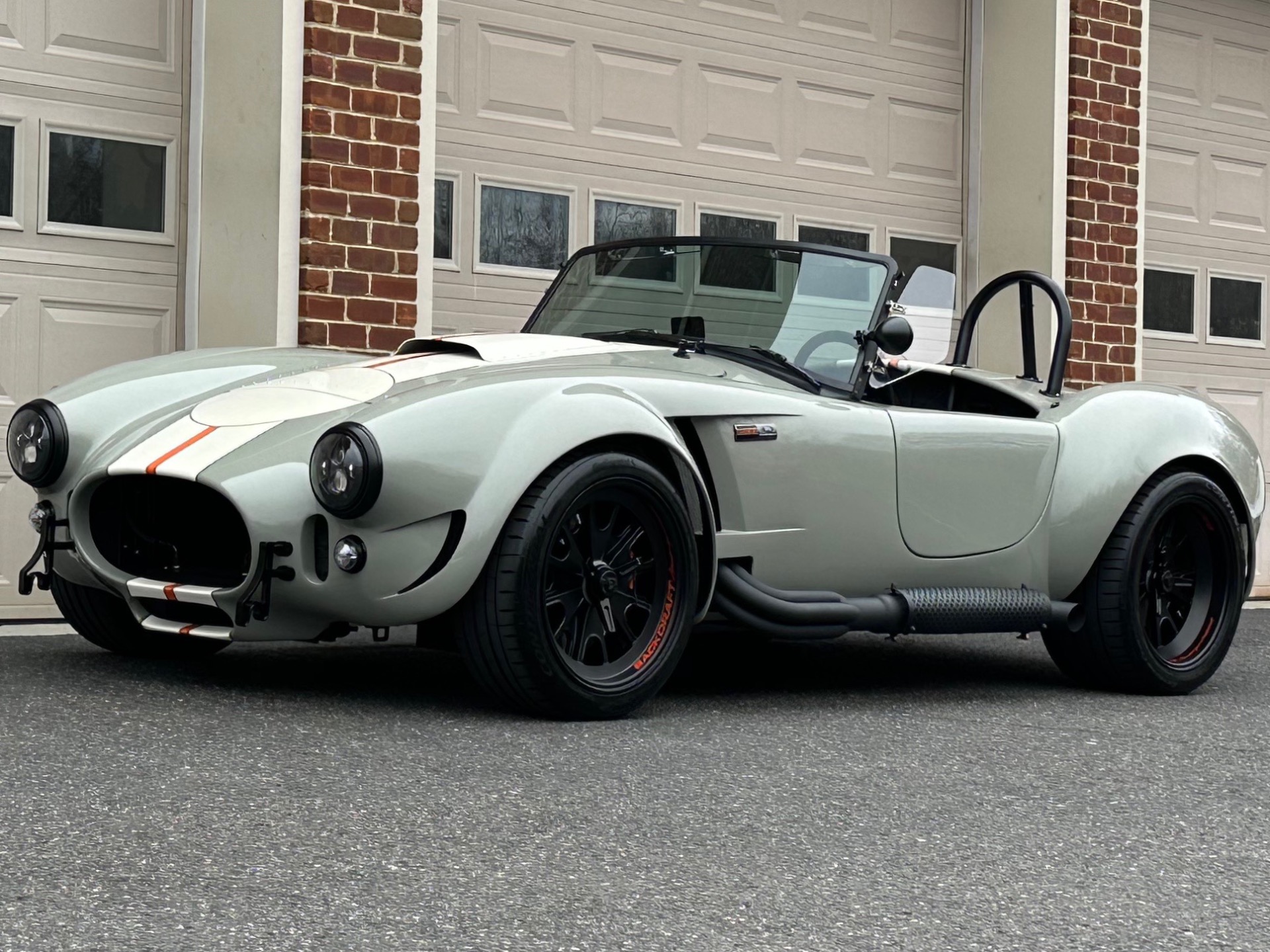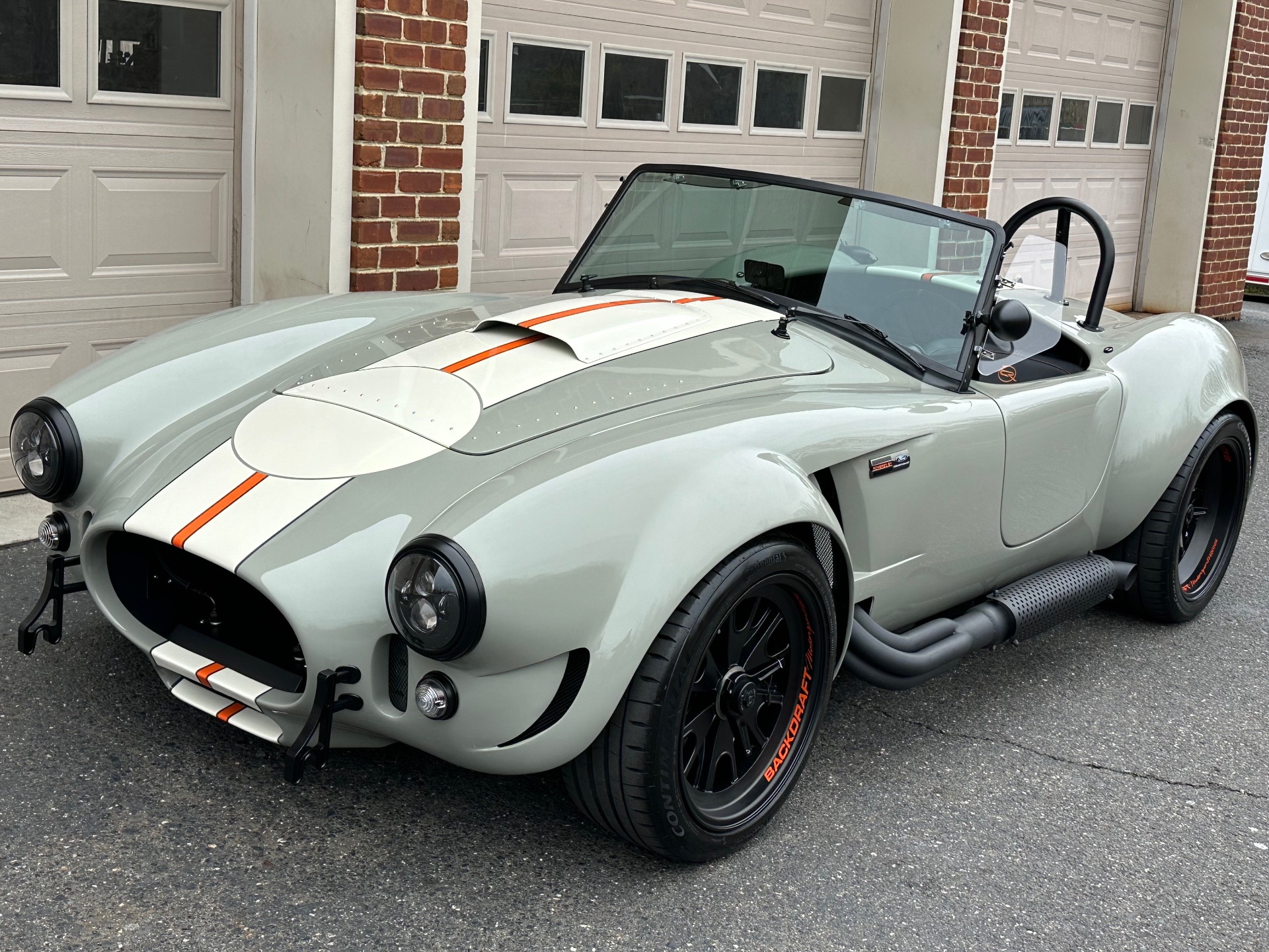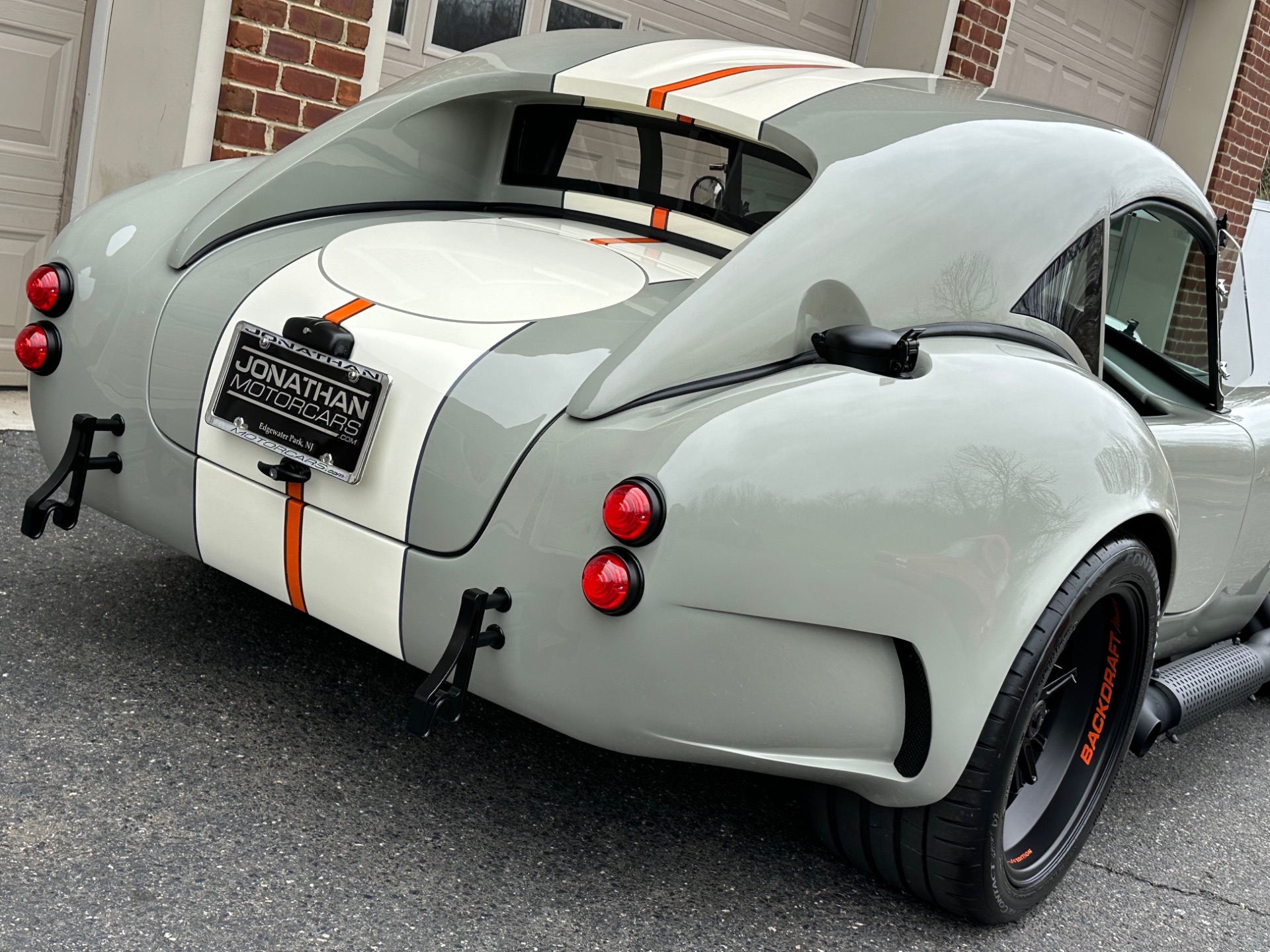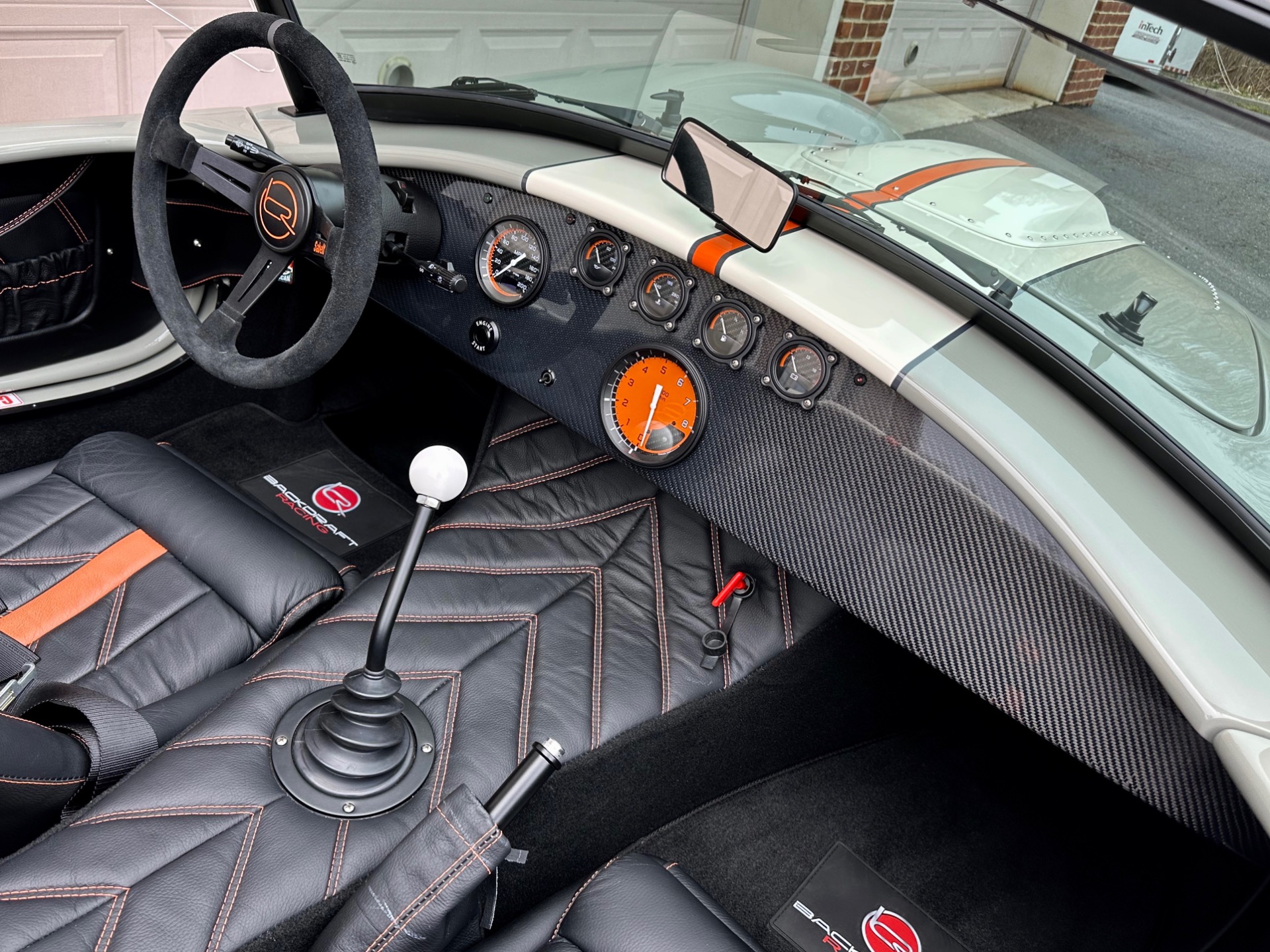 Featured at SEMA 2023 Backdraft Racing has arrived at JMC. We just could not resists this one. An unbelievable one of one backdraft cobra build. This is loaded with options and is done in the first ever Porsche fashion gray with a three color stripe. Wimbledon white, gulf orange, and grigio. Creating an awesome color combination on the cobra. Powered by the Roush 427IR 8 stack fuel injection engine making over 560 horse power. Some upgraded options included are power steering, big and tall edition, black and orange diagonal leather interior, carbon fiber dash, suede steering wheel, custom shift knob, cam lock style seat belts, painted engine compartment to match, paint protection, led headlights, removable hard top, wilwood big brake kit, remote brake and clutch reservoirs, oil cooler, the new GTR body, ceramic polish, aluminum gas tank powder coated black, night edition engine with custom painted valve covers and trumpets. This is a one of kind cobra available for purchase at Jonathan Motorcars. We have financing and can ship anywhere in the world. Call today!