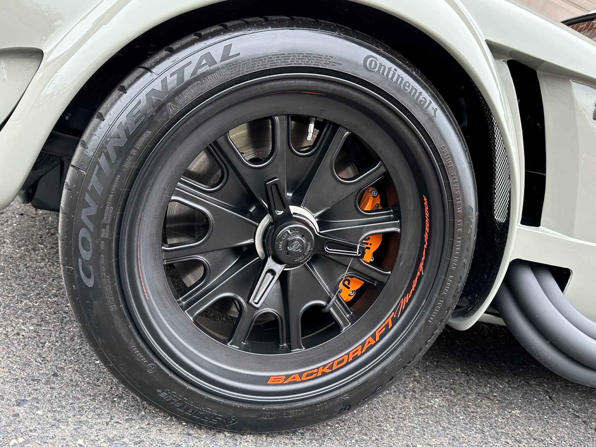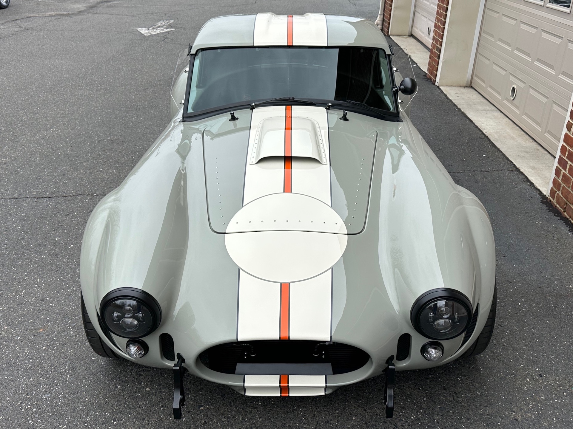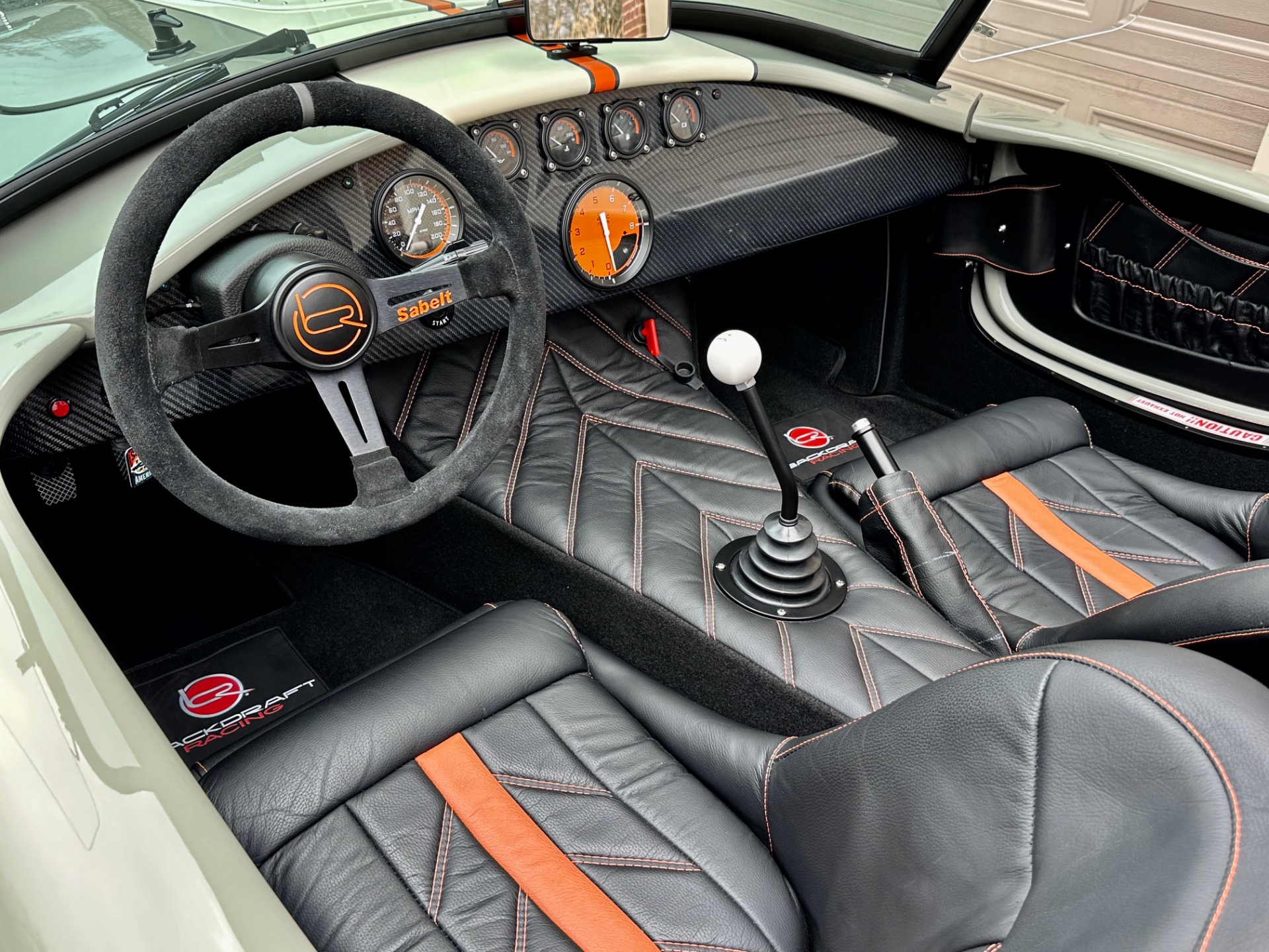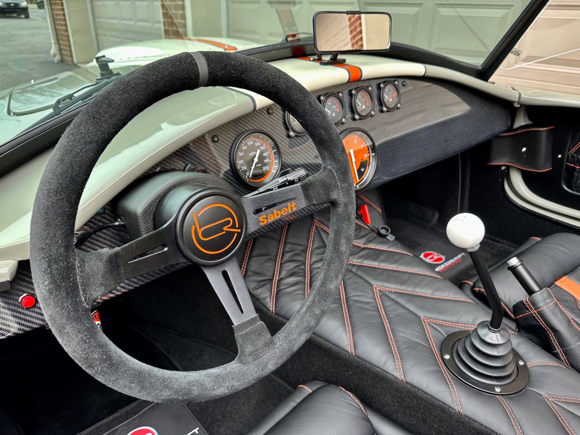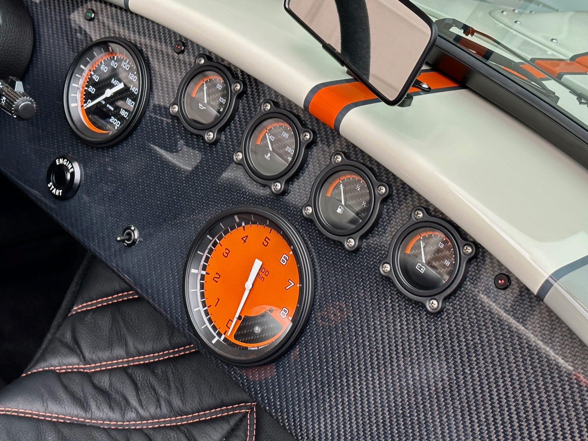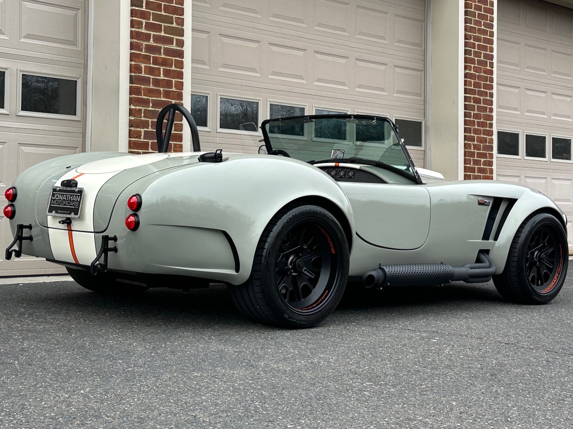 Featured at SEMA 2023 Backdraft Racing has arrived at JMC. We just could not resists this one. An unbelievable one of one backdraft cobra build. This is loaded with options and is done in the first ever Porsche fashion gray with a three color stripe. Wimbledon white, gulf orange, and grigio. Creating an awesome color combination on the cobra. Powered by the Roush 427IR 8 stack fuel injection engine making over 560 horse power. Some upgraded options included are power steering, big and tall edition, black and orange diagonal leather interior, carbon fiber dash, suede steering wheel, custom shift knob, cam lock style seat belts, painted engine compartment to match, paint protection, led headlights, removable hard top, wilwood big brake kit, remote brake and clutch reservoirs, oil cooler, the new GTR body, ceramic polish, aluminum gas tank powder coated black, night edition engine with custom painted valve covers and trumpets. This is a one of kind cobra available for purchase at Jonathan Motorcars. We have financing and can ship anywhere in the world. Call today!