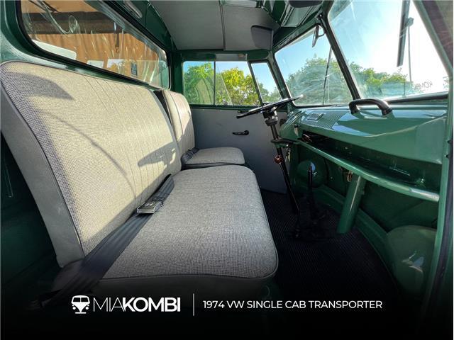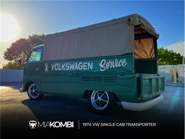 This 1974 Volkswagen Single Cab Transporter Pickup underwent a thorough restoration and customization in Brazil in 2021 prior to being imported by the seller to the US in early 2023. It has a beautiful Field Green exterior paint with hand painted "VW Service" on each side of the pickup bed, this '74 Pickup sports a roll-up style canvas canopy, gray vinyl bench seat, "917 style" shifter knob, custom alloy wheels and lowered suspension. The 12V electrical system was all redone as well as brakes and suspension parts. Power comes from a stock/rebuilt 1500cc flat-4 aircooled engine mated to a four speed manual gearbox.