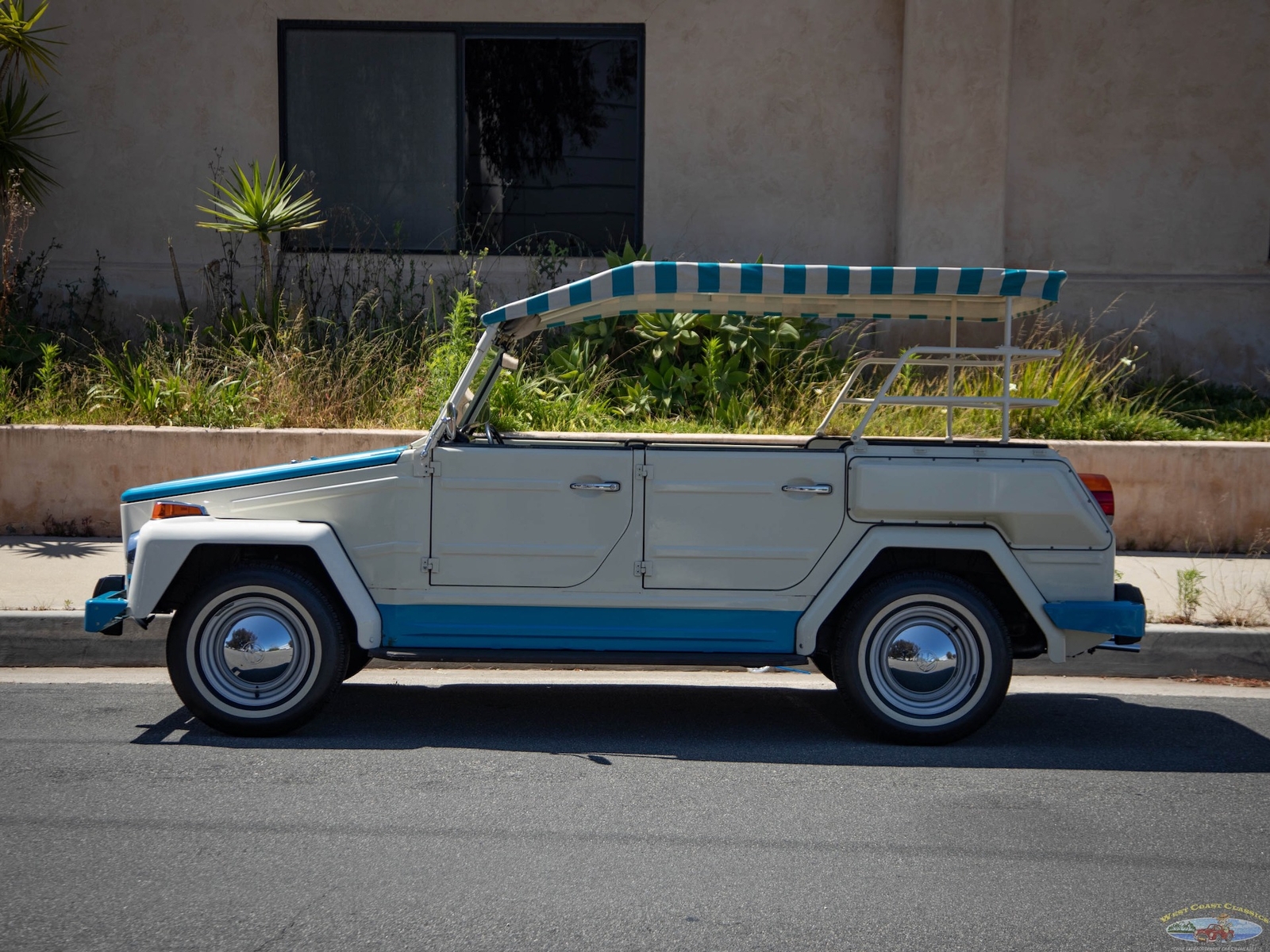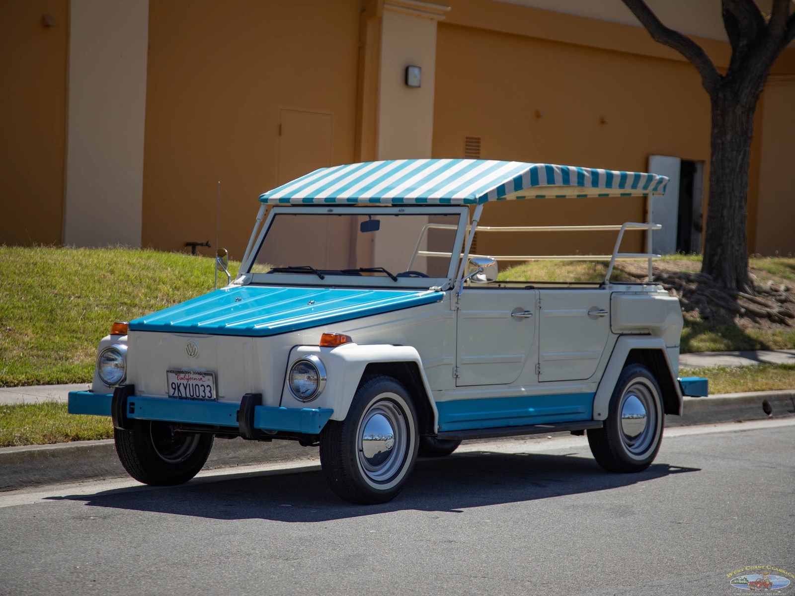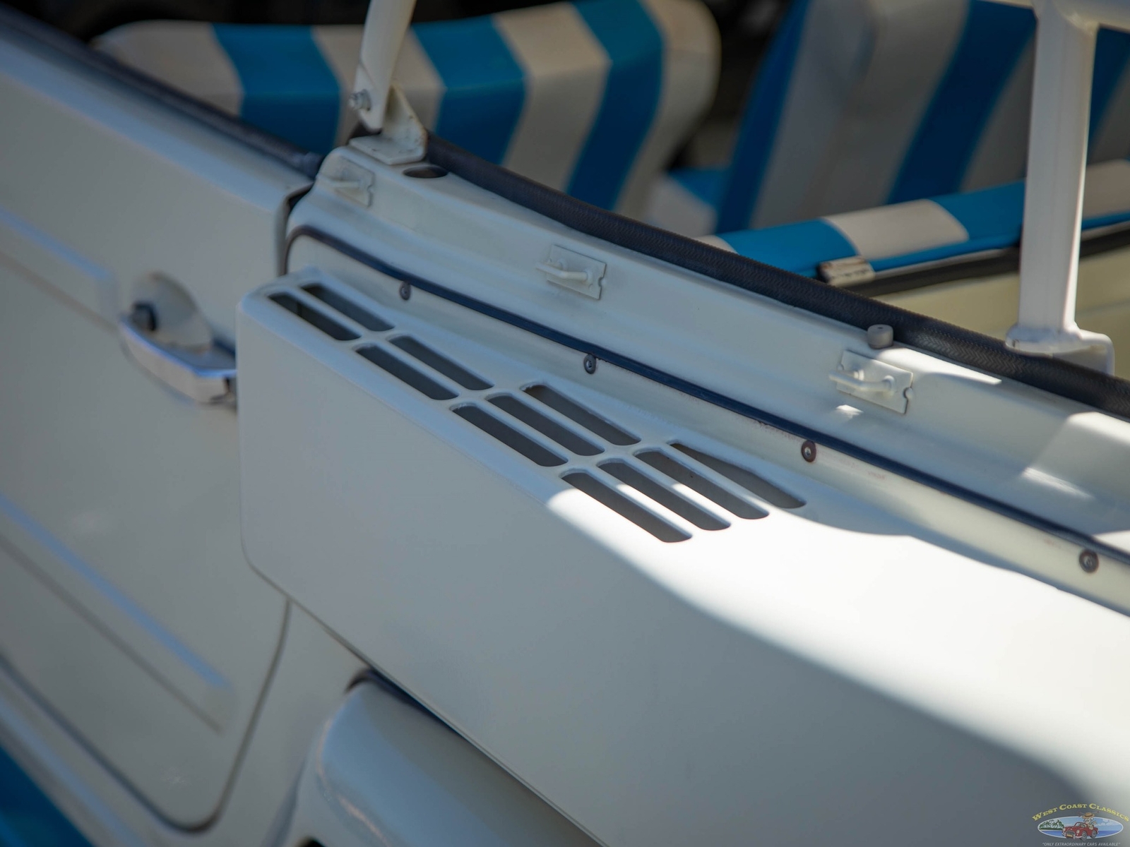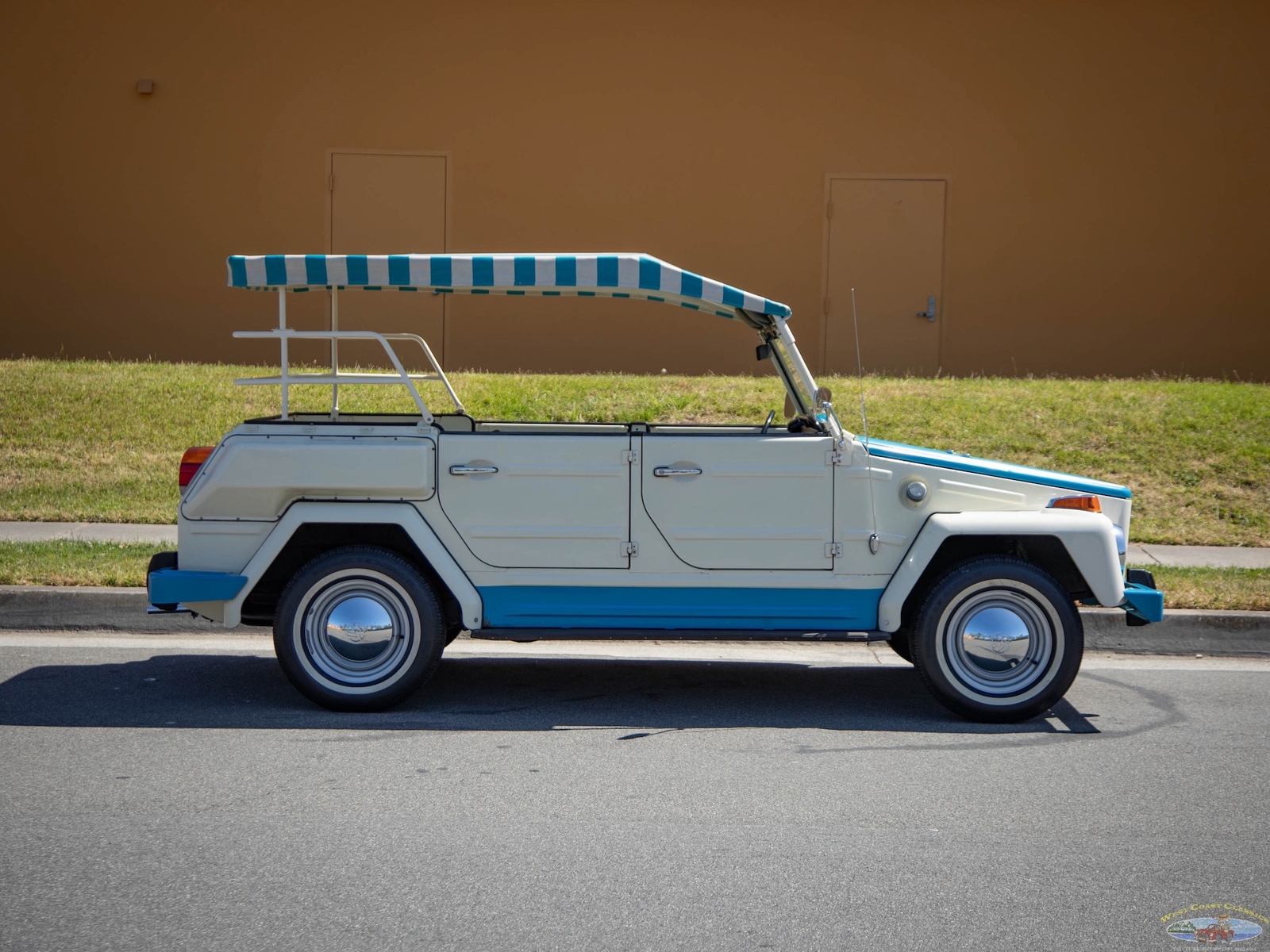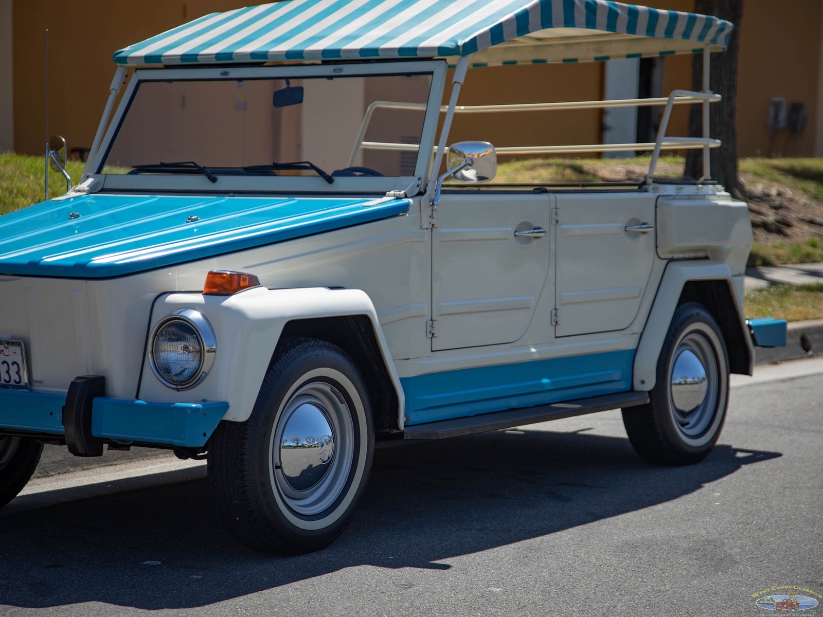The original and authentic 'Acapulco Thing' was only built from May to July 1974 with a mere 400 produced in total. All were White with Blue accents on the front hood, the rocker panels, the bumpers and the dashboard. The seats were upholstered in a blue-and-white striped fabric, and the same fabric was used for the standard surrey top that was stretched over a metal tube frame.