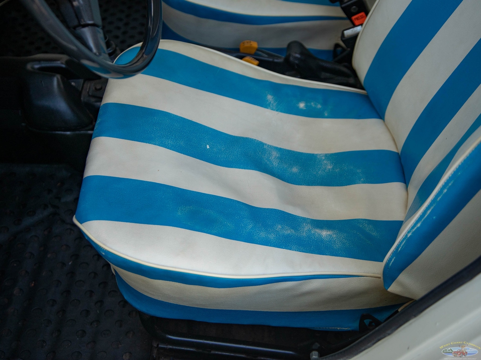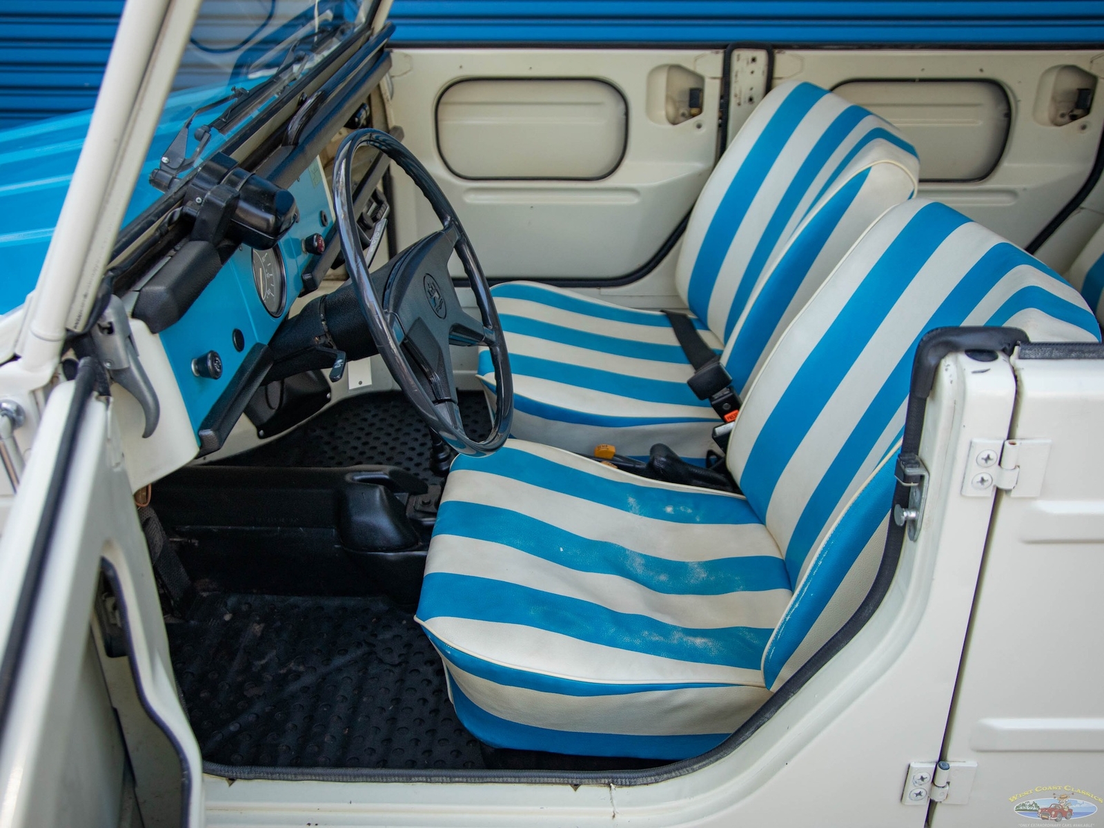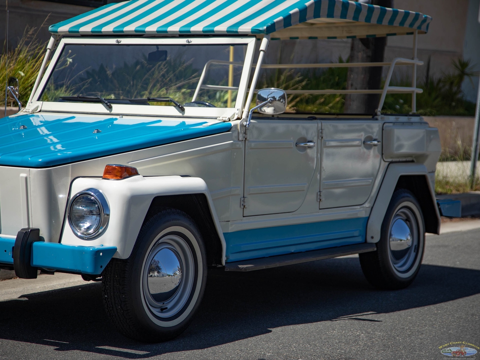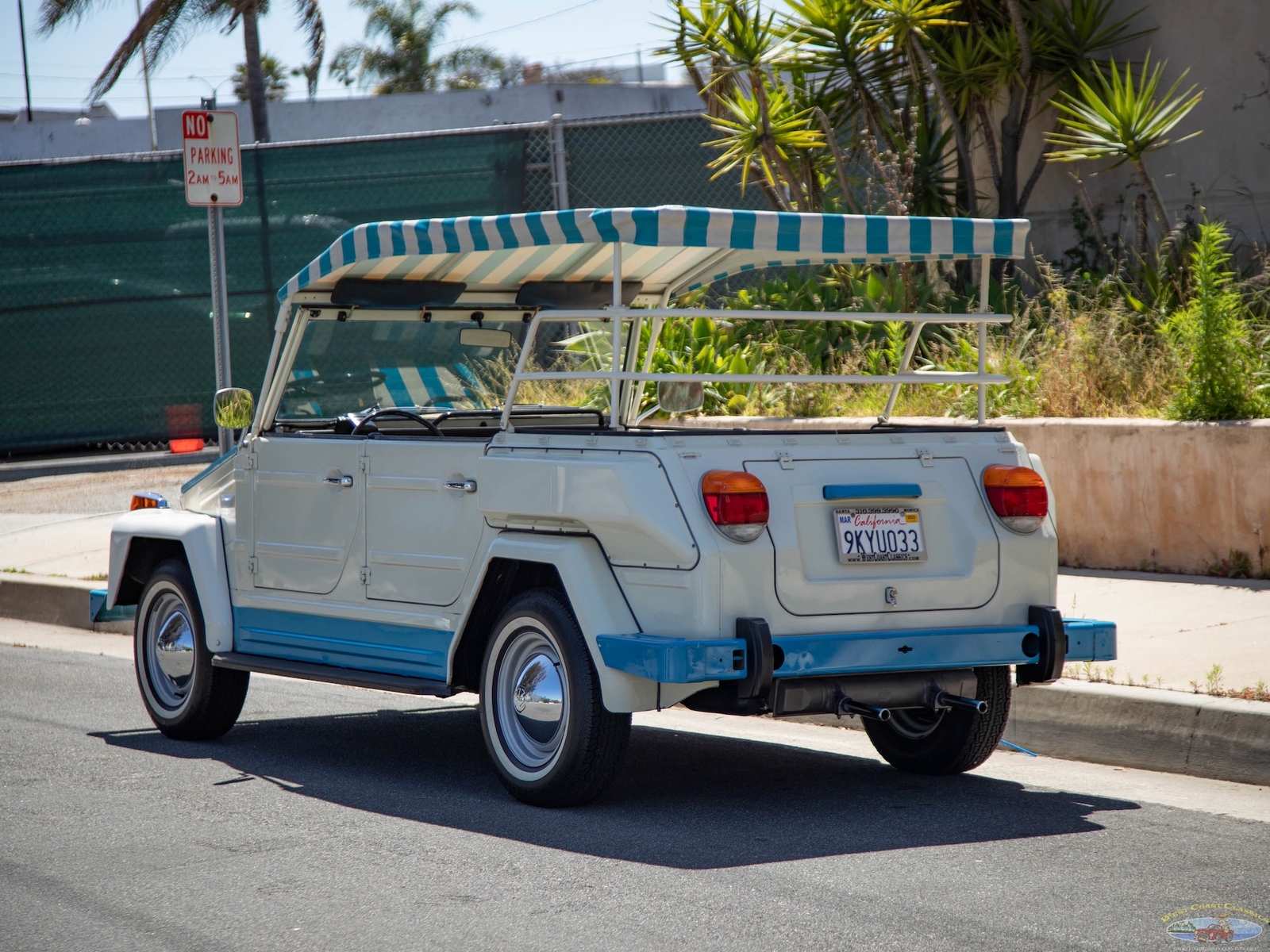 The original and authentic 'Acapulco Thing' was only built from May to July 1974 with a mere 400 produced in total. All were White with Blue accents on the front hood, the rocker panels, the bumpers and the dashboard. The seats were upholstered in a blue-and-white striped fabric, and the same fabric was used for the standard surrey top that was stretched over a metal tube frame.