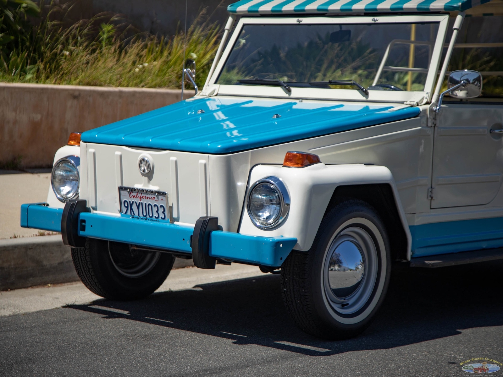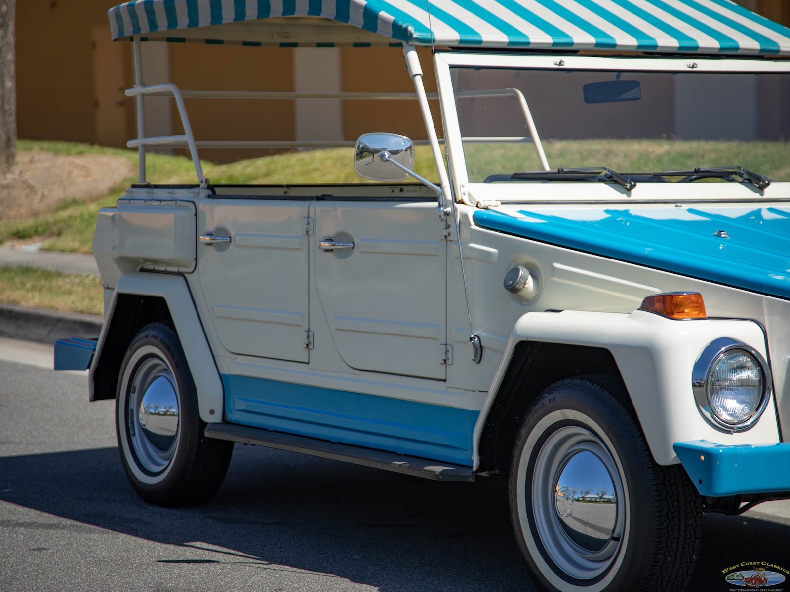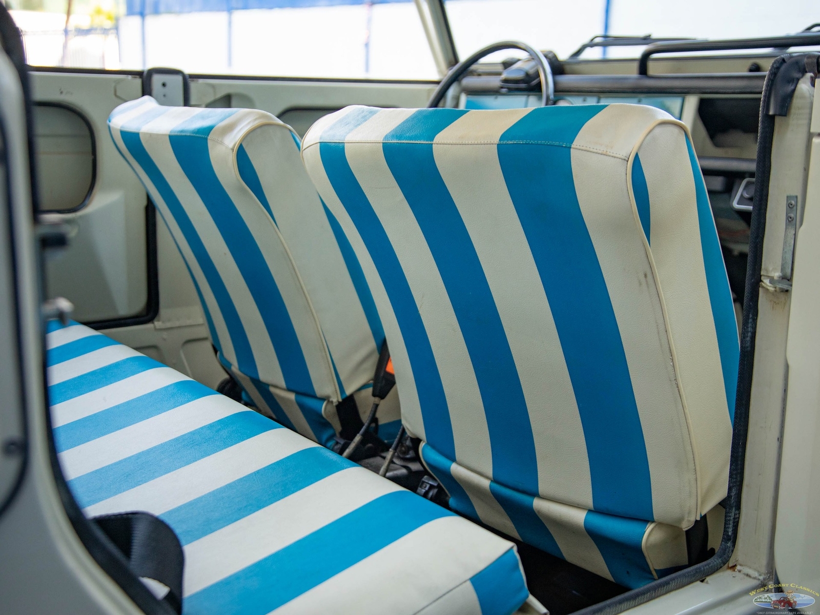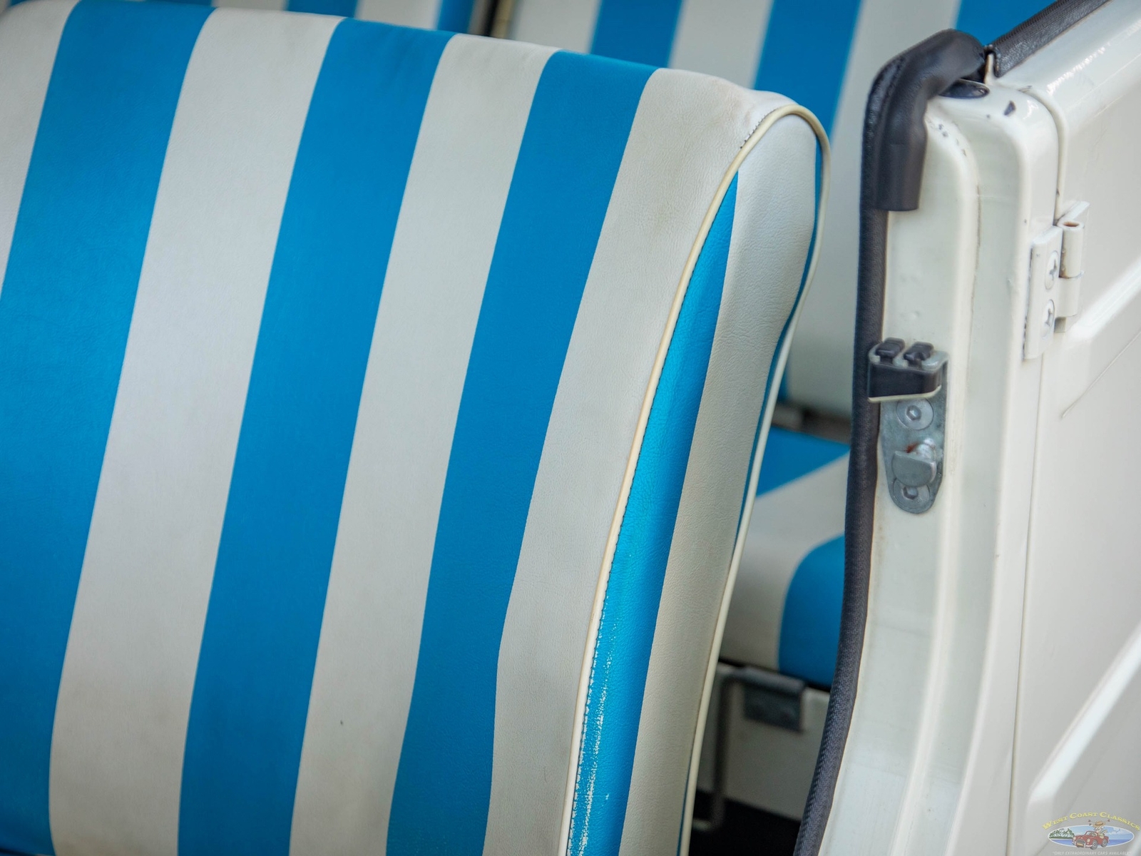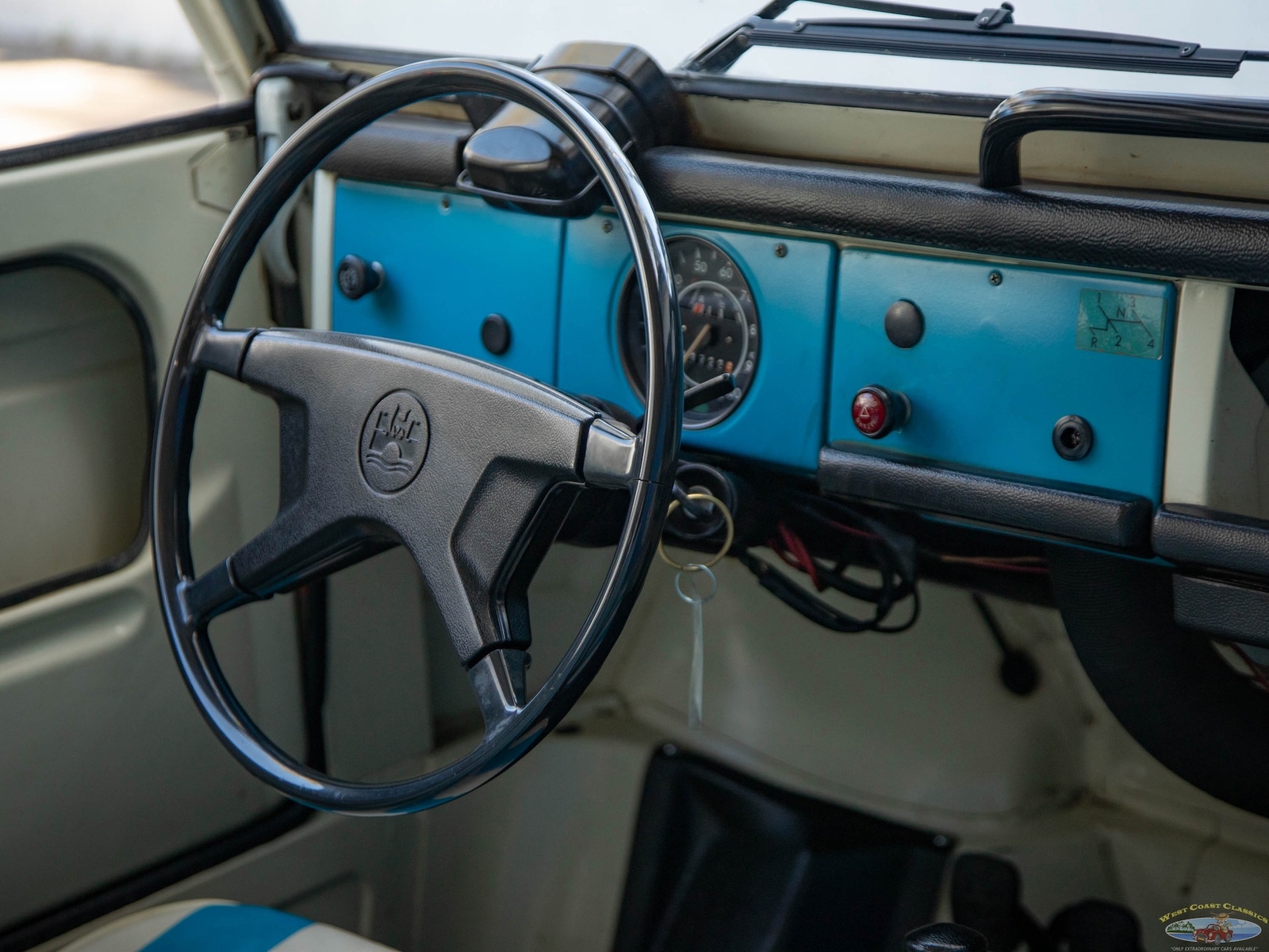 The original and authentic 'Acapulco Thing' was only built from May to July 1974 with a mere 400 produced in total. All were White with Blue accents on the front hood, the rocker panels, the bumpers and the dashboard. The seats were upholstered in a blue-and-white striped fabric, and the same fabric was used for the standard surrey top that was stretched over a metal tube frame.