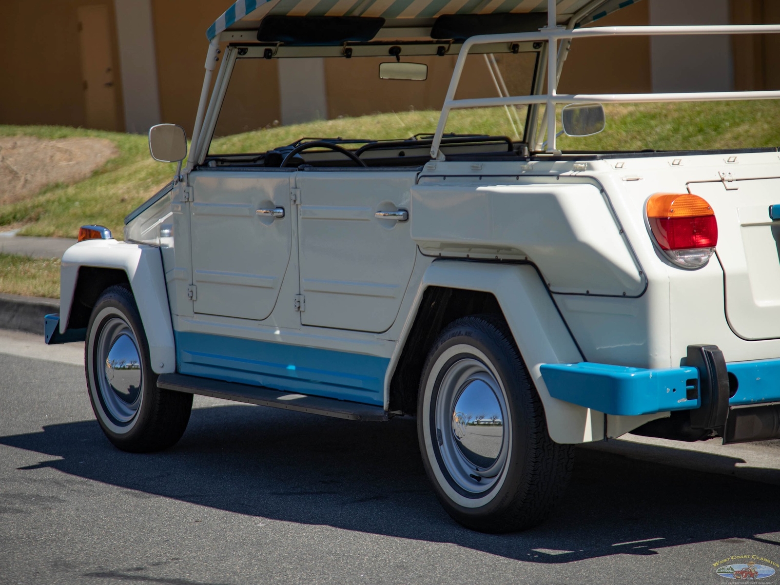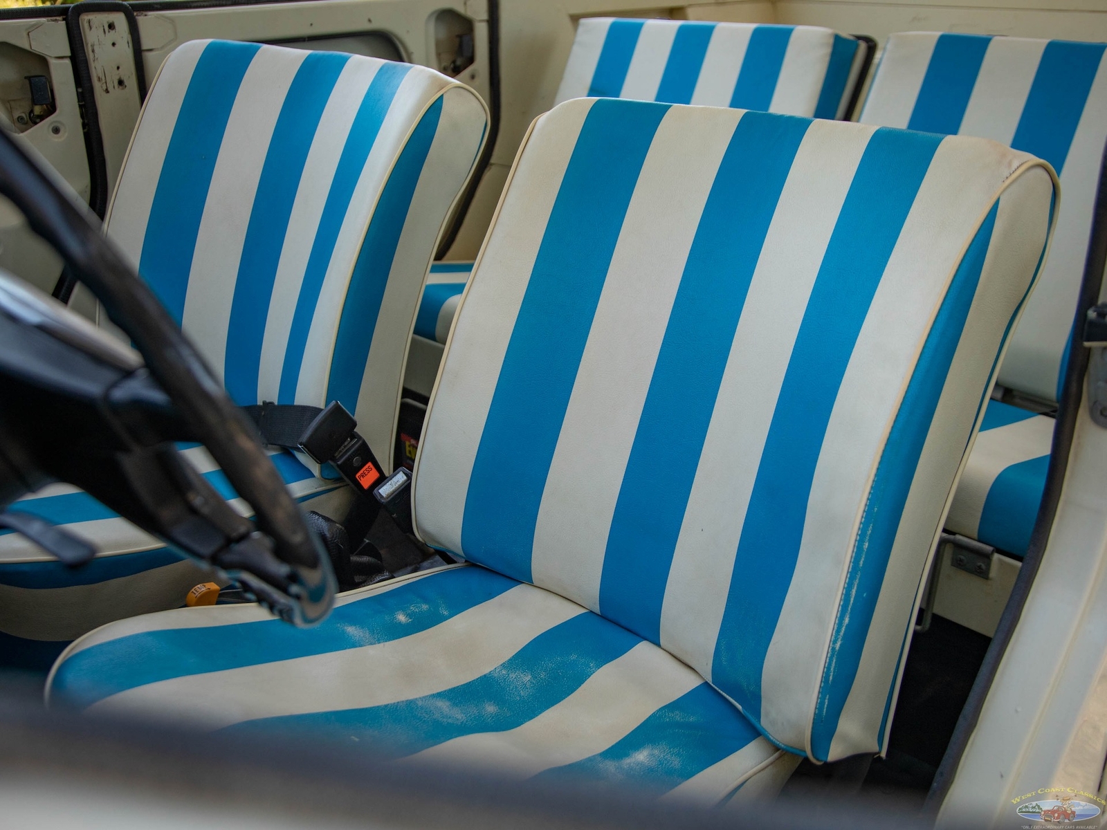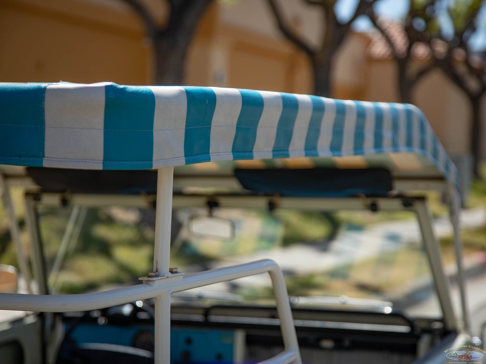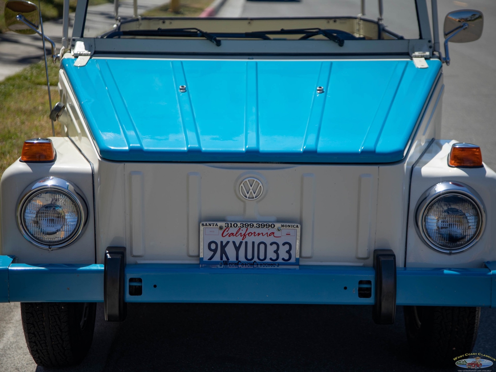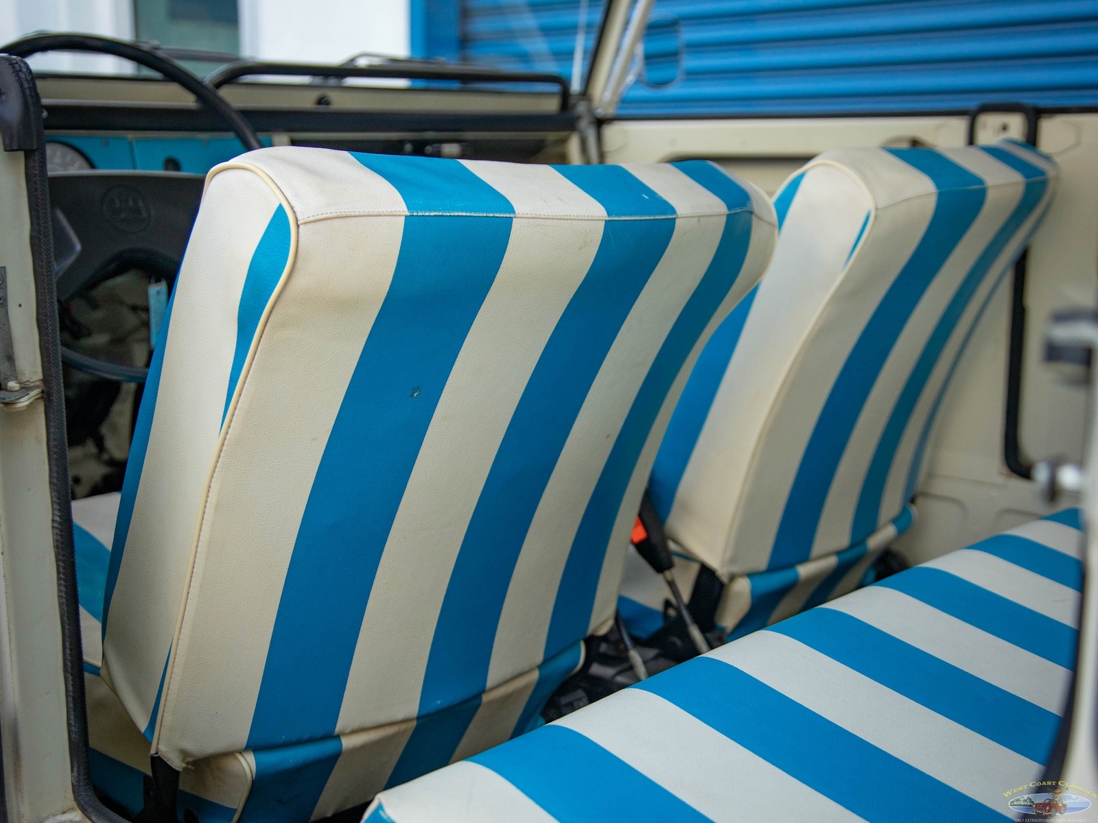 The original and authentic 'Acapulco Thing' was only built from May to July 1974 with a mere 400 produced in total. All were White with Blue accents on the front hood, the rocker panels, the bumpers and the dashboard. The seats were upholstered in a blue-and-white striped fabric, and the same fabric was used for the standard surrey top that was stretched over a metal tube frame.
