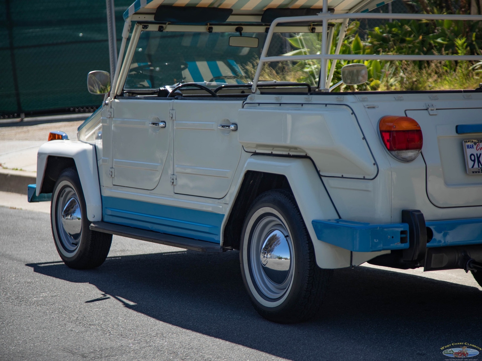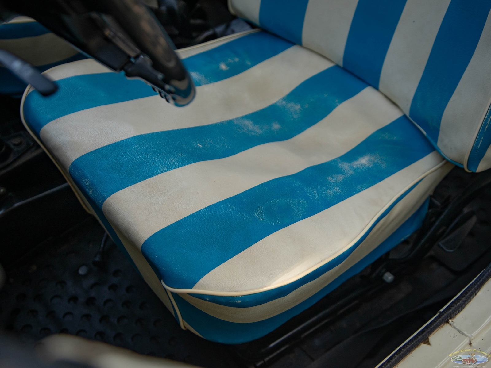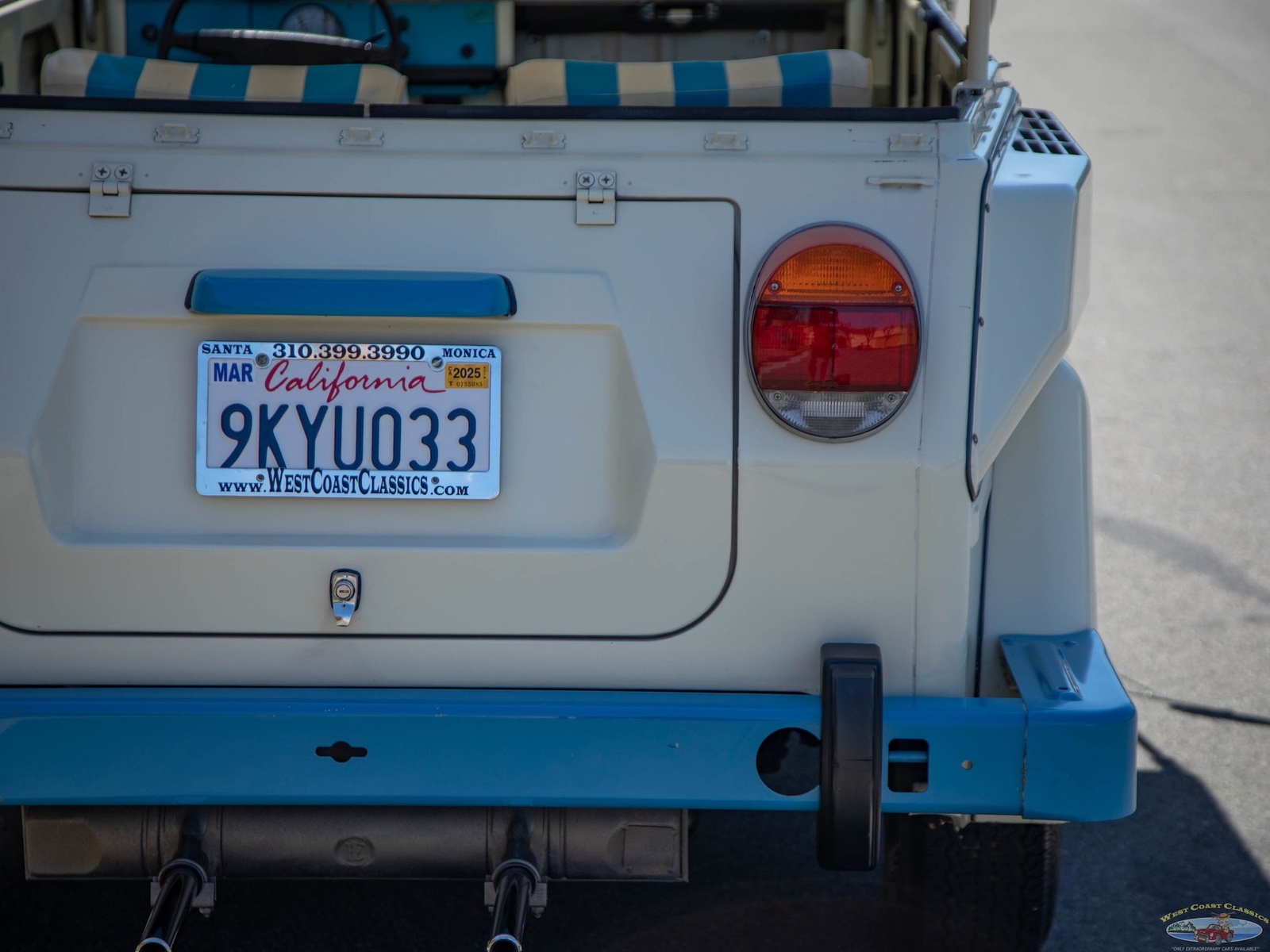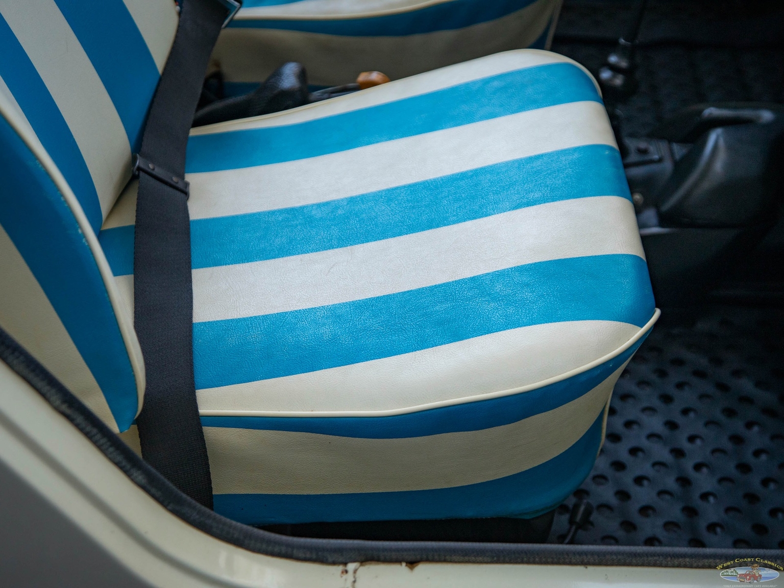 The original and authentic 'Acapulco Thing' was only built from May to July 1974 with a mere 400 produced in total. All were White with Blue accents on the front hood, the rocker panels, the bumpers and the dashboard. The seats were upholstered in a blue-and-white striped fabric, and the same fabric was used for the standard surrey top that was stretched over a metal tube frame.