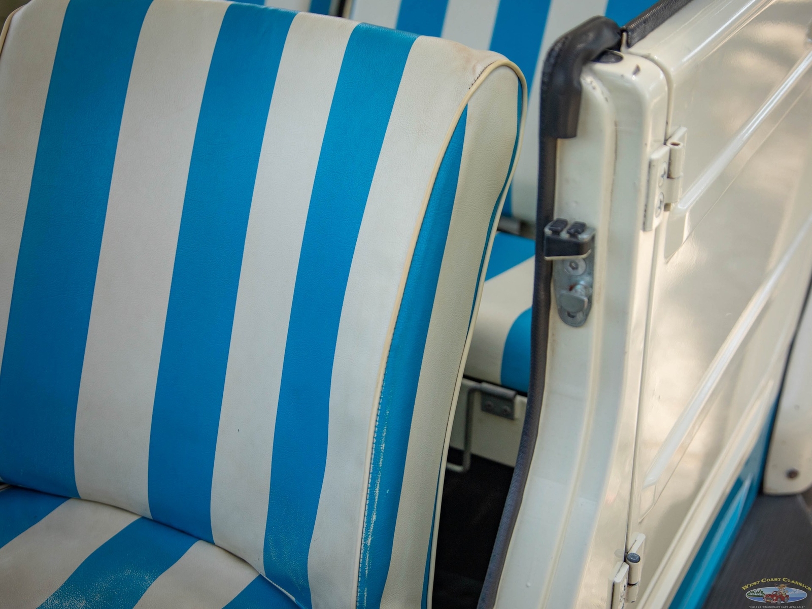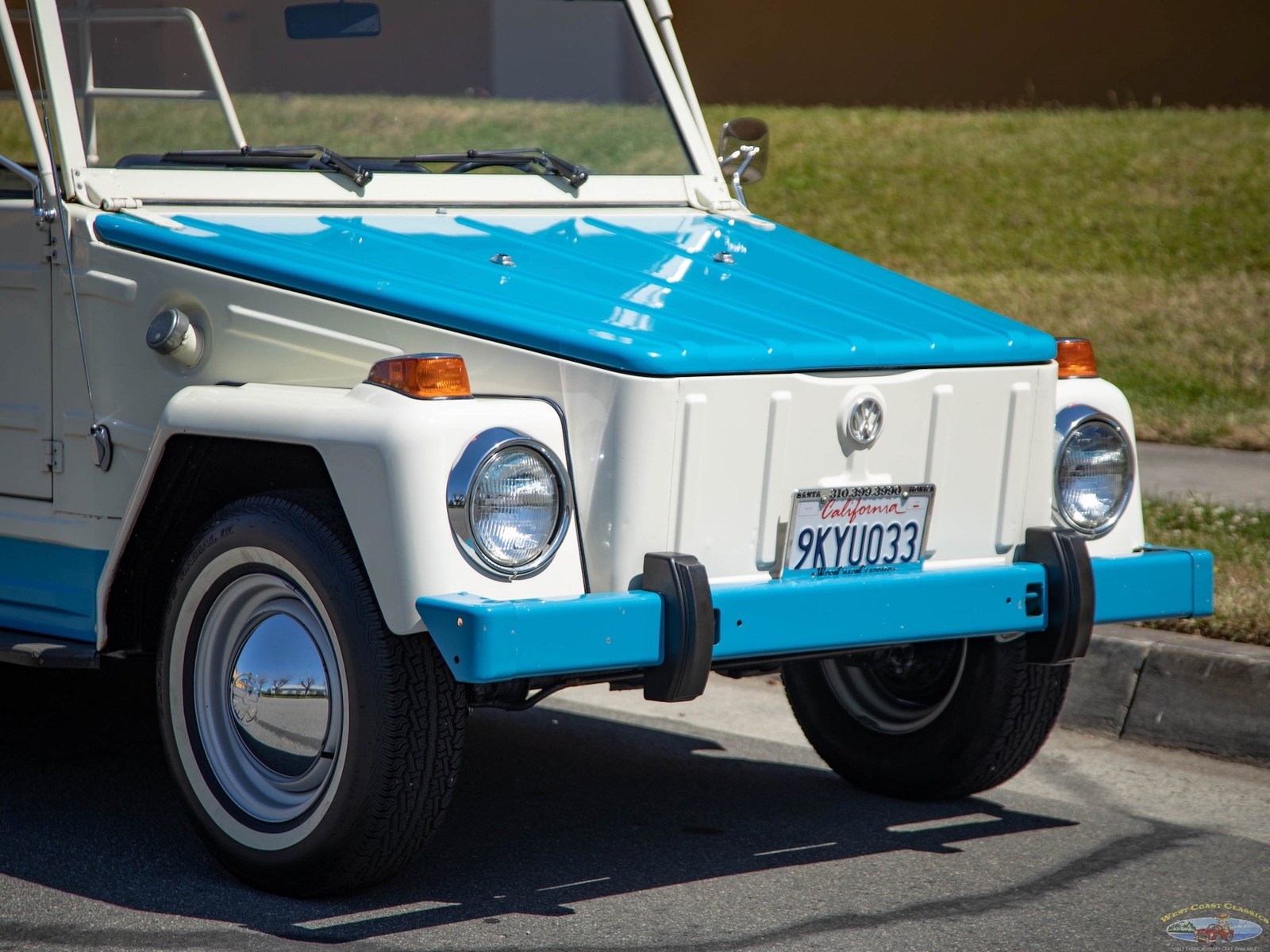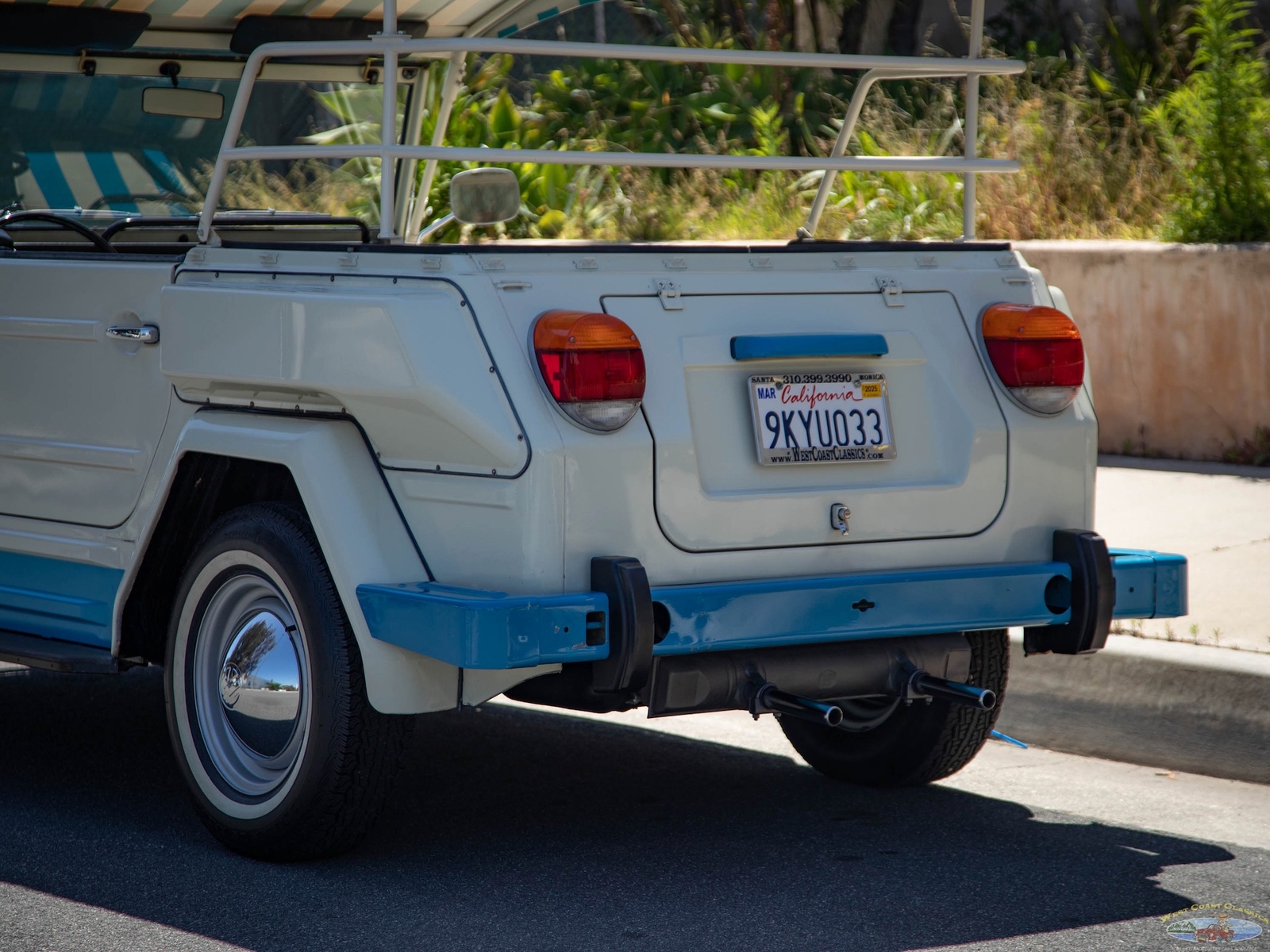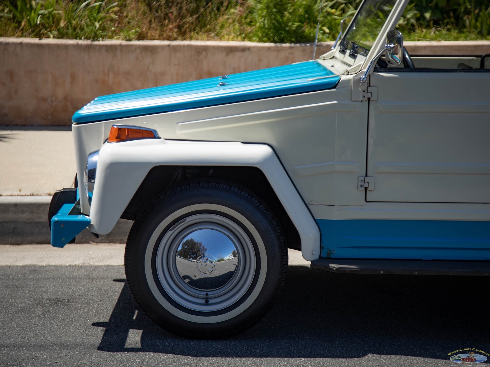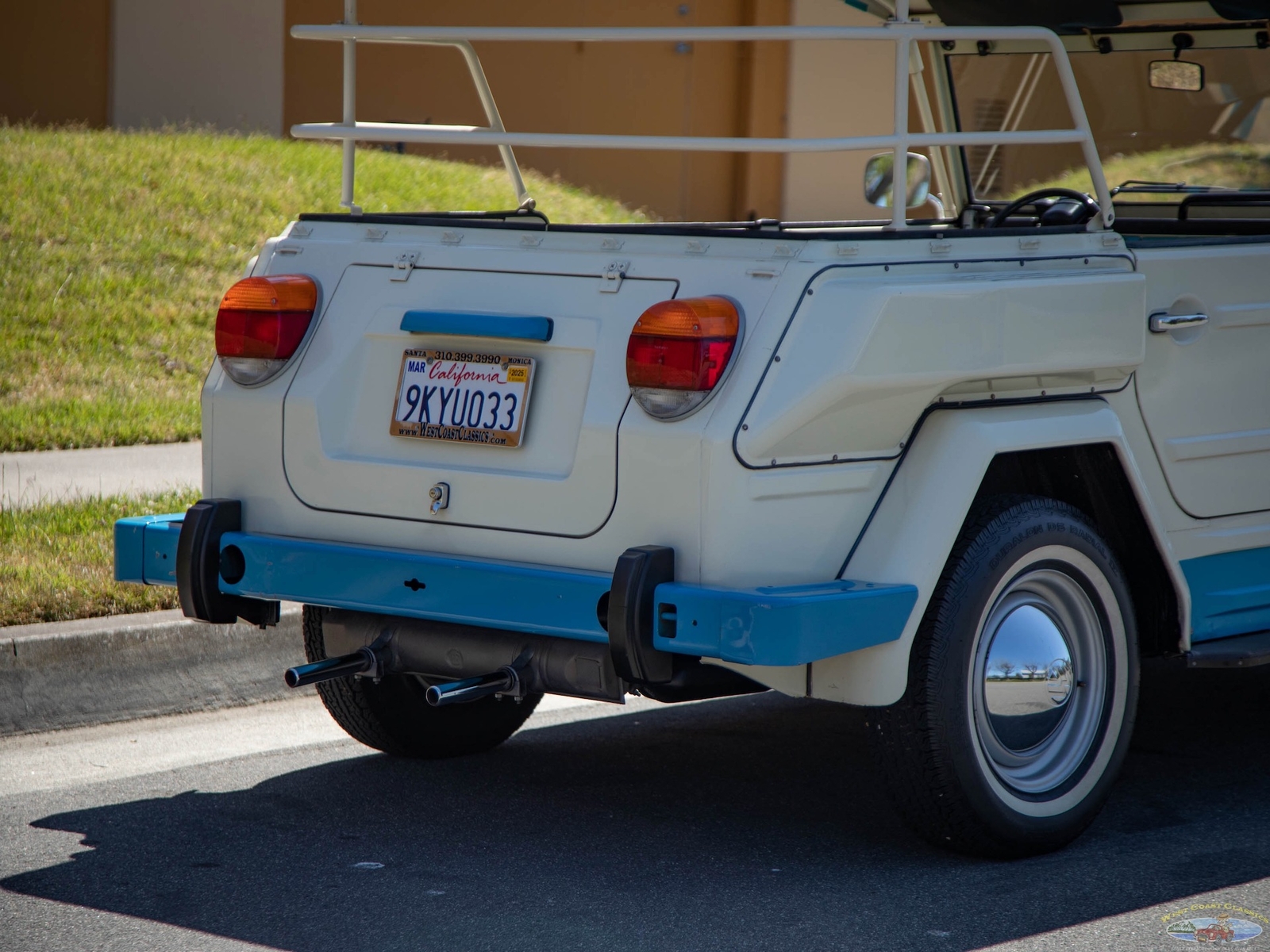 The original and authentic 'Acapulco Thing' was only built from May to July 1974 with a mere 400 produced in total. All were White with Blue accents on the front hood, the rocker panels, the bumpers and the dashboard. The seats were upholstered in a blue-and-white striped fabric, and the same fabric was used for the standard surrey top that was stretched over a metal tube frame.