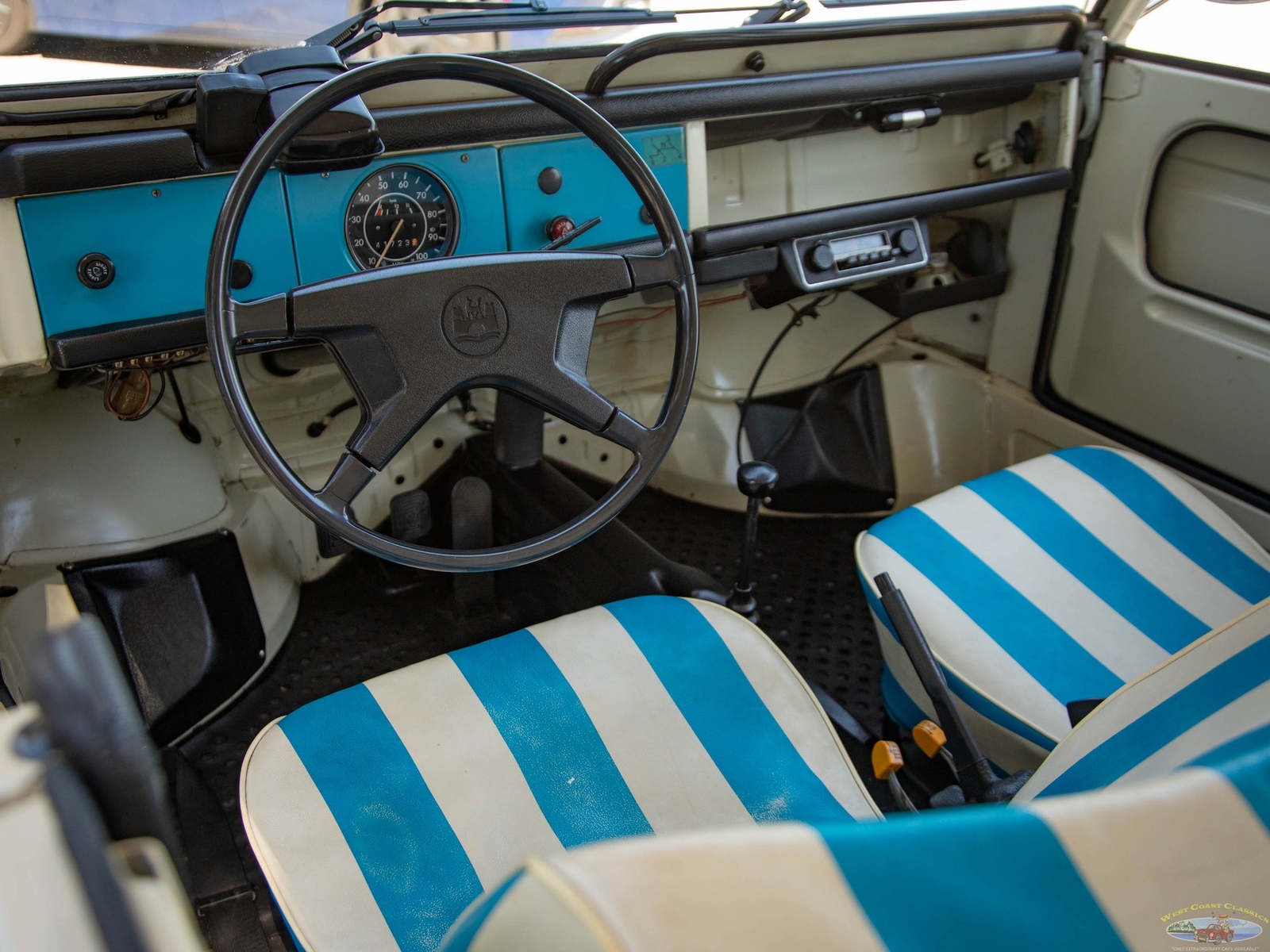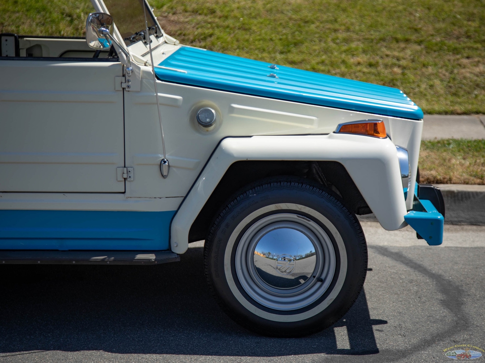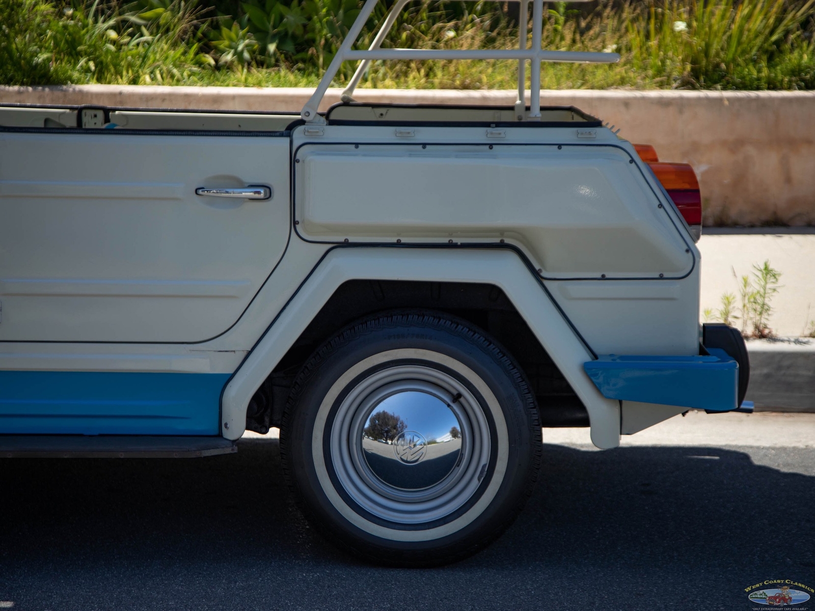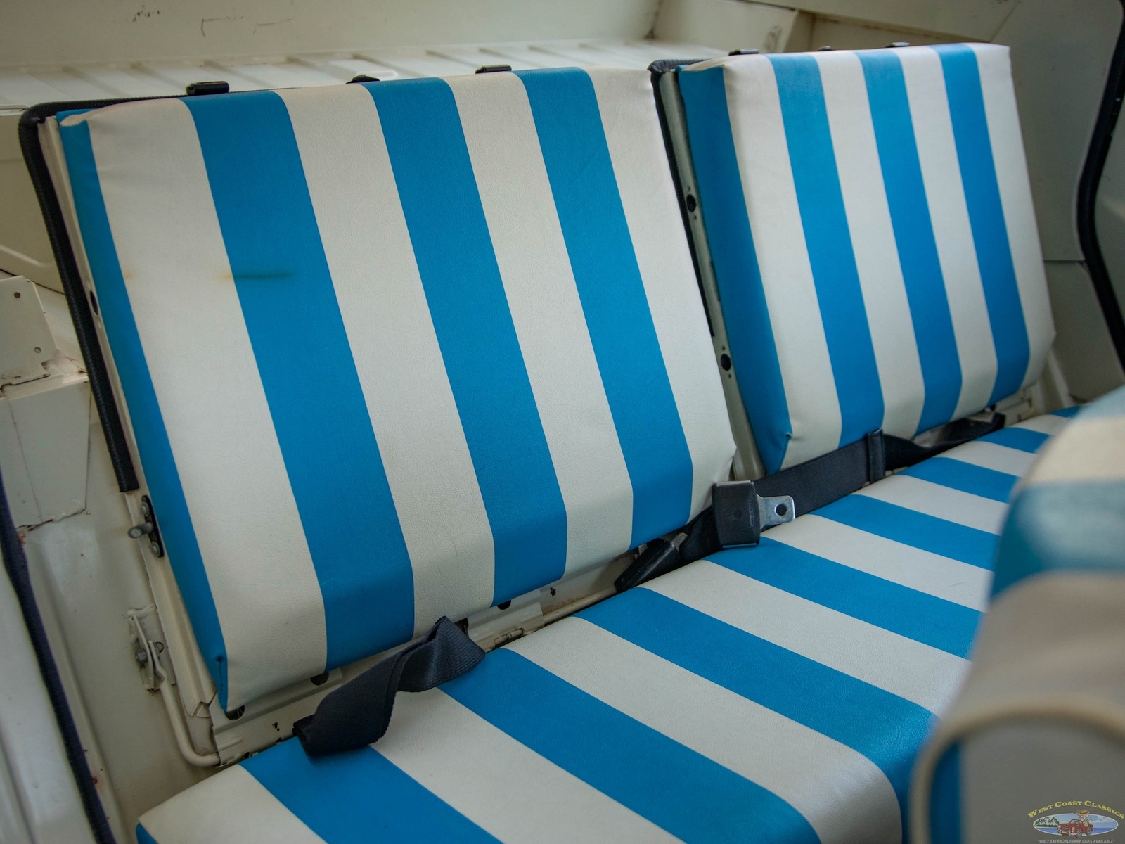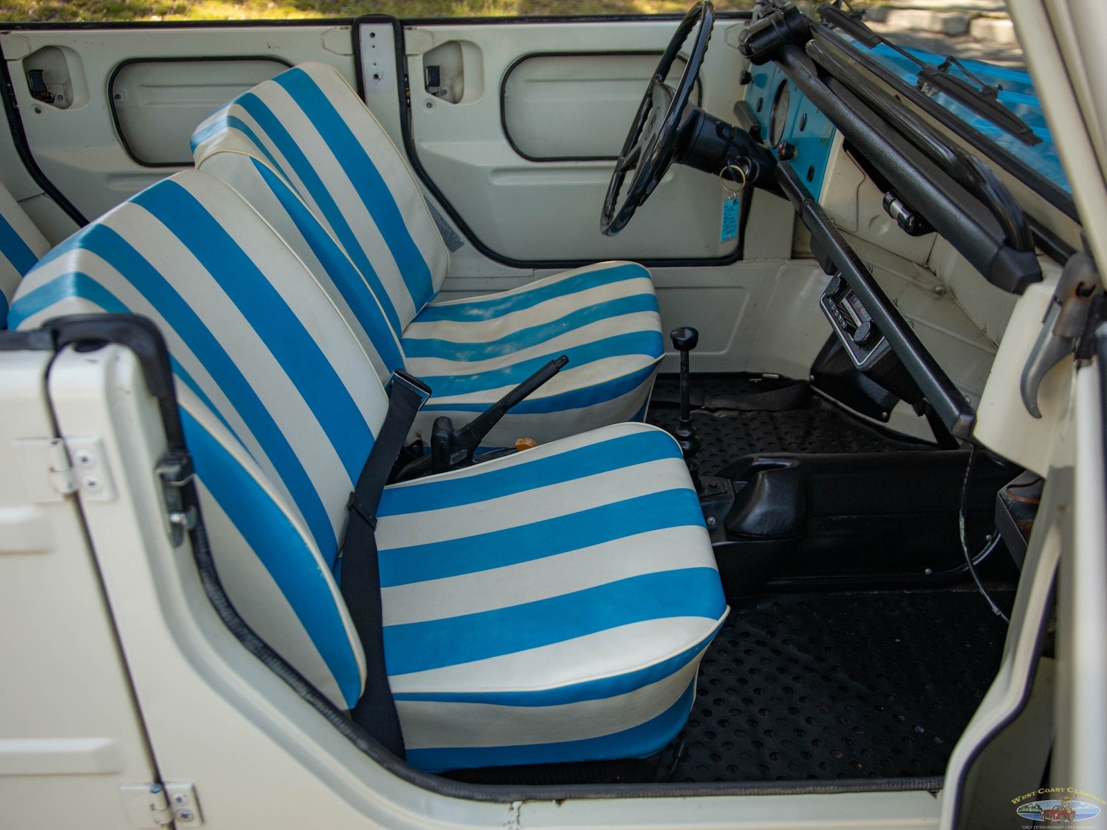 The original and authentic 'Acapulco Thing' was only built from May to July 1974 with a mere 400 produced in total. All were White with Blue accents on the front hood, the rocker panels, the bumpers and the dashboard. The seats were upholstered in a blue-and-white striped fabric, and the same fabric was used for the standard surrey top that was stretched over a metal tube frame.