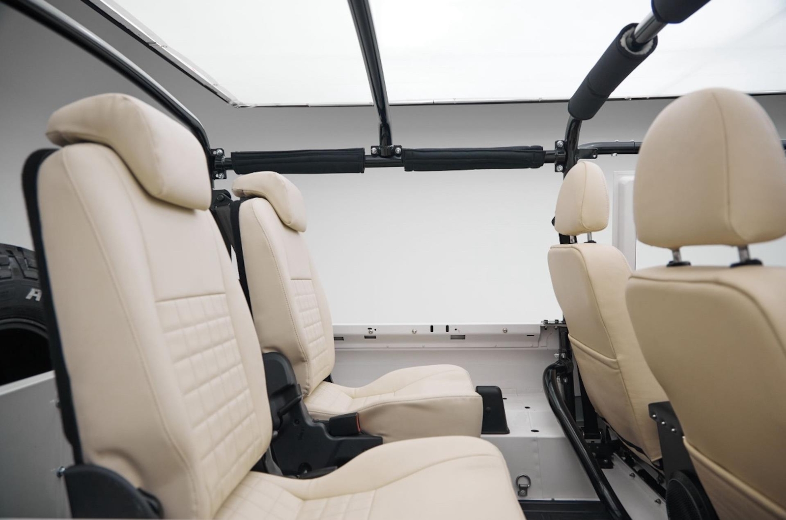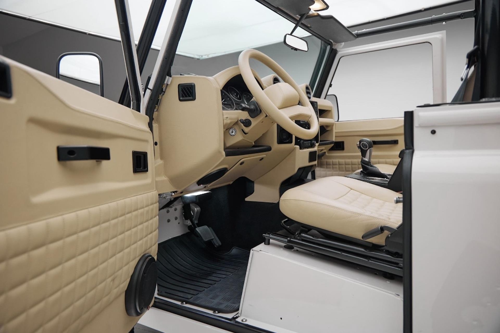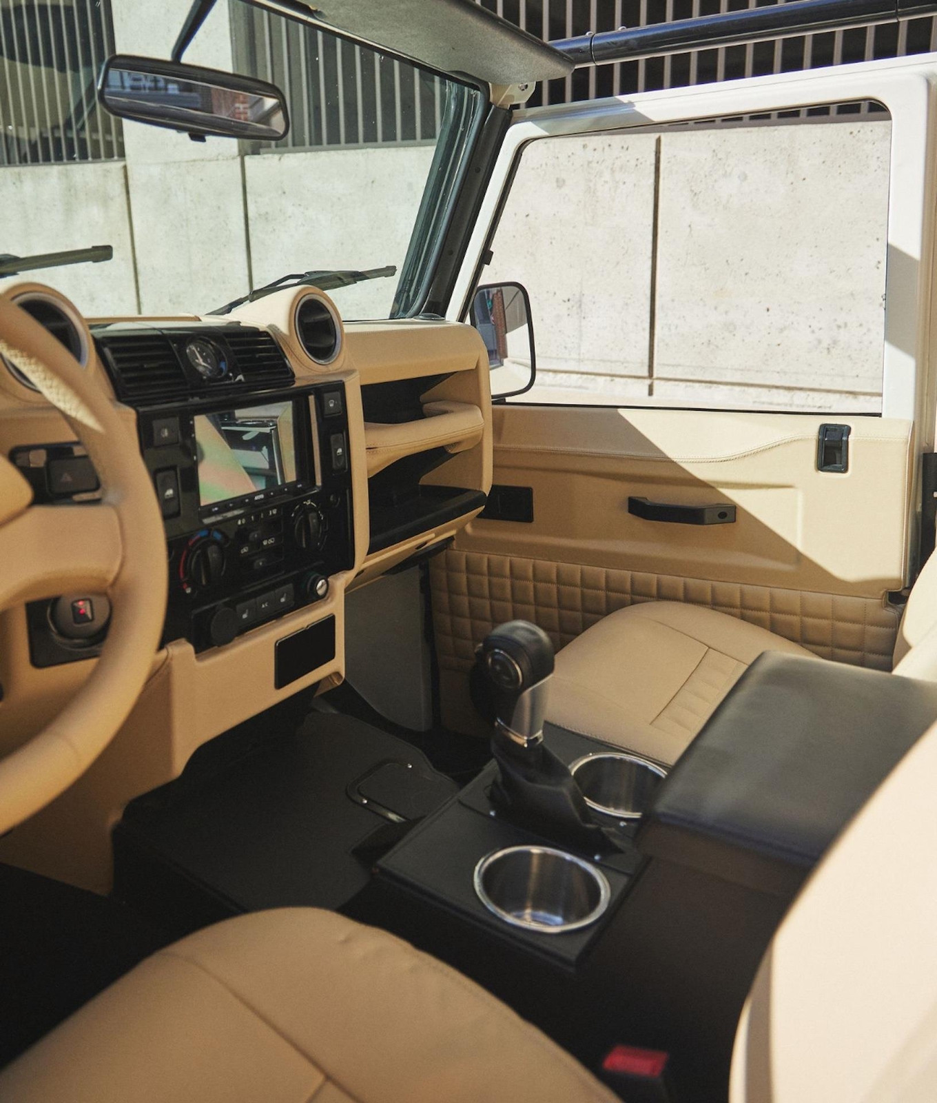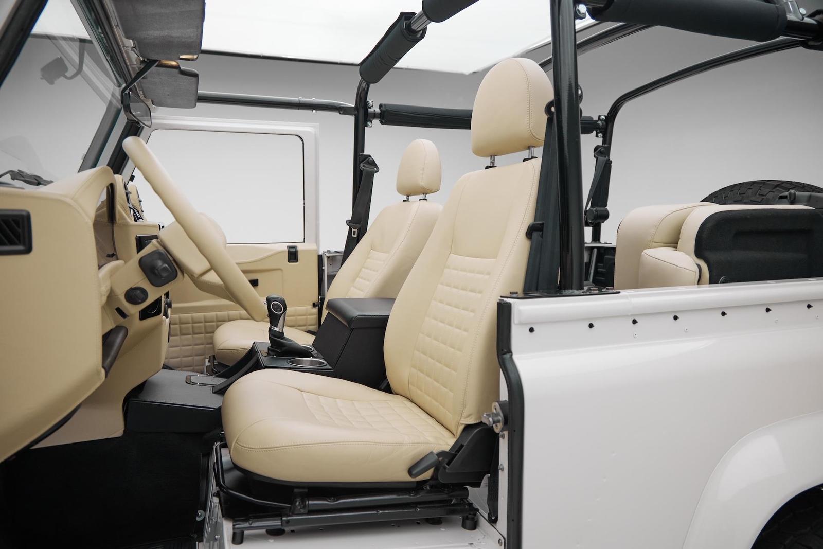 The body was skillfully finished in crisp Fuji White complemented by color-matched wheel arches and trim, all completed at our in-house body and paint facility. Adding to the vehicle's safety features, a satin black powder-coated multi-point Safety Devices® safety cage provides enhanced passenger protection. The premium black soft top fits snugly, keeping the elements at bay, while the quick and easy-to-roll-up and zip-out side and rear windows offer the freedom of an open-air experience whenever desired. LED-illuminated, black anodized aluminum exterior door handles, along with black anodized aluminum door, bonnet, and windscreen hinges, enhance the concise exterior color scheme.