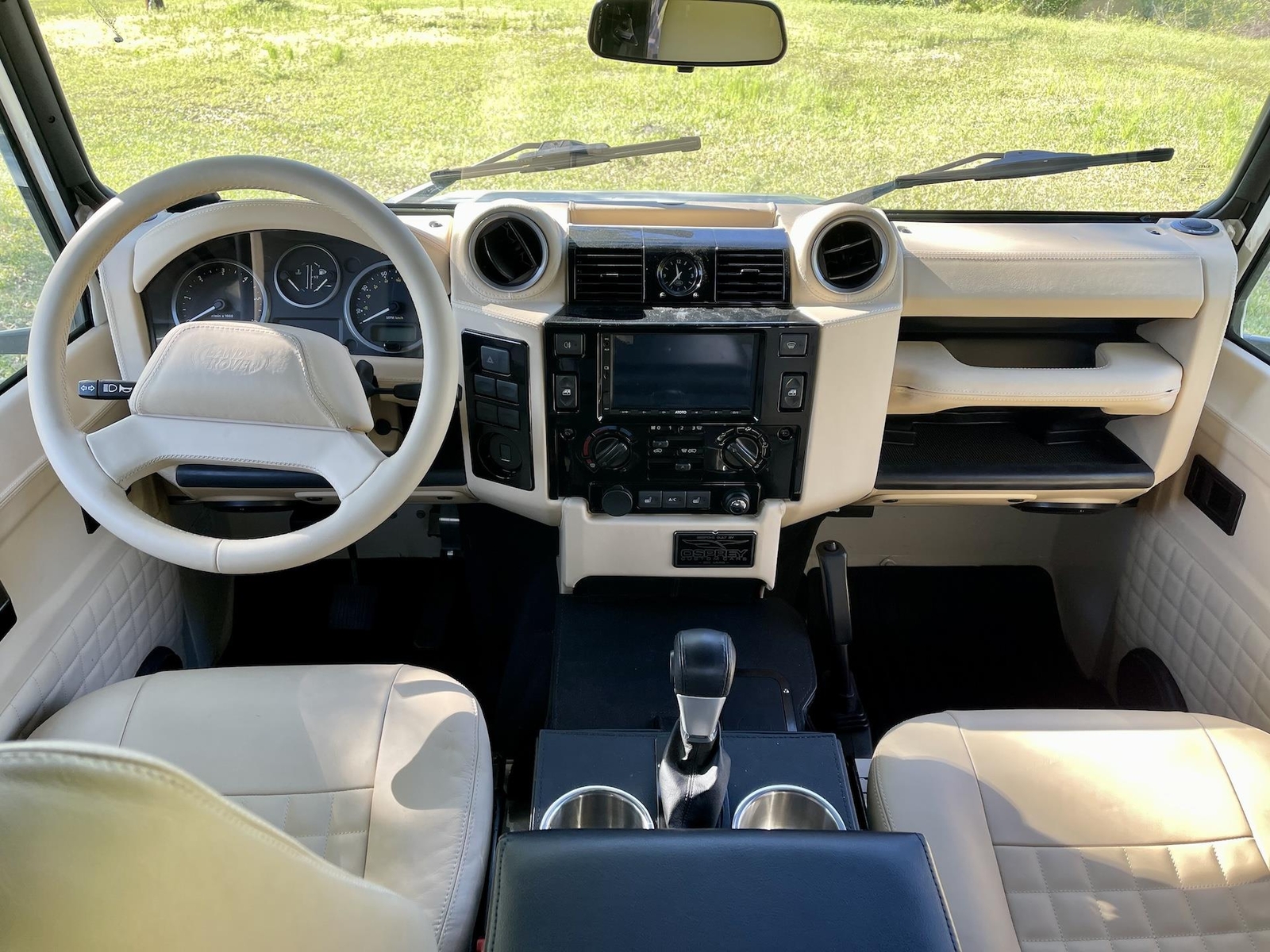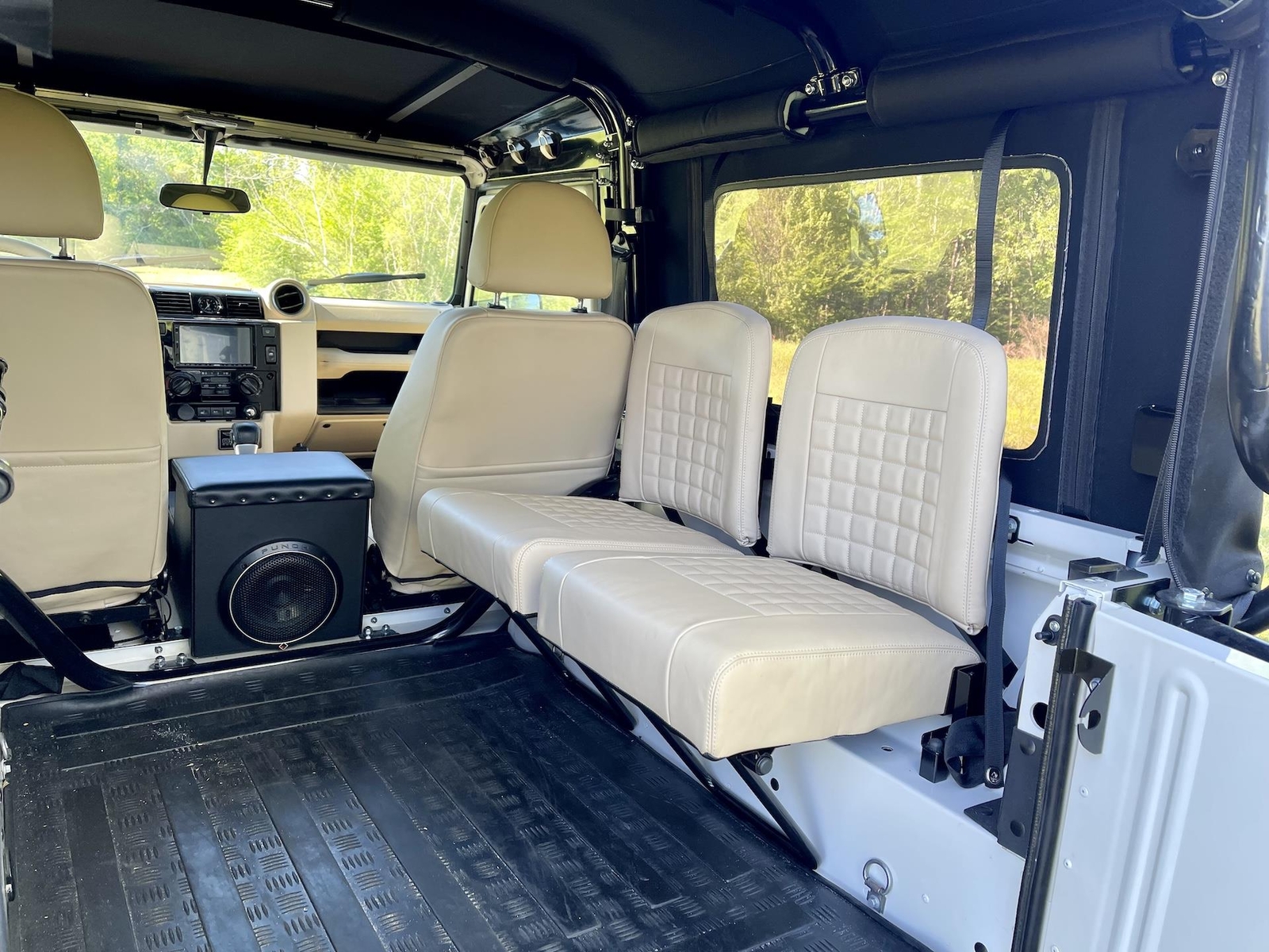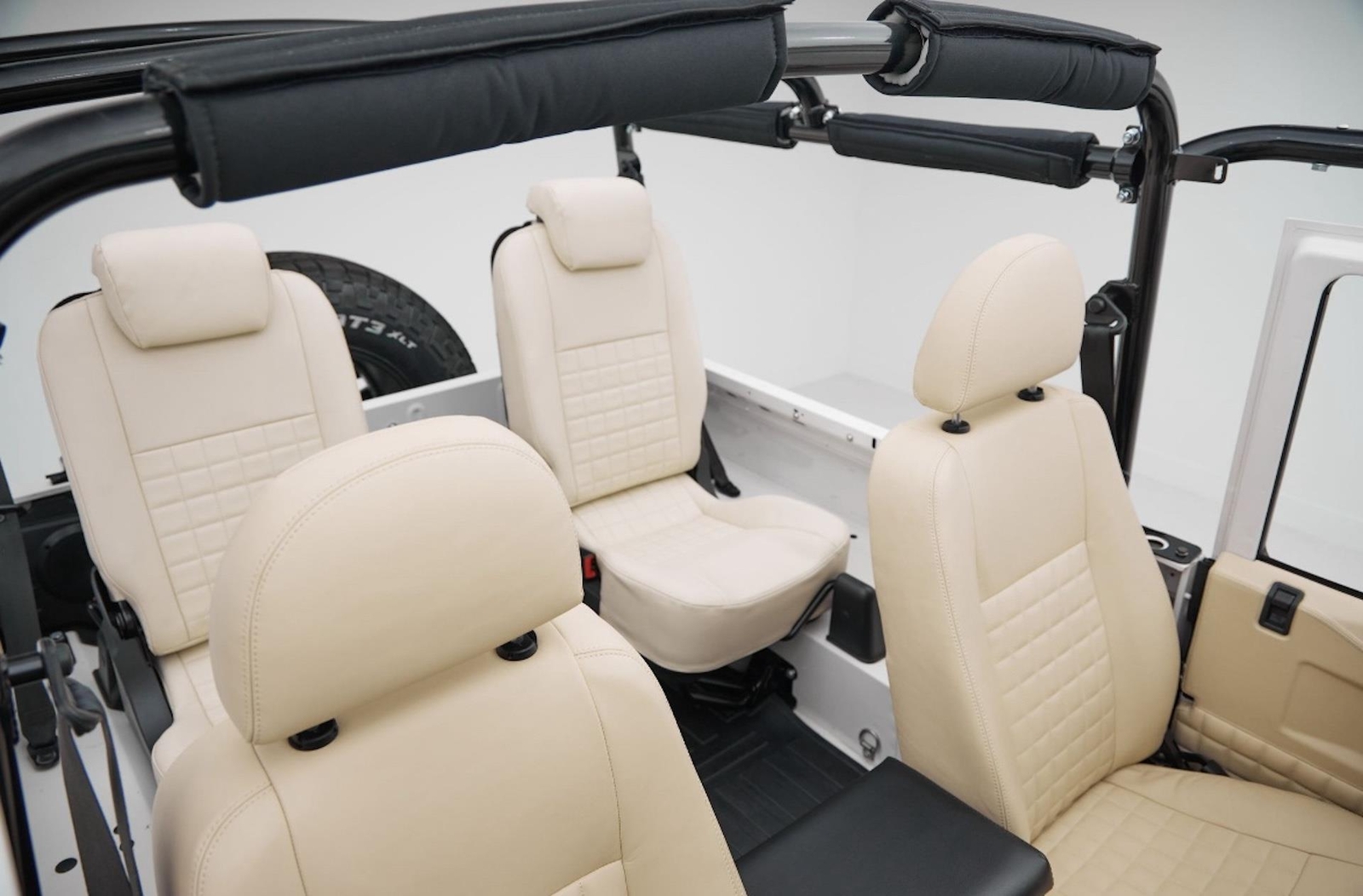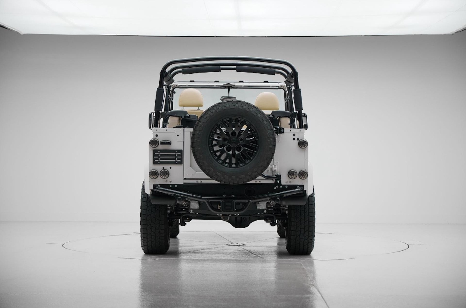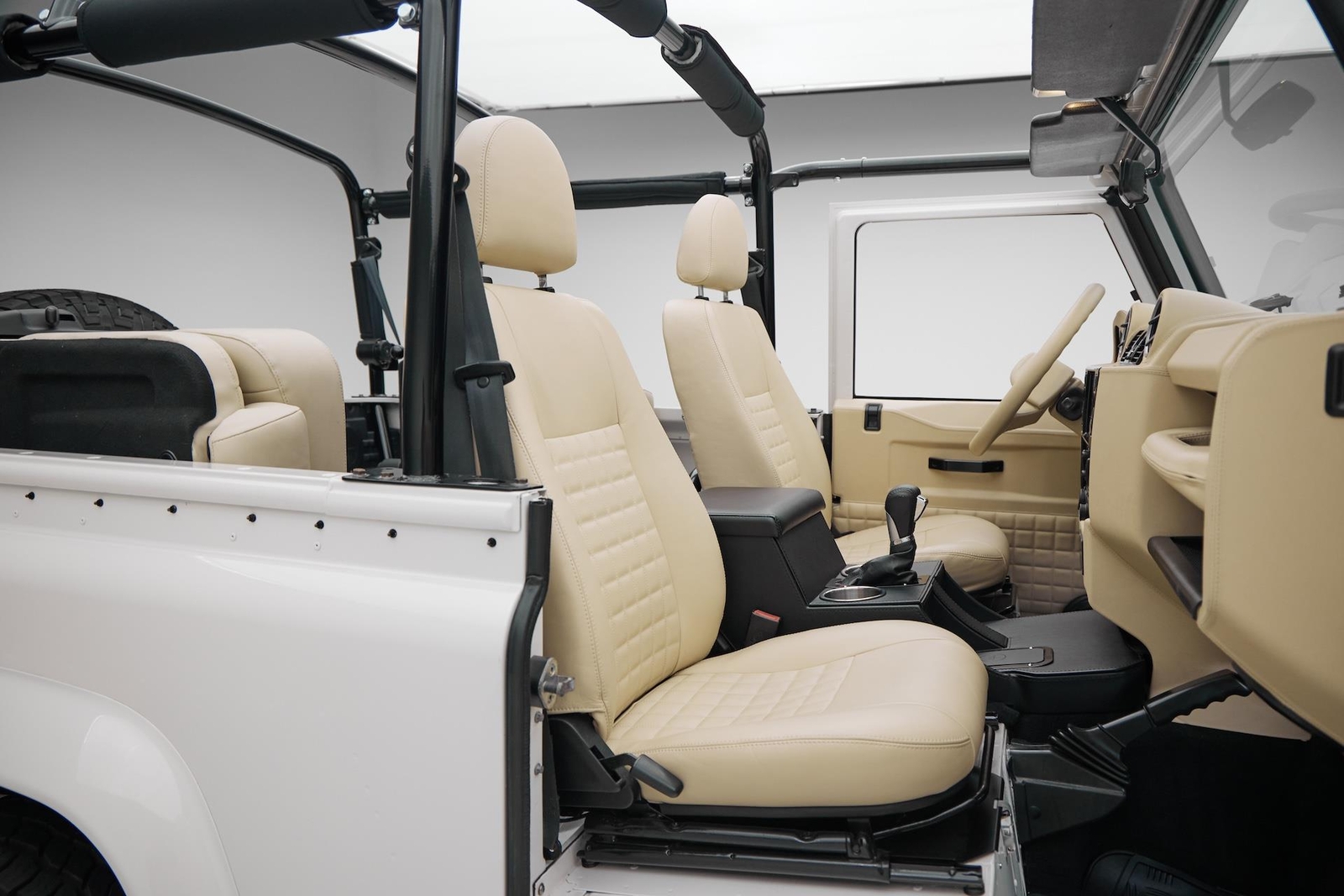 The body was skillfully finished in crisp Fuji White complemented by color-matched wheel arches and trim, all completed at our in-house body and paint facility. Adding to the vehicle's safety features, a satin black powder-coated multi-point Safety Devices® safety cage provides enhanced passenger protection. The premium black soft top fits snugly, keeping the elements at bay, while the quick and easy-to-roll-up and zip-out side and rear windows offer the freedom of an open-air experience whenever desired. LED-illuminated, black anodized aluminum exterior door handles, along with black anodized aluminum door, bonnet, and windscreen hinges, enhance the concise exterior color scheme.