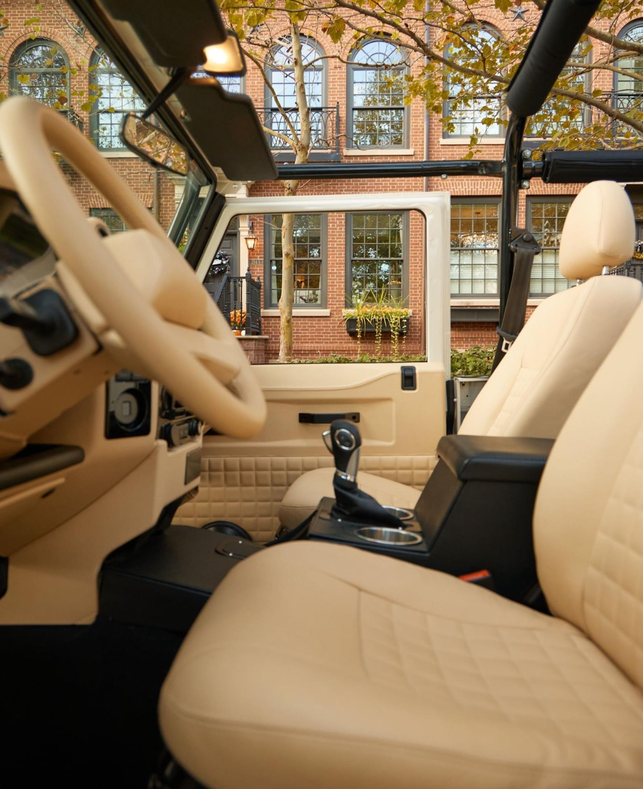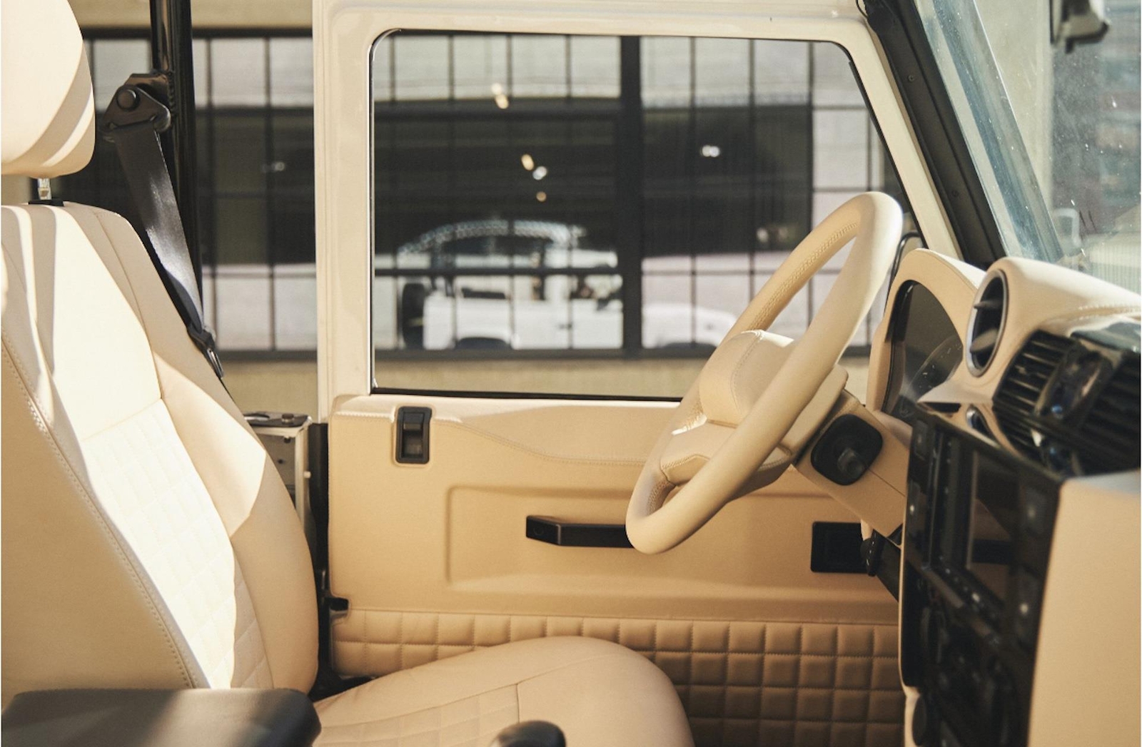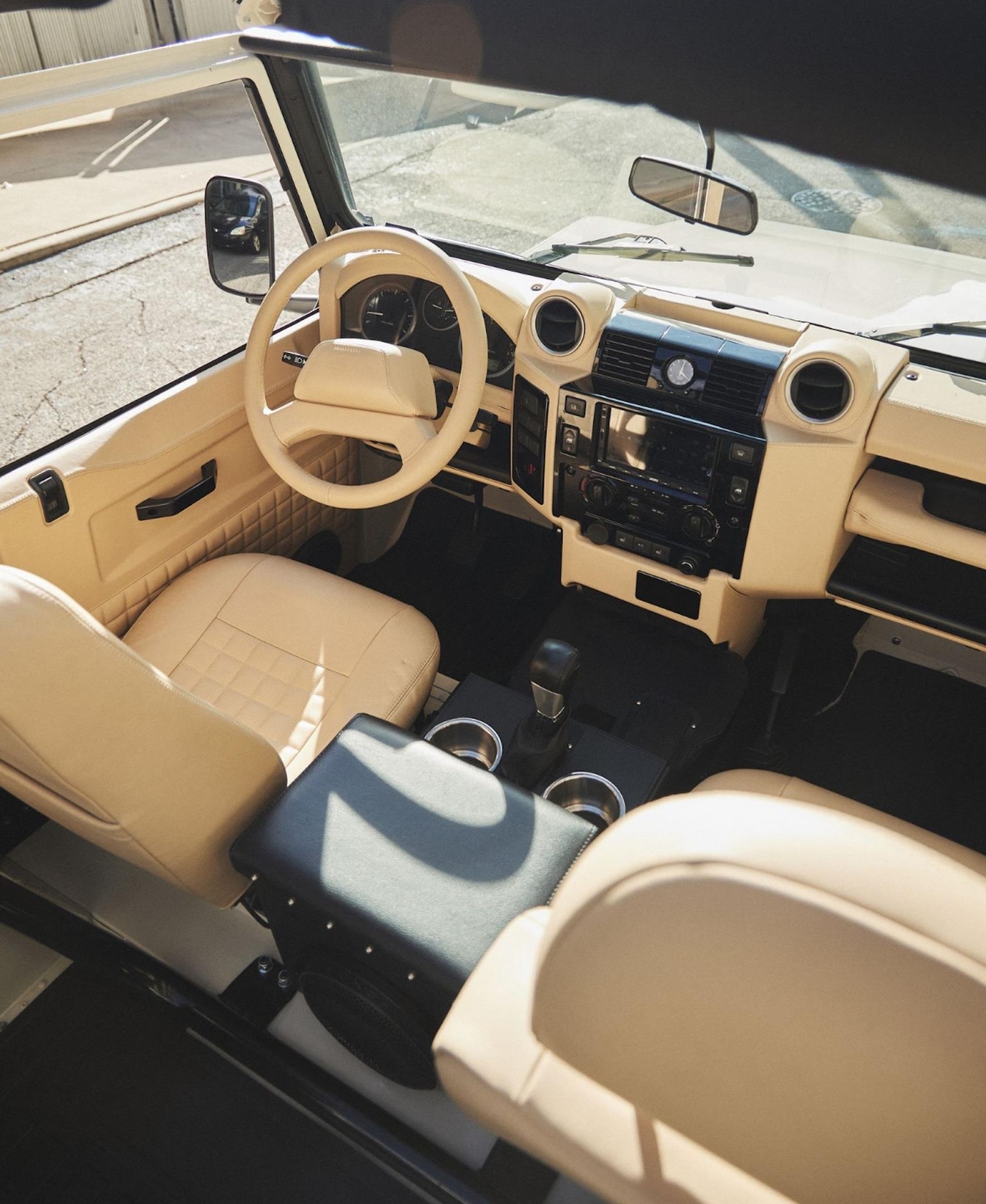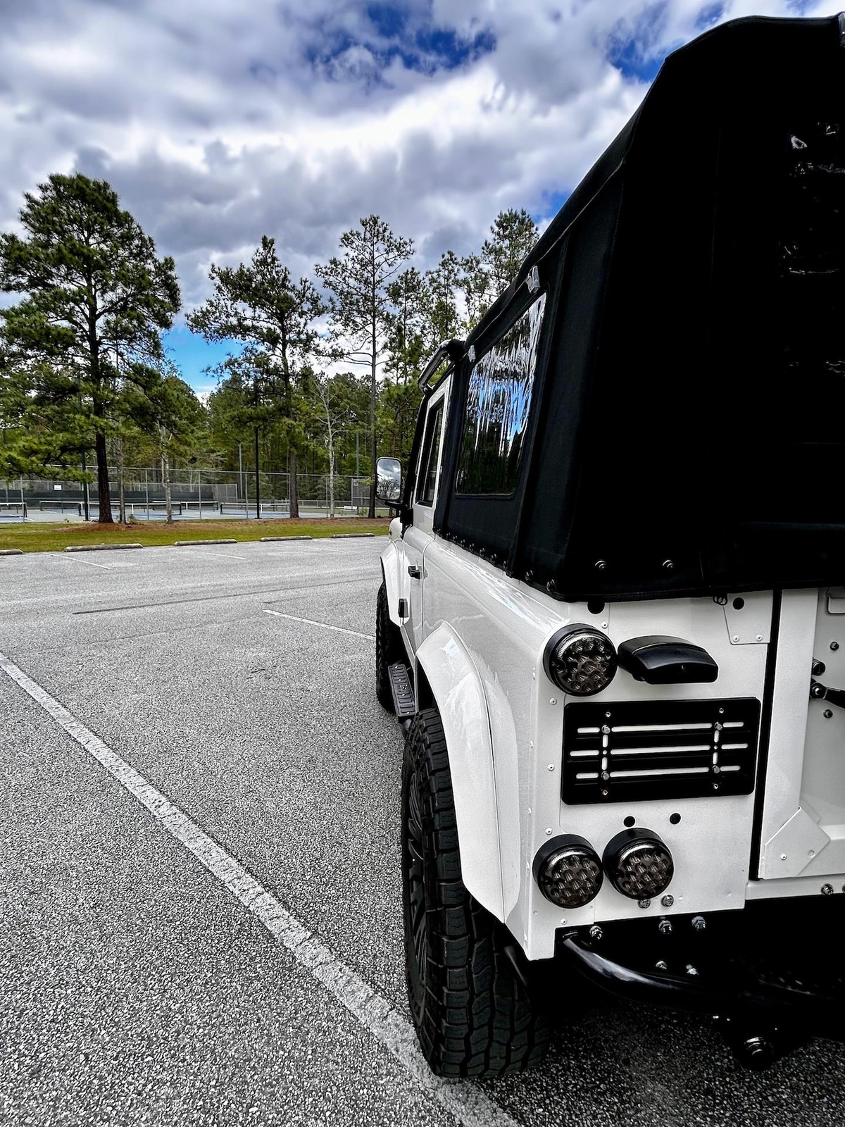 The body was skillfully finished in crisp Fuji White complemented by color-matched wheel arches and trim, all completed at our in-house body and paint facility. Adding to the vehicle's safety features, a satin black powder-coated multi-point Safety Devices® safety cage provides enhanced passenger protection. The premium black soft top fits snugly, keeping the elements at bay, while the quick and easy-to-roll-up and zip-out side and rear windows offer the freedom of an open-air experience whenever desired. LED-illuminated, black anodized aluminum exterior door handles, along with black anodized aluminum door, bonnet, and windscreen hinges, enhance the concise exterior color scheme.