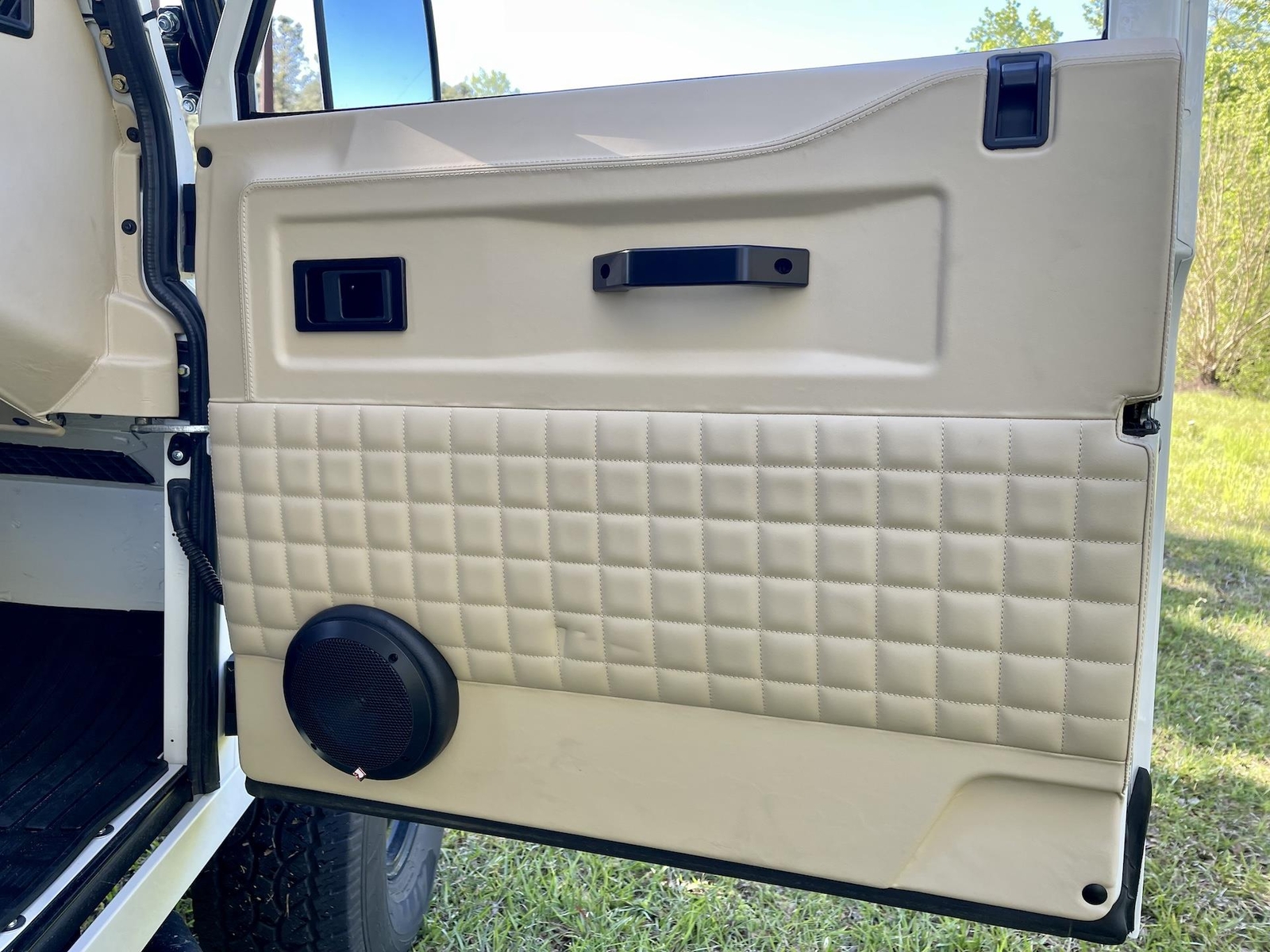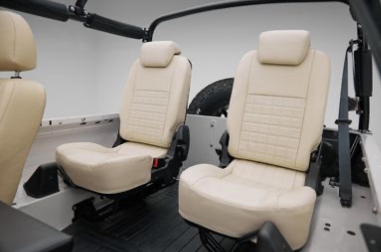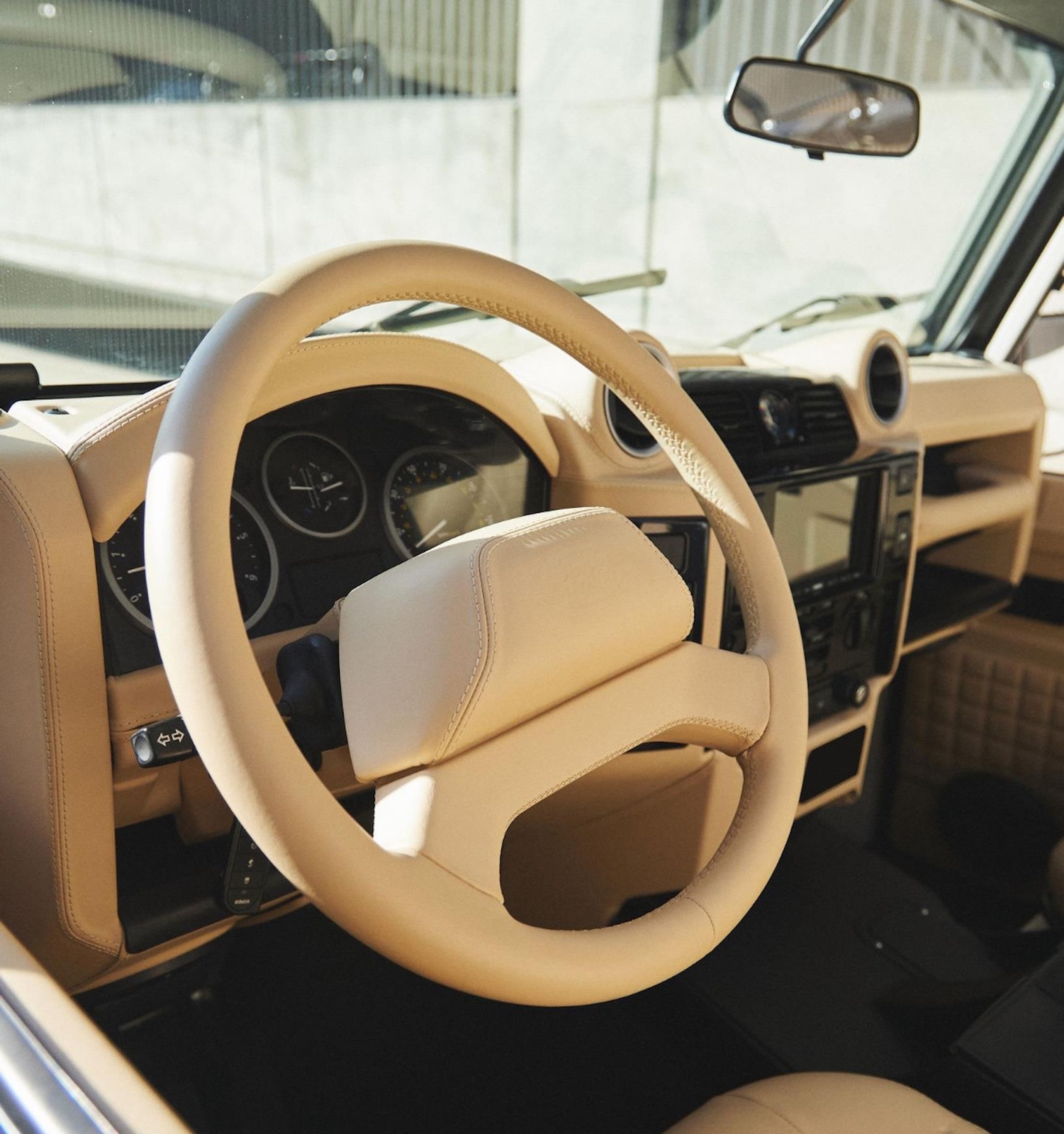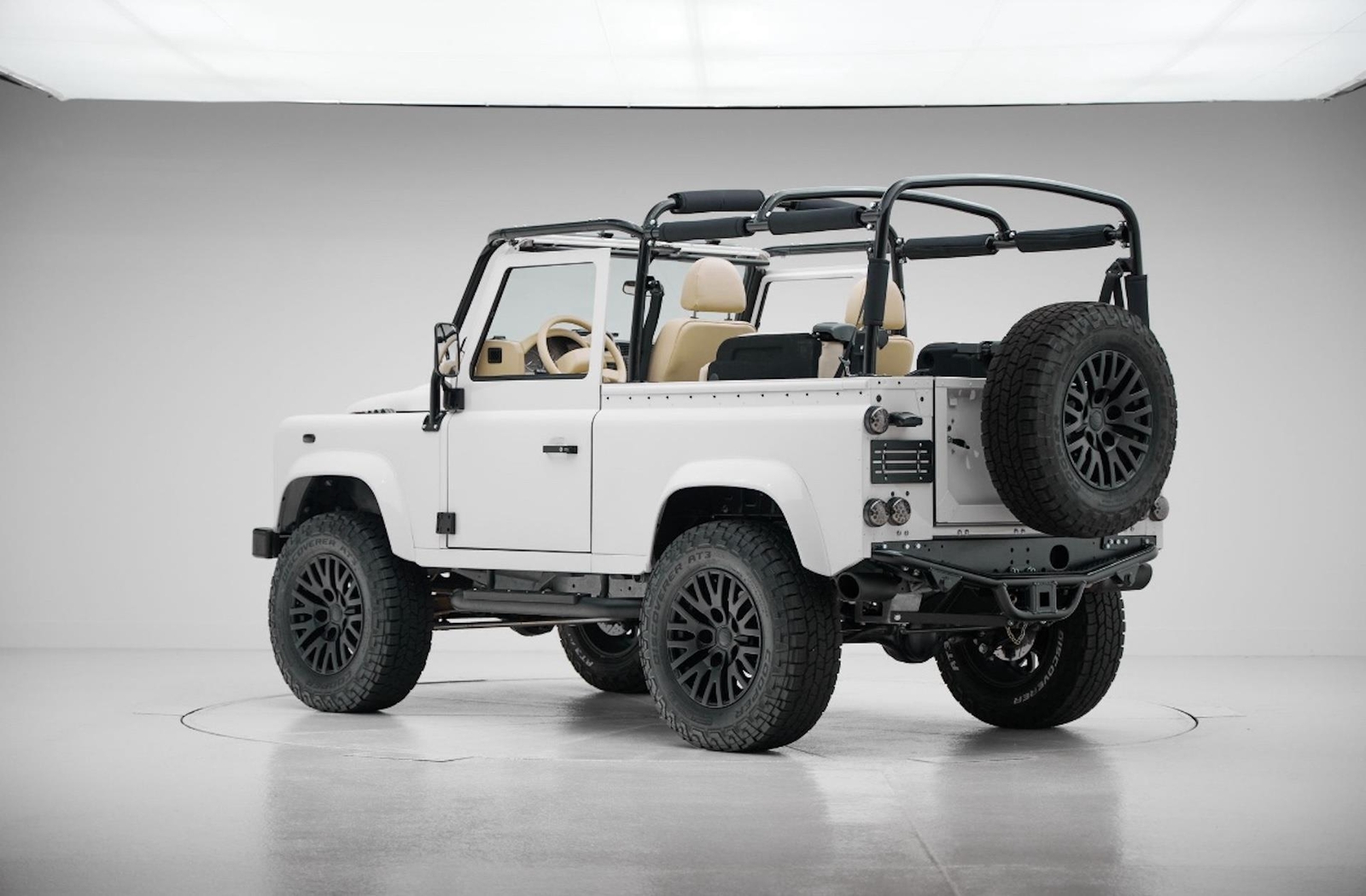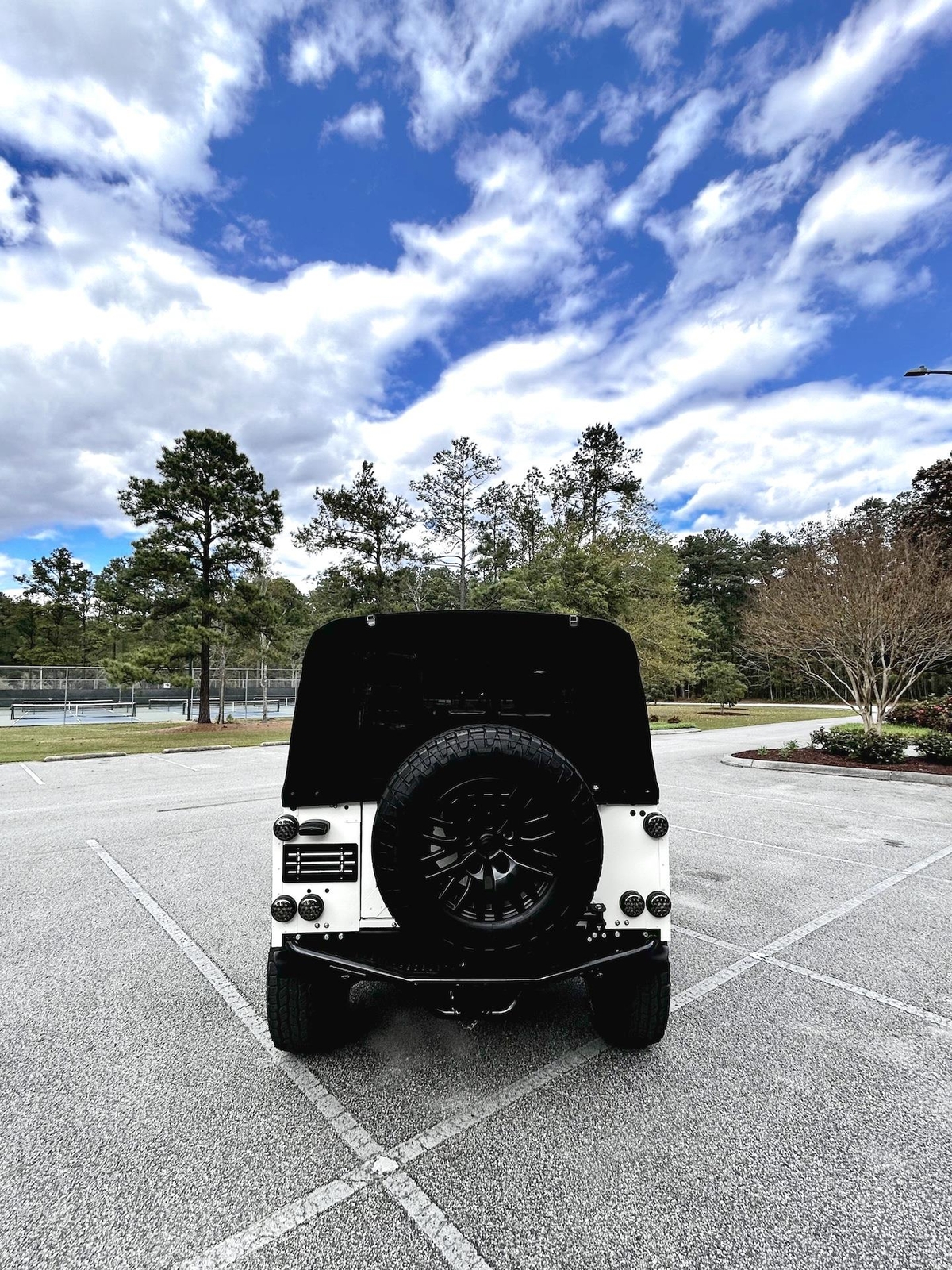 The body was skillfully finished in crisp Fuji White complemented by color-matched wheel arches and trim, all completed at our in-house body and paint facility. Adding to the vehicle's safety features, a satin black powder-coated multi-point Safety Devices® safety cage provides enhanced passenger protection. The premium black soft top fits snugly, keeping the elements at bay, while the quick and easy-to-roll-up and zip-out side and rear windows offer the freedom of an open-air experience whenever desired. LED-illuminated, black anodized aluminum exterior door handles, along with black anodized aluminum door, bonnet, and windscreen hinges, enhance the concise exterior color scheme.