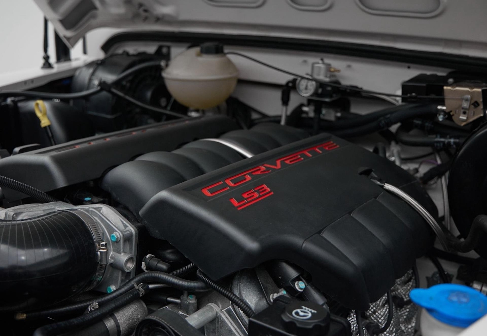 Bespoke-built by Osprey Custom 4x4, and starting with a new, hot-dipped galvanized chassis, this resplendent build was completed by their talented Team of Master Craftsmen in August 2022. The dauntless 6.2L Corvette LS3 V8 provides spirited forward motivation, while the precise-shifting 6L80E 6-speed automatic transmission with Camaro-style shifter mated to a heavy-duty, center differential lock-equipped LT230 transfer case distributes constant power to all four wheels making certain that the brawny 430+ horsepower and 425+ pound-feet of torque makes it to the ground. Powerful disc brakes at all four corners ensure stops are quiet, safe, quick, and efficient.
