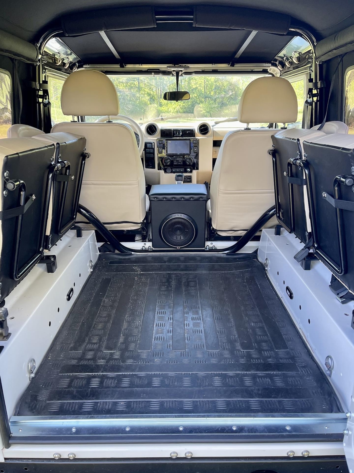 Satin black, powder-coated Masai® tubular side steps assist with ingress and egress to the very well-appointed passenger cabin where you’ll find the most pleasant surprise with this vehicle — unexpected luxury and practical utility. Supple Parchment Leather abounds inside, covering the high-back, heated front sport seats, the two forward-facing stowable rear seats, dash, and door cards. The rear seat configuration provides the ultimate flexibility — seating for additional friends and family or true utilitarian cargo space. Black anodized billet aluminum interior door pulls and door handles add the finishing touches to this unexpectedly refined interior.