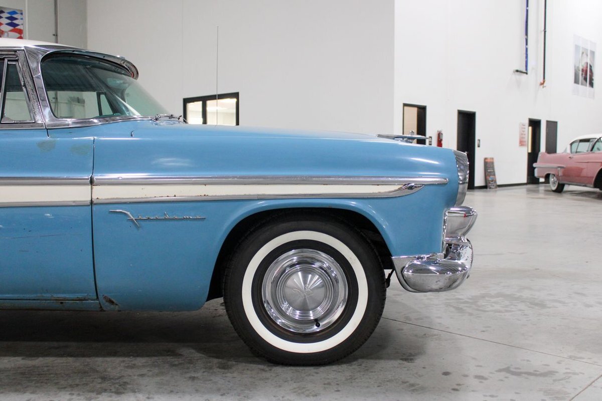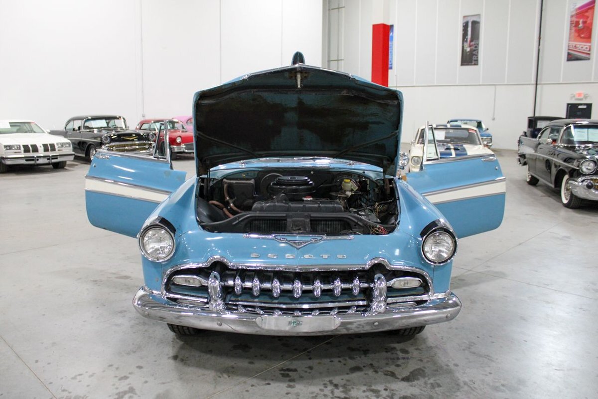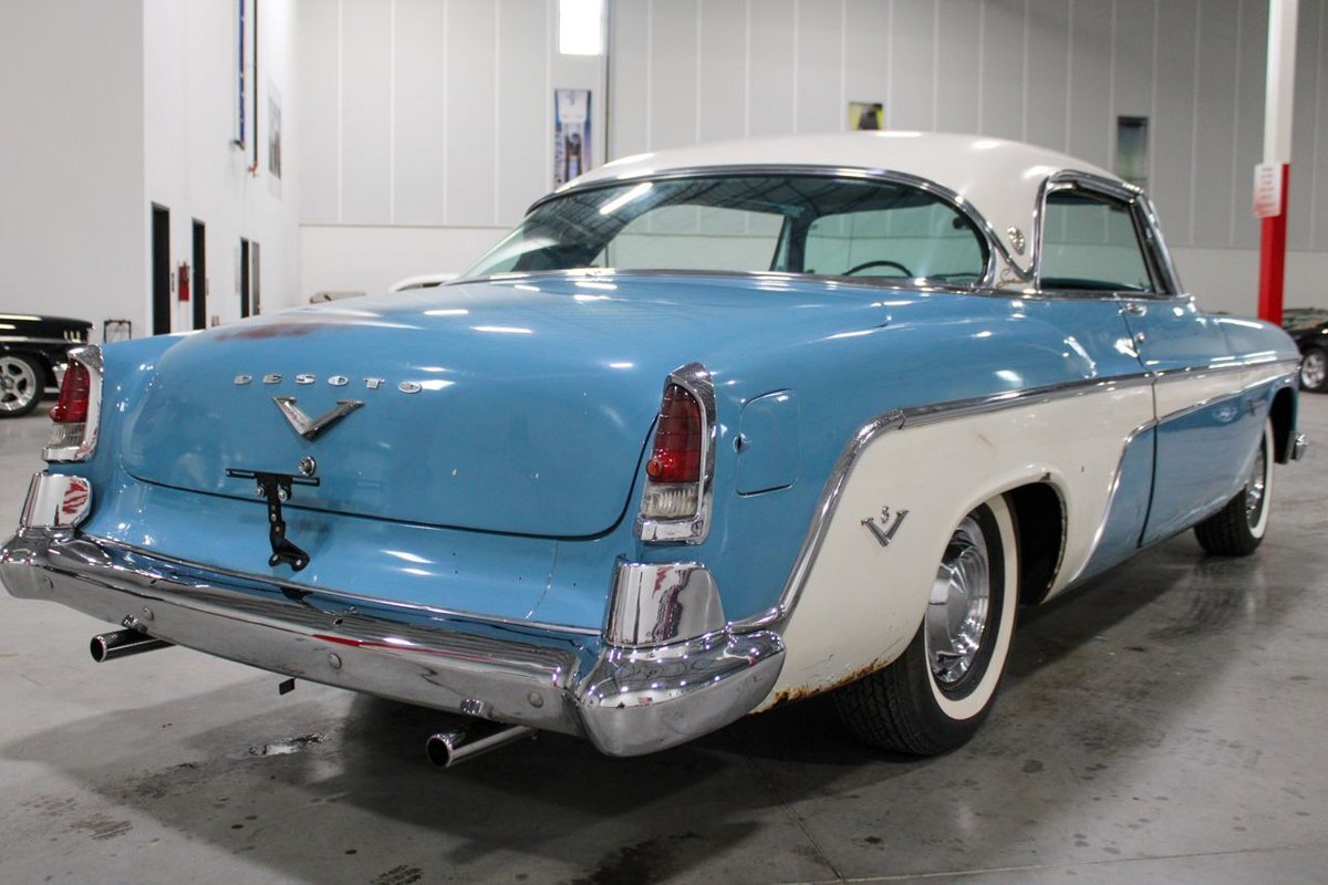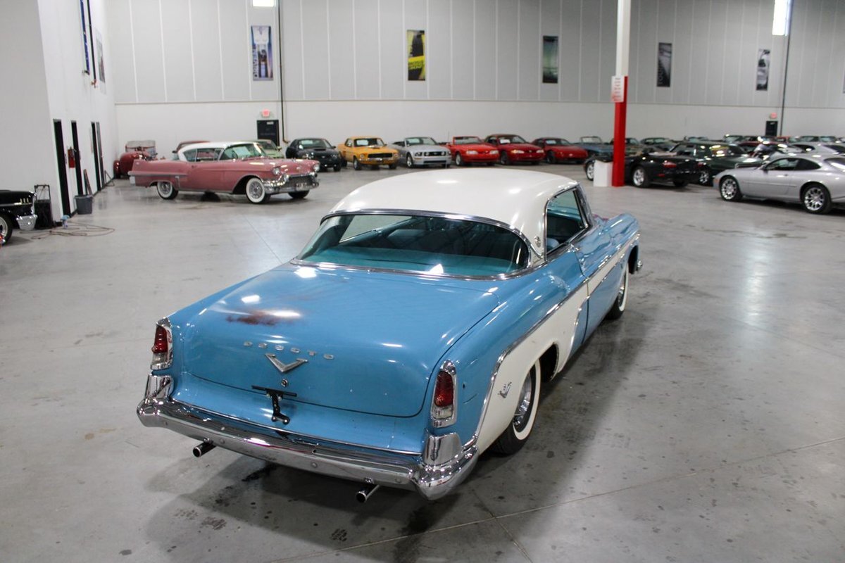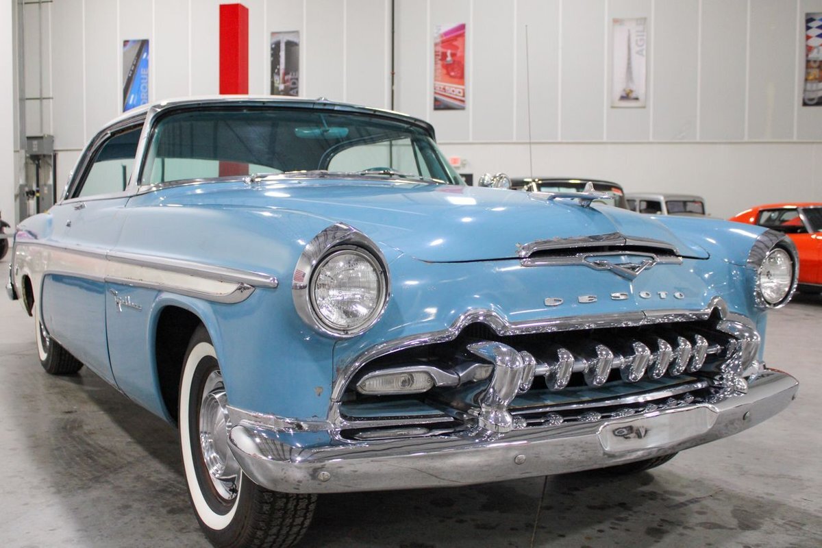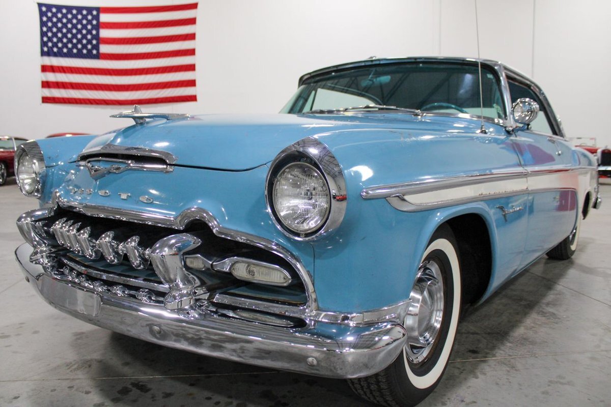 GR Auto Gallery is pleased to present this 1955 Desoto Firedome for your consideration. This Firedome comes in Blue/White exterior paint over a clean Blue/White interior. Powering this Desoto is a 291ci V8 Hemi making 185hp paired with a two-speed Powerflite transmission. This Firedome has some nice features such as; power steering, power brakes with a dual master cylinder, leather steering wheel, manual windows, front and rear seatbelts, spare tire, a new dual exhasit, and white wall tires. Restored, it is not uncommon to see these vehicles bring $35,000+ in today's market. Don't hesitate to give us a call with any questions or for more information.