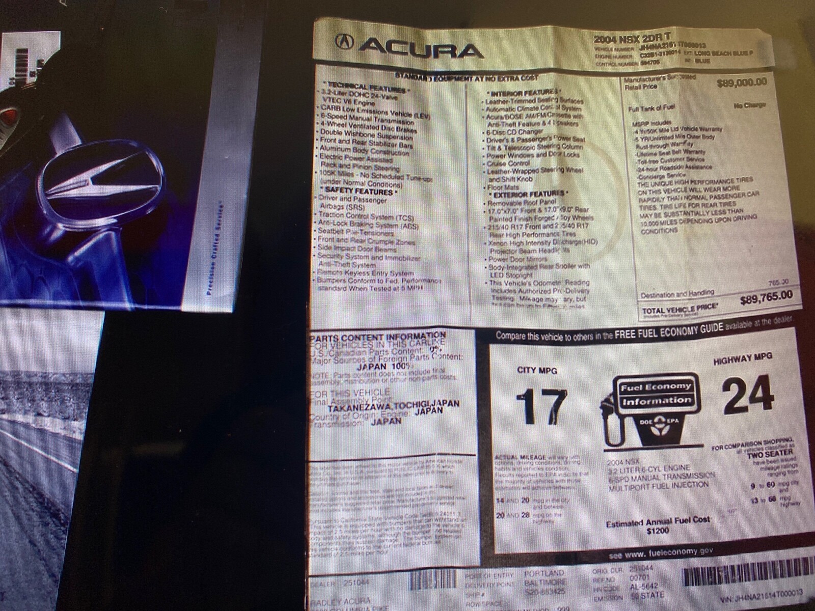 This 2004 Acura nsx 6 speed manual transmission power steering power windowRadio Am -fm - cd change after market wheels was one out 11 the made in 2004 with the color combination blue & blue this car drive and look like brand new