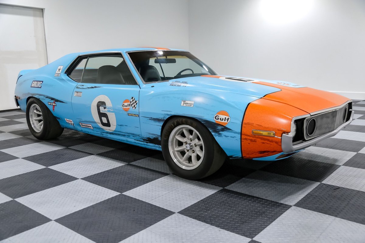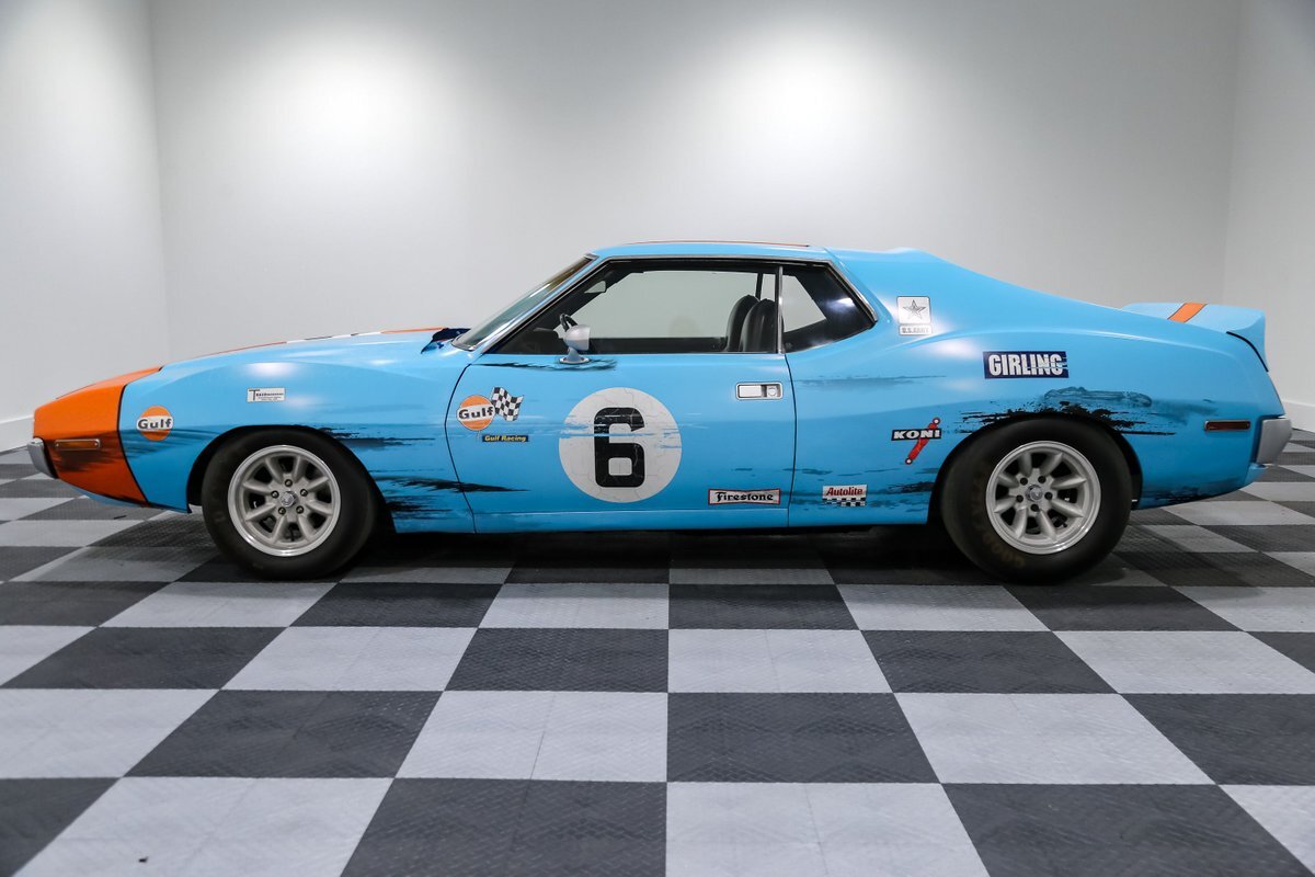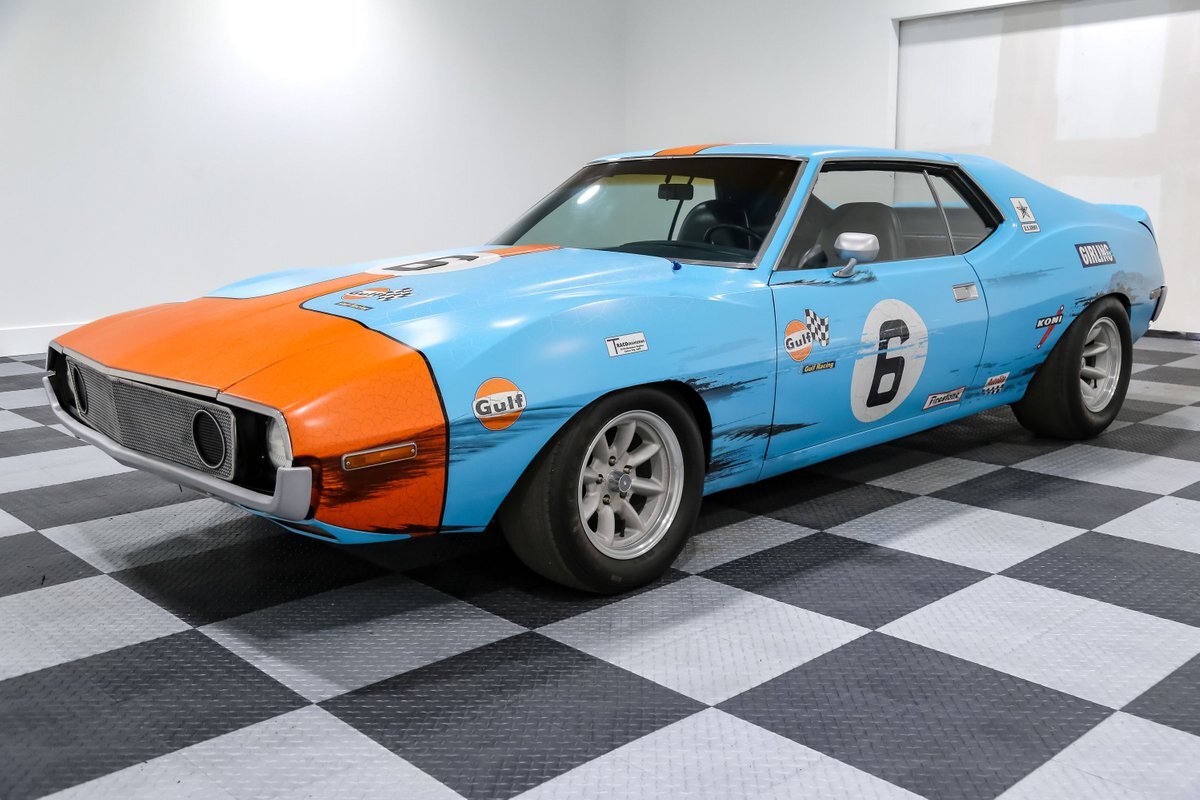 Now, about that Gulf Blue color – this ain't just a color, folks. This is a nod, a tribute, a salute to an era of racing dominance. The Gulf Racing custom wrap ensures that wherever this Javelin goes, it's turning heads and dropping jaws. And if for some wild reason you ever want a change, there's a slick blue metallic paint hiding beneath the wrap. It's like having two beasts in one!