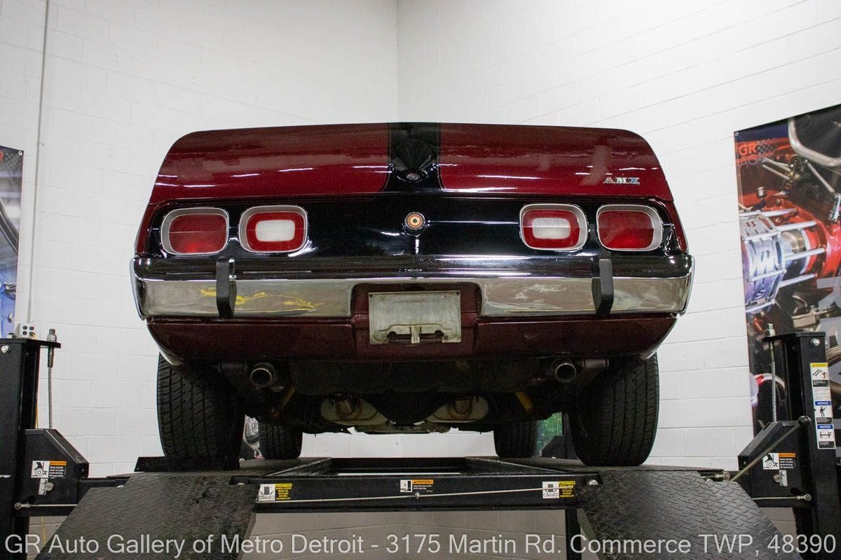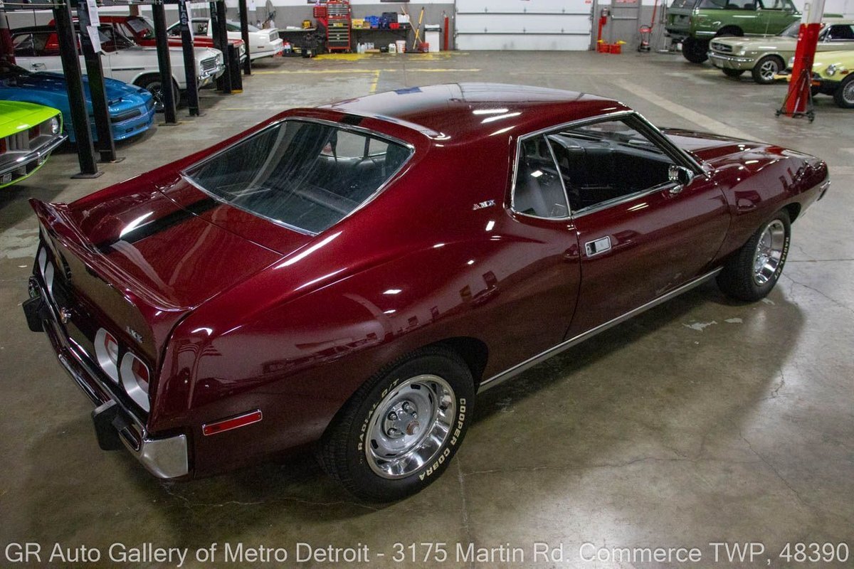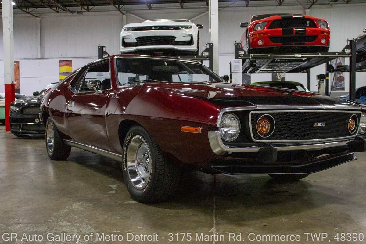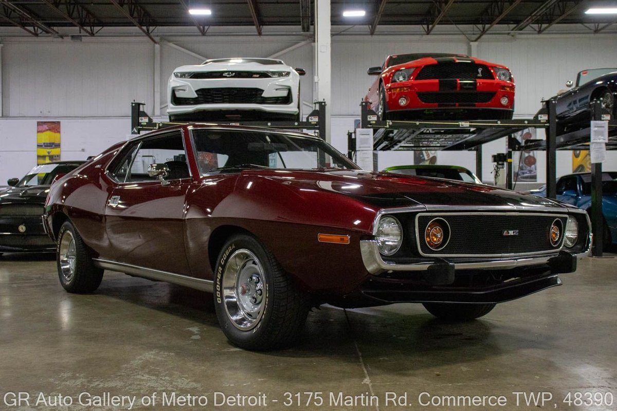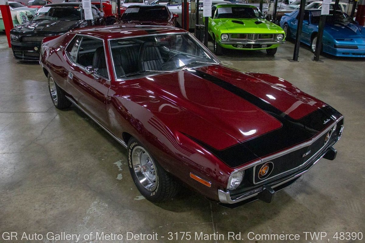 GR Auto Gallery is pleased to present this restored 1973 AMC Javelin AMX for your consideration. This stunning Javelin AMX boasts a powerful 360 cubic inch V8 engine producing 289 horsepower, paired with a 727 3-speed automatic transmission. The Vineyard Burgundy exterior is complemented by a sleek black interior. In which it has been meticulously maintained with roughly 5,000 miles since the restoration, this AMX comes equipped with features such as a high stall converter, Holley 650 double pump carburetor, undercoated underside, freshly powder coated 15-inch stock wheels, new main wiring harness, new high output battery, audia dtx cassette stereo, functional heat, and more. Documentation receipts and dyno sheets are included for peace of mind. Drive this one out of our showroom or have us assist with shipping it to you anywhere in the United States! Don't hesitate to call us with any questions or for more information.
