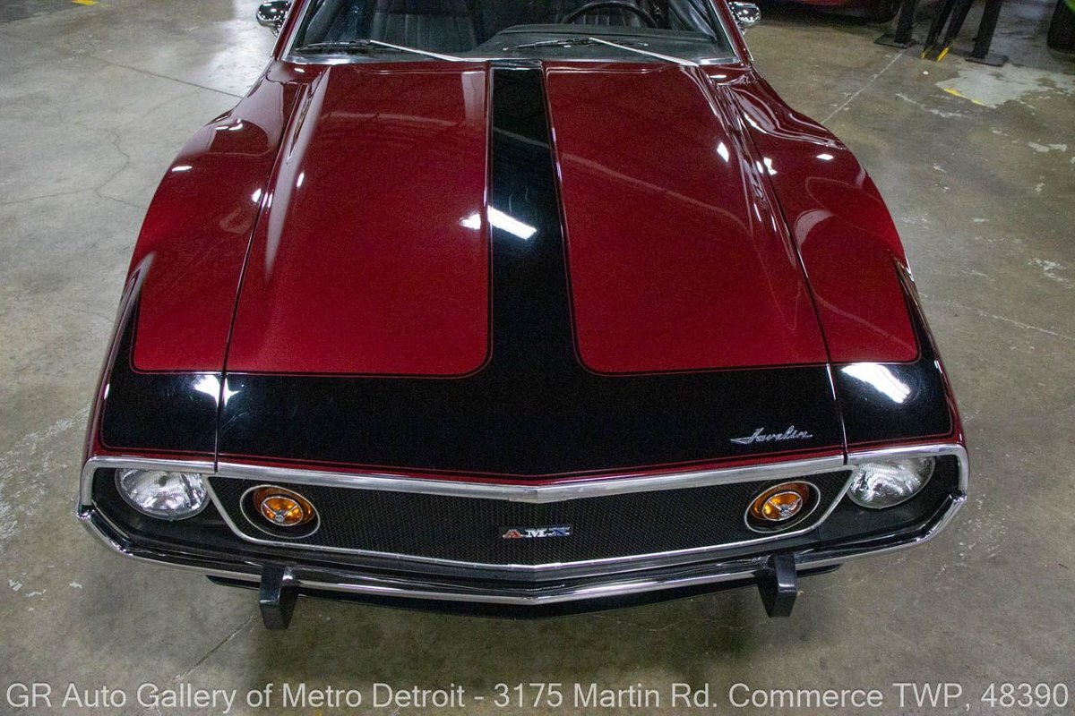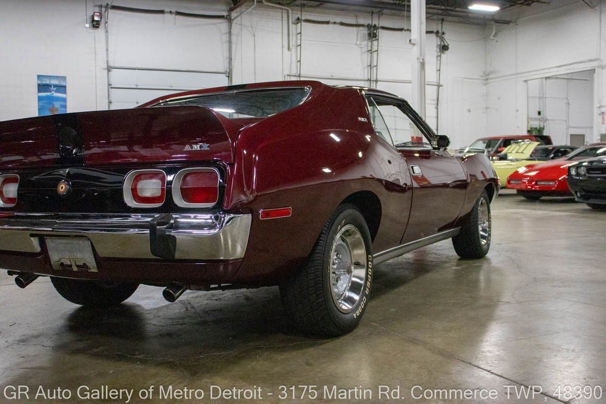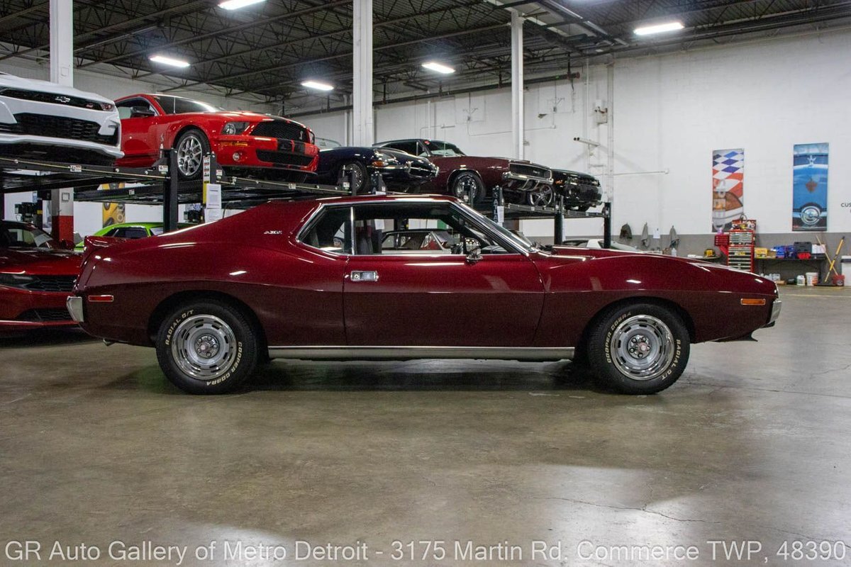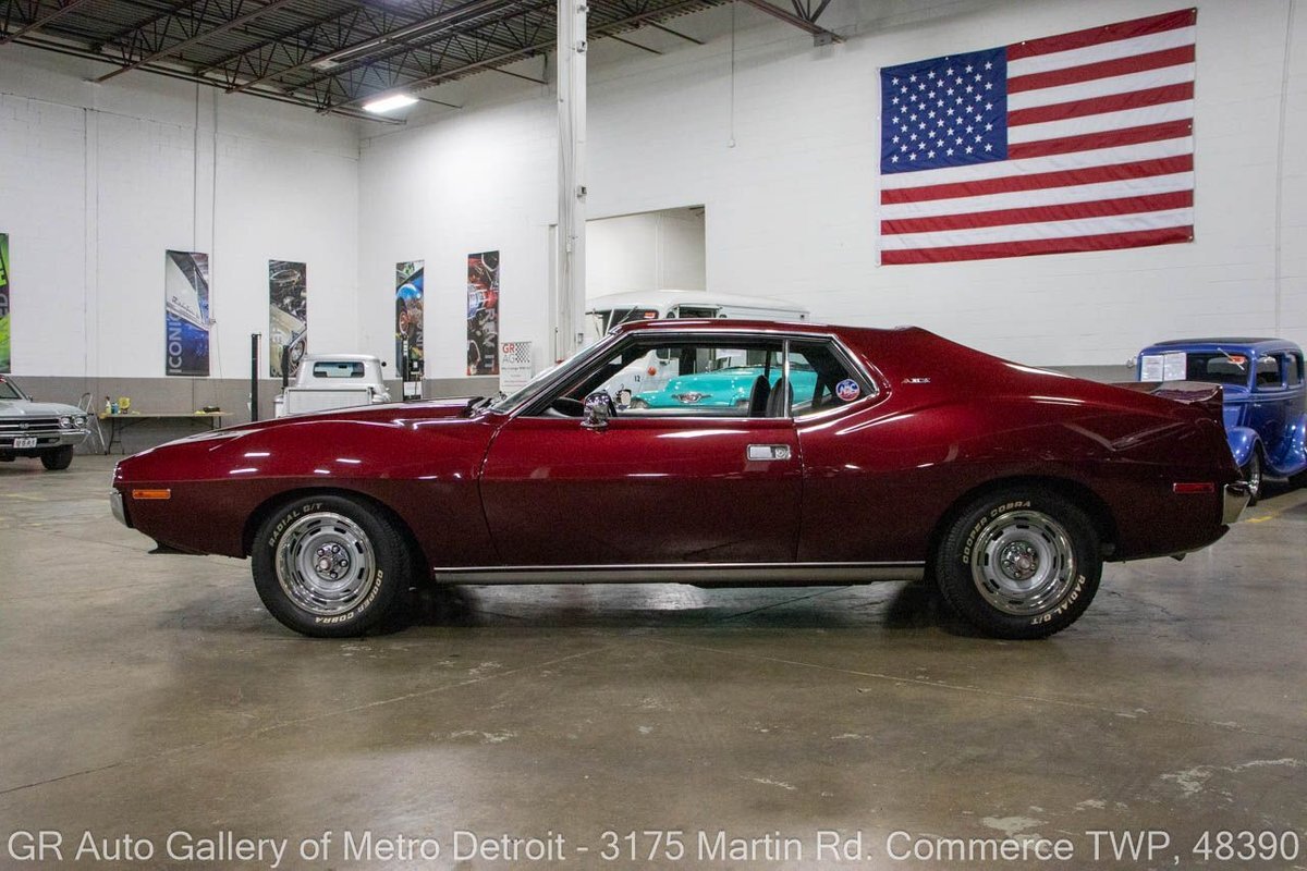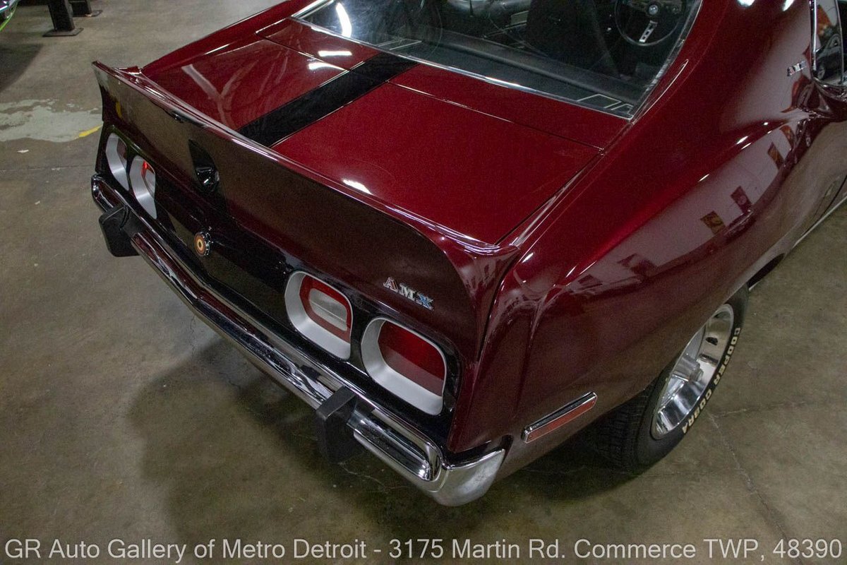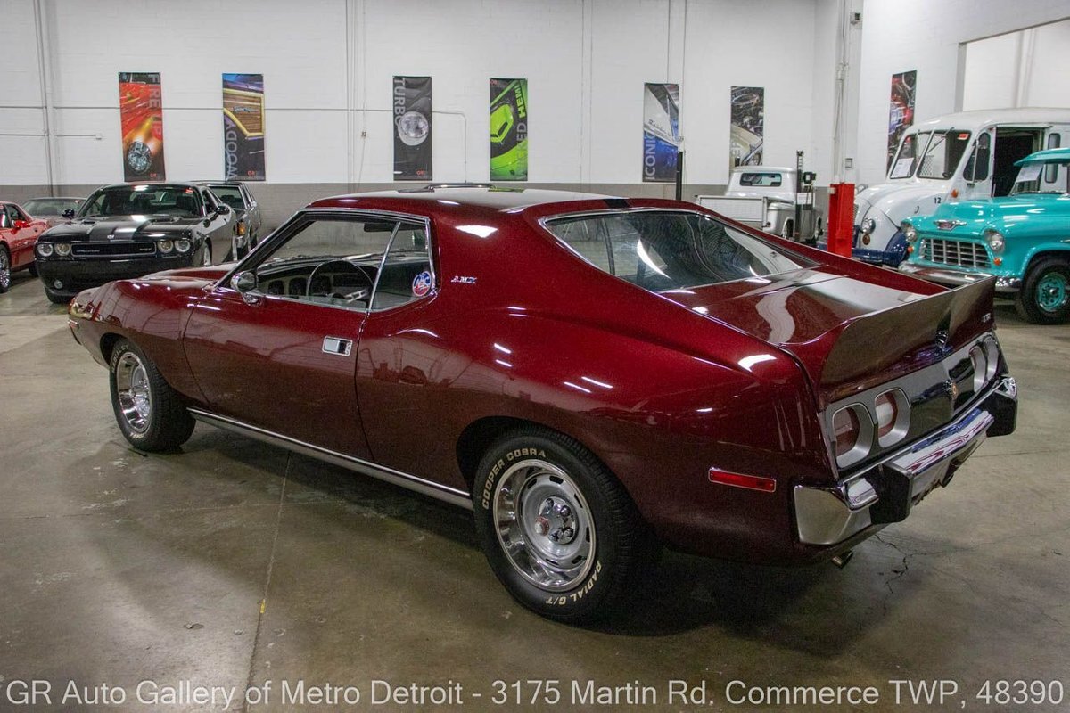 GR Auto Gallery is pleased to present this restored 1973 AMC Javelin AMX for your consideration. This stunning Javelin AMX boasts a powerful 360 cubic inch V8 engine producing 289 horsepower, paired with a 727 3-speed automatic transmission. The Vineyard Burgundy exterior is complemented by a sleek black interior. In which it has been meticulously maintained with roughly 5,000 miles since the restoration, this AMX comes equipped with features such as a high stall converter, Holley 650 double pump carburetor, undercoated underside, freshly powder coated 15-inch stock wheels, new main wiring harness, new high output battery, audia dtx cassette stereo, functional heat, and more. Documentation receipts and dyno sheets are included for peace of mind. Drive this one out of our showroom or have us assist with shipping it to you anywhere in the United States! Don't hesitate to call us with any questions or for more information.