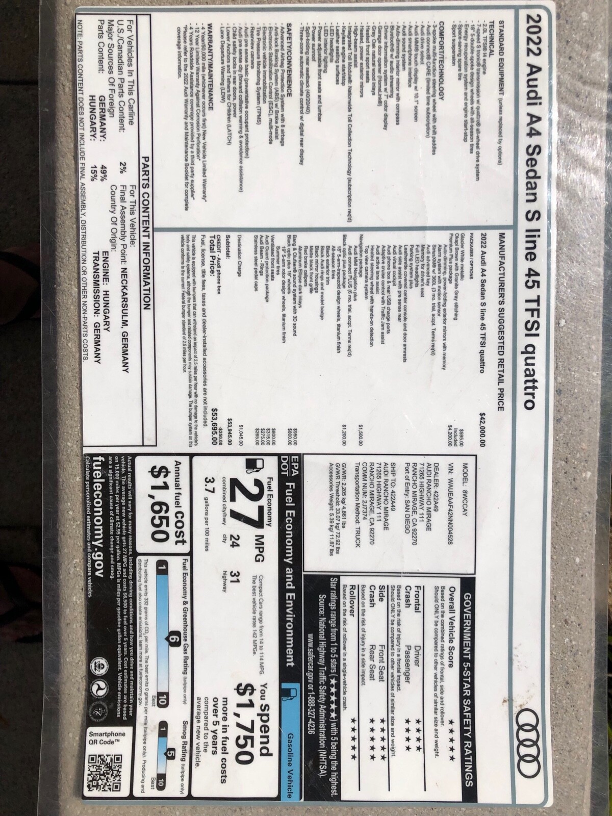 This 2022 Premium Plus Package Audi A4 S-Line 45 TFSI Quattro is an original. The owner has had it for 2 years. The vehicle runs great and is mainly used for weekend drives.Seller's Notes