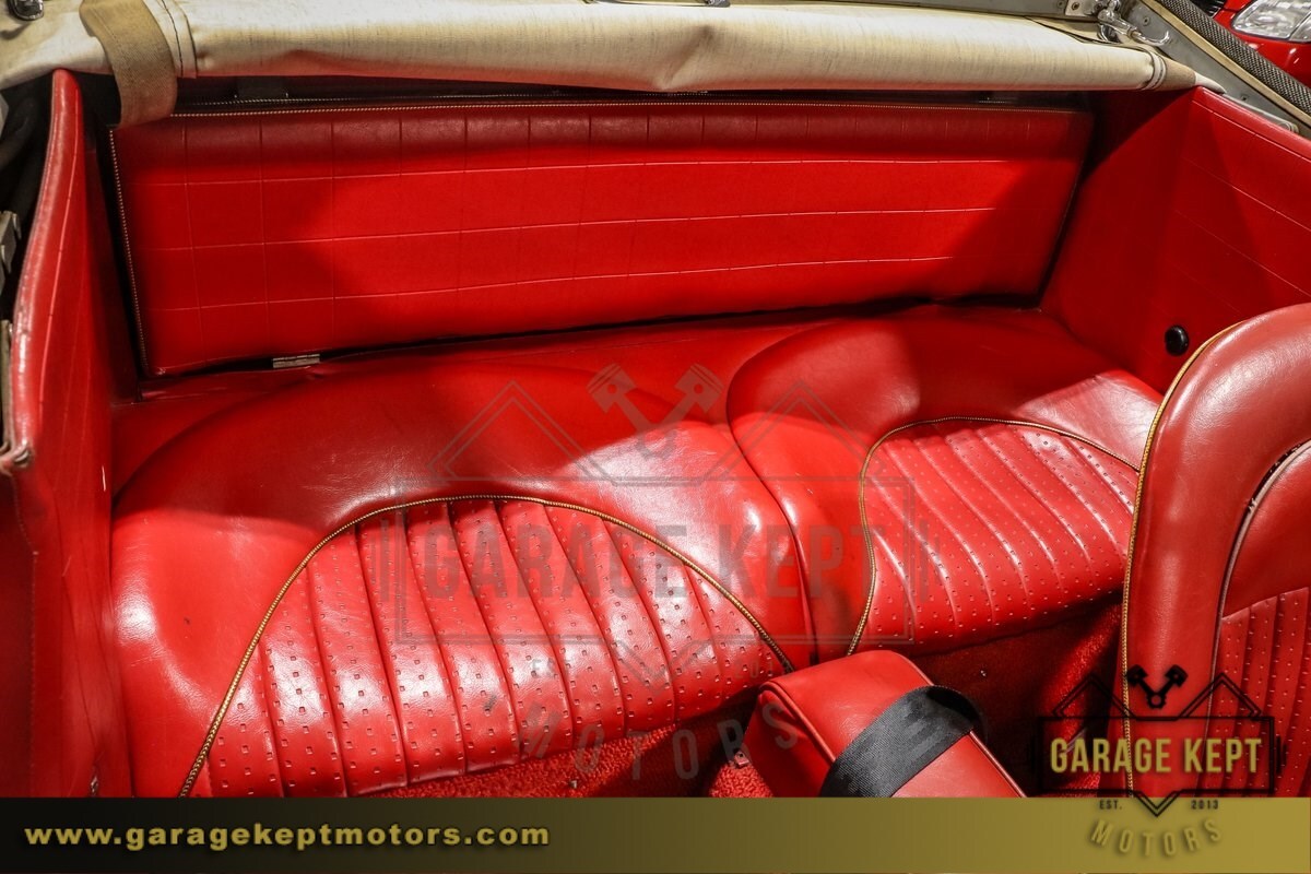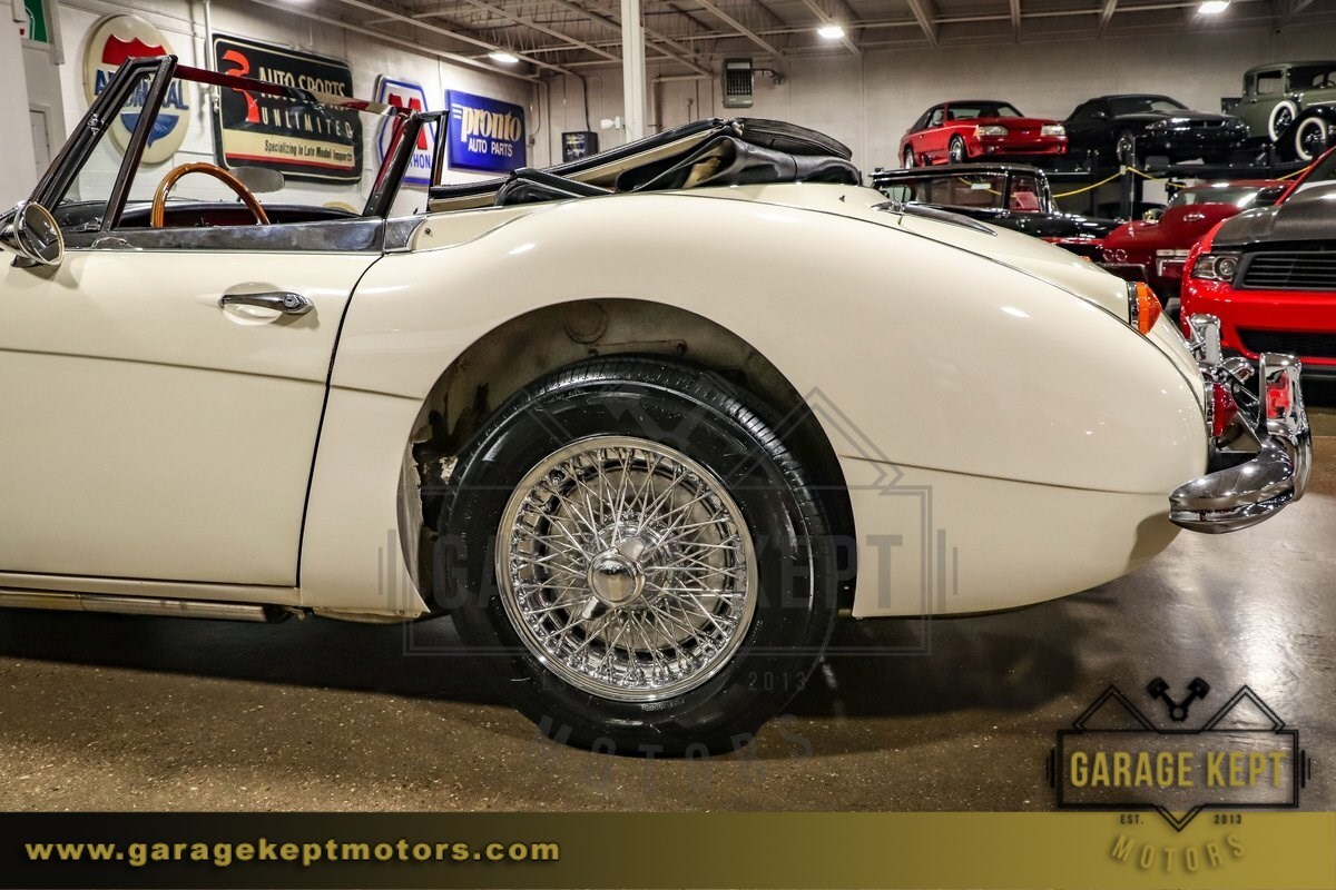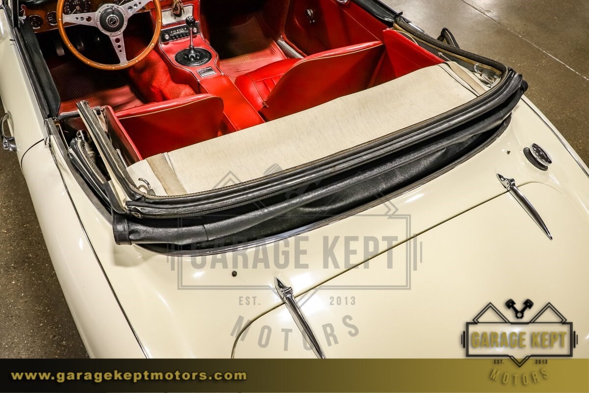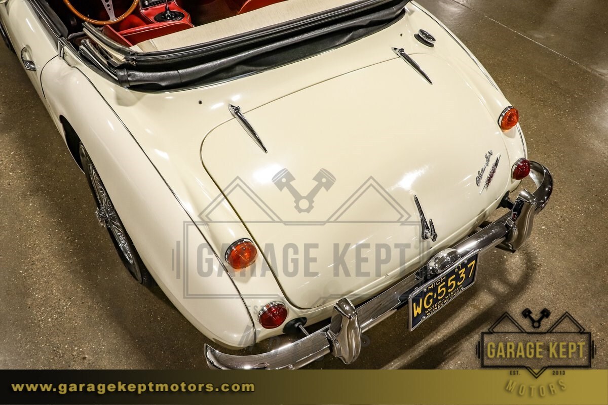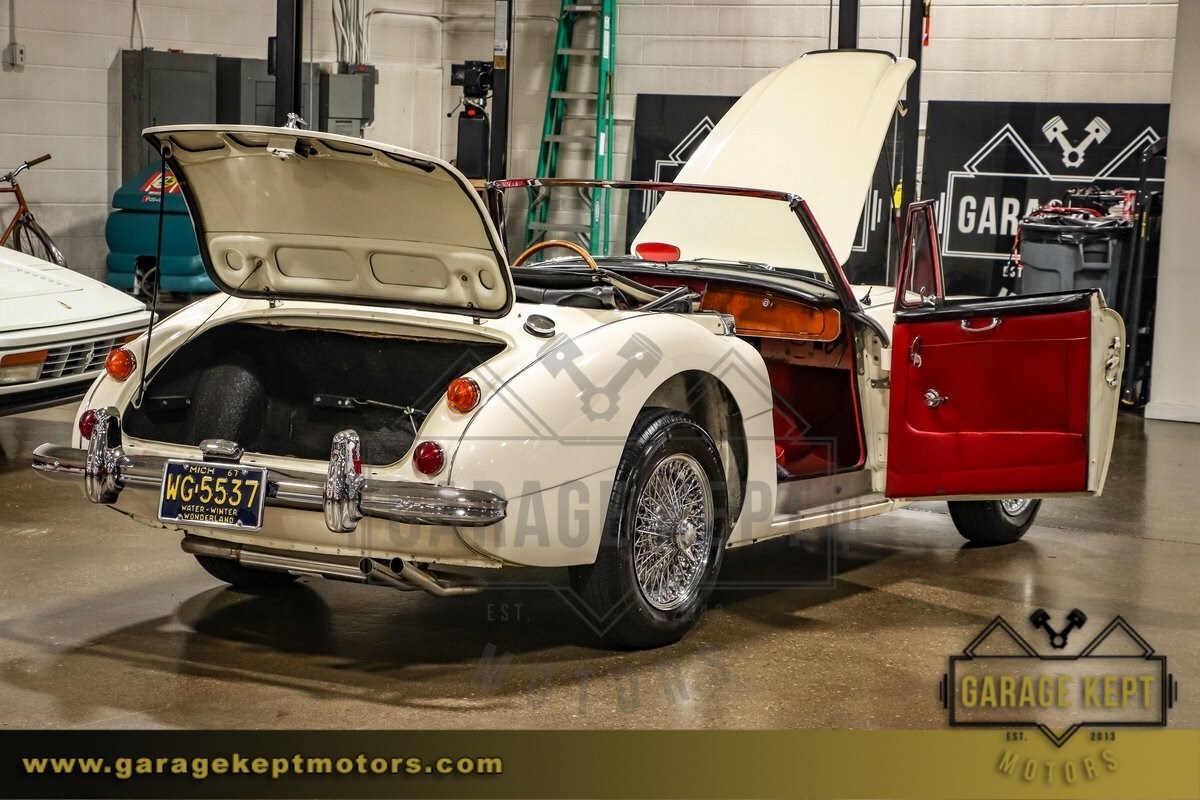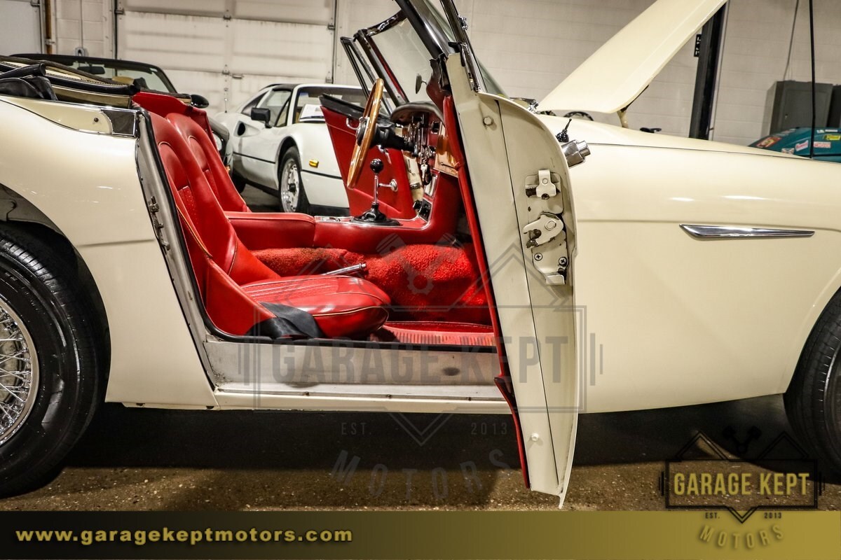 The exterior of this Austin-Healey is finished in a Mission White, a timeless color that highlights the car's sleek lines and graceful curves. Complementing the elegant exterior is a vibrant red interior, which provides a striking contrast and enhances the car's sophisticated look. The interior is in good condition, with comfortable seating and a classic dashboard that adds to the nostalgic driving experience.
