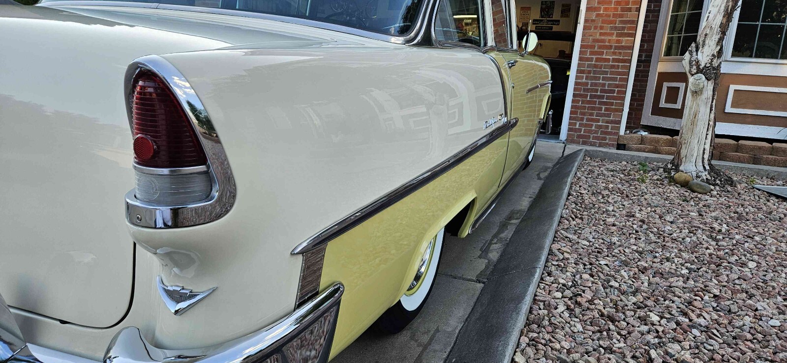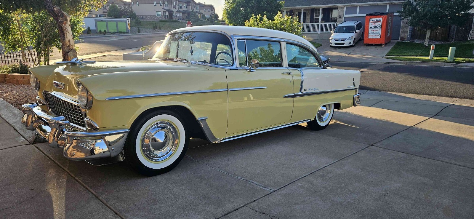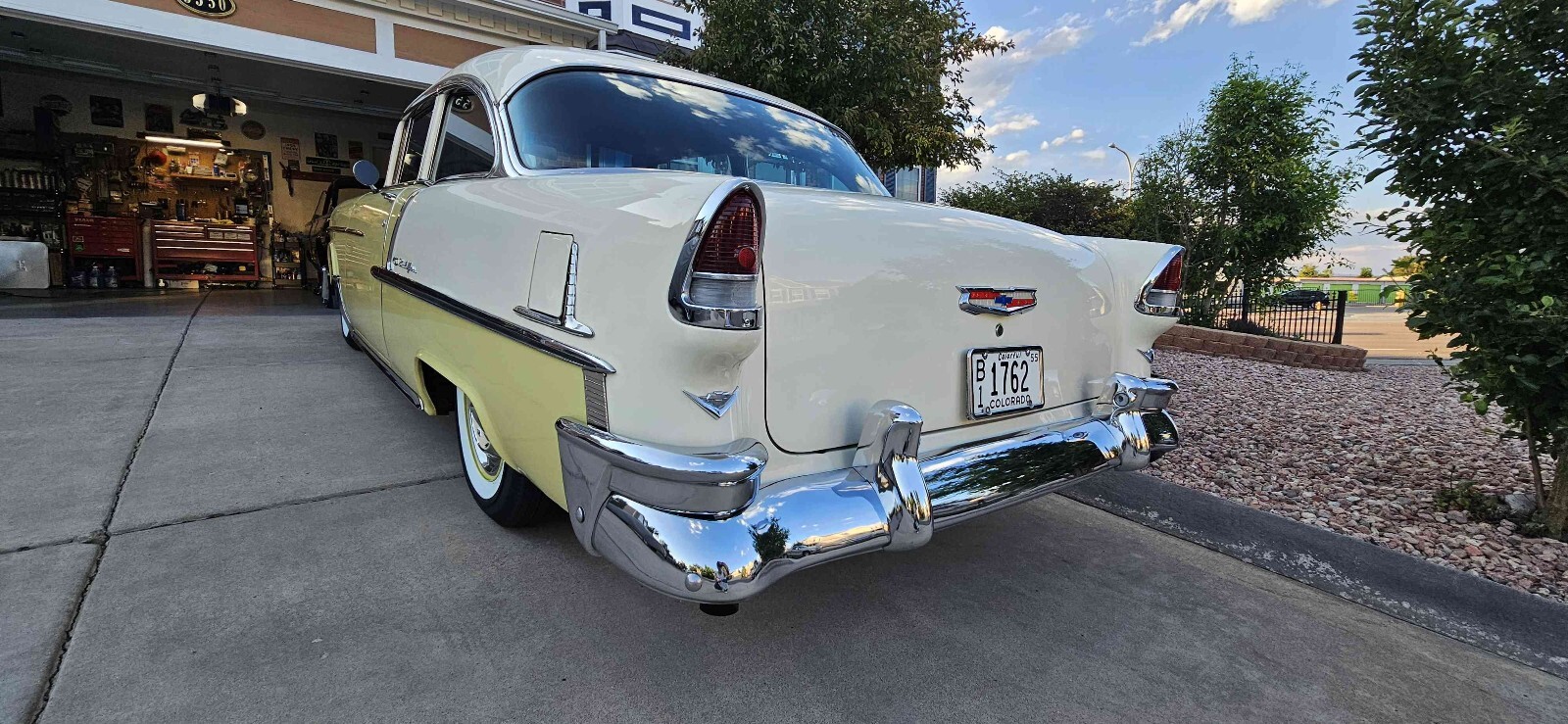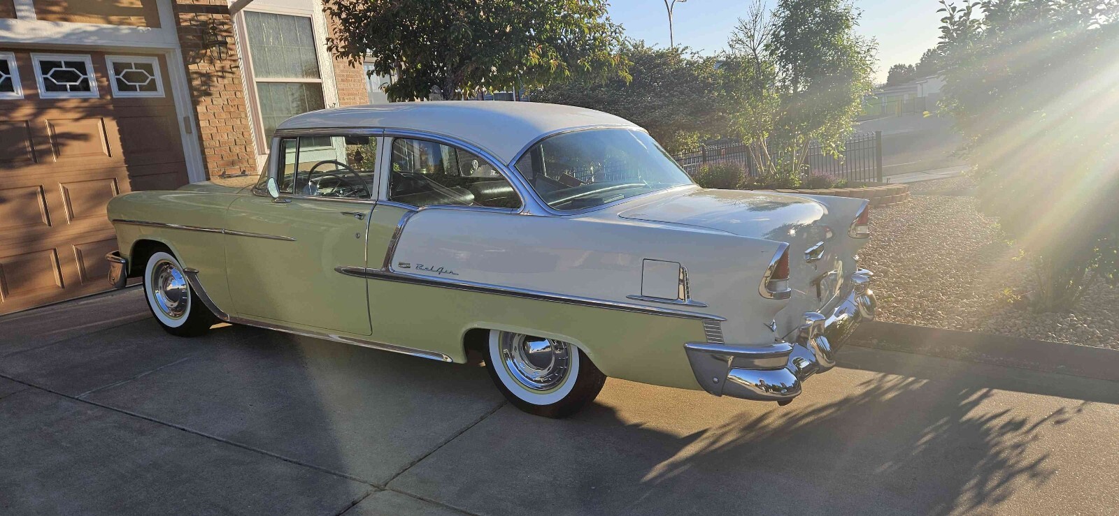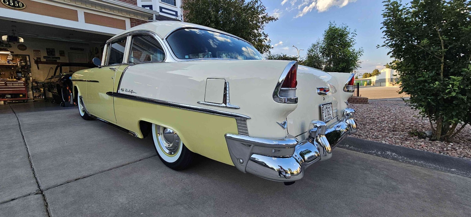 Beautiful 1955 Bel air 2 door post that is Harvest Gold and ivory, this is a beautiful 100% rust free California car. This car has a beautiful fast 1970 Corvette 350 engine with electronic ignition, factory power steering, power front disk/ rear drum brakes with 4 barrel edelbrock carburetor 350 trubo automatic transmission that shifts great. This car runs great on the highway. This car has rare options with power windows, power seats and ez eye glass, has all the beautiful front and rear bumper wraps and grill guard. All windows operate smoothly and seat works great. All lights and gauges work, oil pressure and temperature gauge are two that were added for safety. This care rides tight and handles good with a lowered stance with a 3" in rear and 2" in front. Just did a major tune up and did all new BFGoodrich wide white wall tires with color match wheels. This is one of the cleanest belair post I seen in a long time. Please contact me with any questions. Thanks Curtiss 719-799-3293