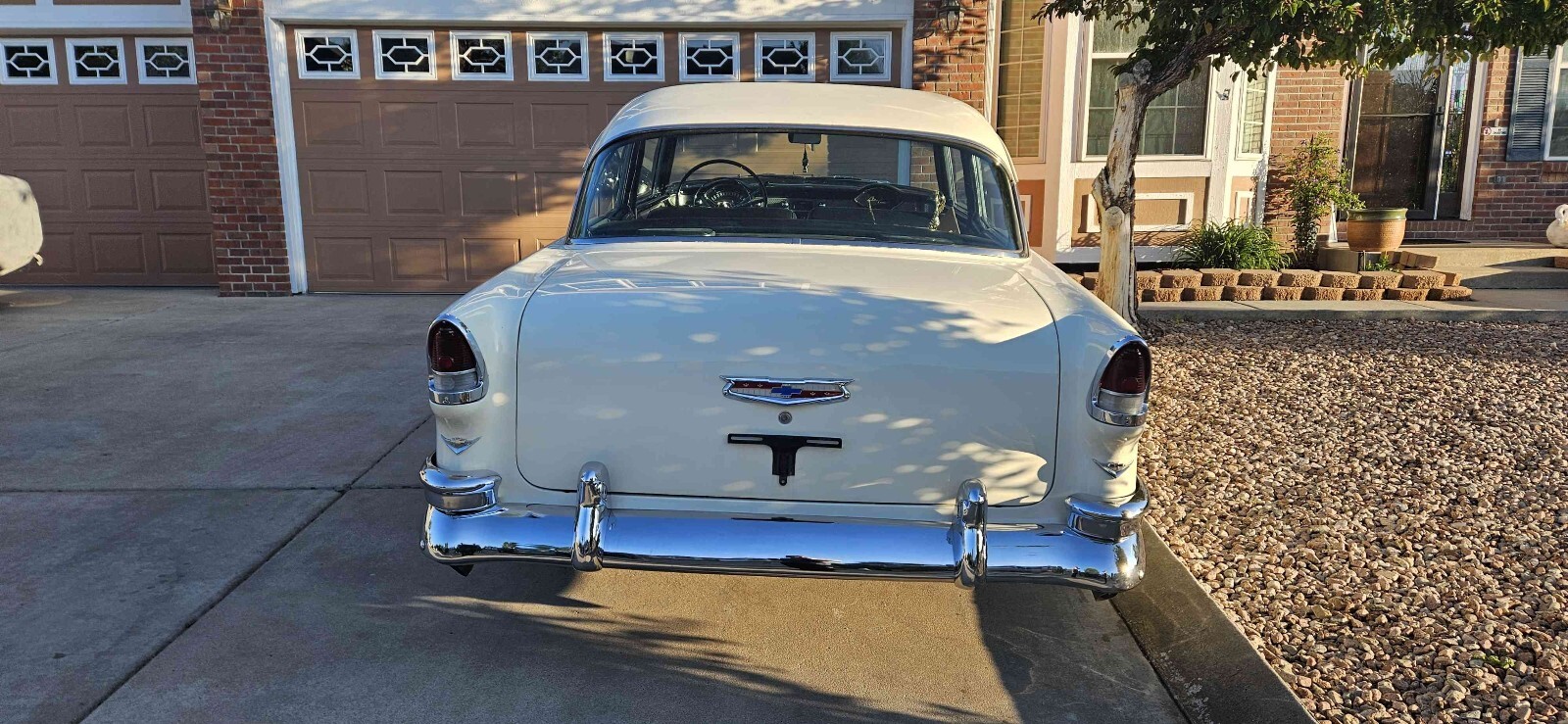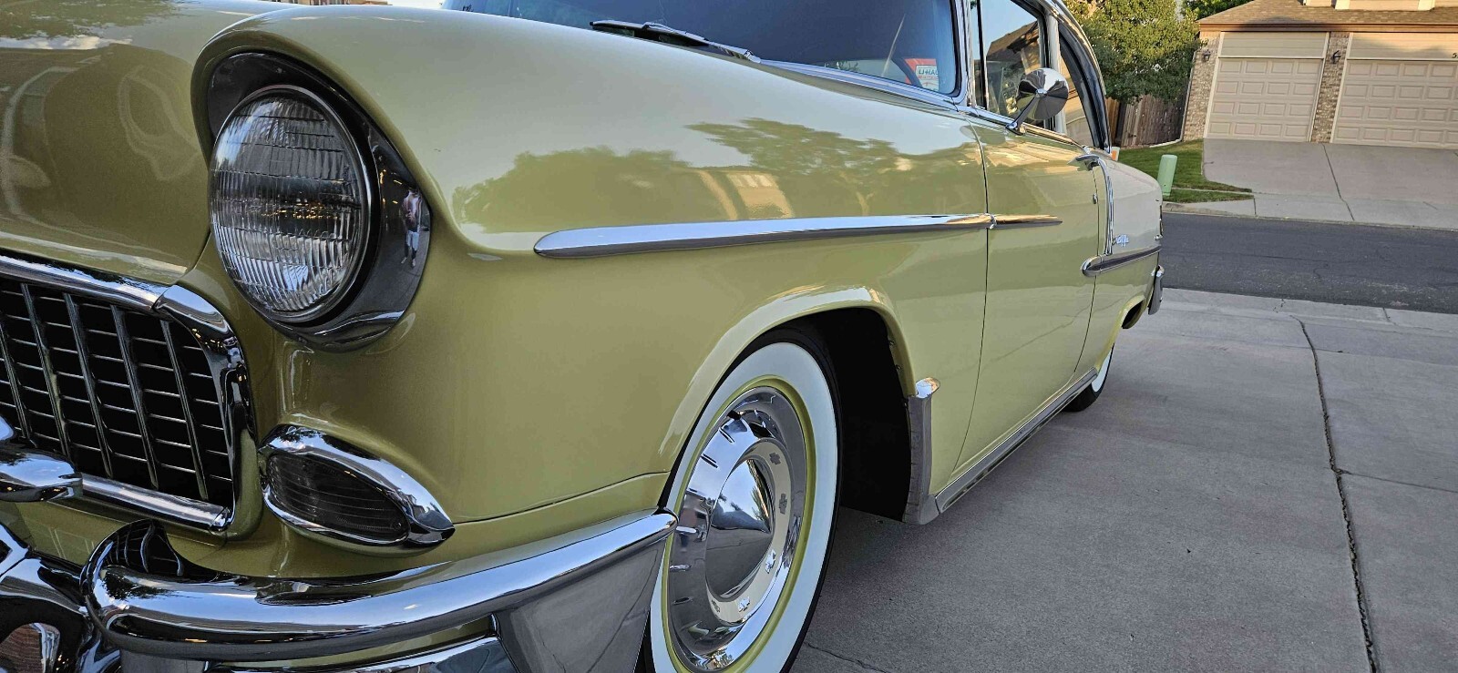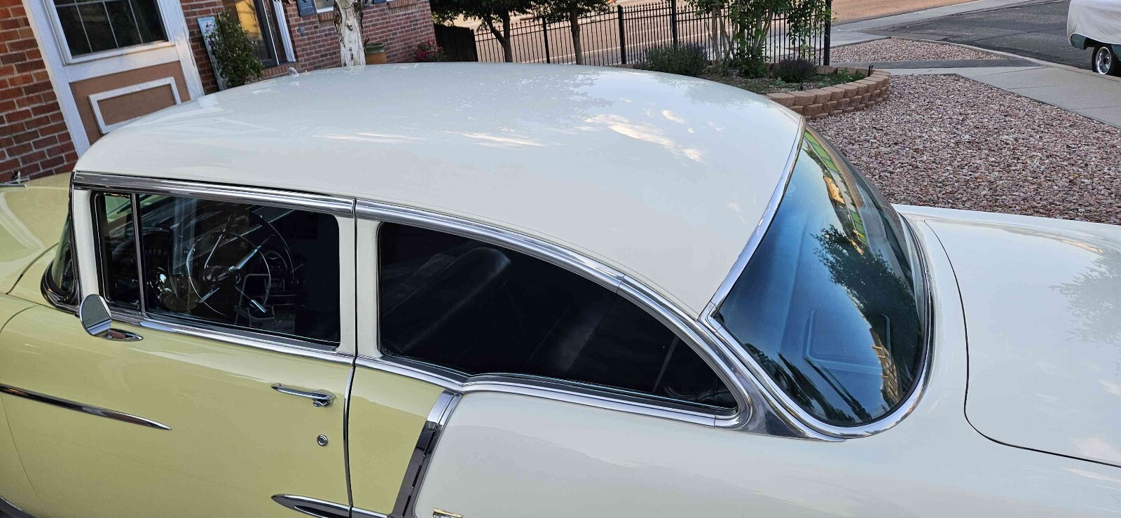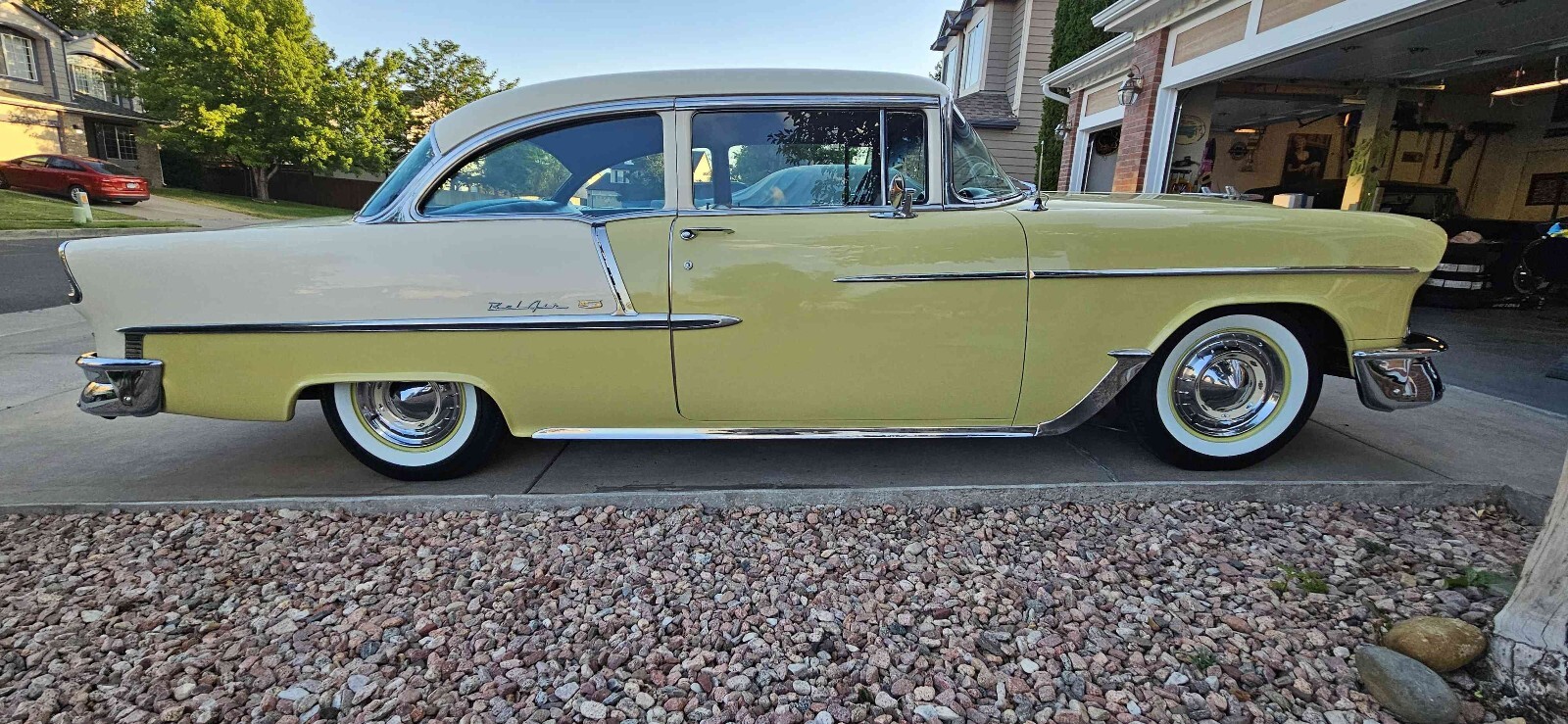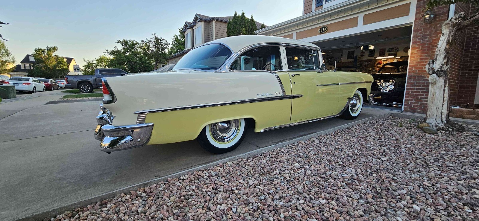 Beautiful 1955 Bel air 2 door post that is Harvest Gold and ivory, this is a beautiful 100% rust free California car. This car has a beautiful fast 1970 Corvette 350 engine with electronic ignition, factory power steering, power front disk/ rear drum brakes with 4 barrel edelbrock carburetor 350 trubo automatic transmission that shifts great. This car runs great on the highway. This car has rare options with power windows, power seats and ez eye glass, has all the beautiful front and rear bumper wraps and grill guard. All windows operate smoothly and seat works great. All lights and gauges work, oil pressure and temperature gauge are two that were added for safety. This care rides tight and handles good with a lowered stance with a 3" in rear and 2" in front. Just did a major tune up and did all new BFGoodrich wide white wall tires with color match wheels. This is one of the cleanest belair post I seen in a long time. Please contact me with any questions. Thanks Curtiss 719-799-3293