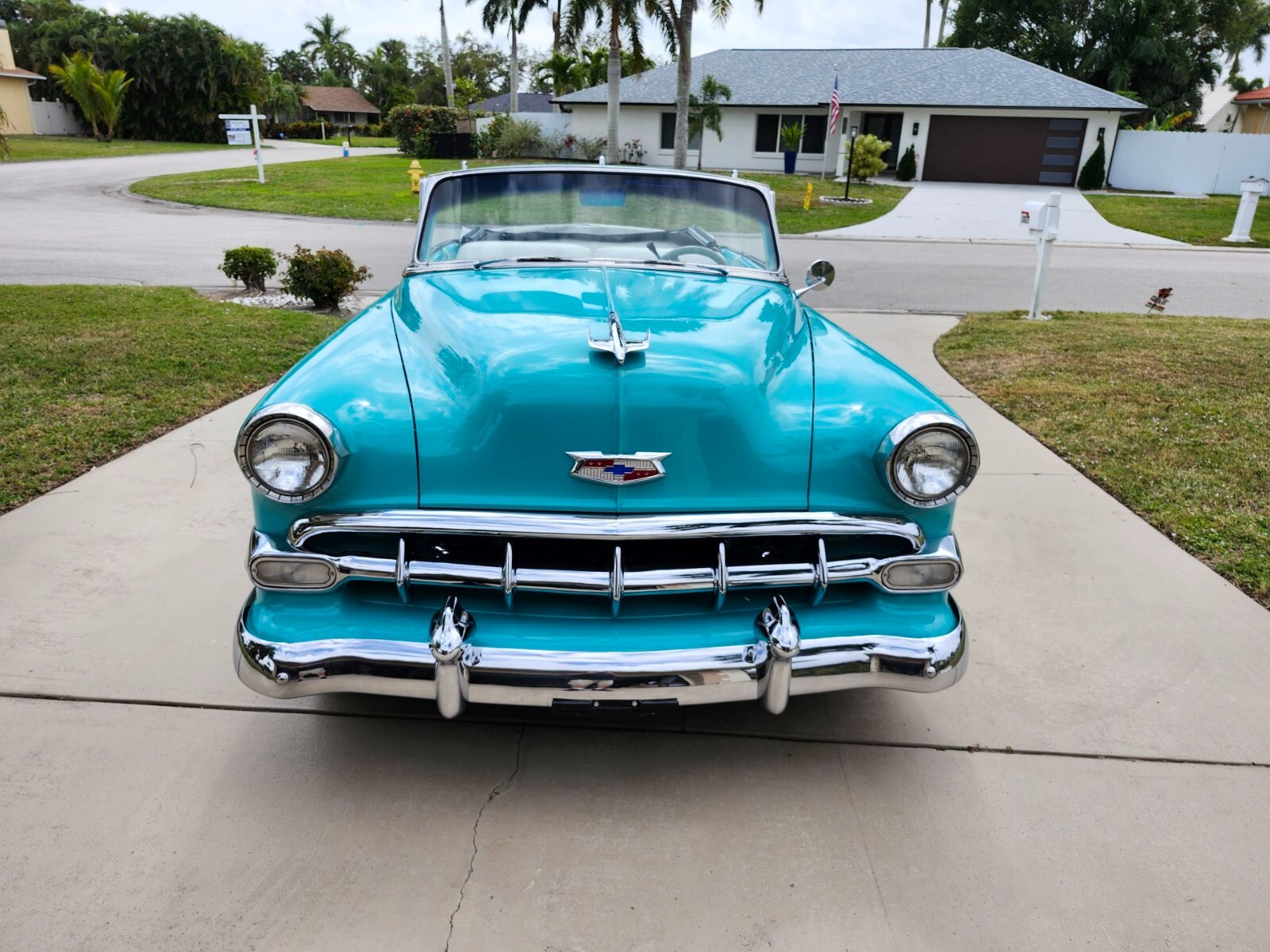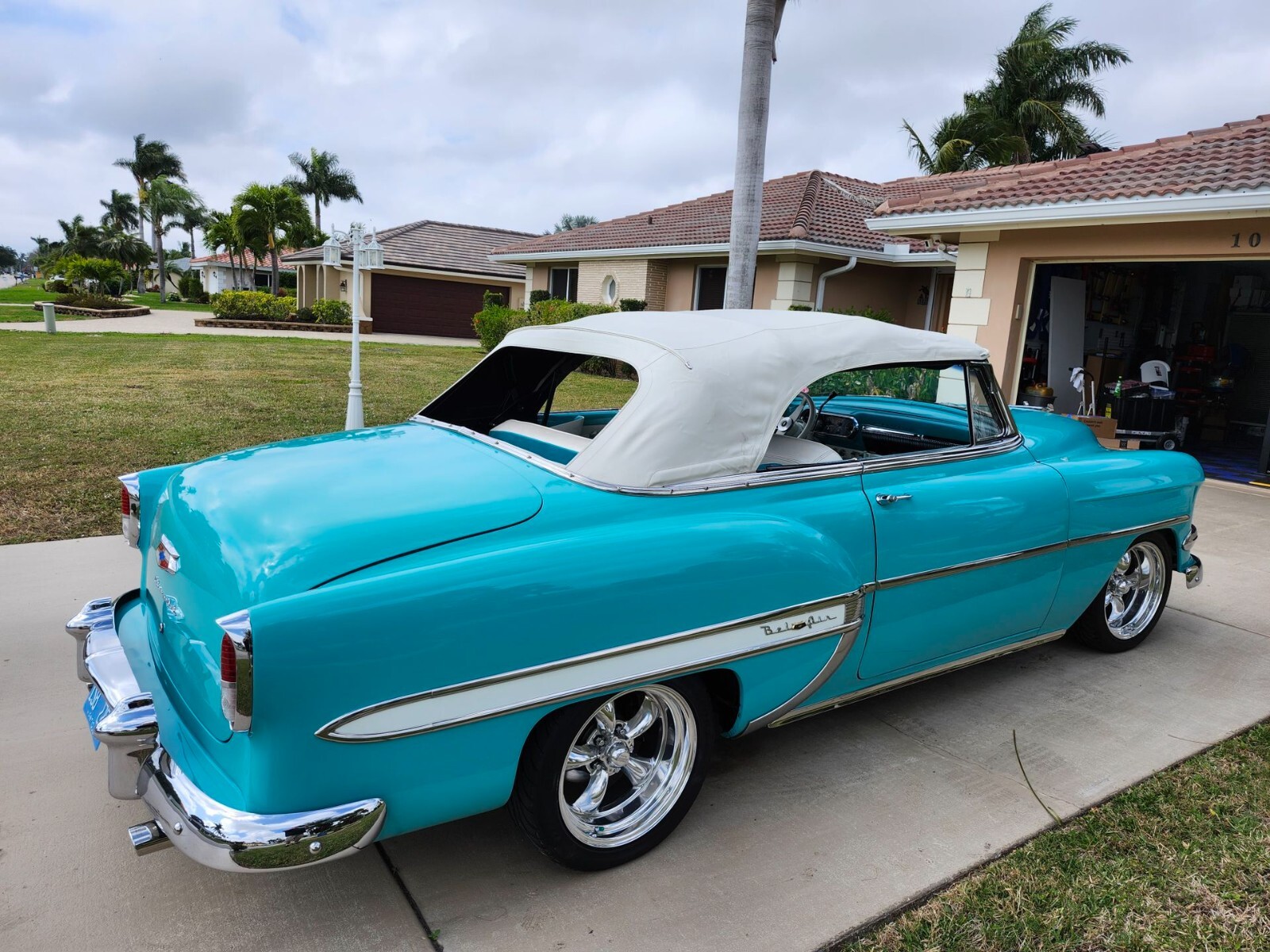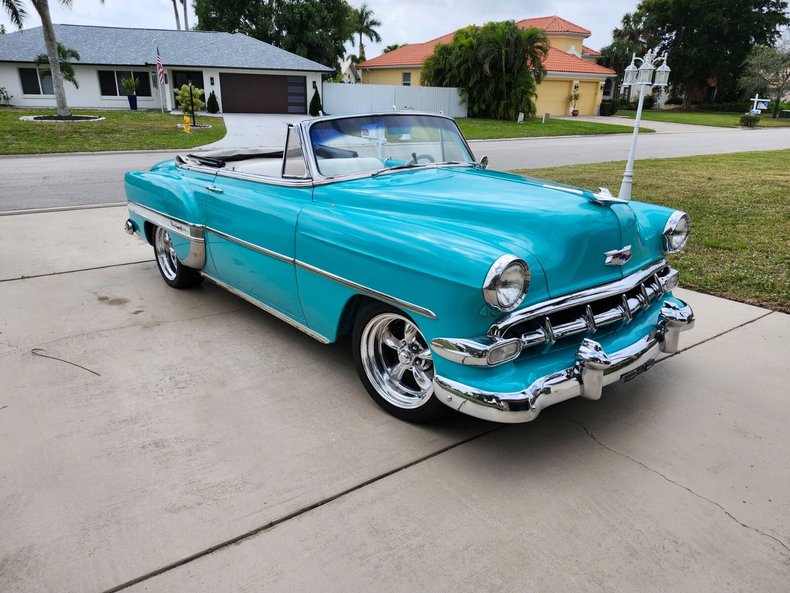 1954 Chevy Bel Air for auction ! 350 engine, overdrive automatic transmission, independent front suspension and Wilwood disc brakes. The paint is in excellent condition with no blemishes, dents scrathces or rust. The interior is upholstered in turquoise and white to match the exterior. The steering wheel is custom wrapped in white leather. Call or text me for the undercarriage pictures or convertible top -612-547-6971- Very well-maintained car. Garaged kept.