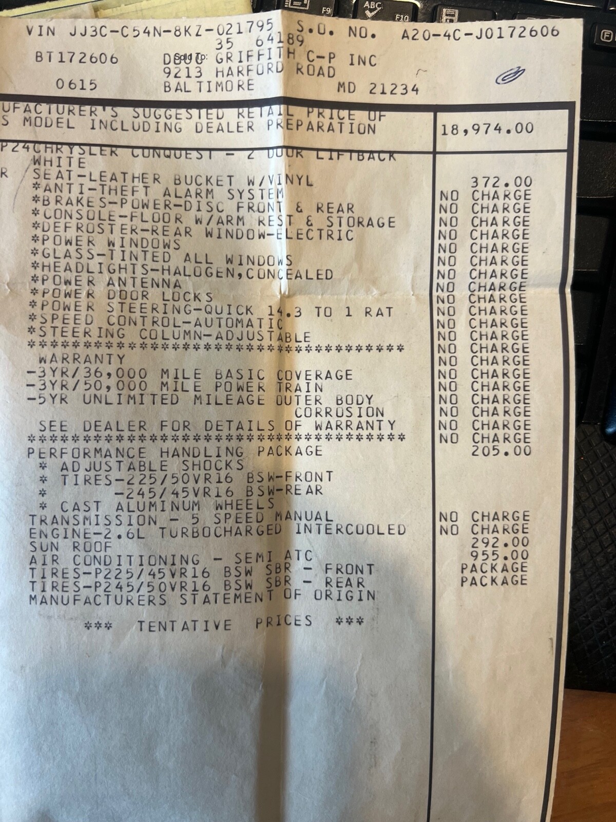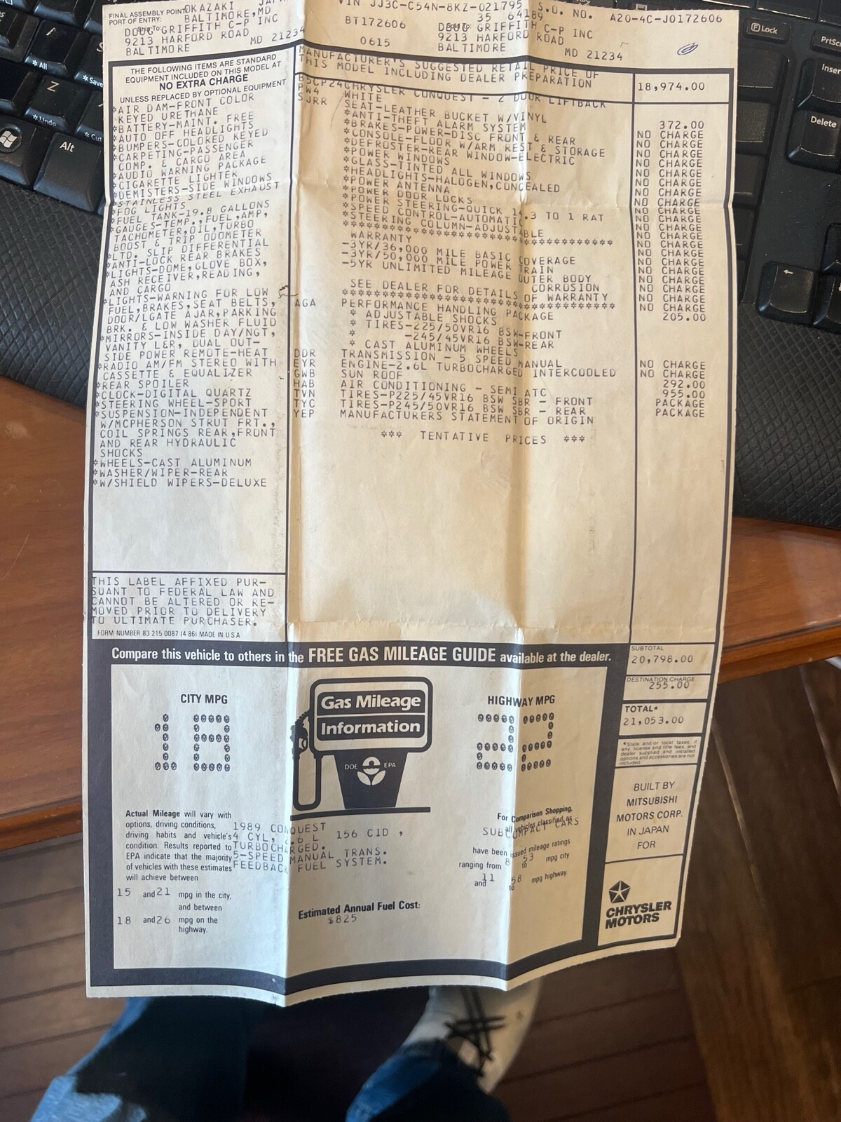 1989 Conquest 2.6l turbo. New tires, tune up, runs and drive real nice. Pulls strong. It has all it’s original books, window stick see images. If you’re looking for one this should be considered a strong contender.Vehicle Details