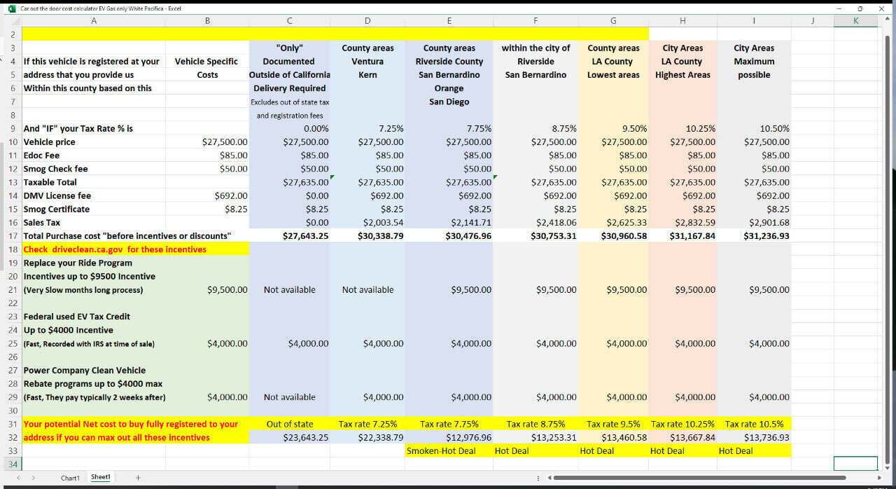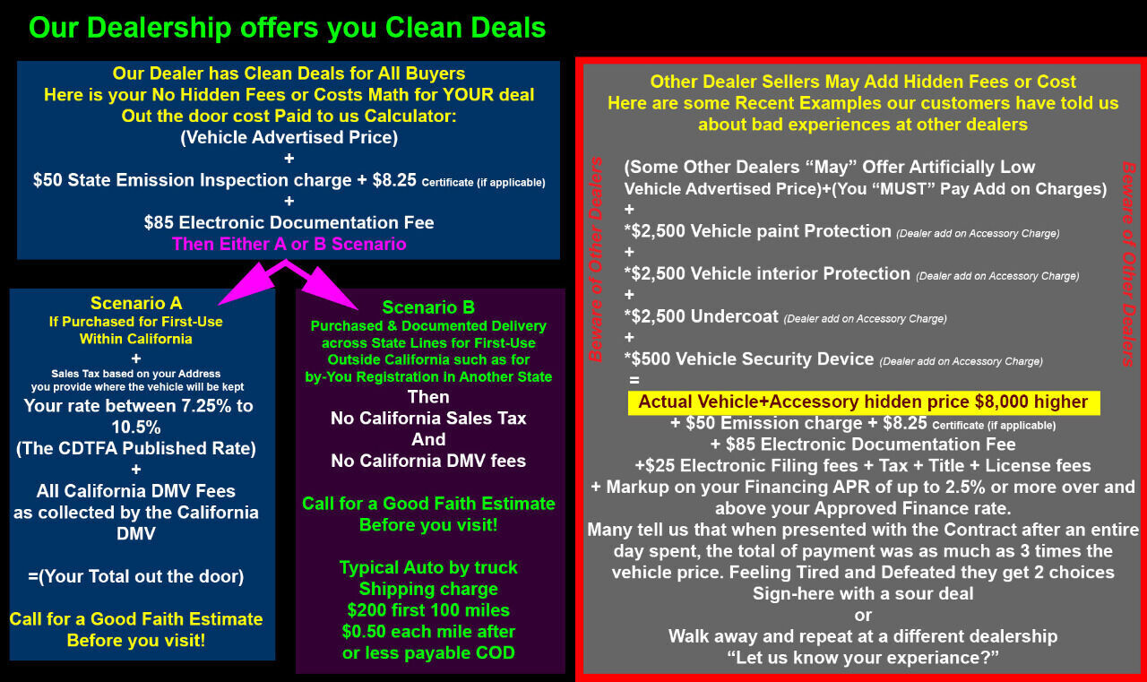 All Buyers should call the seller between 9am-7pm pacific time to ask for a Good Faith out the door cost Estimate of any and all fees based on the exact intended purchase amount and delivery intended.