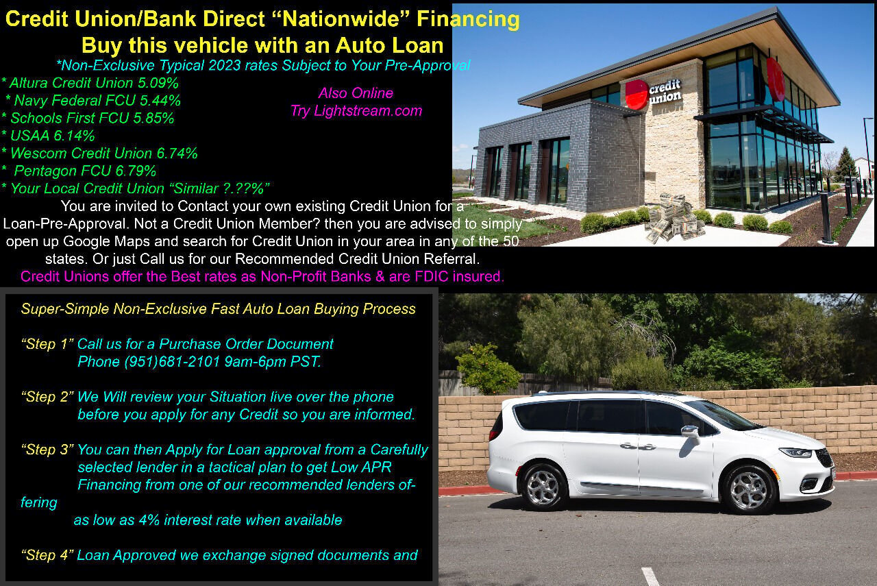 We offer vehicles for sale to buyers Nationwide/worldwide. We can even assist you to locate vehicle Financing for transactions that cross state lines. Currently Great low used car financing rates are avalable directly to consumers for as low as 1.75% APR for 60 month terms. If you call directly we can help you set that up for a smooth simple transaction.