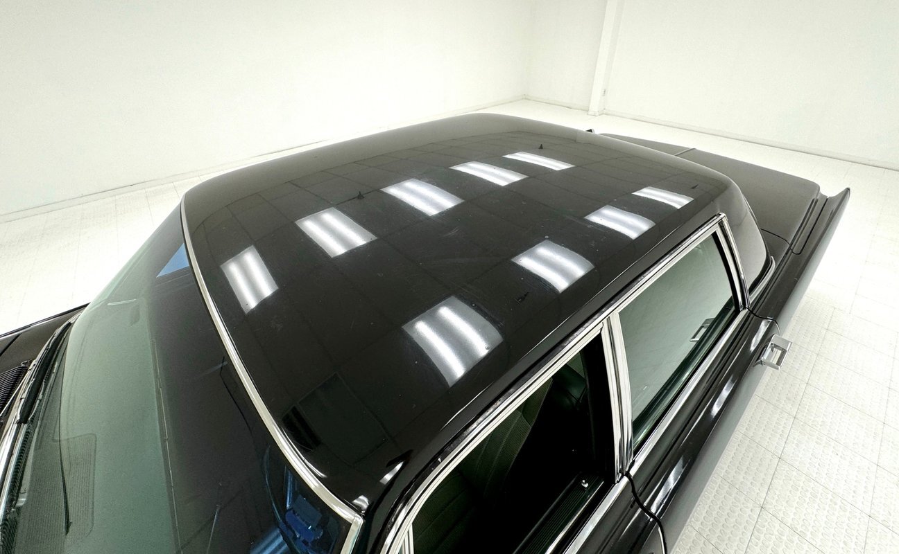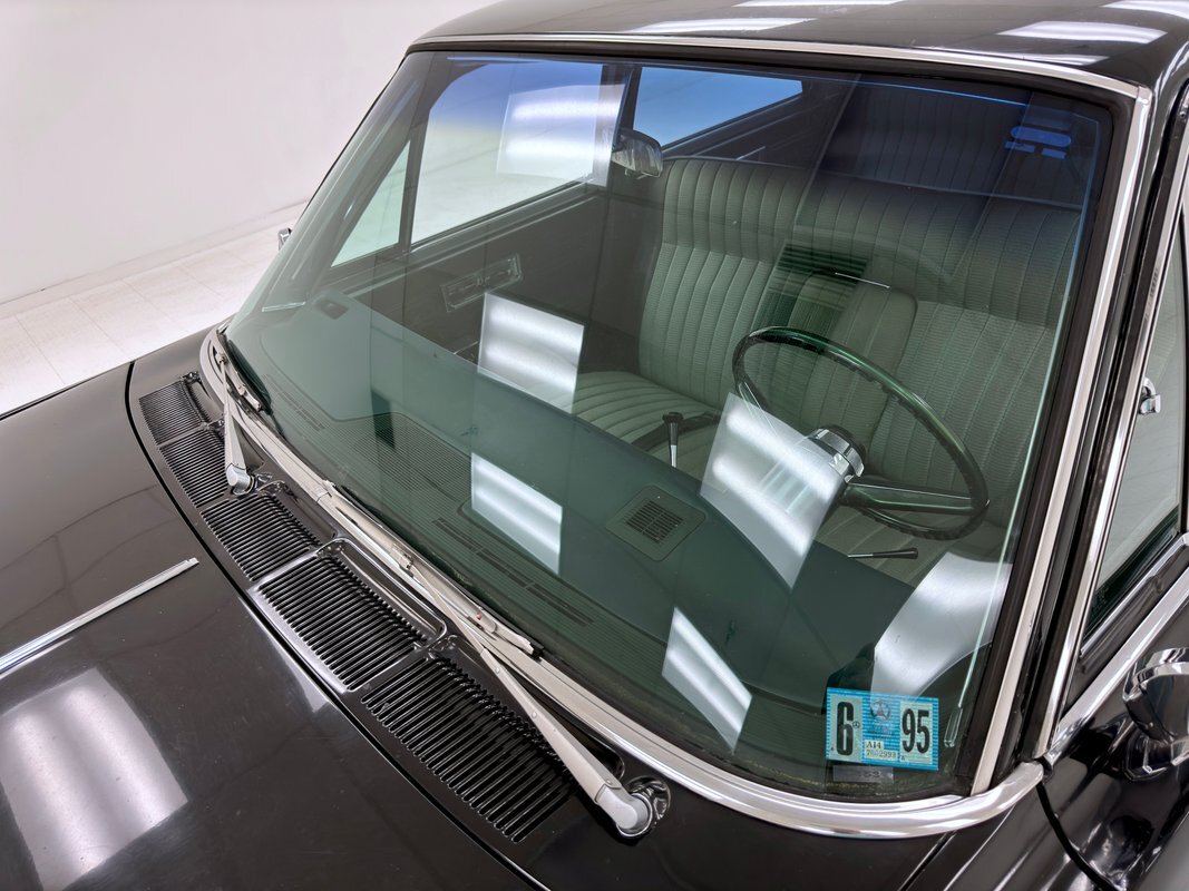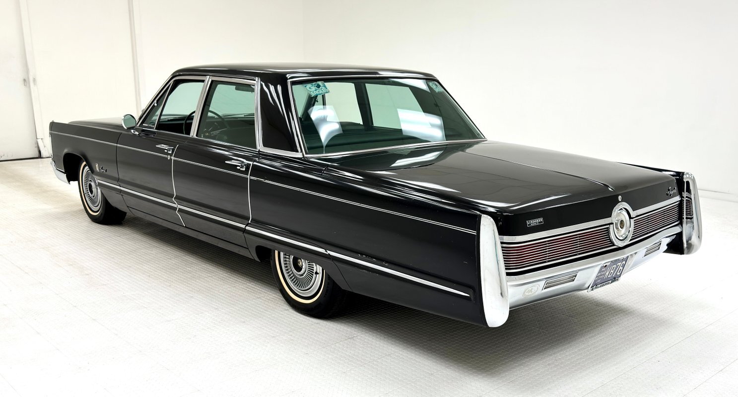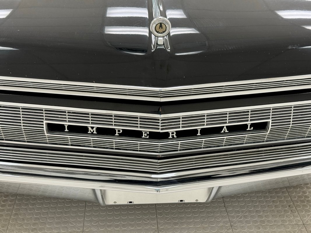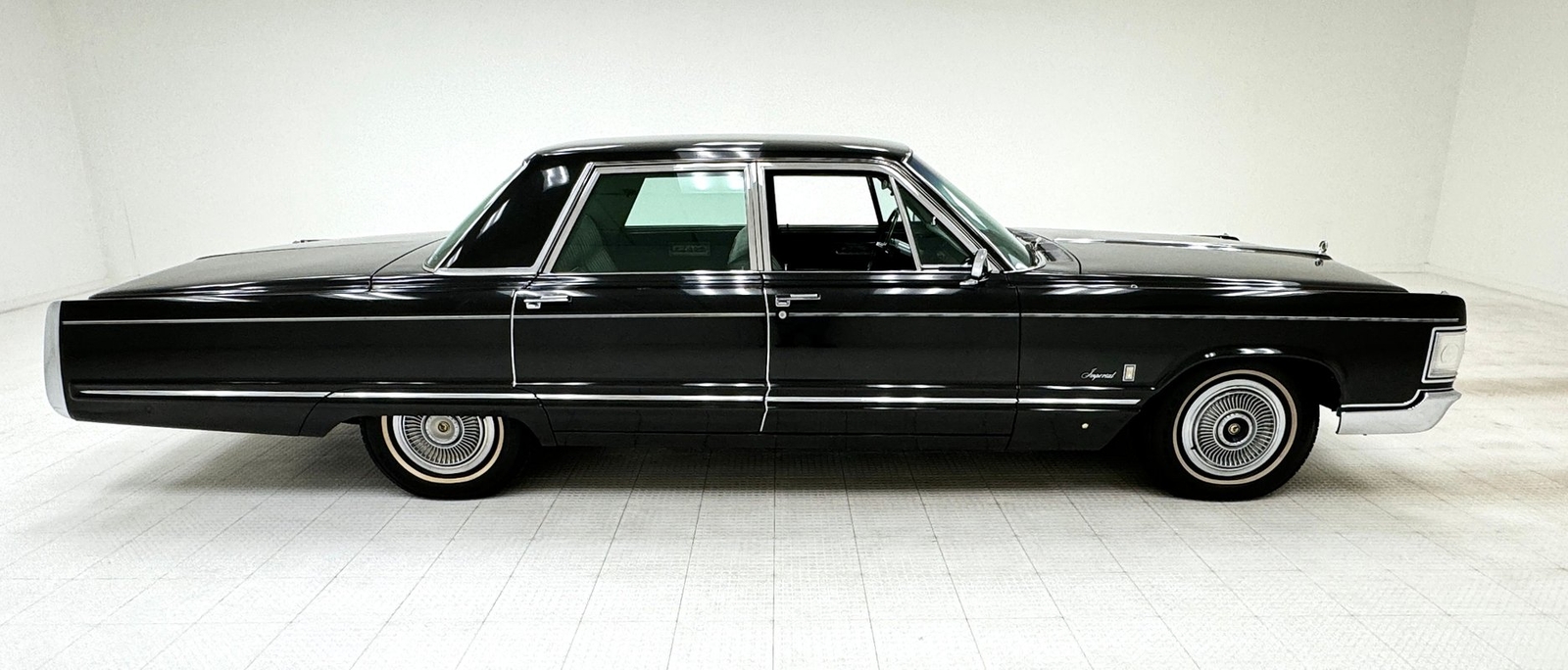 With this 1967 we see a car evolving, becoming more strait laced and stately, and in Formal Black paint, even more so. Less angular and ornate now, the very vertical posture is defined by a flat front fascia, a flat back, and B and C pillars that are upright and tall. Twin headlighting, uncovered and with their own chrome rings flank an Imperial blazoned grille that has many tiny grids, hugged by protruding marker light at a time when pointy, protruding fender ends were the trend. Things protrude out back too, in this case long vertical chrome tips reminiscent of Cadillac taillights, without the lights. In between, a stunning grille over the long horizontal tail lights extending end to end interrupted briefly by the Imperial eagle medallion at the decklid seam. Correct hubcaps fit over the 15-inch wheels, the rears somewhat obscured by fender skirts, another period design penchant. Overall, the paint and brightwork are in very good shape, with a few scratches noted around the lower door skin.